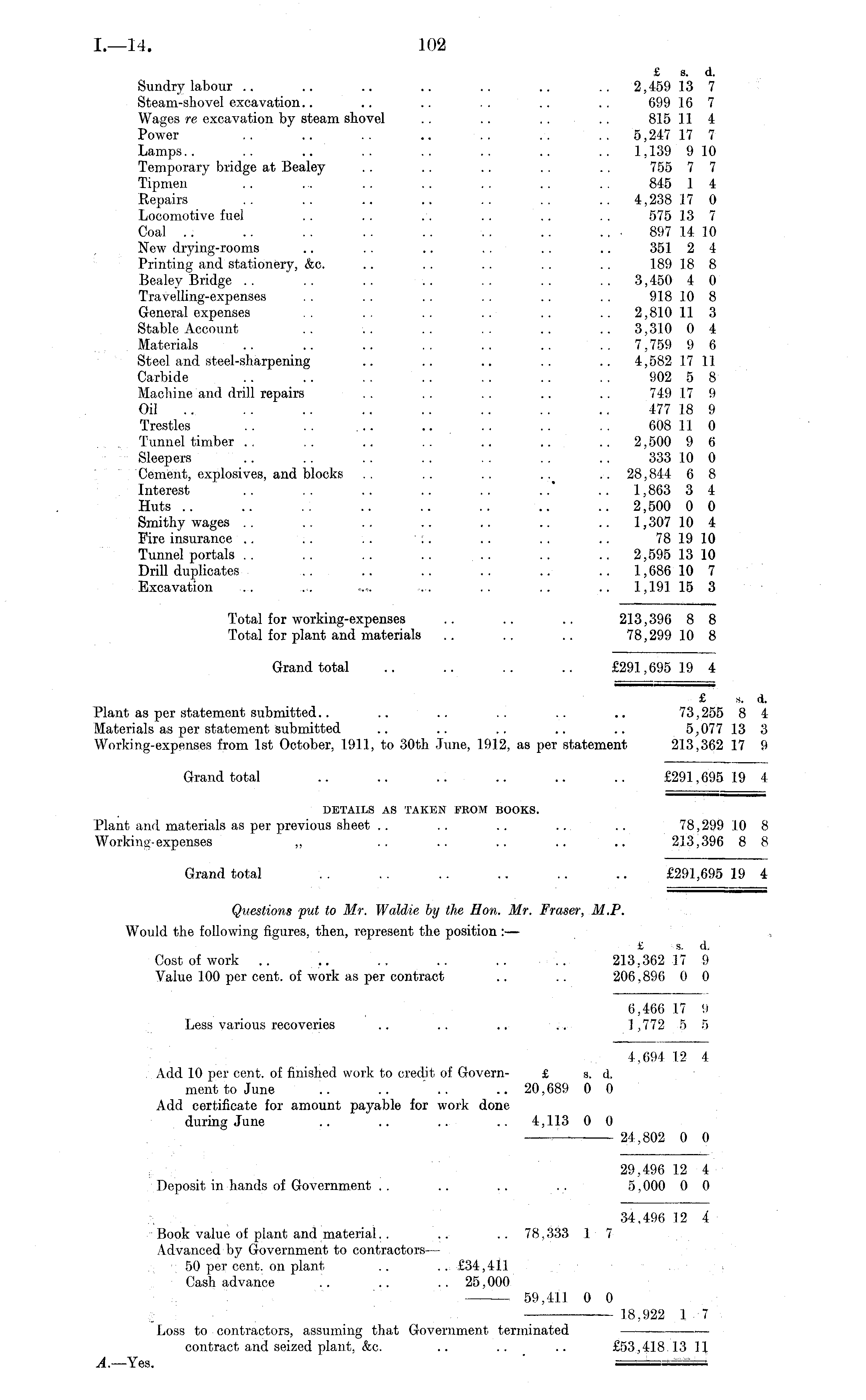 £ a. d. Sundry labour .. .. .. .. .. .. .. 2,459 13 7 Steam-shovel excavation.. .. .. . . .. . . 699 16 7 Wages re excavation by steam shovel .. .. . . . . 815 11 4 Power .. .. .. .. .. .. .. 5,247 17 7 Lamps.. .. .. .. .. .. .. .. 1,139 910 Temporary bridge at Bealey . . .. . . . . .. 755 7 7 Tipmen .. .. .. .. .. . . . . 845 1 4 Repairs .. .. .. .. .. .. .. 4,238 17 0 Locomotive fuel . . . . .. . . .. . . 575 13 7 Coal .. .. .. .. .. .. .. ... 897 14 10 New drying-rooms .. .. .. .. .. .. 351 2 4 Printing and stationery, &c. .. .. . . .. .. 189 18 8 Bealey Bridge .. .. .. .. .. .. .. 3,450 4 0 Travelling-expenses . . .. . . .. .. .. 918 10 8 General expenses .. .. .. .. .. .. 2,810 11 3 Stable Account .. .. .. .. .. .. 3,310 0 4 Materials .. .. .. .. .. .. .. 7,759 9 6 Steel and steel-sharpening .. .. .. .. .. 4,582 17 11 Carbide .. .. .. .. .. .. .. 902 5 8 Machine and drill repairs .. . . . . .. .. 749 17 9 Oil .. .. .. .. .. .. .. 477 18 9 Trestles .. .. ... .. .. .. .. 608 11 0 Tunnel timber .. .. .. .. .. .. .. 2,500 9 6 Sleepers .. .. .. .. .. .. .. 333 10 0 Cement, explosives, and blocks .. .. .. .. .. 28,844 6 8 Interest .. .. .. .. .. ..' .. 1,863 3 4 Huts .. .. .. .. .. .. .. .. 2,500 0 0 Smithy wages .. .. .. .. .. .. .. 1,307 10 4 Fire insurance .. .. .. .. .. .. .. 78 19 10 Tunnel portals .. .. .. .. .. .. .. 2,595 13 10 Drill duplicates .. .. .. .. .. .. 1,686 10 7 Excavation .. ... .... .... .. .. .. 1,191 15 3 Total for working-expenses .. .. .. 213,396 8 8 Total for plant and materials .. .. .. 78,299 10 8 Grand total .. .. .. .. £291,695 19 4 £ s. d. Plant as per statement submitted.. .. .. .. .. .. 73,255 8 4 Materials as per statement submitted .. .. .. .. .. 5,077 13 3 Working-expenses from Ist October, 1911, to 30th June, 1912, as per statement 213,362 17 9 Grand total .. .. .. .. .. .. £291,695 19 4 DETAILS AS TAKEN FROM BOOKS. Plant and materials as per previous sheet .. . . .. .. .. 78,299 10 8 Working-expenses „ .. .. .. .. .. 213,396 8 8 Grand total . . .. .. .. .. .. £291,695 19 4 Questions put to Mr. Waldie by the Hon. Mr. Fraser, M.P. Would the following figures, then, represent the position : — £ s. d. Cost of work .. .. .. .. .. .. 213,362 17 9 Value 100 per cent, of work as per contract .. .. 206,896 0 0 6,466 17 9 Less various recoveries .. .. .. .. 1,772 5 ~> 4,694 12 4 , Add 10 per cent, of finished work to credit of Govern- £ s. d. menttoJune .. .. .. .. 20,689 0 0 Add certificate for amount payable for work done during June .. .. .. .. 4,113 0 0 .' 24,802 0 0 29,496 12 4 Deposit in hands of Government . . .. .. .. 5,000 0 0 34,496 12 4 Book value of plant and material.. .. .. 78,333 1 7 Advanced by Government to contractors — 50 per cent, on plant .. .. £34,411 Cash advance . . .. .. 25,000 59,411 0 0 18,922 17 Loss to contractors, assuming that Government terminated contract and seized plant, &c. .. .. .. £53,418.13 11