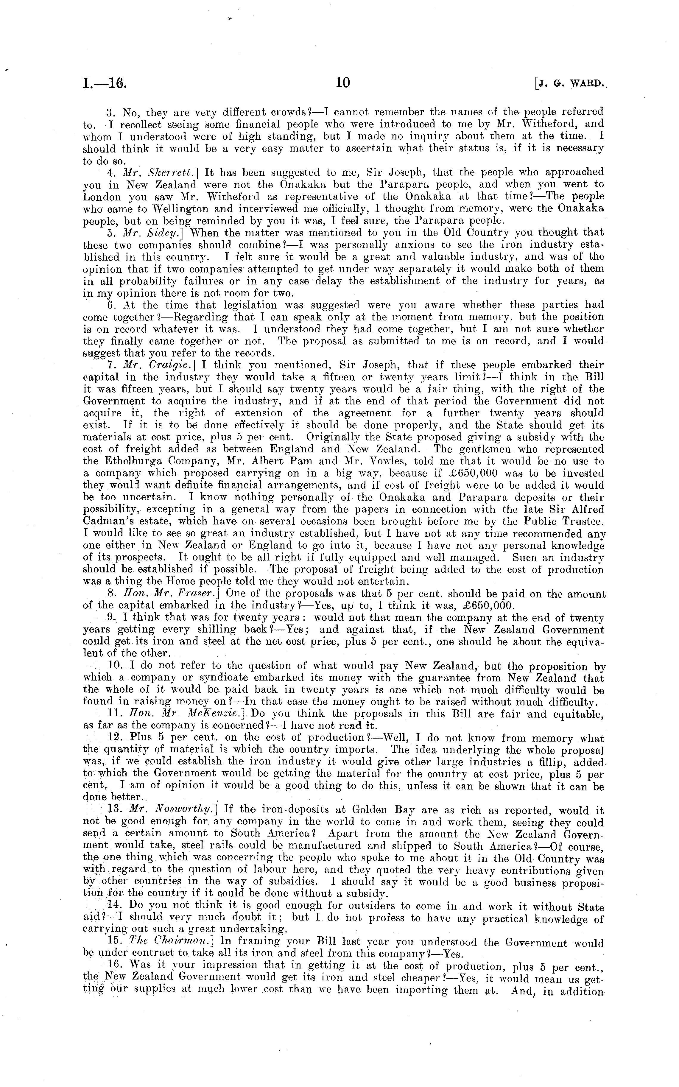 3. No, they are very different crowds? —I cannot remember the names of the people referred to. I recollect seeing some financial people who were introduced to me by Mr. Witheford, and whom I understood were of high standing, but I made no inquiry about them at the time. I should think it would be a very easy matter to ascertain what their status is, if it is necessary to do so. 4. Mr. Skerrett.] It has been suggested to me, Sir Joseph, that the people who approached you in New Zealand were not the Onakaka but the Parapara people, and when you went to London you saw Mr. Witheford as representative of the Onakaka at that time? —The people who came to Wellington and interviewed me officially, I thought from memory, were the Onakaka people, but on being reminded by you it was, I feel sure, the Parapara people. 5. Mr. Sidey.] When the matter was mentioned to you in the Old Country you thought that these two companies should combine? —I was personally anxious to see the iron industry established in this country. I felt sure it would be a great and valuable industry, and was of the opinion that if two companies attempted to get under way separately it would make both of them in all probability failures or in any case delay the establishment of the industry for years, as in my opinion there is not room for two. 6. At the time that legislation was suggested were you aware whether these parties had come together ?—Regarding that I can speak only at the moment from memory, but the position is on record whatever it was. I understood they had come together, but I am not sure whether they finally came together or not. The proposal as submitted to me is on record, and I would suggest that you refer to the records. 7. Mr. Craigie.] I think you mentioned, Sir Joseph, that if these people embarked their capital in the industry they would take a fifteen or twenty years limit?—l think in the Bill it was fifteen years, but I should say twenty years would be a fair thing, with the right of the Government to acquire the industry, and if at the end of that period the Government did not acquire it, the right of extension of the agreement for a further twenty years should exist. If it is to be done effectively it should be done properly, and the State should get its materials at cost price, pHis 5 per cent. Originally the State proposed giving a subsidy with the cost of freight added as between England and New Zealand. The gentlemen who represented the Ethelburga Company, Mr. Albert Pam and Mr. Vowles, told me that it would be no use to a company which proposed carrying on in a big way, because if £650,000 was to be invested they would want definite financial arrangements, and if cost of freight were to be added it would be too uncertain. I know nothing personally of the Onakaka and Parapara deposits or their possibility, excepting in a general way from the papers in connection with the late Sir Alfred Cadman's estate, which have on several occasions been brought before me by the Public Trustee. I would like to see so great an industry established, but I have not at any time recommended any one either in New Zealand or England to go into it, because I have not any personal knowledge of its prospects. It ought to be all right if fully equipped and well managed. Sucn an industry should be established if possible. The proposal of freight being added to the cost of production was a thing the Home people told me they would not entertain. 8. Hon. Mr. Fraser.] One of the proposals was that 5 per cent, should be paid on the amount of the capital embarked in the industry? —Yes, up to, I think it was, £650,000. 9. I think that was for twenty years : would not that mean the company at the end of twenty years getting every shilling back? —Yes; and against that, if the New Zealand Government could get its iron and steel at the net cost price, plus 5 per cent., one should be about the equivalent, of the other. 10.. I do not refer to the question of what would pay New Zealand, but the proposition by which a company or syndicate embarked its money with the guarantee from New Zealand that the whole of it would be paid back in twenty years is one which not much difficulty would be found in raising money on?—ln that case the money ought to be raised without much difficulty. 11. Hon. Mr. McKenzie.] Do you think the proposals in this Bill are fair and equitable, as far as the company is concerned?—l have not read it. 12. Plus 5 per cent. on. the cost of production?— Well, I do not know from memory what the quantity of material is which the country imports. The idea underlying the whole proposal was,, if we could establish the iron industry it would give other large industries a fillip, added to which the Government would be getting the material for the country at cost price, plus 5 per cent, lam of opinion it would be a good thing to do this, unless it can be shown that it can be done better. 13. Mr. Nosworthy.] If the iron-deposits at Golden Bay are as rich as reported, would it not be good enough for any company in the world to come in and work them, seeing they could send a certain amount to South America? Apart from the amount the New Zealand Government would take, steel rails could be manufactured and shipped to South America?—Of course, the one thing which was concerning the people who spoke to me about it in the Old Country was with regard, to the question of labour here, and they quoted the very heavy contributions given by other countries in the way of subsidies. I should say it would be a good business proposition for the country if it could be done without a subsidy. 14. Do you not think it is good enough for outsiders to come in and work it without State aid?—l should very much doubt it; but I do hot profess to have any practical knowledge of carrying out such a great undertaking. 15. The Chairman.] In framing your Bill last year you understood the Government would be under contract to, take all 
