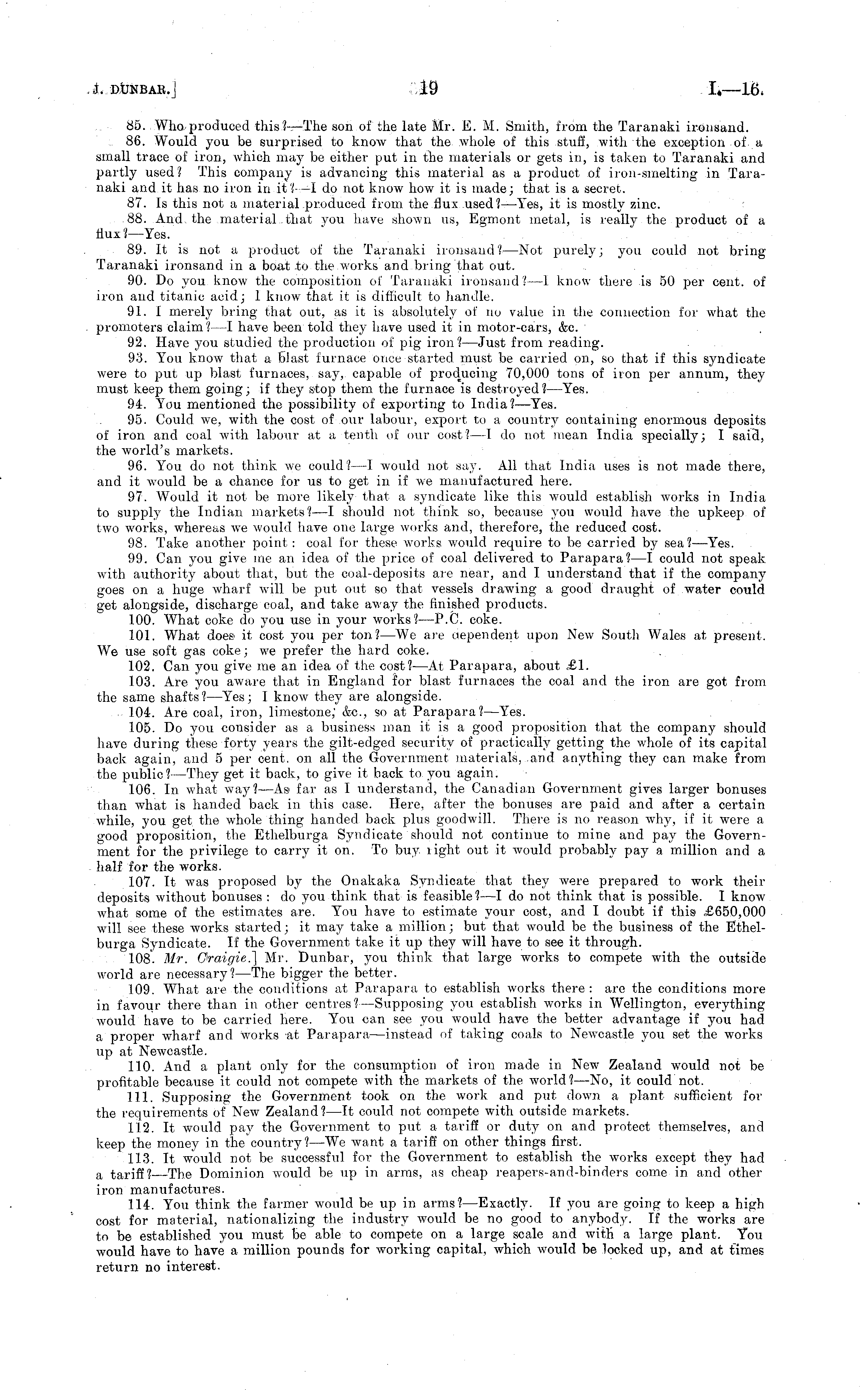 85. Who,produced this?---The son of the late x\lr. E. M. Smith, from the Taranaki ironsand. 86. Would you be surprised to know that the whole of this stuff, with the exception of a small trace of iron, which may be either put in the materials or gets in, is taken to Taranaki and partly used? This company is advancing this material as a product of iron-smelting in Taranaki and it has no iron in it?—l do not know how it is made; that is a secret. 87. Is this not a material produced from the flux used? —Yes, it is mostly zinc. 88. And the material that you have shown us, Egmont metal, is really the product of a flux? —Yes. 89. It is not a product of the Taranaki ironsand?—Not purely; you could not bring Taranaki ironsand in a boat to the works and bring that out. 90. Do you know the composition of Taranaki ironsand? —1 know there is 50 per cent, of iron and titanic acid; 1 know that it is difficult to handle. 91. I merely bring that out, as it is absolutely of no value in the connection for what the promoters claim ?—I have been told they have used it in motor-cars, &c. 92. Have you studied the production of pig iron? —Just from reading. 93. You know that a blast furnace once started, must be carried on, so that if this syndicate were to put up blast furnaces, say, capable of producing 70,000 tons of iron per annum, they must keep them going; if they stop them the furnace is destroyed?— Yes. 94. You mentioned the possibility of exporting to India?— Yes. 95. Could we, with the cost of our labour, export to a country containing enormous deposits of iron and coal with labour at a tenth of our cost? —1 do not mean India specially; I said, the world's markets. 96. You do not think we could?—l. would not say. All that India uses is not made there, and it would be a chance for us to get in if we manufactured here. 97. Would it not be more likely that a syndicate like this would establish works in India to supply the Indian markets ?—I should not think so, because you would have the upkeep of two works, whereas we would have one large works and, therefore, the reduced cost. 98. Take another point : coal for these works would require to be carried by sea?— Yes. 99. Can you give me an idea of the price of coal delivered to Parapara?—l could not speak with authority about, that, but the coal-deposits are near, and I understand that if the company goes on a huge wharf will be put out so that vessels drawing a good draught of water could get alongside, discharge coal, and take away the finished products. 100. What coke do you use in your works? —P.C. coke. 101. What does it cost you per ton?—We are dependent upon New South Wales at present. We use soft gas coke; we prefer the hard coke. 102. Can you give me an idea of the cost?—At Parapara, about £1. 103. Are you aware that in England for blast furnaces the coal and the iron are got from the same shafts? —Yes; I know they are alongside. 104. Are coal, iron, limestone; &c, so at Parapara?—Yes. 105. Do you consider as a business man if is a good proposition that the company should have during these forty years the gilt-edged security of practically getting the whole of its capital back again, and 5 per cent, on all the Government materials, and anything they can make from the public? —They get it back, to give it back to you again. 106. In what way?—As far as I understand, the Canadian Government gives larger bonuses than what is handed back in this case. Here, after the bonuses are paid and after a certain while, you get the whole thing handed back plus goodwill. There is no reason why, if it were a good proposition, the Ethelburga Syndicate should not continue to mine and pay the Government for the privilege to carry it on. To buy. right out it would probably pay a million and a half for the works. 107. It was proposed by the Onakaka Syndicate that they were prepared to work their deposits without bonuses :do you think that is feasible?—l do not think that is possible. I know what some of the estimates are. You have to estimate your cost, and I doubt if this £650,000 will see these works started; it may take a million; but that would be the business of the Ethelburga Syndicate. If the Government take it up they will have to see it through. 108. Mr. Graigie.] Mr. Dunbar, you think that large works to compete with the outside world are necessary?— The bigger the better. 109. What are the conditions at Parapara to establish works there: are the conditions more in favour there than in other centres? —Supposing you establish works in Wellington, everything would have to be carried here. You can see you would have the better advantage if you had a proper wharf and works at Parapara—instead of taking coals to Newcastle 3-011 set the works up at Newcastle. 110. And a plant only for the consumption of iron made in New Zealand would not be profitable because it could not compete with the markets of the world? —No, it could not. 111. Supposing the Government took on the work and put down a plant sufficient for the requirements of New Zealand ? —lt could not compete with outside markets. 112. It would pay the Government to put a tariff or duty on and protect themselves, and keep the money in the country? —We want a tariff on other things first. 113. It would not be successful for the Government to establish the works except they had a tariff? —The Dominion would be up in arms, as cheap reapers-and-binders come in and other iron manufactures. 114. You think the farmer would be up in arms? —Exactly. If you are going to keep a high cost for material, nationalizing the industry would be no good to anybody. If the works are to be established you must be able to compete on a large scale and with a large plant. You would have to have a million pounds for working capital, which would be locked up, and at times return no interest.