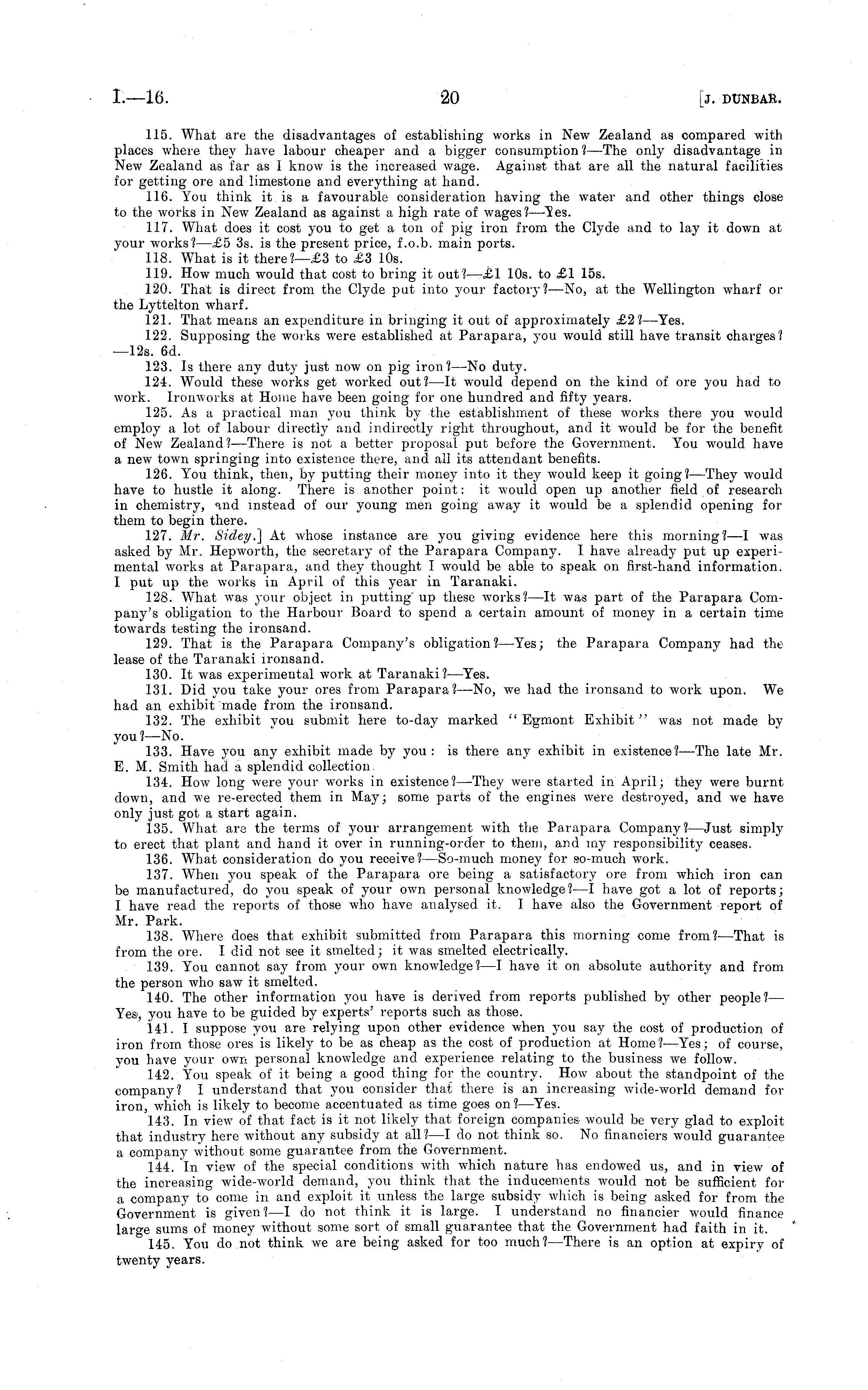 115. What are the disadvantages of establishing works in New Zealand as compared with places where they have labour cheaper and a bigger consumption ?—The only disadvantage in New Zealand as far as I know is the increased wage. Against that are all the natural facilities for getting ore and limestone and everything at hand. 116. You think it is a favourable consideration having the water and other things close to the works in New Zealand as against a high rate of wages? —"Xes. 117. What does it cost you to get a ton of pig iron from the Clyde and to lay it down at your works? —£5 3s. is the present price, f.o.b. main ports. 118. What is it there?—£3 to £3 10s. 119. How much would that cost to bring it out?—£l 10s. to £1 15s. 120. That is direct from the Clyde put into your factory?—No, at the Wellington wharf or the Lyttelton wharf. 121. That means an expenditure in bringing it out of approximately £2?— Yes. 122. Supposing the works were established at Parapara, you would still have transit charges? —12s. 6d. 123. Is there any dutj? just now on pig iron? —No duty. 124. Would these works get worked out? —It would depend on the kind of ore you had to work. Ironworks at Home have been going for one hundred and fifty years. 125. As a practical man you think by the establishment of these works there you would employ a lot of labour directly and indirectly right throughout, and it would be for the benefit of New Zealand? —There is not a better proposal put before the Government. You would have a new town springing into existence there, and all its attendant benefits. 126. You think, then, by putting their money into it they would keep it going?— They would have to hustle it along. There is another point: it would open up another field of research in chemistry, and instead of our young men going away it would be a splendid opening for them to begin there. 127. Mr. Sidey.] At whose instance are you giving evidence here this morning? —I was asked by Mr. Hepworth, the secretary of the Parapara Company. I have already put up experimental works at Parapara, and they thought I would be able to speak on first-hand information. I put up the works in April of this year in Taranaki. 128. What was your object in putting'up these works?—lt was part of the Parapara Company's obligation to the Harbour Board to spend a certain amount of money in a certain time towards testing the ironsand. 129. That is the Parapara Company's obligation?— Yes; the Parapara Company had the lease of the Taranaki ironsand. 130. It was experimental work at Taranaki?—Yes. 131. Did you take your ores from Parapara?—No, we had the ironsand to work upon. We had an exhibit made from the ironsand. 132. The exhibit you submit here to-day marked " Egmont Exhibit " was not made by you? —No. 133. Have you any exhibit made by you: is there any exhibit in existence? —The late Mr. E. M. Smith had a splendid collection. 134. How long were your works in existence? —They were started in April; they were burnt down, and we re-erected them in May; some parts of the engines were destroyed, and we have only just got a start again. 135. What are the terms of your arrangement with the Parapara Company?— Just simply to erect that plant and hand it over in running-order to them, and my responsibility ceases. 136. What consideration do you receive? —So-much money for so-much work. 137. When you speak of the Parapara ore being a satisfactory ore from which iron can be manufactured, do y r ou speak of your own personal knowledge?—l have got a lot of reports; I have read the reports of those who have analysed it. I have also the Government report of Mr. Park. 138. Where does that exhibit submitted from Parapara this morning come from? —That is from the ore. I did not see it smelted; it was smelted electrically. 139. You cannot say from your own knowledge?—l have it on absolute authority and from the person who saw it smelted. 140. The other information you have is derived from reports published by other people? — Yes, you have to be guided by experts' reports such as those. 141. I suppose you are relying upon other evidence when you say the cost of production of iron from those ores is likely to be as cheap as the cost of production at Home? —Yes; of course, you have your own personal knowledge and experience relating to the business we follow. 142. You speak of it being a good thing for the country. How about the standpoint of the company? I understand that you consider that there is an increasing wide-world demand for iron, which is likely to become accentuated as time goes on?— Yes. 143. In view of that fact is it not likely that foreign companies- would be very glad to exploit that industry here without any subsidy at all? —I do not think so. No financiers would guarantee a company without some guarantee from the Government. 144. In view of the special conditions with which nature has endowed us, and in view of the increasing wide-world demand, you think that the inducements would not be sufficient for a company to come in and exploit it unless the large subsidy which is being asked for from the Government is given?—l do not think it is large. I understand no financier would finance large sums of money without some sort of small guarantee that the Government had faith in it. 145. You do not think we are being asked for too much? —There is an option at expiry of twenty years.