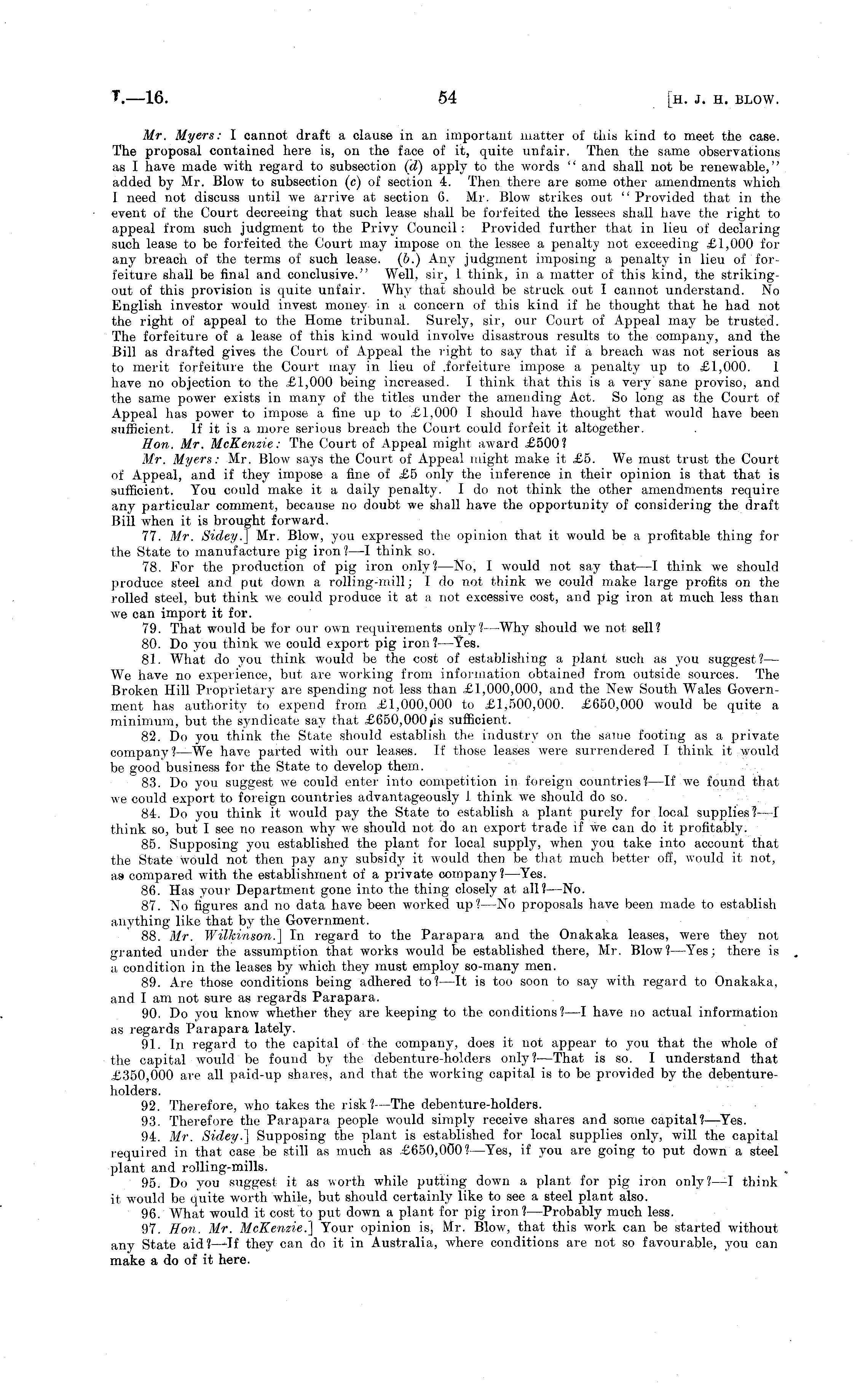 Mr. Myers: I cannot draft a clause in an important matter of this kind to meet the case. The proposal contained here is, on the face of it, quite unfair. Then the same observations as I have made with regard to subsection (d) apply to the words " and shall not be renewable," added by Mr. Blow to subsection (c) of section 4. Then there are some other amendments which 1 need not discuss until we arrive at section 6. Mr. Blow strikes out " Provided that in the event of the Court decreeing that such lease shall be forfeited the lessees shall have the right to appeal from such judgment to the Privy Council: Provided further that in lieu of declaring such lease to be forfeited the Court may impose on the lessee a penalty not exceeding £1,000 for any breach of the terms of such lease, (b.) Any judgment imposing a penalty in lieu of forfeiture shall be final and conclusive." Well, sir, 1 think, in a matter of this kind, the strikingout of this provision is quite unfair. Why that should be struck out I cannot understand. No English investor would invest money in a concern of this kind if he thought that he had not the right of appeal to the Home tribunal. Surely, sir, our Court of Appeal may be trusted. The forfeiture of a lease of this kind would involve disastrous results to the company, and the Bill as drafted gives the Court of Appeal the right to say that if a breach was not serious as to merit forfeiture the Court may in lieu of .forfeiture impose a penalty up to £1,000. 1 have no objection to the £1,000 being increased. I think that this is a very sane proviso, and the same power exists in many of the titles under the amending Act. So long as the Court of Appeal has power to impose a fine up to £1,000 I should have thought that would have been sufficient. If it is a more serious breach the Court could forfeit it altogether. Hon. Mr. McKenzie: The Court of Appeal might award £500? Mr. Myers: Mr. Blow 7 says the Court of Appeal might make it £5. We must trust the Court of Appeal, and if they impose a fine of £5 only the inference in their opinion is that that is sufficient. You could make it a daily penalty. I do not think the other amendments require any particular comment, because no doubt we shall have the opportunity of considering the draft Bill when it is brought forward. 77. Mr. Sidey.] Mr. Blow, you expressed the opinion that it would be a profitable thing for the State to manufacture pig iron? —I think so. 78. For the production of pig iron only?—No, I would not say that —I think we should produce steel and put down a rolling-mill; I do not think we could make large profits on the rolled steel, but think we could produce it at a not excessive cost, and pig iron at much less than we can import it for. 79. That would be for our own requirements only?— Why should we not sell? 80. Do you think we could export pig iron? —Yes. 81. What do you think would be the cost of establishing a plant such as you suggest?— We have no experience, but are working from information obtained from outside sources. The Broken Hill Proprietary are spending not less than £1,000,000, and the New South Wales Government has authority to expend from £1,000,000 to £1,500,000. £650,000 would be quite a minimum, but the syndicate say that £650,000 »is sufficient. 82. Do you think the State should establish the industry on the same footing as a private company- ? —We have parted with our leases. If those leases were surrendered I think it would be good business for the State to develop them. 83. Do you suggest we could enter into competition in foreign countries? —If we found that we could export to foreign countries advantageously 1 think we should do so. 84. Do you think it would pay the State to establish a plant purely for local supplies I—l1 —I think so, but I see no reason why we should not do an export trade if we can do it profitably. 85. Supposing you established the plant for local supply, when you take into account that the State would not then pay any subsidy it would then be that much better off, would it not, as- compared with the establishment of a private company? —Yes. 86. Has your Department gone into the thing closely at all? —No. 87. No figures and no data have been worked up? —No proposals have been made to establish anything like that by the Government. 88. Mr. Wilkinson.] In regard to the Parapara and the Onakaka leases, were they not granted under the assumption that works would be established there, Mr. Blow? —Yes; there is a condition in the leases by which they must employ so-many men. 89. Are those conditions being adhered to? —It is too soon to say with regard to Onakaka, and I am not sure as regards Parapara. 90. Do you know whether they are keeping to the conditions? —I have no actual information as regards Parapara lately. 91. In regard to the capital of the company, does it not appear to you that the whole of the capital would be found by the debenture-holders only?— That is so. I understand that £350,000 are all paid-up shares, and that the working capital is to be provided by the debentureholders. 92. Therefore, who takes the risk? —The debenture-holders. 93. Therefore the Parapara people would simply receive shares and some capital?— Yes. 94. Mr. Sidey.] Supposing the plant is established for local supplies only, will the capital required in that case be still as much as £650,000? —Yes, if you are going to put down a steel plant and rolling-mills. 95. Do you suggest it as worth while putting down a plant for pig iron only?—I think it would be quite worth while, but should certainly like to see a steel plant also. 96. What would it cost to put down a plant for pig iron? —Probably much less. 97. Hon. Mr. McKenzie.] Your opinion is, Mr. Blow, that this work can be started without any State aid? —If they can do it in Australia, where conditions are not so favourable, you can make a do of it here.