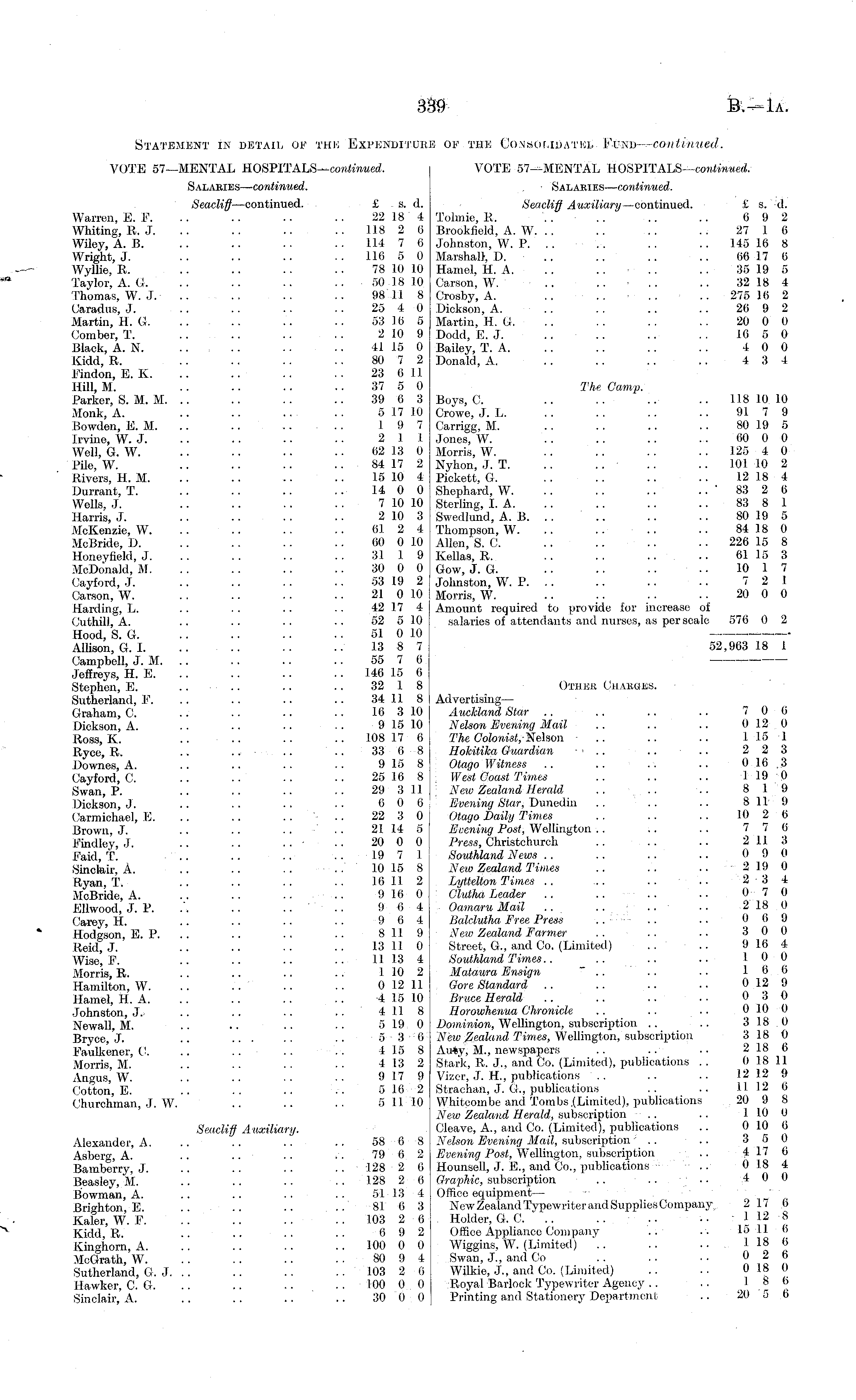 Statement in detail of the Expenditure of the Co:nsoi.ii)atki; Vvsi)—-coiiliiinei/. VOTE 57—MENTAL HOSPlTALS— continued. VOTE 57—MENTAL HOSPlTALS— continued. Salaries— continued. Salaries— continued. Seacliff —continued. £ s. d. Seacliff Auxiliary — -continued. £ s. <i. Warren, B. P. .. .. .. •• 22 184 Tolmie, R. .. .. .. .. 0 9 2 Whiting, R. J. .. .. .. .. .118 2 G Brookfield, A. W, .. .. .. .. 27 1 0 Wiley, A. B. .. .. . . .. 114 ! 6 Johnston, W. P. .. .. .. .. 145 IK 8 Wright, J. .. .. .. .. 116 5 0 Marshall, D. .. .. .. .. 66 17 (i Wyllie, X, .. .. .. 78 10 10 Hamel, H. A. . . .. . . .. 35 19 5 Taylor, A. (J. .. .. .. .. 50 18 10 Carson, W. .. .. .. .. 32 18 4 Thomas, W. J. .. .. .. .. 9811 8 Crosby, A. .. .. .. 275 Hi 2 Caradus, J. .. .. .. .. 25 4 0 Dickson, A. .. .. .. .. 26 9 2 Martin, H. G. ...... .. .. 53 16 5 Martin, H. C. .. .. .. .. 20 0 0 Comber,! , . .. .. .. .. 2 10 9 Dodd, E. J. .. .. .. .. 16 5 0 Black, A. N. .. .. 41. .15 0 Bailey, T. A. .. .. .. .. 4 0 0 Kidd, R. .. .. . . .. 80 7 2 Donald, A. .. .. . . .. 4 3 1 lilndon, E. K. .. .. .. .. 23 0] .1 Hill, M. .. .. .. .. 37 5 0 The Camp. Parker, S. M. M. .. .. .. .. 39 6 3 Boys, C. .. .. .. .. 118 10 10 Monk, A. .. .. 5 17 10 Crowe, J. L. .. .. .. .. 91 7 9 Bowden, E. M. .. .. .. .. 19 7 Carrigg, M. .. .. .. .. 80 19 5 Irvine, W. J. .. .. .. •• 2 11. Jones, W. .. .. .. .. 60 0 0 Well, G. W. .. .. . . • • 62 13 0 Morris, W. .. .. . . 125 4 0 Pile, W. .. .. .. .. 84 17 2 Nyhon, J. T. .. .. .. .. 101 10 2 Rivers, H. M. .. .. .. .. 15 10 4 Kckett, G. .. .. .. .. 12 18 4 Durrant, T. .. .. .. .. 14 0 0 Shephard, W. .. .. .. .. ' 83 2 6 Wells, J. .. .. .. .. 710 10 Sterling, LA. .. .. .. .. 83 8 1 Harris, J. .. .. .. • • 210 3 Swedlund, A. B. .. .. .. .. 80 19 5 MoKenzie, W. .. .. .. .. 6J 2 4 Thompson, W. .. .. .. • • 84 18 0 Mcßride, D. .. .. .. .. 60 010 Allen, S. C. .. .. .. 226 15 8 Honeyfield, J. .. .. .. .. 31 1 9 Kellas, R. .. .. .. .. 61 15 3 McDonald, M. .. .. .. .. 30 0 0 Gow, J. G. .. .. .. • ■ 10 1 7 Cayford, J. .. .. .. .. 53 19 2 Johnston, W. P. .. .. .. .. 7 2 1 Carson, W. .. .. • . • ■ 21 010 Morris, W. .. .. ■ ■ ■ • 20 0 0 Harding, L. .. .. . . .. 42 17 4 I Amount required to provide for increase of Cuthill, A. .. .. .. .. 52 510 j salaries of attendants and nurses, as per scale 576 0 2 Hood, S. G. .. .. .. .. 51 010 Allison, G.I 13 8 7 52,963 18 1 Campbell, J. M. .. .. .. .. 55 7 6 ■Jeffreys, H. E. .. .. .. •. 146 15 6 Stephen, E. .... .. .. 32 1 8 Othbb ohabo.es. Sutherland, F. .. . . .. .. 34 11 8 Advertising— Graham, C. .. .. .. • • 16 310 Auckland Star .. .. .. ■ ■ 7 0 0 Dickson, A. .. .. .. .. 915 10 Nelson Evening Mail .. .. .. 012 0 Ross, K. .. •• ■■ •• 108 17 6 The Colonist, Nelson .. .. .. 115 1 Ryce, R. .. .... .. 33 6 8 Hokitika Guardian ■• .. .. .. 223 Downes, A. .. .. .. .. 915 8 Otago Witness .. .. .. .. 016 .3 Cayford, C. .. .. .. •. 25 16 8 , West Coast Times .. .. .. 119 0 Swan, P. .. .. .. .. 29 311 ! : Mew Zealand Herald .. .. .. 8 19 Dickson, J. .. .. .. . . 6 0 6 Evening Star, Dunedin .. .. .. 8 119 Carmichael, E. .. .. .. .. 22 30 j Otago Daily Times .. .. .. 10 2(5 Brown, J. .. .. ■. • • 21 14 5 Evening Post, Wellington . . .. .. 7 7 6 Eindley, J. .. . . • • • • 20 00 ' Press, Christchurch .. .. .. 2 113 Eaid, T. .. .. .. ■ . 19 7 1 Southland News .. .. .. .. 0 9 0 Sinclair, A. .. .. .. . . 10 15 8 Neio Zealand Times .. .. .. 219 0 Ryan, T. . . • • • . • • 16 112 Lyttelton Times .. .. .. .. 23 4 Mcßride, A. .. .. ..... 916 0 Clutha Leader .. .. .. .. 0 7 0 Ellwood, J. P. .'. .. .. • • 9 6 4 Oamaru Mail .. .. .. .. 218 0 Carey, H. .. . . .. . . 96 4 Balclutha Free Press .. : .. .. 0 6 9 Hodgson, E. P. .. .. .. .. 811 9 New Zealand Farmer .. .. .. 30 0 Reid, J. .. •• ■• ■■ 13 11 0 Street, G., and Co. (Limited) .. .. 916 i Wise, F. .. .. .. •• 11 13 4 Southland Times.. .. .. .. 10 0 Morris, R. . . .. .. . . 110 2 Mataura Ensign '.. .. .. 18 6 Hamilton, W. .. .. .. .. 012 11 Gore Standard .. .. .. .. 012 !) Hamei, H. A. .. .. .. . . 415 10 Bruce Herald .. .. .. ■■ 03 0 Johnston, J. .. .. .. .. 411 8 Horowhenua Chronicle .. .. ■■ 010 0 Newall, M. .. .. .. .. 5 19 0 Dominion, Wellington, subscription .. .. 3 ]8 0 Bryce, J. .. ... .. .. ■5 3 6 New Zealand Times, Wellington, subscription 318 0 Faultener, C. .. . . .. .-. 415 8 Auty, M., newspapers .. .. .. 218 6 Morris, M. .. .. .. .. 4 13 2 Stark, R. J., and Co. (Limited), publications .. 0 18 11 Angus, W. .. .. .. .. 917 9 Vizer, J. H., publications .. .. .. 12 12 9 Cotton, E. .. .. .. •■ 5 16 2 Strachan, J. G., publications .. .. 11 12 6 Churchman, J. W. .. .. .. 5 11 10 Whitcombe and Tombs .(Limited), publications 20 9 8 New Zealand Herald, subscription .. .. 110 0 Seacliff Auxiliary. Cleave, A., and Co. (Limited), publications .. 010 6 Alexander, A. .. .. .'. .. 58 6 8 Nelson Evening Mail, subscription ; .. .. 3 5 0 Asberg, A. . . .. .. . . 79 6 2 Evening Post, Wellington, subscription .. 417 6 Bamberry, J. .. .. .. .. 128 2 6 Hounsell, J. E., and Co., publications .. 018 4 Beasley, M. .. .. . . . . 128 2 6 Graphic, subscription .. .. . • 4 0 0 Bowman, A. .. .. .. .. 51 13 4 Office equipment— Brighton E .. .. .. 81 6 3 New Zealand Typewriter and Supplies Company 217 t> Kaler, W. F. .. .. .. .. 103 2 6 Holder, G. C. .. .. .. •• Jl2 8 Kidd R. .. .. .. .. 6 9 2 Office Appliance Company .. .. 15 11 6 Kinghorn, A. .. .. .. 100 0 0 Wiggins. W. (Limited) .. .. .. 118 6 McGrath, W. .. .. .. .. 80 9 4 Swan, J., and Co .. .. ■• 02 6 Sutherland, G. J. .. .. .. .. 103 2 6 Wilkie, J., and Co. (Limited) .. .. 018 0 Hawker, C. G. . . .. .. .. ■ 100 0 0 Royal Barlock Typewriter Agency.. .. 18 6 Sinclair, A. .. .. .. .. 30 0 0 Printing and Stationery Department .. 20 5 6