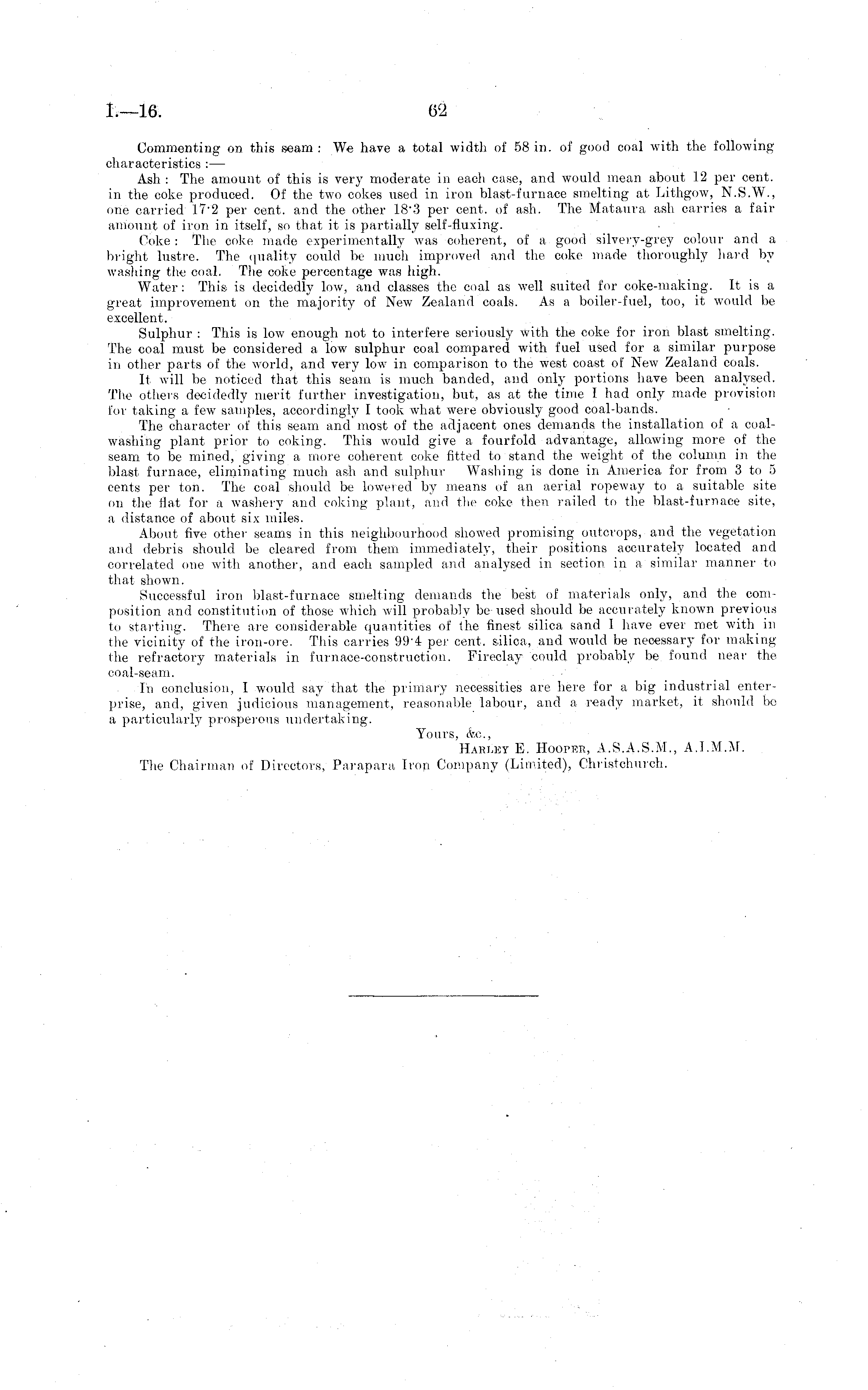 Commenting on this seam: We have a total width of 58 in. of good coal with the following characteristics :— Ash : The amount of this is very moderate in each case, and would mean about 12 per cent, in the coke produced. Of the two cokes used in iron blast-furnace smelting at Lithgow, N.S.W., one carried 17"2 per cent, and the other 18 - 3 per cent, of ash. The Mataura ash carries a failamount of iron in itself, so that it is partially self-fluxing. Coke: The coke made experimentally was coherent, of a good silvery-grey colour and a bright lustre. The quality could be much improved and the coke made thoroughly hard by washing the coal. The coke percentage was high. Water: This is decidedly low, and classes the coal as well suited for coke-making. It is a great improvement on the majority of New Zealand coals. As a boiler-fuel, too, it would be excellent. Sulphur : This is low enough not to interfere seriously with the coke for iron blast smelting. The coal must be considered a low sulphur coal compared with fuel used for a similar purpose in other parts of the world, and very low in comparison to the west coast of New Zealand coals. It will be noticed that this seam is much banded, and only portions have been analysed. The others decidedly merit further investigation, but, as at the time I had only made provision for taking a few samples, accordingly I took what were obviously good coal-bands. The character of this seam and most of the adjacent ones demands the installation of a coalwashing plant prior to coking. This would give a, fourfold advantage, allowing more of the seam to be mined, giving a more coherent coke fitted to stand the weight of the column in the blast furnace, eliminating much ash and sulphur Washing is done in America for from 3to 5 cents per ton. The coal should be lowered by means of an aerial ropeway to a suitable site on the fiat for a wasliery and coking plant, and the coke then railed to the blast-furnace site, a distance of about si.y miles. About five other seams in this neighbourhood showed promising outcrops, and the vegetation and debris should be cleared from them immediately, their positions accurately located and correlated one with another, and each sampled and analysed in section in a similar manner to that shown. Successful iron blast-furnace smelting demands the best of materials only, and the composition and constitution of those which will probably be used should be accurately known previous to starting. There are considerable quantities of the finest silica sand 1 have ever met with in the vicinity of the iron-ore. This carries 994 per cent, silica, and would be necessary for making the refractory materials in furnace-construction. Fireclay could probably be found near the coal-seam. In conclusion, I would say that the primary necessities are here for a big industrial enterprise, and, given judicious management, reasonable labour, and a ready market, it should be a particularly prosperous undertaking. Yours, (fee, Hahley E. Hooper, A.S.A.S.M., A.I.M.M. The Chairman of Directors, Parapara Iron Company (Limited), Christchurch.