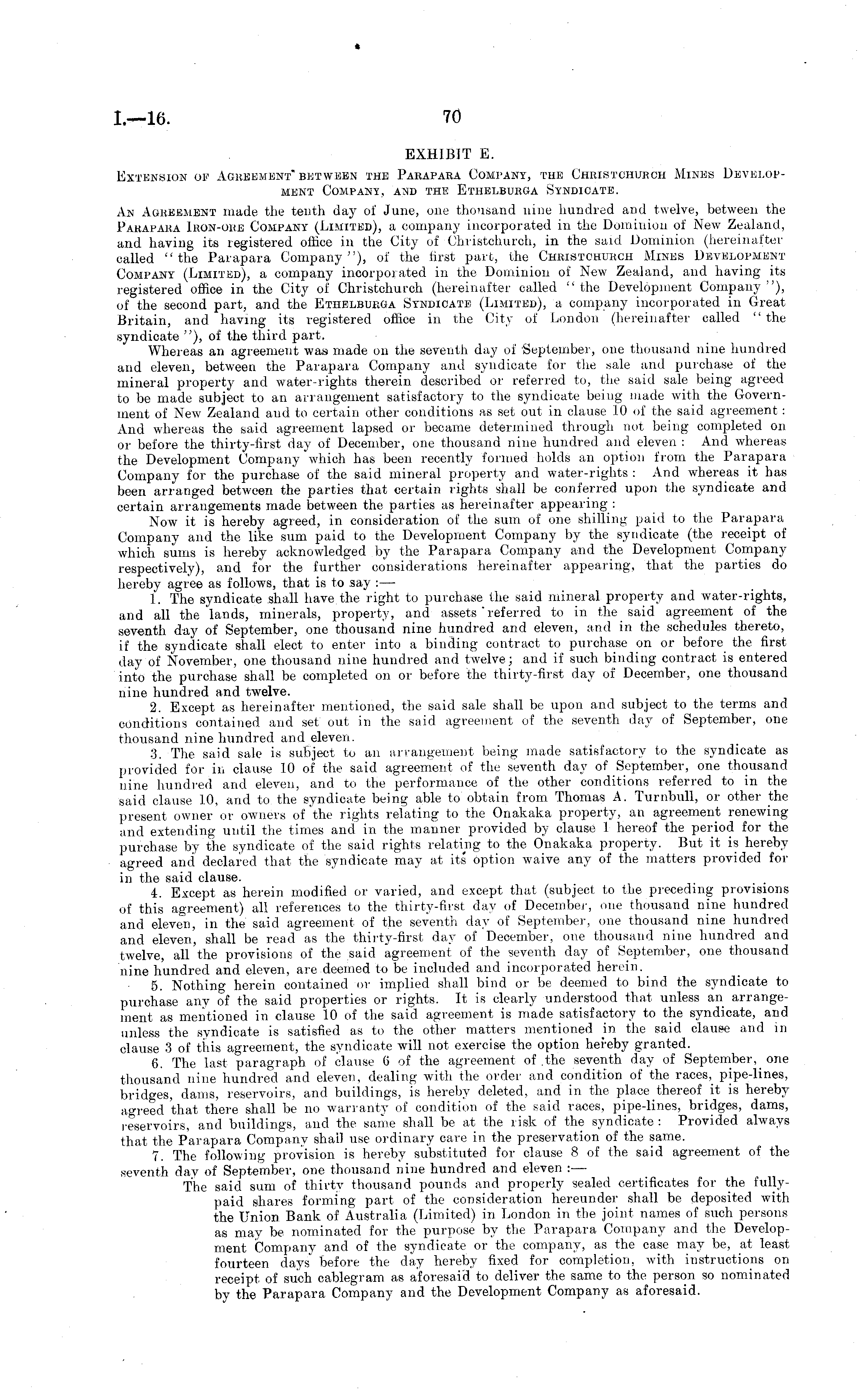 Extension of Agreement* between the Parapara Company, the Christchurch Mines Development Company, and the Ethelburga Syndicate. An Agreement made the tenth day of June, one thousand nine hundred and twelve, between the Parapara Iron-ore Company (Limited), a company incorporated in the Dominion of New Zealand, and having its registered office in the City of Christchurch, in the said Dominion (hereinafter called "the Parapara Company"), of the first part, the Christchurch Mines DevelopmentCompany (Limited), a company incorporated in the Dominion of New Zealand, and having its registered office in the City of Christchurch (hereinafter called "the Development Company"), of the second part, and the Ethelburga Syndicate (Limited), a company incorporated in Great Britain, and having its registered office in the City of London (hereinafter called " the syndicate "), of the third part. Whereas an agreement was made on the seventh day of September, one thousand nine hundred and eleven, between the Parapara Company and syndicate for the sale and purchase of the mineral property and water-rights therein described or referred to, the said sale being agreed to be made subject to an arrangement satisfactory to the syndicate beiug made yvith the Government of Neyv Zealand and to certain other conditions as set out in clause 10 of the said agreement : And whereas the said agreement lapsed or became determined through not being completed on or before the thirty-first day of December, one thousand nine hundred and eleven : And yvhereas the Development Company which has been recently formed holds an option from the Parapara Company for the purchase of the said mineral property and water-rights : And whereas it has been arranged between the parties that certain rights shall be conferred upon the syndicate and certain arrangements made between the parties as hereinafter appearing : Now it is hereby agreed, in consideration of the sum of one shilling paid to the Parapara Company and the like sum paid to the Development Company by the syndicate (the receipt of which sums is hereby acknowledged by the Parapara Company and the Development Company respectively), and for the further considerations hereinafter appearing, that the parties do hereby agree as follows, that is to say : — 1. The syndicate shall have,the right to purchase the said mineral property and yvater-rights, and all the lands, minerals, property, and assets' referred to in the said agreement of the seventh day of September, one thousand nine hundred and eleven, and in the schedules thereto, if the syndicate shall elect to enter into a binding contract to purchase on or before the first day of November, one thousand nine hundred and twelve; and if such binding contract is entered into the purchase shall be completed on or before the thirty-first day of December, one thousand nine hundred and twelve. 2. Except as hereinafter mentioned, the said sale shall be upon and subject to the terms and conditions contained and set out in the said agreement of the seventh day of September, one thousand nine hundred and eleven. 3. The said sale is subject to an arrangement being made satisfactory to the syndicate as provided for in clause 10 of the said agreement of the seventh day of September, one thousand nine hundred and eleven, and to the performance of the other conditions referred to in the said clause 10, and to the syndicate being able to obtain from Thomas A. Turnbull, or other the present owner or owners of the rights relating to the Onakaka property, an agreement renewing and extending until the times and in the manner provided by clause 1 hereof the period for the purchase by the syndicate of the said rights relating to the Onakaka property. But it is herebyagreed and declared that the syndicate may at its option waive any of the matters provided for in the said clause. 4. Except as herein modified or varied, and except that (subject to the preceding provisions of this agreement) all references to the thirty-first day of December, one thousand nine hundred and eleven, in the said agreement of the seventh day of September, one thousand nine hundred and eleven, shall be read as the thirty-first day of December, one thousand nine hundred and twelve, all the provisions of the said agreement of the seventh day of September, one thousand nine hundred and eleven, are deemed to be included and incorporated herein. 5. Nothing herein contained or implied shall bind or be deemed to bind the syndicate to purchase any of the said properties or rights. It is clearly understood that unless an arrangement as mentioned in clause 10 of the said agreement is made satisfactory to the syndicate, and unless the syndicate is satisfied as to the other matters mentioned in the said clause and in clause 3 of this agreement, the syndicate will not exercise the option hereby granted. 6. The last paragraph of clause 6 of the agreement of .the seventh day of September, one thousand nine hundred and eleven, dealing with the order and condition of the races,_ pipe-lines, bridges, dams, reservoirs, and buildings, is hereby deleted, and in the place thereof it is hereby agreed that there shall be no warranty of condition of the said races, pipe-lines, bridges, dams, reservoirs, and buildings, and the same shall be at the risk of the syndicate : Provided always that the Parapara Company shall use ordinary care in the preservation of the same. 7. The following provision is hereby substituted for clause 8 of the said agreement of the seventh day of September, one thousand nine hundred and eleven : — The said sum of thirty thousand pounds and properly sealed certificates for the fullypaid shares forming part of the consideration hereunder shall be deposited yvith the Union Bank of Australia (Limited) in London in the joint names of such persons as may be nominated for the purpose by the Parapara Company and the Development Company and of the syndicate or the company, as the case may