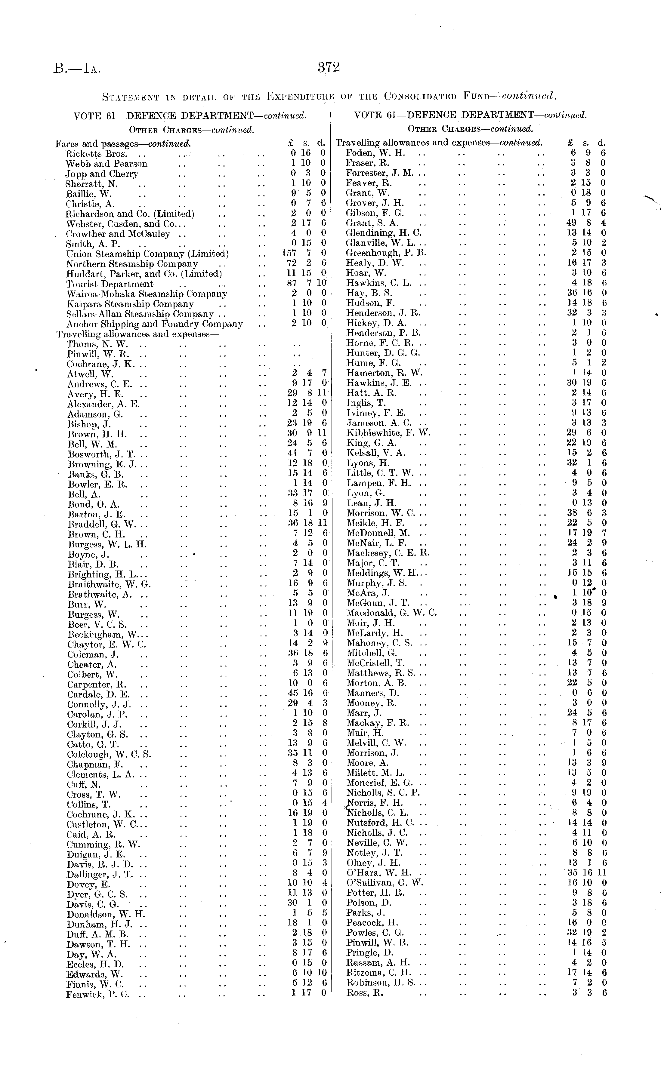 Statement in detail ok the Expenditure of the Consolidated Fund — continued. VOTE 61—DEFENCE DEPARTMENT— continued. VOTE 61— DEFENCE DEPARTMENT— continued. Othek Charges— continued. Otheb Charges— continued. Fares and passages— continued. £ s. d. Travelling allowances and expenses — continued. £ s. d. Ricketts Bros. .. .. .. .. 016 0 Foden, W. H. .. .. .. .. 6 9 6 Webb and Pearson .. .. .. 1 10 0 Eraser, R. .. .. .. .. 3 8 0 .Topp and Cherry . . . . .. 0 3 0 Forrester, J. M. .. .. .. .. 3 3 0 Shcrratt, N. .. .. .. .. 110 0 Feaver, R. .. . . .. .. 215 0 Baillie, W. .. ~ .. .. 9 5 0 Grant, W. .. .. .. .. 018 0 Christie, A. .. .. .. .. 0 7 6 Grover, J. H. .. .. .. . . 5 i) 6 Richardson and Co. (Limited) .. .. 2 0 0 Gibson, F. G. .. .. .. .. 117 6 Webster, Cusdon, and C 0... .. .. 2 17 6 Grant, S. A. .. .. .: .. 49 8 4 . Crowthor and McCauley .. .. .. 4 0 0 Glendining, H. C. .. .. .. 13 14 0 Smith, A. P. .. .. .. .. 015 0 Glanville, W. L. .. .. .. .. 510 2 Union Steamship Company (Limited) .. 157 7 0 Greenhough, P. B. .. .. .. 215 0 Northern Steamship Company .. .. 72 2 6 Healy, D. W. .. .. .. .. 16 17 3 Huddart, Parker, and Co. (Limited) .. 11 15 0 Hoar, W. .. .. .. .. 310 6 Tourist Department .. .. .. 87 710 Hawkins, C. L. .. .. •• .. 418 6 Wairoa-Mohaka Steamship Company .. 2 0 0 Hay, B. S. .. .. .. .. 36 16 0 Kaipara Steamship Company .'. .. 110 0 Hudson, F. .. .. .. .. 14 18 0 Sellars-Allan Steamship Company . ... 110 0 Henderson, J. R. .. . . .. 32 3 3 Anchor Shipping and Foundry Company .. 210 0 Hiokey, D. A. .. .. .. .. 110 0 Travelling allowances and expenses— Henderson. P. B. . . . . .. 2 16 Thorns, N. W. . . .. .. . • ■ • Home, F. C. R. ... • • • • . ■ 3 0 0 Pinwill, W. R. .. .. .. •• •• Hunter, D. G. G. .. .. .. 12 0 Cochrane, ,T. K. .. .. .. .. .. Hume, F. G. .. .. .. .. 5 12 Atwell, W. .. . • • • • • 2 4 7 Hamerton, R. W. .. .. .. 114 0 Andrews, C. E. .. .. .. .. 917 0 Hawkins, .1. E. . . .. .. .. 30 19 6 Avery HE .. .. .. 29 811 Hatt, A. R. .. .. .. .. 214 6 Alexander, A. E. 12 14 0 Inglis, T. 3 17 0 Adamson, G. .. . . .. .. 2 5 0 Ivimey, F. E. . . .. .. . . 913 6 Bishop J . . .. 23 19 6 .Jameson, A. C. .. .. .. .. 313 3 Brown'H H .. .. .. .. 30 911 Kibblewhitc, F. W. .. .. .. 29 6 0 Bell W M .. .. .. .. 24 5 6 King, G. A. .. .. .. .. 22 19 6 Bosworth, J. T. .. .. .. .. 41 7 0 Kelsall, V. A. .. .. .. .. 15 2 6 Browning, E. J. .. .. .. .. 12 18 0 Lyons, H. .. .. .. .. 32 1 6 Banks, G. B. .. .. .. .. 15 14 6 Little, C. T. W. .. .. .. .. 4 0 6 Bowler E R .. .. •• 1 14 0 Lampen, F. H. .. .. .. .. 9 5 0 Bell, A. 33 17 0 Lyon, G 3 4 0 Bond, O. A. . . . . .. • • 816 9 Lean, J. H. .. .. .. .. 013 0 Barton J E . . .. . • 15 10 Morrison, W. C. .. .. .. .. 38 6 3 Braddell, G. W. .. .. .. •• 36 18 11 Meikle, H. F. .. .. .. .. 22 5 0 Brown C. H . • • • • 712 6 McDonnell, M. .. .. .. .. 17 19 7 Burgess, W. L. 11. 4 5 0 MoNair, L. F 24 2 9 Boyne J . ..' ■■ •■ 200 Maekesey, C. E. R. . . .. . . 2 3 6 Blair, D. B. .. .. •• •• 714 0 Major, C. T. .. .. .. .. 311 6 Blighting, H. L... .. .. .. 29 0 Meddings, W. H... .. .. .. 15 15 6 Braithwaite, W. G. .. .. . . 16 9 6 Murphy, J. S. . . .. .. .. 012 0 Brathwaite, A. .. .. .. . • 5 5 0 McAra, J. . . .. .. ... # 1 10" 0 Burr W .. .. .. • • 13 9 0 McGoun, J. T. .. .. .. .. 318 9 Burgess W . .. •• 11 19 0 Macdonald, G. W. C. .. .. .. 015 0 Beer, V. C. S 10 0! Moir, J. H 213 0 Beckingham, W 314 0! MoLardy, H 230 Chaytor, E. W. C. .. .. .. 14 2 9 Mahoney, C. S. .. .. .. .. 15 7 0 Coleman, J. .. .. .. .. 36 18 6 | Mitchell, G. .. .. .. .. 4 5 0 Cheater A. .. .. .. • • 3 9 6 McCristell, T. .. .. .. .. 13 7 0 ('olbert, W. .. . . • • ■ • 613 0 Matthews, R. S. .. .. .. .. 13 7 6 Carpenter, R. .. .. .. . . 10 0 6 Morton, A. B. . . .. .. .. 22 5 0 < lardale, D. E. .. . . .. . ■ 45 16 6 Manners, D. .. .. .. . . 0 6 0 Connolly, J. J. . . .. .. •• 29 4 3 Mooney, R. . . .. .. .. 3 0 0 Carolan, J. P. .. .. .. • • 1 10. 0 Marr, J. .. .. .. . . 24 5 6 Corkill, J. J. .. .. ■• •■ 215 8 Mackay, F. R. .. .. .. .. 817 6 Clayton, G. S 3 8 0 Muir, H. 7 0 6 Catto, G. T. .. .. • • • ■ 13 9 6 Melvill, C. W. .. .. .. .. 15 0 Colclough, W. C. S. .. .. • ■ 35 11 0 Morrison, J. .. .. .. .. 16 6 Chapman F. .. .. •• ■• 830; Moore, A. .. .. .. .. 13 3 9 Clements, L. A 413 6 Millett, M. L 13 5 0 Cuff N .. •• •■ •• 790' Moncrief, E. G. .. .. .. .. 4 2 0 Cross, T. W. .. ■• • • •• 015 6 Nioholls, S. C. P. .. .. .. 919 0 Collins T .. • • ' ■ • 015 4 Norris, E. H. .. .. .. .. 6 4 0 Cochrane, J. X 16 19 0 Mcholls, C. L 8 8 0 Castleton, W. C... .. • • • • 119 0 Nutsford, H. C. .. .. .. .. 14 14 0 Caid A R . • • • • • 118 0 Nioholls, J. C. .. .. .. .. 411 0 Cummins, R. W. 2 7 0 Neville, C. W 6 10 0 Duigan, J. E 6 7 9 Notley, J. T 8 8 6 Davis, R.J. D 015 3 Olnoy, J. H 13 1 6 Dallineor, J. T. .. .. .. •• 8 4 0 O'Hara, W. H. .. .. .. .. 35 16 11 Dovey E .. •• •• 10 10 4 O'Suffivan, G. W. .. .. .. 16 10 0 Dyer G■ C. S. .. . . • • • • Ul3 0 Potter, H. R. .. .. .. 9 8 0 Davis, C. G. .. .. • • • ■ 30 1 0 Poison, I). .. .. .. .. 318 6 Donaldson, W. H. . . .. .. 15 5 Parks, J. .. .. . - .. 5 8 0 Dunham, H. J. .. .. . • ■ ■ 18 1 0 Peacock, H. .. . . .. .. Iβ 0 0 Duff AMB. .. .. •• 218 0 Powles, C. G. .. .. , . .. 32 19 2 Dawson, T. H 315 0 Pinwill, W. R .. .. 14 16 5 Day, W. A. .. .. ■ • • • 817 6 Pringle, D. .. .. .. .. 114 0 Eccl'es, H. D. .. .. • • 015 0 Rassam, A. H. .. .. .. .. 4 2 0 Edwards, W. .. .. .. • • 610 10 Ritzema, C. H. .. .. .. .. 17 14 6 Finnis, W. C. .. .. .. • • 512 6 Robinson, H. S. .. .. .. .. 7 2 0 Fenwick, P. C. .. . . .. ■ • 117 0 Ross, R. .. .. .. .. 3 3 6
