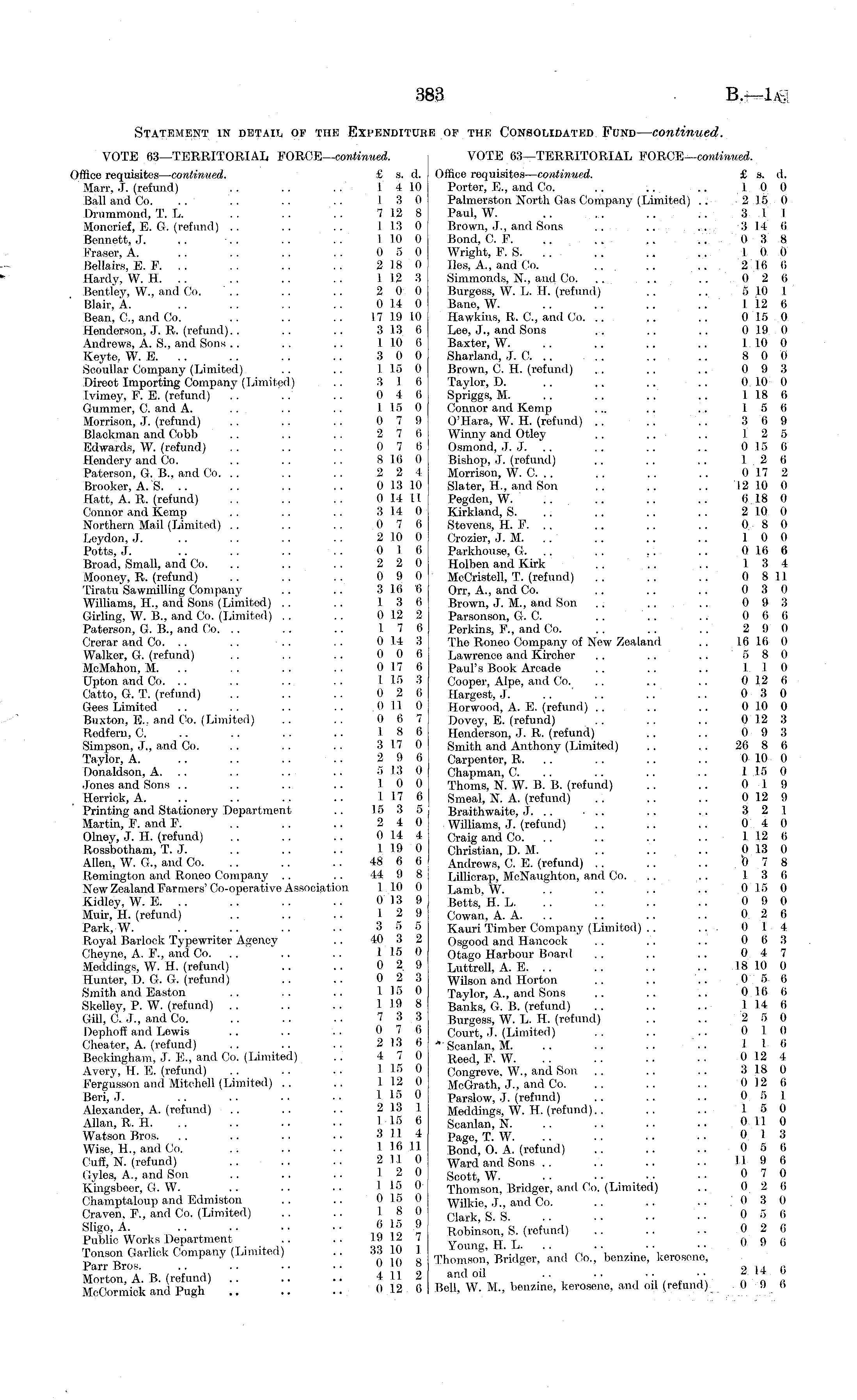 Statement in detail of the Expenditure of thk Consolidated Fond— continued. VOTE 63—TERRITORIAL FORCE— continued. VOTE 83—TERRITORIAL FORCE— omtinwd. Office requisites— continued. £ s. d. Office requisites— continued. £ s. d. Marr, J. (refund) . . .. . . 1 410 Porter, E., and Co. .. .. .. 10 0 Ball and Co. .. .. .. .. 13 0 Palmerston North Gas Company (Limited) .. 2J 5 0 Drummond, T. L. .. .. .. 712 8 Paul, W. .. ... .. .. .311 Moncrief, E. G. (refund) .. .. .. I 13 0 Brown, J., and Sons .. .. ... 314 (i Bennett,,!. .. •.. .. ..'. I 10 0 Bond, 0. F. .. .. .. .. 0 3 8 Eraser, A. .. .. . . . . 0 5 0 Wright, F. S. .. .. .. 1 0. 0 Bellairs, E. F. .. .. .. .. 2 18 0 lies, A., and Co. .. .. .. 2..1β (i Hardy, W. H. .. .. .. .. 1 12 3 Simmonds, N., and Co. .. .. .. 0 2 6 Bentley, W., and Co. '.. .. .. 2 0 0 Burgess, W. L. H. (refund) .. .. 510 I Blair, A. .. .. .. .. 014 0 Bane, W. .. .. .. .. 112 6 Bean, C, and Co. .. .. .. 17 19 10 Hawkins, R. C, and Co. .. .. .. 0 15 0 Henderson, J. R. (refund). . .. .. 313 6 Lee, J., and Sons .. .. .. 019 0 Andrews, A. S., and Sons .. .. .. 1 10 6 Baxter, W. .. .. .. .. 1,10 0 Keyte. W. E. .. .. .. .. 3 0 0 Sharland, J. C. .. .. .. .. 8 0 0 Sooullar Company (Limited) .. .. 115 0 Brown, C. H. (refund) .. .. .. 0 9 3 Direct Importing Company (Limited) .. 3 1 6 Taylor, D. .. .. .. .. 010 0 Ivimey, F. E. (refund) .. .. .. 0 4 6 Spriggs, M. .. .. .. .. 1 18 (i Gummer, C. and A. .. . . .. 115 0 Connor and Kemp ... .. .. 15 6 Morrison, ,T. (refund) .. .. .. 0 7 9 O'Hara, W. H. (refund) .. .. .. 3 6 9 Blackman and Cobb . . .. .. 2 7 6 Winny and Otley .. .. .. 12 5 Edwards, W. (refund) .. .. .. 0 7 6 Osmond, J. J. .. .. .. .. 015 6 Hondery and Co. .. . . . . 8 16 0 Bishop, J. (refund) .. . . .. 12 6 Paterson, G. 8., and Co. .. .. .. 2 2 4 Morrison, W. C. .. .. .. .. 0 17 2 Brooker, A. "S. .. .. .. .. 0 13 10 Slater, H., and Son .. .. .. 12 10 0 Hatt, A. R. (refund) .. . . .. 014 1 1 Pegden, W. .. .. .. .. 618 0 Connor and Kemp .. .. .. 3 14 0 Kirkland, S. .. .. .. .. 2 10 0 Northern Mail (Limited) . . .. .. 0 7 6 Stevens, H. F. . . .. .. .. 08 0 Leydon, J. . . .. .. .. 210 0 Crozier, J. M. .. .. .. .. 10 0 Potts, J. .. .. .. .. 0 16 Parkhouse, G. .. .. .. .. 016 6 Broad, Small, and Co. .. . . 2 2 0 Holben and Kirk .. .. .. 13 4 Mooney, R. (refund) .. .. .. 0 9 0 MeCristell, T. (refund) .. .. .. 0 811 Tiratu Sawmilling Company .. .. 316 6 Orr, A., and Co. .. . . .. 0 3 0 Williams, H., and Sons (Limited) .. .. 13 6 Brown, J. M., and Son .. .. .. 0 9 3 Girling, W. 8., and Co. (Limited) .. .. 012 2 Parsonson, G. C. .. .. .. 0 6 6 Paterson, G. 8., and Co. .. .. .. 17 6 Perkins, F., and Co. .. .. .. 2 9 0 Crerar and Co. .. . . .. .. 0 14 3 The Roneo Company of New Zealand .. 16 16 0 Walker, G. (refund) . . . . .. 0 0 6 Lawrence and Kircher .. .. .. 5 8 0 MoMahon, M. .. .. .. .. 017 6 Paul's Book Arcade .. .. .. 1. 1 0 Upton and Co. .. .. .. .. 115 3 Cooper, Alpe, and Co. .. .. .. 012 6 Catto, G. T. (refund) .. .. .. 0 2 6 Hargest, J. .. . . .. .. 0 3 0 Gees Limited .. .. .. .. 011 0 Horwood, A. E. (refund) .. .. .. 010 0 Buxton, E.. and Co. (Limited) .. .. 0 6 7 Dovey, E. (refund) .. .. .. 0 12 3 Redfern, C. .. .. .. . • 18 6 Henderson, J. R. (refund) .. .. 0 9 3 Simpson, J., and Co. . . . . .. 317 0 Smith and Anthony (Limited) .. .. 26 8 6 Taylor, A. .. .. .. .. 2 9 6 Carpenter, R. .. .. .. .. 010 0 Donaldson, A. .. .. .. .. 513 0 Chapman, C. .. .. .. .. 115 0 Jones and Sons .. .. .. .. .10 0 Thorns, N. W. B. B. (refund) .. .. 0 19 Herriek, A. .. .. .. .. 117 6 Smeal, N. A. (refund) .. .. .. 012 9 Printing and Stationery 'Department .. 15 3 5 Braithwaite, J. .. ■ .. .. .. 3 2 1 Martin, F. and F. .. .. .. 2 4 0 Williams, J. (refund) .. .. .. 0 4 0 Olney, J. H. (refund) .. .. .. 014 4 () ra i g and Co. . . .. .. .. 112 6 Rossbotham, T. J. .. .. .. 119 0 Christian, D. M. .. .. .. 013 0 Allen, W. G., and Co. .. .. .. 48 66 j Andrews, C. E. (refund) .. .. .. 07 8 Remington and Roneo Company .. .. 44 9 8 j Lillicrap, McNaughton, and Co. .. .. 13 6 New Zealand Farmers' Co-operative Association 110 0 Lamb, W. .. .. .. .. 015 0 Kidley, W. E. .. .. .. .. 013 9 Betts, H. L. .. .. .. .. 0 9 0 Muir, H. (refund) .. .. .. 1 2 9 Cowan, A. A. .. .. .. .. 0 2 6 Park, W. .. .. .. .. 3 5 5 Kauri Timber Company (Limited) .. ... 0 14 Royal Barlock Typewriter Agency .. 40 3 2 Osgood and Hancock .. .. .. 0 6 3 Cheyne, A. F., and Co. .. ' .. .. 115 0 Otago Harbour Board .. .. .. 0 4 7 Meddings, W. H. (refund) .. .. 0 29 Luttrell, A. E. .. .. .. .. 18 10 0 Hunter, D. G. G. (refund) .. .. 0 2 3 Wilson and Horton .. .. '.. 0 5 6 Smith and Eastern .. .. .. 115 0 Taylor, A., and Sons .. .. .. 016 6 Skelley, P. W. (refund) .. .. .. 119 8 Banks, G. B. (refund) .. .. .. 114 6 Gill, C. J., and Co. .. .. .. 7 3 3 Burgess, W. L. H. (refund) .. .. 2 5 0 Dephoff and Lewis .. .. •• 0 7 6 Court, J. (Limited) .. .. .. 0 10 Cheater, A. (refund) .. .. .. 213 6 " Scanlan, M. .. .. .. ■'~. 11-6 Beckingham, J. E., and. Co. (Limited) .. 4 7 0 fteed, F. W. . . .. .. ■ • 012 4 Avery, H. E. (refund) .. .. .. IIS 0 Congreve, W., and Sou .. .. .. 318 0 Fergusson and Mitchell (Limited) .. .. 112 0 McGrath, J., and Co. .. .. .. 012 6 Beri, J. .. .. .. • • 115 0 Parslow, J. (refund) . . .. .. 0 5 1 Alexander, A. (refund) .. .. .. 213 1 Meddings, W. H. (refund).. .. .. 15 0 Allan, R. H. .. .. .. •• I 15 6 Scanlan, N. .. .. .. •■ 0 1.1 0 Watson Bros. .. .. .. .. 3 114 p age> Tw. . _ . . .. .. 0 13 Wise, H., and Co. ..- .. .. 116 11 Bond, O. A. (refund) .. .. .. 05 6 Cuff, N. (refund) .. .. .. 211 0 Ward and Sons .. .. .. .. 11 9 6 Gyles, A., and Son .. .. .. 12 0 Scott, W. .. •• •• •■ 0 7 0 Kingsboer, G. W. .. •• •• 115 0 Thomson, Bridger, and Co. (Limited) .. 0 2 6 (Ihamptaloup and Edmiston .. .. 015 0 j Wilkie, J., and Co. .. .. .■ .030 Craven. F., and Co. (Limited) .. .. 18 0 Q ar k g g .. .. .. 0 5 6 *}%",! A - , •• , : 1Q 12 7 Robinson, S. (refund) 0 2