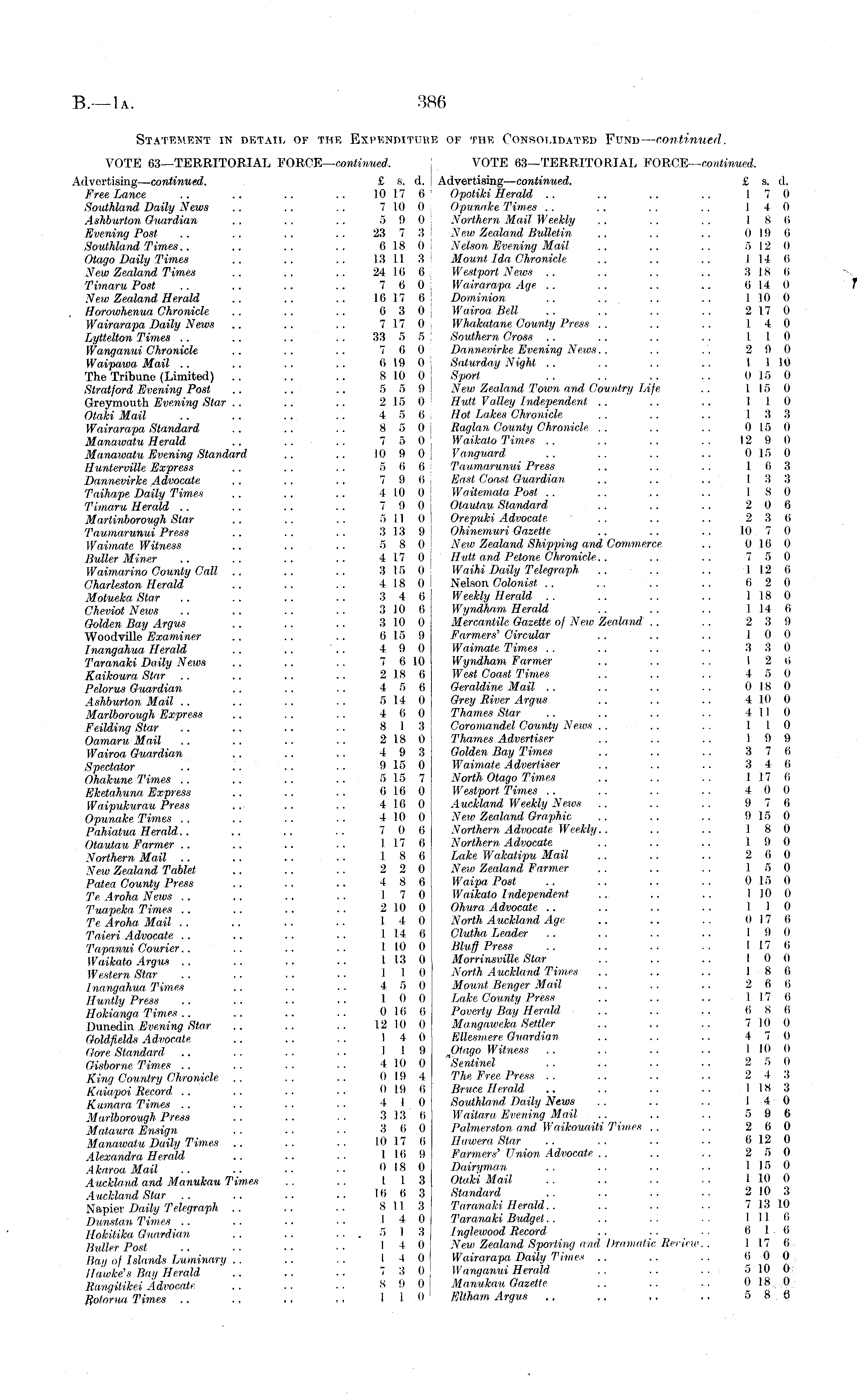Statement in detail of the Expenditure or the Consolidated Fund — continued. VOTE 63—TERRITORIAL FORCE— continued. j VOTE 63—TERRITORIAL FORCE— continued. Advertising — continued. £ s, d. ! Advertising— continued. £ s. d. Free Lance .. .. .. .. 10 17 6' Opotiki Herald .. .. .. .. 170 Southland Daily News .. .. .. 710 0 Opunake Times .. .. .. .. 14 0 Ashburton Guardian .. .. .. 5 0 0 Northern Mail Weekly .. . . . . I S 0 Evening Post .. .. .. . . 23 i 3 New Zealand Bulletin .. . . . . 0 19 6 Southland Times.. .. .. .. (i 18 0 Nelson Evening Mail .. .. . . 512 0 Otago Daily Times .. .. .. 13 113 Mount Ida Chronicle .. .. .. I 14 (i New Zealand Times .. .. .. 24 16 6. Westport News .. .. .. .. 3 18 6 Timaru Post .. .. .. .. 700 Wairarapa Age .. . . .. .. 0 14 0 Nero Zealand Herald .. .. .. Iβ 17 0 Dominion .. .. .. .. I 10 0 Horowhenua Chronicle .. .. .. 6 3 0: Wairoa Bell .. . . .. .. 2170 Wairarapa Daily News .. .. . . 717 0 Whakatane County Press .. . . . . 14 0 Lyttelton Times .. .. .. .. 33 5 5 Southern Cross .. .. .. .. 110 Wanganui Chronicle .. .. .. 7 0 0 Dannevirke Evening News.. .. .'. 2 0 0 Waipawa Mail .. .. .. .. f> 19 0 ; Saturday Night .. .. .. .. I I 10 The Tribune (Limited) .. .. .. 810 0 Sport .. .. .. .. 015 0 Stratford Evening Post .. .. .. 5 5 9 1 New Zealand Town and Country Life .. 115 0 Greymouth Evening Star .. .. .. 215 0 Hutt Valley Independent .. .. .. 110 Otaki Mail .. .. .. . . 4 5 0 Hot Lakes Chronicle .. .. .. I li :i Wairarapa Standard .. .. .. 8 5 0 Raglan County Chronicle .. .. .. 0 15 0 Manawatu Herald .. .. .. 7 5 0 j Waikato Times .. .. .. .. 12 9 0 Manawatu Evening Standard .. .. 10 9 0 Vanguard . . .. .. .. 015 0 Hunterville Express .. . . . . 5 6 6 Tamnarunui Press .. .. . . 16 3 Dannevirke Advocate .. .. .. 7 9 0 East Coast Guardian .. .. .. 13 3 Taihape Daily Times .. .. .. 4 10 0 Waitemata Post .. .. .. . . 18 0 Timaru Herald .. .. .. .. 7 9 0 Otautau Standard .. .. .. 2 0 6 Martinborough Star .. .. . . 5 110. Orepuki Advocate .. .. .. 2 3 0 Taumarunui Press .. .. .. 3 13 9 Ohinemuri Gazette .. .. .. 10 7 0 Waimate Witness .. .. .. 5 8 0 | New Zealand Shipping and Commerce .. 010 0 Butter Miner .. .. .. .. 417 0: Hutt and Petone Chronicle... .. .. 750 Waimarino County Call .. .. .. 315 0 Waihi Daily Telegraph .. .. .. I 1 2 0 Charleston Herald .. .. .. 4 18 0 i Nelson Colonist .. .. .. .. 0 2 0 Motueka Star .. .. .. .. 3 4 6 Weekly Herald .. .. .. .. 118 0 Cheviot News .. .. .. .. 310 6 Wyndham Herald .. . . .. 114 0 Golden Bay Argus .. .. .. 310 0 Mercantile Gazette, of New Zealand .. .. 2 3 9 Woodville Examiner .. .. .. 0 15 9 Farmers' Circular . . .. .. 10 0 Inangahua Herald .. .. .. 4 9 0 Waimate Times .. .. .. .. .'! 3 O Taranaki Daily News .. .. .. 7 010 Wyndham Farmer .. . . .. 12 0 Kaikoura Star .. .. .. .. 2180 West Coast Times .. .. .. 4 5 0 Pelorus Guardian .. .. ■. 4 5 6 Geraldine Mail .. .. .. .. 018 0 Ashburton Mail .. .. .. .. 5 14 0 Grey River Argus .. .. .. 4 10 0 Marlborough Express .. . . . . 4 (i 0 Thames Star .. .. .. .. 4 110 Feilding Star .. .. .. .. 8 13 Goromandel County News .. .. .. 110 Oamaru Mail .. .. .. .. 2180 Thames Advertiser .. .. .. 19 9 Wairoa Guardian .. .. .. 4 9 3 Golden Bay Times .. .. .. 3 7 6 Spectator .. .. . . . . 915 0 Waimate Advertiser .. .. . . 3 4 6 Ohakune Times .. .. .. . . 515 7 North Otago Times .. .. .. 117 0 Eketahuna Express .. .. .. 6 10 0 Westport Times .. .. .. .. 4 0 0 Waipukurau Press .. .. .. 410 0 Auckland Weekly News .. .. .. 9 7 0 Opunake Times .. .. .. .. 4100 New Zealand Graphic .. .. .. 915 0 Pahiatua Herald.. .. .. .. 7 0 6 Northern Advocate Weekly.. .. .. 18 0 Otautau Farmer .. .. .. .. 1 17 6 Northern Advocate .. .. .. 19 0 Northern Mail .. .. .. .. 18 0 Lake Wakatipu Mail .. .. .. 2 (i 0 New Zealand Tablet .. .. .. 2 2 0 New Zealand Farmer . . .. . . 15 0 Patea County Press .. .. .. 4 8 6 Waipa Post .. .. .. .. 015 0 Te Aroha News .. .. .. .. 17 0 Waikato Independent .. .. .. 110 0 Tuapeka Times .. .. .. .. 2100 Ohura Advocate .. .. .. .. 110 Te Aroha Mail . . .. .. .. I 4 0 North Auckland, Age .. .. . . 017 0 Taieri Advocate .. .. .. .. 114 0 Clutha Leader . . . . .. .. 19 0 Tapanui Courier.. .. .. .. I 10 0 Bluff Press .. .. .. .. I 17 0 Waikato Argus .. .. .. .. I 13 0 Morrinsville Star .. .. .. 0 0 Western Star .. .. .. . . 110 North Auckland Times . . .. .. 18 0 Inangahua Times .. .. .. 4 5 0 Mount Benger Mail .. .. .. 2 0 6 Huntly Press .. .. .. ■■ 10 0 Lake County Press .. .. .. I 1 7 6 Hokianga Times .. .. .. . . 016 6 Poverty Bay Herald .. .. .. 0 8 0 Dunedin Evening Star .. .. .. 12 10 0 Mangaweka Settler .. .. .. 710 0 Goldfields Advocate .. .. .. 14 0 Ellemiere Guardian .. .. .. 4 7 0 Go-re Standard .. .. .. .. 119 Otago Witness .. .. .. .. 110 0 Gisborne Times ... . .. .. 410 0 Sentinel . . .. .. . . 2 5 0 King Country Chronicle .. .. .. 019 4 The Free Presx .. .. .. .. 2 4 3 Kaiapoi Record .. .. .. ■■ 019 6 Bruce Herald .. .. .. .. I 18 3 Kumara Times .. .. .. .. 4 J 0 Southland Daily News .. .. .. 14 0 Marlborough Press .. .. .. 313 6 Waitara Evening Mail .. .. .. 5 9 6 Mataura Ensign . . .. . . 3 0 0 Palmerston and Waikouaili Times .. .. 2 0 0 Manawatu Daily Times .. .. .. 10 17 6 Hawera Star .. .. .. .. 012 0 Alexandra Herald .. .. .. I 10 9 Farmers' Union Advocate .. .. .. 2 5 0 Akaroa Mail .. .. ■■ ■■ 018 0 Dairyman .. .. .. .. 15 0 Auckland and Manukau Times .. .. 113 Otaki Mail . . ■. .. .. 110 0 Auckland Star .. .. .. .. 10 0 3 Standard .. .. .. ■■ 210 3 Napier Daily Telegraph .. .. .. 811 3 Taranaki Herald.. .. .. .. 713 10 Dunstan Times .. .. .. .. 14 0 Taranaki Budget.. .. . . .. 1110 Holdtika Guardian .. .. ... 5I 3 Inglewood Record .. .. . . 616 11 idler Post .. .. .. ■■ 14 0 New Zealand Sporting and Dramatic Review.. I 17 0 Bay of Islands Luminary .. ... .. 14 0 Wairarapa Daily Thues .. .. .. 00 0 Hawke's Bay Herald '.. .. .. 73 0 Wanganui Herald Rangilikei Advocate .. .. .. 8 9 0 Manukau Gazette .. .. .