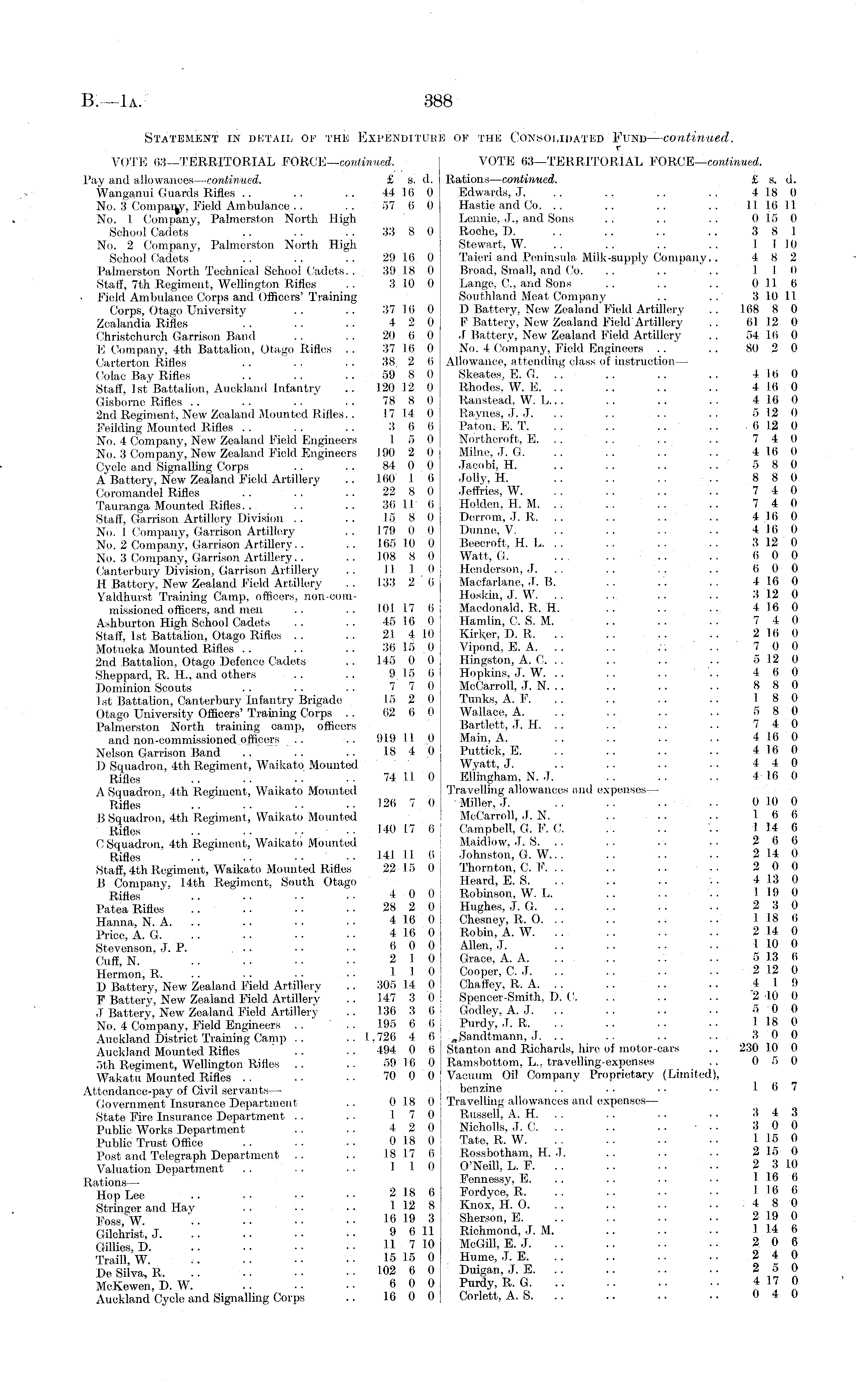 Statement in detail of the Expenditure of the Consolidated Fund — continued. r VOTE 63—TERRITORIAL FORCE— continued. VOTE 63—TERRITORIAL FORCE— continued. Pay and allowances— continued. £ s. d. Rations — continued. £ s. d. Wanganui Guards Rifles .. .. .. 44 16 0 Edwards, J. .. .. .. .. 418 0 No. 3 Compaq, Field Ambulance... .. 57 (> 0 Haatie and Co. .. .. .. .. II Mi II No. I Company, Palmerston North High Lennie, J., and Sons . . . . . . 0 15 0 School Cadets' .. . . . . 33 8 0 Roche, D. . . .. . . .. 3 S I No. 2 Company, Palmerston North High Stewart, W. .. .. .. .. I 1 10 School Cadets .. .. .. 29 16 0 Taieri and Peninsula Milk-supply Company.. 4 8 2 Palmerston North Technical School Cadets.. 39 18 0 Broad, Small, and Co. .. .. .. 110 Staff, 7th Regiment, Wellington Rifles .. 310 0 i Lange, C, and Sons .. .. .. 01 1 li • Field Ambulance Corps and Officers' Training Southland Meat Company .. .. 3 10 11 Corps, Otago University .. .. 37 16 0j D Battery, New Zealand Field Artillery .. 168 8 0 Zealandia Rifles '.. .. .. 4 20j F Battery, New Zealand Field Artillery .. (il 12 0 Christchurch Garrison Band . . .. 20 6.0 J Battery, New Zealand Field Artillery .. 54 l(i 0 E Company, 4th Battalion, Otago Rifles .. 37 16 0 No. 4 Company, Field Engineers .. .. 80 2 0 Carterton Rifles .. .. •• 38. 2 6 Allowance, attending class of instruction— Colac Bay Rifles .. .. .. 59 8 0 Skeates, E. G. .. .. .. .. 416 0 Staff, Ist'Battalion, Auckland Infantry .. 120 12 0 Rhodes, W. E. .. .. .. .. 416 0 Gisborne Rifles .. .. .. .. 78 8 0 Ranstead, W. L... .. .. .. 416 0 2nd Regiment, New Zealand Mounted Rifles.. 17 14 0 Raynes, J. J. .. .. .. .. 512 0 Feilding Mounted Rifles ... . .. 36 .6 Paion. E. T. . . .. .. .. 612 0 No. 4 Company, New Zealand Field Engineers I 5 0 j Northcroft, E. . . . . . . . . 7 4 0 No. 3 Company. New Zealand Field Engineers 190 2 0; Milne, J. G. .. .. .. .. 416 0 Cycle and Signalling Corps .. .. 84 0 0 Jaoobi, H. .. .. .. .. 5 8 0 A Battery, New Zealand Field Artillery .. 160 1 6 Jolly, H. .. . . . . .. 8 8 0 Coromandel Rifles .. .. .. 22 8 0 Jeffries, W. .. .. .. .. 7 4 0 Tauranga Mounted Rifles.. .. .. 36 II (i Holden, H. M. .. .. .. .. 7 4 0 Staff, Garrison Artillery Division .. .. 15. 8 0 Derrom, J. R. .. .. .. .. 416 0 No. I Company, Garrison Artillery .. 179 0 0 Dunne, V. .. .. .. .. 4160 No. 2 Company, Garrison Artillery. . .. 165 10 0 Beecroft, H. L. .. .. .. •■ 312 0 No. 3 Company, Garrison Artillery.. .. 108 8 0 Watt, G. ... .. .. .. 6 0 0 Canterbury Division, Garrison Artillery .. II 1 0 Henderson, J. .. . . .. .. 6 0 0 H Battery", New Zealand Field Artillery .. 133 2 6 Macfarlane, J. B. .. .'. .. 416 0 Valdhurst Training Camp, officers, non-com- Hoslcin, J. W. .. .. .. .. 3 12 0 missioned officers, and men .. .. 101 17 6 Macdonald, R. H. .. .. .. 416 0 Ashburton High School Cadets .. .. 45 16 0 Hamlin, C. S. M. .. .. .. 7 4 0 Staff, Ist Battalion, Otago Rifles .. .. 21 4LO j Kirker, D. R, .. .. .. .. 216 0 Motueka Mounted Rifles .. .. .. 36 15 0J Vipond, E. A. .. .. .. .. 7 0 0 2nd Battalion, Otago Defence Cadets .. 145 0 0 Hingston, A. C. .. .. .. .. 512 0 Sheppard, R. H., and others .. .. 915 (i Hopkins, J. W. .. .. .. .. 4 6 0 Dominion Scouts . . . . .. 7 7 0 McCarroll, J. N. .. .. .. . . 8 8 0 Ist Battalion, Canterbury Infantry Brigade 15 2 0 Tunks, A. F. .. .. .. .. 18 0 Otago University Officers' Training Corps .. 62 6 0 Wallace, A. .. .. .. .. 5 8 0 Palmerston North training camp, officers Bartlett, J. H. .. . . . . . . 7 4 0 and non-commissioned officers .. .. 919 II 0 Main, A. .. .. .. .. 416 0 Nelson Garrison Band .. .. .. 18 4,0 Puttiek. K. .. .. .. .. 4160 D Squadron, 4th Regiment, Waikato. Mounted Wyatt, J. .. .. •■ ■■ 4 4 0 Rifles .. .. .. ■■ 74 11 0 Ellingham. N. .1. .. .. .. 4 16 0 A Squadron, 4th Regiment, Waikato Mounted | Travelling allowances and expenses— Rifles .. .. •• •• 126 7.0 Miller, . I. .. .. .. .. 010 0 B Squadron, 4th Regiment, Waikato Mounted McCarroll, J. N. .. .. ■• 16 6 Rifles .. .. .. •• 140 17 6 : Campbell, G. l< , . ('. .. .. .. 1 14 6 ("Squadron. 4th Regiment, Waikato Mounted Maidlow, J. S. .. .. .. .. 2 6 6 Rifl es .. .. .. 141 11 6 Johnston, G. W... .. .. ■■ 214 0 Staff, 4th Regiment, Waikato Mounted Rifles 22 I 5 0 Thornton, C. F. .. . . • ■ ■ ■ 2 0 0 IS Company, 14th Regiment. South Otago Heard, E. S. .. .. ■■ •• 413 0 Rifles .. .. .. ■• 4 0 0 Robinson, W. L. .. •■ •• I 19 0 Pate'a Rifles .. .. .. .. 28 2 0 Hughes, J. G. .. .. . . .. 2 3 0 Hanna, N. A .. .. 416 0 Chesney, R. O .. .. 118 6 Price A G .. • • • • 416 0 Robin, A. W. .. .. . . .. 214 0 Stevenson, J. P. .. .. ■ • 6 0 0 j Allen, J. .. .. .. .. 110 0 (luff N • ■ ..210 Grace, A. A. .. .. .. .. 513 6 Hermon, R 110 Cooper, C. J 212 0 I) Battery, New Zealand Field Artillery .. 305 14 0 ' Chaffey, R. A. .. . . .. .. 419 F Battery, New Zealand Field Artillery .. 147 3 0 Spencer-Smith, D. 0. .. .. .. 210 0 J Battery, New Zealand Field Artillery . . 136 3 6 Godley. A. J. . . . . .. .. 50 0 No. 4 Company, Field Engineers . . .. 195 6 6 Purdy, J. R. .. .. ■■ ■• I 18 0 Auckland District Training Camp .. .. 1.726 4 6 ,Sandtmann, .1. .. .. .. .. 3 0 0 Auckland Mounted Rifles .. .. 494 0 6 i Stanton and Richards, hire of motor-cars .. 230 10 0 sth Regiment, Wellington Rifles .. .. 59 16 0 Ramsbottom, L.. travelling-expenses .. 0 5 0 Wakatu Mounted Rifles . . . . .. 70 0 0 Vacuum Oil Company Proprietary (Limited), Attendance-pay of Civil servants— benzine . . .. ■ ■ • • 16 7 Government Insurance Department .. 0 18 0 Travelling allowances and expensesState Fire Insurance Department ... . 17 0 Russell, A. H. . . .. ■ . • • 3 4 Public Works Department . . . . 4 2 0 Nicholls, J. C. .. .. . ■ • .. 3 0 0 Public Trust Office 018 0 Tate, R. W 115 0 Post and Telegraph Department . . . . 18 17 6 | Rossbotham, H. J. . . .. .. 215 0 Valuation Department 110 O'Neill, L. F