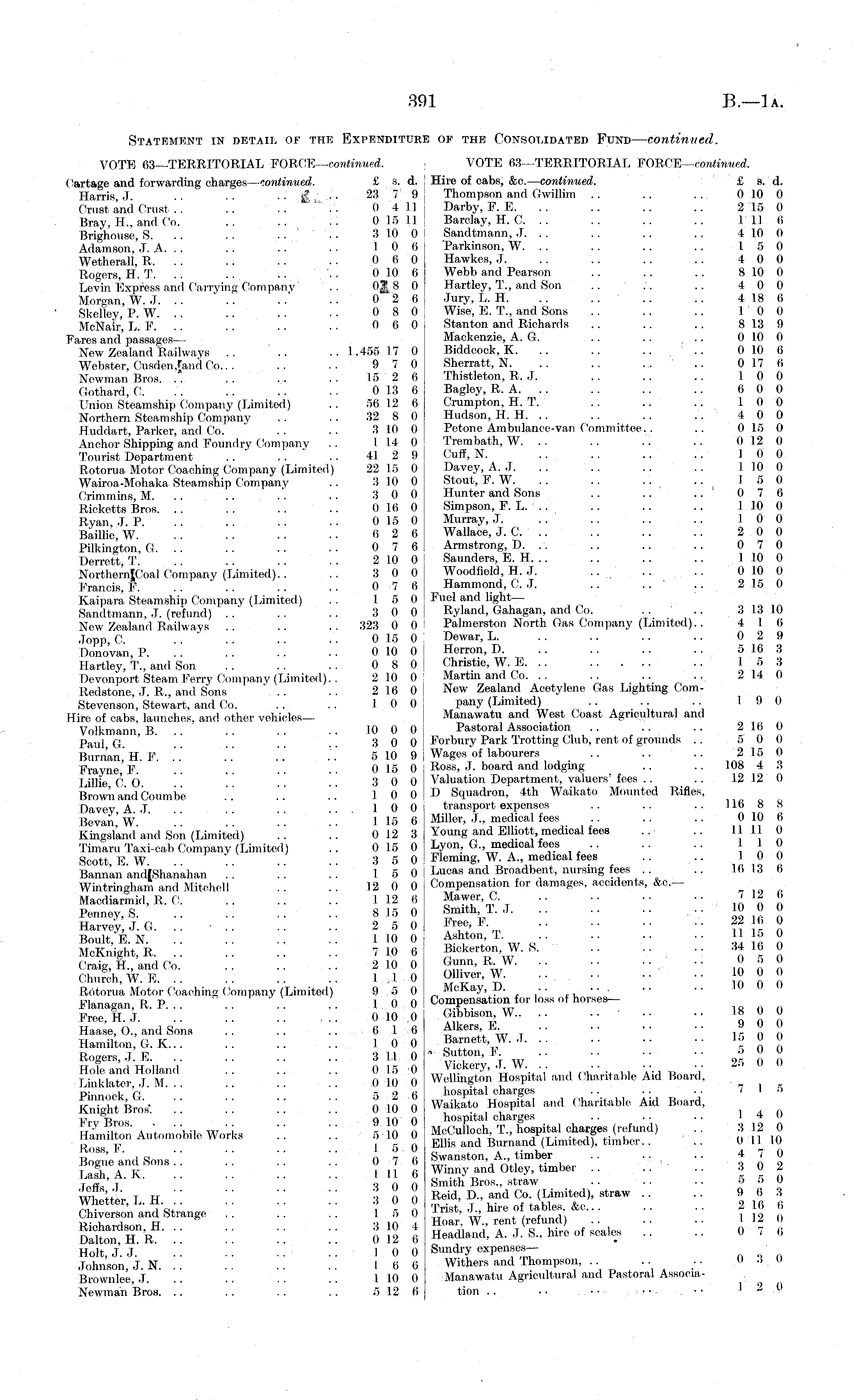 Statement in detail of the Expenditure of the Consolidated Fund— continued. VOTE 63—TERRITORIAL FORCE— continued. VOTE 03—TERRITORIAL FORCE— continued. Cartage and forwarding charges— continued. £ s. d. Hire of cabs, &c.— continued. £ s. d. Harris, J. .. .. • ■ if. i■• 23 '7' 9 Thompson and Gwillim .. .. .. 010 0 Crust and Crust .. .. .. .. 0 4 11; Darby, F. E. .. .. .. .. 213 0 Bray, H., and Co. .. .. .. 015 1]: Barclay, H. C. .. 11l f> Brighouse, S. .. .. .... 310 0 Sandtmann, J. .. .. .. .. 410 0 Adamson.'j. A. .. .. .. •. 10 6 Parkinson, W. ... . .. . . 15 0 Wetherall, R. .. .. . . . . 0 6 0 Hawkes, J. . . .. .. . . 40 0 Rogers, H. T. .. . . .. ' ".. 010 6 Webb and Pearson . . .. . . 810 0 Levin Express and Carrying Company .. 0J 8 0 Hartley, T., and Son .. .. .. 4 0 0 Morgan, W.J. .. .'. . .' •• 02 6 Jury, L. H. .. .. .. .. 418 6 Skelley, P. W. .. .. .. • • 0 8 0 Wise, E. T., and Sons .. .. .. 10 0 McNair L. F. .. . . . . 0 6 0 Stanton and Richards .. .. . . 8 1.3 9 Fares and'passages— Mackenzie, A. G. .. .. ... 010 0 Now Zealand Railways .. '.. .. 1.455 17 0 Biddcock, K. .. .. .... 010 6 Webster, Cusden/and C 0... .. .. 9 7 0 Sherratt, N. .. .. ... .. 017 6 Newman Bros .. .. ~,. .. 15 2 6 Thistleton, R. J. .. .. .. 10 0 Gothard, C. .. .. .'. .. 013 6 Bagley, R, A. .. .. .. .. 60 0 Union Steamship Company (Limited) . . 56 12 6 Crumpton, H. T. .. .. .. 10 0 Northern Steamship Company .. . . 32 8 0 Hudson, H. H. .. .. .. .. 40 0 Huddart, Parker, and Co. .. .. 310 0 Petone Ambulance-van Committee. . .. 015 0 Anchor Shipping and Foundry Company .. 1 14 0 Trembath, W. .. .. .. .. 012 0 Tourist Department .. .. .. 41 2 9 Cuff, N. .. .. .. .. 10 0 Rotorua Motor Coaching Company (Limited) 22 15 0 Davey, A. J. .. .. .. .. 110 0 Wairoa-M:ohaka Steamship Company .. 310 0 Stout, F. W. . . .. .. .. 15 0 Crimmins, M. .. .. . . .. 3 0 0 Hunter and Sons .. .. .. 0 7 6 Ricketts Bros. . . . . . . .. 0 16 0 Simpson, F. L. .. .. . . .. 1 10 0 Ryan, J. P. .. .. .. .. 015 0 Murray, J. .. .. .. .. 10 0 Baillie, W. .. . . .. .. 6 2 6 Wallace, J. C. .. .. .. .. 2 0 0 Pilkington, G. .. .. .. .. 076: Armstrong, D. .. .. .. .. 0 7 0 Derrett, T. .. .. .. . . 210 0 Saunders, E. H. .. .. .. .. 1 .10 0 NorthernJCoal Company (Limited).. .. 3 0 0 Woodfield, H. J. .. .. .. 010 0 Francis, F. .. '.. .. .. 076 Hammond, C. J. .. .. .. 215 0 Kaipara Steamship Company (Limited) .. 15 0 Fuel and light— Sandtmann, J. (refund) .. .. .. 3 0 0! Ryland, Gahagan, and Co. .. .. 313 10 New Zealand Railways .. .. .. 323 0 0 1 Palmerston North Gas Company (Limited).. 4 1 6 Jopp, C. . . ' . . .. .. 015 0 Dewar, L. . . .. .. .. 02 9 Donovan, P. . . .. . . .. 010 0 Herron, D. .. .. . . . . 516 3 Hartley, '1 , ., and Son . . . . .. 08 0! Christie, W. E. . . .. 153 Devonport Steam Ferry Company (Limited).. 210 0: Martin and Co. .. .. .. .. 214 0 Redstone J. R., and Sons ' .. . . 216 0 New Zealand Acetylene Gas Lighting ComStevenson, Stewart, and Co 10 0 pany (Limited) .. .. 19 0 Hire of cabs, launches, and other vehicles— M.anawatu and West Coast Agricultural and Volkmann B .. . . . . .. 10 0 0 Pastoral Association .. . . .. 2 16 0 p au j q. :j o 0 Forbury Park Trotting Club, rent of grounds .. 5 0 0 Burn'an H F .-.' .'. 5 10 9 I Wages of labourers .. .. .. 2 15 0 Frayne, F. .. . . .. . . 015 0 Ross, J. board and lodging .. . . 108 4 3 Lillie CO 3 0 0 Valuation Department, valuers' fees . . . . 12 12 0 Brown and Coum be .'.' .'.' .'.' 1 0 0 D Squadron, 4th Waikato Mounted Rifles, Davey, A. J. .. .. .. ....100 transport expenses .. .. .. Jib 8 S Bevan'w 1 15 6 ! Miller, J., medical fees .. .. .. 0 10 6 Kingsland' and Son (Limited) '.'. '.'. 012 3 Young and Elliott medical fees .. .. 1111 0 Timaru Taxi-cab Company (Limited) .. 015 0 Lyon, G., medical fees . . .. J 1 Scott F W . 3 5 0 Fleming, W. A., medical fees .. .. 10 0 Barman andfShanahan '.'. '.'. '.'. 15 0 Lucas and Broadbent, nursing fees . .. 16 13 6 Wintringham and Mitchell .. .. 12 0 0 Compensation for damages, accidents, &c— _ _ Macdiarmid, R. C 112 6 r ><?. 10 n 0 Penney, S .. 8.150 Smith 1. J ... 1000 Harvey J. G 2 5 0 Free, l<. 22 16 0 BoulVK. N 110 0 Ashton, T 11 15 0 McKnight, R 7 1.0 6 Bickerton, W. S. . . . . .. 34 Iβ 0 Craig, H., and Co 210 0 G™ n > R - W " , o Church W E I 1 0 Olliver, W. . . ■ ■ • • • ■ 10 0 0 Rotorua Motor Coaching Company (Limited) 9 5 0 McKay, D. .. .. .. . • iv Flanagan, R.P .. .. 10 0 I Compensation tor loss ol horsesFree, H.J 0 10.0 Gibbison W ■ .. .. 18 0 0 Haase, 0., and Sons 6 16 ■ A * ers '\ 7 T X n Hamilton, G.K 10 0 Barnett W. J r 0 Rogers, J. E 3 1,1 0 * &***, F. ;> 0 0 fllSr :: :: :: Vi% . 15 Pi olz P % 9 6 hospital charges .. . . • ■ /id S« :: :: :: :: o4 o wf»* *<?*»* and ch«a.ue am Board, am n hospital charges .. .. .. 14 0 „>,'.; '■~, ■~/■; " " r.|n „ ! McCufioch. T., hospital charges (refund) .. 312 0 Hamilton Automobile Works 510 0 timber. . .. OHIO Bogue and Sons!! " V. V. 07 6 A ttotar .'. 470 ,A a X i I, a Winnv and Otley, timber .. .. .. 6 0 I l ff' t' X Io o S™th Bros., straw 55 0 www T H V n 0 Reid, D., and Co. (Limited), straw .. . . 9 6 3 Whetter, L. H. ' Trist J hire of tables. &c 2 16 6 S!Xn n H ■• ! ° 4 Hoar. W., rent (refund) 112 0 DltnHß : :: :: :: 111 t .. 0 76 Holt, J. J 10 0 S' mdr y expensesJohnson, J. N 16 6 Withers and Thompson, . .. .. 03 0 Brownlee, J. .. .. . . .. 110 0 Manawatu Agricultural and Pastoral AssociaNewuian Bros. .. .. . . .. 5 12 6 tion .. .. ■ • • • . ■ • .12 0