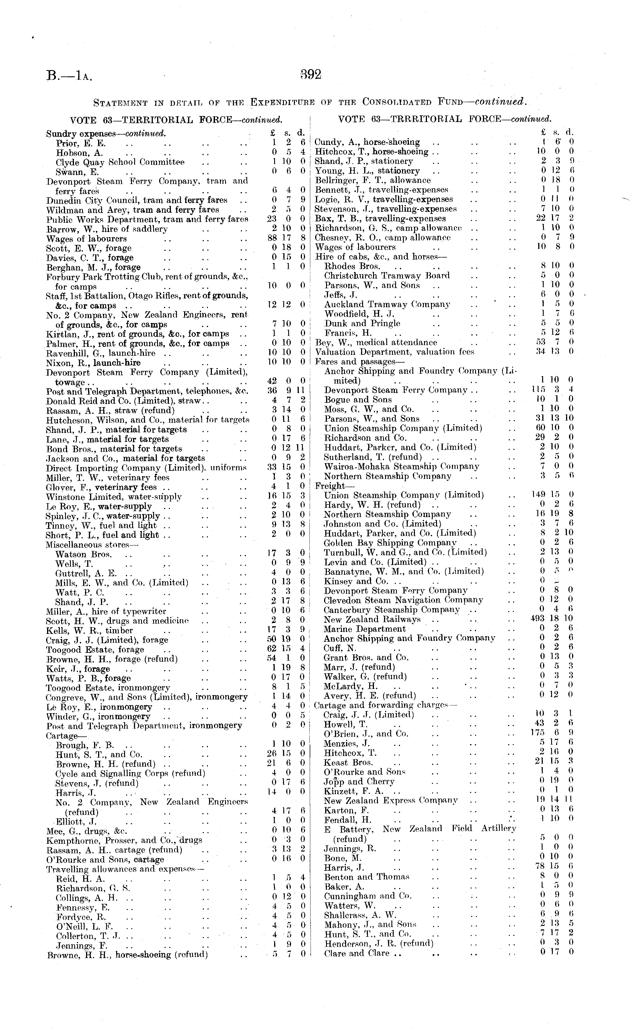 Statement in detail of the Expenditure of the Consolidated Fund — continued. VOTE 63—TERRITORIAL FORCE— continued. VOTE 63—TERRITORIAL FORCE— continued. Sundry expenses— continued. £ s. d. t s. d. Prior, E. E. .. .. • • • • 12 6 Cundy, A., horse-shoeing .. .. .. 160 Hobson, A. .. .. .. .. 0 5 4 Hitchoox, T., horse-shoeing .. .. .. 10 0 0 Clyde Quay School Committee .. .. I 10 0 Shand, J. P., stationery .. .. .. 2 3 0 Swarm, E. .. .. .. .. 0 6 0 . Young, H. L., stationery .. .. .. 0 12 6 Devonport Steam Ferry Company, tram anil Bellringer, F. T., allowance .. .. 0 18 0 ferry fares .. .. .. ■ • (14 0 Bennett, J., travelling-expenses .. .. 110 Dunedin City Council, tram and ferry fares .. 0 7 9 Logic, R. V., travelling-expenses .. .. 011 0 Wildman and Arey, tram and ferry fares .. 2 5 0 Stevenson, J., travelling-expenses .. .. 710 0 Public Works Department, tram and ferry fares 23 00 , Bax, T. 8., travelling-expenses .. .. 22 17 2 Barrow, W., hire of saddlery .. .. 210 0 j Richardson, G. S., camp allowance .. ..I 10 0 Wages of labourers .. .. .. 88 17 8 Chesney, R. 0., camp allowance .. .. 0 7 0 Scott, E. W., forage .. .. .. 0 18 0 Wages of labourers .. .. .. 10 8 0 Davies, C. T., forage .. .. .. 015 0 Hire of cabs, &c., and horses— Berghan, M. J., forage .. .. .. 110 Rhodes Bros. .. .. .. .. 810 0 Forbury Park Trotting Club, rent of grounds, &c. Christchurch Tramway Board .. .. 50 0 for camps .. .. .. .. 10 0 0 Parsons, W., and Sons .. .. .. 110 0 Staff, Ist Battalion, Otago Rifles, rent of grounds, .Teffs, ,T. .. .. .. .. 6 0 0 &c., for camps .. .. .. .. 12 12 0 Auckland Tramway Company .. .. 15 0 No. 2 Company, New Zealand Engineers, rent Woodfield, H. J. . . .. .. 17 6 of grounds, &0., for camps .. .. 710 0 Dunk and Pringle .. .. .. 5 5 0 Kirtlan, J., rent of grounds, &c., for camps .. 110 Francis, H. .. .. .. .. 512 6 Palmer, H., rent of grounds, &c, for camps .. 0 10 0 Bey, W., medical attendance . . .. 53 7 0 Ravenhill, G., launch-hire .. .. .. 10 10 0 Valuation Department, valuation fees .. 34 13 0 Nixon, R., launch-hire .. . . .. 10 10 0 Fares and passages — Devonport Steam Ferry Company (Limited), Anchor Shipping and Foundry Company (Litowage .. .. .. .. ■• 42 00 ; mited) '.. .. .. .. 110 0 Post and Telegraph Department, telephones, &c. 36 911 Devonport Steam Ferry Company .. .. 115 3 4 Donald Reid and Co. (Limited), straw.. .. 4 7 2 Bogue and Sons .. .. .. 10 1 0 Rassam, A. H., straw (refund) .. .. 314 0 Moss, G. W., and Co. .. .. .. 110 0 Hutcheson, Wilson, and Co., material for targets 011 6 Parsons, W., and Sons .. .. . . 31 13 10 Shand, J. P., material for targets .. .. 0 80; Union Steamship Company (Limited) .. 60 10 0 Lane, J., material for targets .. .. 017 6 Richardson and Co. .. . . .. 29 2 0 Bond Bros., material for targets .. .. 012 11 Huddart, Parker, and Co. (Limited) .. 210 0 Jackson and Co., material for targets .. 0 9 2 Sutherland, T. (refund) .. .. .. 2 5 0 Direct Importing Company (Limited), uniforms 33 15 0 Wairoa-Mohaka Steamship Company .. 70 0 Miller, T. W., veterinary fees .. .. 13 0 Northern Steamship Company .. .. 3 5 f> Glover, F., veterinary fees .. .. .. 4 10 Freight— Winstone Limited, water-supply .. .. 16 15 3 Union Steamship Company (Limited) .. 14915 0 Le Roy, E., water-supply ..' 240 Hardy, W. H. (refund) .. .. . . 02 6 Spinley, J. C, water-supply .. .. .. 2 1.0 0 i Northern Steamship Company .. .. Iβ 19 8 Tinney,' W., fuel and light .. .. .. 913 8 Johnston and Co. (Limited) .. .. 3 7 6 Short,' P. L., fuel and light .. .. .. 2 0 0; Huddart, Parker, and Co. (Limited) . . S 210 Miscellaneous stores— Golden Bay Shipping Company .. .. 0 2 6 Watson Bros. .. .. .. .. 1730 Turnbull, W. and G., and Co. (Limited) .. 213 0 Wells, T. .. .. .. . • 0 9 9 Levin and Co. (Limited) .. .. . . 0 5 0 Outtrell, A. E. .. .. ..' •• 400 Bannatyne, W. M., and Co. (Limited) .. 0 5 " Mills, E. W., and Co. (Limited) .. .. 013 6; Kinsey and Co. . . .. .. . . 0 _ Watt, P. C. .. .. . • • • 3 3 6: Devonport Steam Ferry Company . . 080 Shand, J. P. .. .. .. ■• 217 8 Clevedon Steam Navigation Company .. 012 0 Miller, A., hire of typewriter . . .. 010 6 Canterbury Steamship Company .. . . 0 4 6 Scott, H. W., drugs and medicine .. .. 2 8 0 New Zealand Railways .. .. .. 493 18 10 Kells, W. R., timber .. .. .. 17 3 9 Marine Department .. .. .. 0 2 6 Craig, J. J. (Limited), forage .. . . 50 19 0 Anchor Shipping and Foundry Company .. 0 2 6 Toogood Estate, forage .. .. .. 62 15 4 , Cuff, N. .. .. .. •• 0 2 6 Browne, H. H., forage (refund) .. .. 54 1 0 Grant Bros, and Co. .. .. .. 013 0 Keir, J., forage . . . . . . .. 119 8 Marr, J. (refund) .. .. .. 0 5 3 Watts, P. 8., forage .. .. .. 017 0 Walker, G. (refund) .. .. .. 0 3 3 Toogood Estate, ironmongery . . .. 8 15 McLardy, H. .. " .. • • 0 7 0 Congreve, W., and Sons (Limited), ironmongery I. 14 0 A very. H. E. (refund) .. .. .. 012 0 Le Roy, E., ironmongery .. .. . . 44 0 Cartage and forwarding chargesWinder, G., ironmongery .. .. .. 00 5 Craig, J. J. (Limited) .. .. .. 10 3 I Post and Telegraph Department, ironmongery 0 2 0; Howell, T. .. .. • • • • 43 2 6 Cartage-' O'Brien, J., and Co 175 6 9 Brough F B . .. .. 110 0 Menzies. .J. .. .. .. •• 517 6 Hunt, S. T., and Co 26 15 0 Hitchcox, T. .. .. .. .. 216 0 Browne, H. H. (refund) .. .. .. 21 6 0 Keast Bros. .. .. .. •■ 21 15 3 Cycle and Signalling Corps (refund) . . 4 0 0 O'Rourke and Sons .. . . .. 14 0 Stevens, J. (refund) .. .. .. 017 6 Jopp and Cherry .. .. .. 019 0 Harris, J. .. .. .. 14 0 0 Kinzett, F. A. .. .. .. .. (110 No 2 Company. New Zealand Engineers New Zealand Express Company .. .. 19 14 II (refund) ' .. .. .. 417 6 Karton, F. .. .. .. .. 013 6 Elliott, J. .. .. .. .. 10 0 Fendall, H. .. .. •■ . - - 110 0 Mcc, G., drugs, &c. .. .. .. 010 6 E Battery, New Zealand Field Artillery Kempthorne, Prosser, and Co., drugs .. 03 0 (refund) .. .. ■ ■ ■ • 50 0 Rassam, A. H.. cartage (refund) .. 
