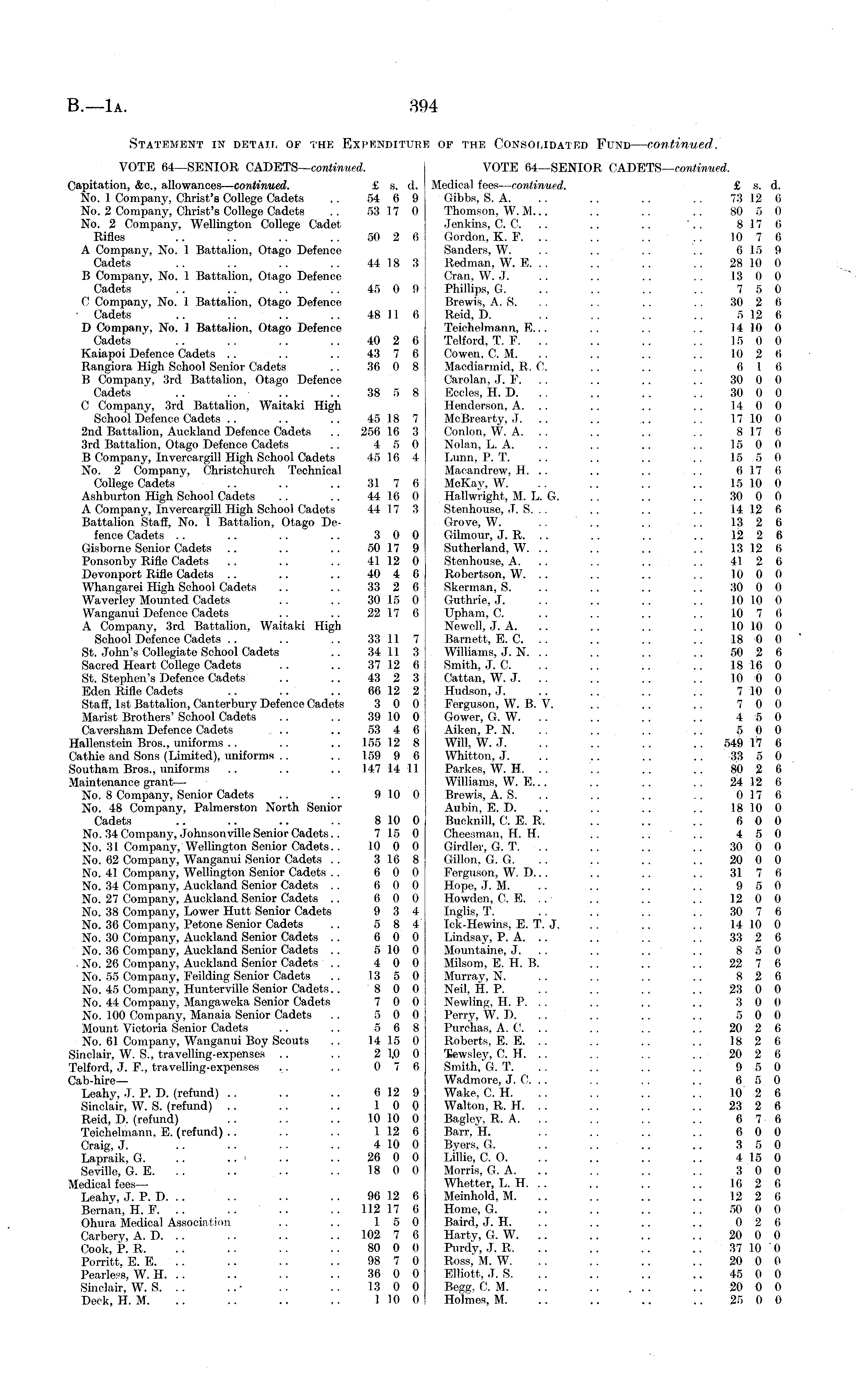 Statement in detatl of the Expenditure op the Consolidated Fund — continued. VOTE 64—SENIOR CADETS— continued. VOTE 64—SENIOR CADETS— continued. Capitation, <fee, allowances— continued. £ s. d. Medical fees— continued. £ s. d. No. 1 Company, Christ's College Cadets .. 54 6 9 Gibbs, S. A. .. .. .. .. 73 12 6 No. 2 Company, Christ's College Cadets .. 53 17 0 Thomson, W. M... .. .. .. 80 5 0 No. 2 Company, Wellington College Cadet Jenkins, C. C. .. .. .. '.. 8 17 6 Rifles .. .. .. .. 50 2 6 Gordon, K. F. .. .. .. .. 10 7 6 A Company, No. 1 Battalion, Otago Defence Sanders, W. .. .. . . .. 6 15 9 Cadets " .. .. .. .. 44 18 3 Redman, W. E. .. .. .. .. 28 10 0 B Company, No. 1 Battalion, Otago Defence Cran, W. J. .. .. .. .. 13 0 0 Cadets .. .. .. .. 45 0 9 Phillips, G. .. .. .. . . 7 5 0 C Company, No. 1 Battalion, Otago Defence Brewis, A. S. .. .. .. .. 30 2 6 ■ Cadets " .. .. .. .. 48 11 6 Reid, D. .. .. .. .. 512 6 D Company. No. 1 Battalion, Otago Defence Teiehelmann, E... .. .. .. 14 10 0 Cadets .. .. .. .. 40 2 6 Telford, T. P. .. .. .. .. 15 0 0 Kaiapoi Defence Cadets .. .. .. 43 7 6 Cowen, C. M. .. .. .. .. 10 2 t> Rangiora High School Senior Cadets .. 36 0 8 Macdiarmid, R. C. .. .. .. 6 16 B Company, 3rd Battalion, Otago Defence Carolan, J. F. .. .. .. .. 30 0 0 Cadets ' .. .. .. .. 38 5 8 Ecclos, H. D. .. .. .. .. 30 0 0 C Company, 3rd Battalion, Waitaki High Henderson. A. .. .. .. .. 1400 School Defence Cadets .. .. .. 45 18 7 Mcßrearty, J. .. .. ... .. 17 10 0 2nd Battalion, Auckland Defence Cadets .. 256 16 3 Conlon, W. A. .. .. .. .. 817 (i 3rd Battalion, Otago Defence Cadets .. 4 5 0 Nolan, L. A. .. .. .. .. 15 0 0 B Company, Invercargill High School Cadets 45 16 4 Lunn, P. T. .. .. .. .. 15 5 0 No. 2 Company, Christehurch Technical Macandrew, H. .. .. .. . . 617 (5 College Cadets ' .. .. .. 31 7 6 McKay, W. .. .. .. .. 15 10 0 Ashburton High School Cadets .. .. 44 16 0 Hallwright, M. L. G. .. .. .. 30 0 0 A Company, Invercargill High School Cadets 44 17 3 Stenhousc, J. S. . . .. .. . . 14 12 6 Battalion Staff, No. 1 Battalion, Otago De- drove, W. .. .. .. .. 13 2 6 fence Cadets .. .. .. .. 3 0 0 Gilmour, J. R. .. .. .. .. 12 2 6 Gisborne Senior Cadets .. .. .. 50 17 9 Sutherland, W. .. .. .. .. 13 12 t> Ponsonby Rifle Cadets .. .. .. 41 12 0 Stenhouse, A. .. .. .. 41 2 6 Devonpo'rt Rifle Cadets .. .. .. 40 4 6 Robertson, W. .. .. .. .. 1.0 0 0 Whangarei High School Cadets .. .. 33 2 6 Skerman, S. .. .. .. .. 30 0 0 Waverley Mounted Cadets .. .. 30 15 0 Guthrie, J. .. .. .. .. 10 10 0 Wanganui Defence Cadets .. .. 22 17 6 Upham, C. .. .. .. .. 10 7 6 A Company, 3rd Battalion, Waitaki High Newell, J. A. .. .. .. 10 10 0 School Defence Cadets .. .. .. 33 11 7 Barnett, E. C. .. .. .. .. 18 0 0 St. John's Collegiate School Cadets .. 34 11 3 Williams, J. N. .. .. .. .. 50 2 6 Sacred Heart College Cadets .. .. 37 12 6 Smith, J. C. .. .. .. .. 18 16 0 St. Stephen's Defence Cadets .. .. 43 2 3 Cattan, W. J. .. .. .. .. 10 0 0 Eden Rifle Cadets .. .. .. 66 12 2 Hudson, J. .. .. .. .. 7 10 0 Staff, Ist Battalion, Canterbury Defence Cadets 3 0 0 Ferguson, W. B. V. .. .. .. 7 0 0 Marist Brothers' School Cadets .. .. 39 10 0 Gower, G. W. .. .. .. .. 4 5 0 Caversham Defence Cadets .. .. 53 4 6 Aiken, P. N. .. .. .. .. 5 0 0 Hallenstein Bros., uniforms .. .. .. 155 12 8 Will, W. J. .. .. .. 549 17 6 Cathie and Sons (Limited), uniforms .. .. 1.59 9 6 Whitton, J. .. .. .. .. 33 5 0 Southam Bros., uniforms .. .. .. 1471411 Parkes, W. H. .. '.. .. .. 80 2 0 Maintenance grant— Williams, W. E... .. .. .. 24 12 6 No. 8 Company, Senior Cadets .. .. 9 10 0 Brewis, A. S. .. .. .. .. 017 6 No. 48 Company, Palmerston North Senior Aubin, E. D. .. .. .. .. 18 10 0 Cadets .. .. .. .. 810 0 Bucknill, C. E. R. .. .. .. 6 0 0 No. 34 Company, JohnsonvilleSenior Cadets.. 7 15 0 Cheesman, H. H. .. .. .. 4 5 0 No. 31 Company, Wellington Senior Cadets.. 10 0 0 Girdler, G. T. .. .. .. .. 30 0 0 No. 62 Company, Wanganui Senior Cadets .. 316 8 Gillon. G. G. .. .. .. .. 20 0 0 No. 41 Company, Wellington Senior Cadets .. 6 0 0 [ Ferguson, W. D... .. .. .. 317 6 No. 34 Company, Auckland Senior Cadets .. 6 0 0 Hope, J. M. .. .. .. . . 9 5 0 No. 27 Company, Auckland Senior Cadets .. 6 0 0 Howden, C. E. .. .. .. .. 12 0 0 No. 38 Company, Lower Hutt Senior Cadets 9 3 4 Inglis, T. . . .. .. .. 30 7 6 No. 36 Company, Petone Senior Cadets .. 5 8 4 Ick-Hewins, E. T. J. .. .. .. 14 10 0 No. 30 Company, Auckland Senior Cadets .. 6 0 0 Lindsay, P. A. .. . . .. .. 33 2 6 No. 36 Company, Auckland Senior Cadets . . 510 0 Mountaine, J. .. .. .. 8 5 0 ■ No. 26 Company, Auckland Senior Cadets .. 4 0 0 Milsom, E. H. B. .. .. .. 22 7 6 No. 55 Company, Feilding Senior Cadets .. 13 5 0 Murray, N. .. .. .. .. 8 2 6 No. 45 Company, Hunter ville Senior Cadets. . 8 0 0 Neil, H. P. .. .. .. .. 23 0 0 No. 44 Company. Mangaweka Senior Cadets 7 0 0 Newling, H. P. .. .. .. .. 3 0 0 No. 100 Company, Manaia Senior Cadets .. 5 0 0 Perry, W. D. .. .. .. .. 5 0 0 Mount Victoria Senior Cadets .. .. 5 6 8 Purc'has, A. C. .. .. .. .. 20 2 6 No. 61 Company, Wanganui Boy Scouts .. 14 15 0 Roberts, E. E. .. .. .. .. 1826 Sinclair, W. S., travelling-expenses .. .. 2 1.0 0 Sewsley, C. H. .. .. .. .. 20 2 6 Telford, J. F., travelling-expenses .. .. 0 7 6 Smith,'G. T. .. .. .. .. 9 5 0 Cab-hire— Wadmore, J. C. .. .. .. .. 6 5 0 Leahy, J. P. D. (refund) .. .. .. 612 9 Wake, C. H. .. .. .. .. 10 2 6 Sinclair, W. S. (refund) .. .. .. 10 0 Walton. R. H. .. .. .. .. 23 2 6 Reid, D. (refund) .. .. .. 10 10 0 Bagley, R. A. .. .. .. .. 6 7 6 Teiehelmann, E. (refund) .. .. .. I 12 6 Barr, H. .. . . .. .. 6 0 0 Craig, J. .. .. .. .. 410 0 Byers, G. .. . . .. .. 3 5 0 Lapraik, G. .. ..< .. .. 26 0 0 Lillie, C. O. .. .. .. .. 415 0 Seville, G. E. .. .. .. .. 18 0 0 Morris, G. A. .. .. .. .. 3 0 0 Medical fees— Whetter, L. H. .. .. .. .. 16 2 6 Leahy, J. P. D. .. .. .. .. 96 12 6 Meinhold, M. .. .. .. .. 12 2 6 Bernan, H. F. .. .. .. 112 17 6 Home, G.