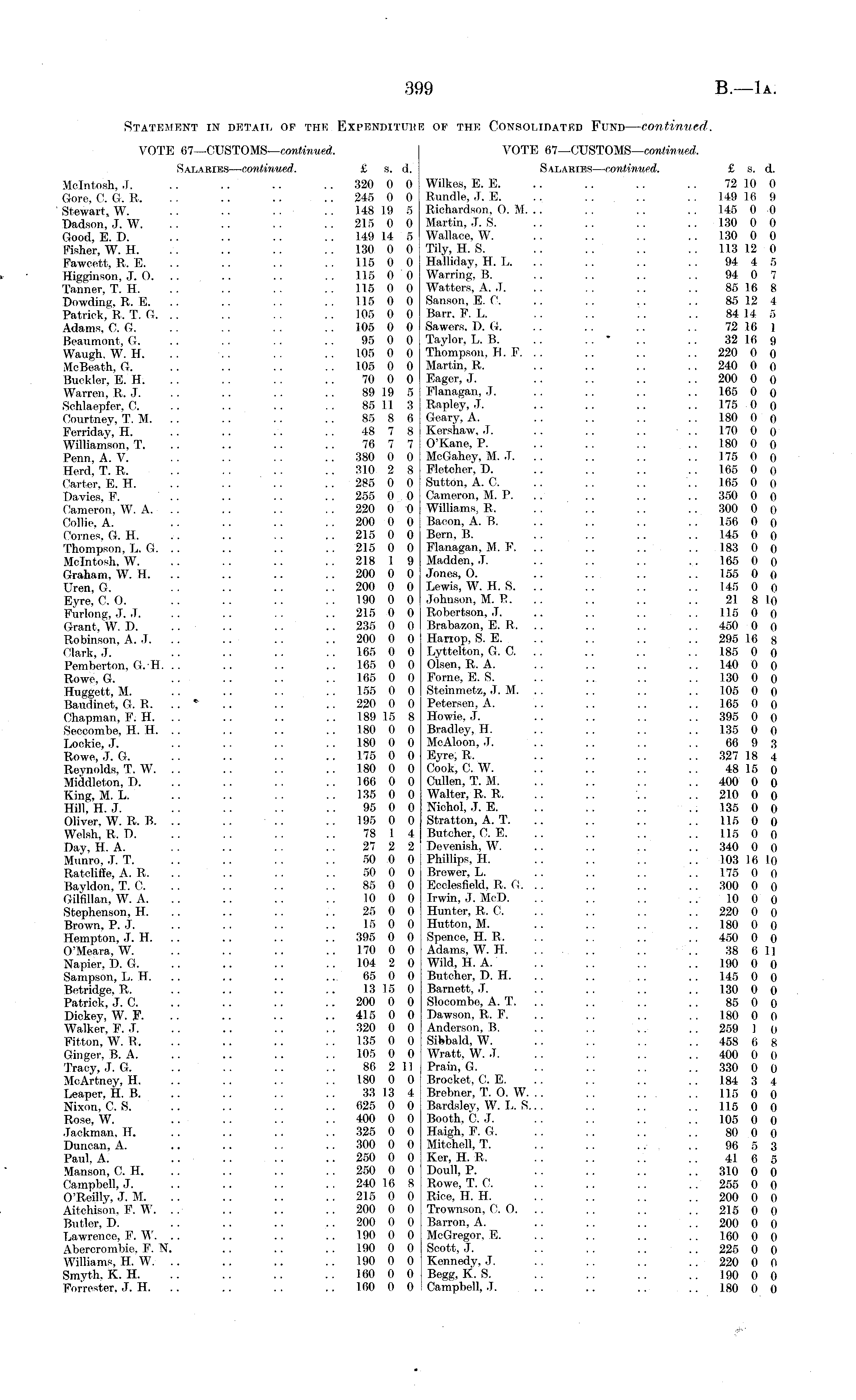 Statement in detail of the Expenditure of the Consolidated Fund — continued. VOTE 67—CUSTOMS— continued. VOTE 67—CUSTOMS— continued. Salaries— continued. £ s. d. Salaries— continued. £ s. d. Molntosh, .1. .. .. .. 320 0 0 Wilkes, E. E. .. .. .. .. 72 10 0 Gore, C. G. R. . . .. .. .. 245 0 0 Rundle, J. E. .. . . .. . . 149 16 9 Stewart, W. .. .. .. .. 148 19 5 Richardson, 0. M. .. .. .. .. 145 0 0 Dadson, J. W. . . .. . . .. 215 0 0 Martin, J. S. .. .. .. .. 130 0 0 Good, E. D. .. .. .. 149 14 5 Wallace, W. . . .. . . 130 0 0 Fisher, W. H. .. .. .. 130 0 0 Tily, H. S. .. .. .. .. 113 12 0 Fawcett, R. E. .. .. .. .. 115 0 0 Halliday, H. L. .. .. .. .. 94 4 5 Higginson, J. O. .. .. .. .. 115 0 0 Warring, B. .. .. .. .. 94 0 7 Tanner, T. H. .. .. .. .. 115 0 0 Watters, A. J. .. .. .. .. 85 16 8 Dowding, R. E. .. .. .. .. 115 0 0 Sanson, E. C. .. .. .. .. 85 12 4 Patrick, R. T. G. .. .. .. 105 0 0 Barr. P. L. .. .. .. .. 84 14 5 Adams. C. G. .. .. .. 105 0 0 Sawers, D. G. .. .. .. .. 72 16 1 Beaumont, G. .. .. .. .. 95 0 0 Taylor, L. B. .. .. • .. .. 32 16 9 Waugh, W. H. .. .. .. 105 0 0 Thompson, H. P. .. .. .. 220 0 0 Mcßeath, G. .. .. .. 105 0 0 Martin, R, .. .. .. . . 240 0 0 Buckler, E. H. .. . . . . .. 70 0 0 Eager, J. .. .. .. .. 200 0 0 Warren, R. J. .. .. .. .. 89 19 5 Flanagan, J. .. . . .. 165 0 0 Sehlaepfer, C. .. .. .. .. 85 11 3 Rapley, .T. .. .. .. 175-0 0 Courtney, T. M. .. .. .. .. 85 8 6 Geary, A. .. .. .. 180 0 () Ferriday, H. .. .. .. .. 48 7 8 Kerahaw, J. .. .. .. .. 170 0 () Williamson, , ] , . .. .. .. .. 76 7 7 O'Kane, P. .. .. .. 180 0 0 Perm, A. V. .. .. .. 380 0 0 McGahey, M. .T. .. .. .. 175 0 0 Herd, T. R. .. . . . . 310 2 8 Fletcher, D. .. .. .. .. 165 0 0 Carter, E. H. .. . . .. 285 0 0 Sutton, A. C. .. . . .. 165 0 (» Davies, F. .. .. .. 255 0 0 Cameron, M. P. .. .. .. .. 350 0 0 Cameron, W. A. . . .. .. .. 220 0 0 Williams, R, .. .. .. .. 300 0 0 Collie, A. .. .. .. 200 0 0 Bacon, A. B. .. .. .. . . 156 0 o Comes. G. H. .. .. .. 215 0 0 Bern. B. .. .. .. 145 0 0 Thompson, L. G. .. .. .. .. 215 0 0 Flanagan, M. F. .. .. .. 183 0 0 Molntosh, W. .. .. .. 218 1 9 Madden, J. .. .. .. 165 0 0 Graham, W. H. .. .. .. 200 0 0 Jones, O. .. 155 0 0 Uren, G. .. .. .. .. 200 0 0 Lewis, W. H. S. .. .. .. .. 145 0 0 Eyre, C. O. .. .. .. 190 0 0 Johnson, M. P,. .. .. .. .. 21 810 Furlong, J. J. .. .. .. 215 0 0 Robertson, J. .. .. .. .. 115 0 0 Grant, W. D. .. .. .. .. 235 0 0 Brabazon, E. R. .. .. .. .. 450 0 0 Robinson. A. J. .. .. .. .. 200 0 0 Harrop, S. E. .. .. .. .. 295 16 8 Clark, J. .. .. .. 165 0 0 Lyttelton, G. C. .. .. .. . . 185 0 0 Pemberton, G.H. .. .. .. 165 0 0 Olsen, R. A. .. .. .. 140 0 0 Rowe, G. .. .. .. 165 0 0 Forne, E. S. .. .. .. 130 0 0 Huggett, M. .. .. .. .. 155 0 0 Steinmetz, J. M. .. .. .. 105 0 0 Bandinet, G. R. .. * .. .. .. 220 0 0 Petersen, A. .. .. .. .. 165 0 o Chapman, F. H. .. .. .. 189 15 8 Home, J. .. .. .. .. 395 0 0 Seceombe, H. H. .. .. .. 180 0 0 Bradley, H. .. .. .. 135 0 0 Lockie, J. .. . . .. 180 0 0 McAloon, J. .. .. .. . . 66 9 3 Rowe, J. G. .. .. .. .. 175 0 0 Eyre, R. .. .. .. 327 18 4 Reynolds, T. W. .. .. .. 180 0 0 Cook, C. W. .. .. .. .. 48 15 0 Middleton, T). .. .. .. 166 0 0 Cullen, T. M. .. .. .. .. 400 0 0 King, M. L. .. .. .. .. 135 0 0 Walter, R. R. .. .. .. 210 0 0 Hill, H. J. .. .. .. .. 95 0 0 Nichol, J. E. .. . . .. 135 0 0 Oliver, W. R. B. .. .. .. .. 195 0 0 Stratton, A. T. .. .. .. US 0 0 Welsh, R. T). .. .. .. .. 78 1 4 Butcher, C. E. .. .. .. 115 0 0 Day, H. A. .. .. .. . . 27 2 2 Derenish, W. .. .. .. 340 0 0 Mimro, J. T. .. .. .. .. 50 0 0 Phillips, H. .. .. .. .. 103 16 10 Ratcliffe, A. R. .. .. . . .. 50 0 0 Brewer, L. .. .. . . 175 0 0 Bayldon, T. C. .. .. .. .. 85 0 0 Ecelesfield. R. (■',. .. .. .. 300 0 0 Gilfillan, W. A. .. .. .. .. 10 0 0 Irwin, J. MeD. .. .. .. .. 10 0 0 Stephenson, H. .. .. .. . . 25 0 0 Hunter, R. C. .. . . .. 220 0 0 Brown, P. J. .. .. .. .. 15 0 0 Hutton, M. .. .. .. 180 0 0 Hempton, J. H. .. .. .. 395 0 0 Spence, H. R. . . .. .. 450 0 0 O'Meara, W. .. .. .. .. 170 0 0 Adams, W. H. . . .. .. .. 38 (5 11 Napier, D. G. .. .. .. 104 2 0 Wild, H. A. .. .. .. 190 0 0 Sampson, L. H. .. .. .. ... 65 0 0 Butcher, D. H. .. .. .. . . 145 0 0 Betridge, R, .. .. .. .. 13 15 0 Barnett, J. .. .. .. 130 0 0 Patrick, J. C. .. .. .. .. 200 0 0 Slocombe, A. T. .. .. . . .. 85 0 0 Dickey, W. F. .. .. .. 415 0 0 Dawson. R, F. .. .. .. 180 0 0 Walker, F. J. .. .. .. 320 0 0 Anderson, B. .. . . .. .. 259 1 () Fitton, W. R. .. .. .. 135 0 0 Sibbald, W. .. .. .. 458 6 8 Ginger. B. A. .. .. .. 105 0 0 Wratt, W. J. .. .. .. 400 0 0 Tracy, J. G. .. .. .. .. 86 211 Pram, G. .. .. .. .. 330 0 0 McArtney, H. .. .. .. 180 0 0 Brocket, C. E. .. .. .. 184 3 4 Leaper, H. B. .. .. .. .. 33 13 4 Brebner, T. O. W. .. .. .. .. 115 0 0 Nixon, C. S. .. .. .. 625 0 0 Bardsley, W. L. S.. . .. .. .. 115 0 0 Rose, W. .. .. . . 400 0 0 Booth. C. J. . . .. .. 105 0 0 Jaekman, H. .. .. .. 325 0 0 Haigh, F. G. .. .. .. .. 80 0 0 Duncan. A. .. .. .. 300 0 0 Mitchell, T. .. .. ~ .. 96 5 3 Paul. A. .. .. .. .. 250 0 0 Ker, H. R. .. .. .. .. 41 6 5 Manson, C. H. .. .. .. . . 250 0 0 Doull, P. .. .. .. .. 310 0 0 Campbell, J. .. .. .. 240 16 8 Rowe, T. C. .. .. .. 255 0 0 O'Reilly, J. M. .. .. .. . . 215 0 0 Rice, H. H. . . .. . . .. 200 0 0 Aitchison. F. W. .. .. .. .. 200 0 0 Trownson, C. O. .. .. .. .. 215 0 0 Butler, D. . . .. .. 200 0 0 Barren, A. .. .. .. 200 0 0 Lawrence, F. W. .. .. .. .. 190 0 0 McGregor, E. .. .. .. .. 160 0 0 Abercrombie. F. N. .. .. 190 0 0 Scott, J. .. . . .. 225 0 0 Williams, H. W. .. .. .. 190 0 0 Kennedy, J. .. .. .. 220 0 0 Smyth, K. H. .. .. .. 160 0 0 Begg, K. S. .. .. .. 190 0 0 Forrester, J. H. .. .. .. .. 160 0 0 Campbell, J. .. .. .. 180 0 0