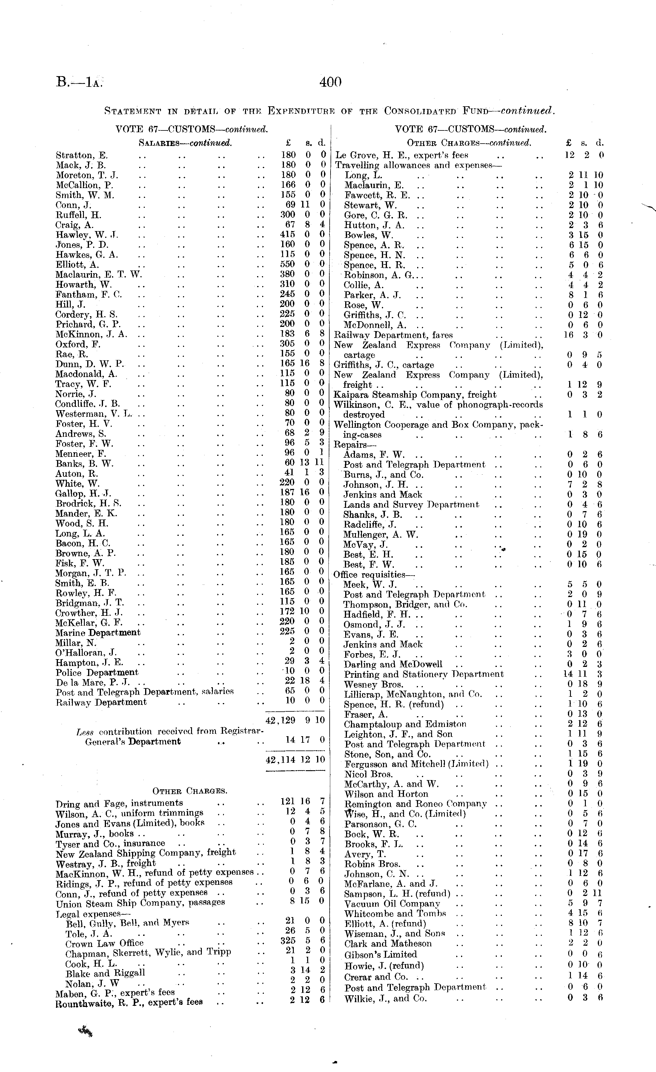 Statement in detail of the Expenditure of the Consolidated Fund— continued. VOTE 67—CUSTOMS— continued. VOTE 67—CUSTOMS— continued. Salaries — continued. £ s. d. Other Charges— continued. £ s. d. Stratton, E. .. .. .. .. 180 0 0 Le Grove, H. E., expert's fees .. .. 12 2 0 Mack, J. B. .. .. .. .. 180 0 0 Travelling allowances and expenses— Moreton, T. J. .. .. .. 180 0 0 Long, L. .. .. .. .. 211 10 MoCallion, P. .. .. .. 166 0 0 Maclaurin, E. .. .. .. .. 2 1 10 Smith, W. M. .. .. .. 155 0 0 Fawcett, R. E. .. .. .. .. 2 10 0 Conn, J. .. .. .. .. 69 11 0 Stewart, W. .. .. .. .. 2 10 0 Ruffell, H. .. .. .. 300 0 0 Gore, C. G. R. . . .. .. .. 210 0 Craig, A. .. .. .. .. 67 8 4 Hutton, J. A. .. .. .. .. 2 3 6 Hawley, W. J. .. .. .. 415 0 0 Bowles, W. . . .. .. .. 315 0 Jones, P. D. .. .. .. 160 0 0 Spence, A. R. .. .. .. .. 615 0 Hawkes, G. A. .. .. .. 115 0 0 Spenoe, H. N. .. .. .. .. 6 6 0 Elliott, A. .. .. .. 550 0 0 Spence, H. R. .. .. .. .. 5 0 6 Maclaurin, E. T. W. .. . . .. 380 0 0 Robinson, A. G... .. .. .. 4 4 2 Howarth, W. .. .. .. .. 310 0 0 Collie, A. .. .. .. .. 4 4 2 Fantham, F. C. .. .. .. 245 0 0 Parker, A. J. .. .. .. 8 16 Hill, J. .. .. .. .. 200 0 0 R OS e, W. .. .. .. .. 0 6 0 Cordery, H. S. .. .. .. .. 225 0 0 Griffiths, J. C. .. .. .. .. 012 0 Prichard, G. P. .. .. .. 200 0 0 McDonnell, A. . . .. .. .. 0 6 0 McKinnon, J. A. .. .. .. .. 183 6 8 Railway Department, fares .. .. 16 3 0 Oxford, F. .. .. .. .. 305 0 0 New Zealand Express Company (Limited), Rae, R. .. .. .. 155 0 0 cartage .. . . ' .. .. 0 9 5 Dunn, D. W. P. .. .. .. .. 165 16 8 Griffiths, J. C, cartage .. . . . . 0 4 0 Macdonald, A. .. .. .. .. 115 0 0 New Zealand Express Company (Limited), Tracy, W. F. .. .. .. .. 115 0 0 freight.. .. .. .. .. 112 9 Norrie, J. .. .. .. .. 80 0 0 Kaipara Steamship Company, freight .. 0 3 2 Condliffo, J. B. .. .. .. .. 80 0 0 Wilkinson, C. E., value of phonograph-records Westerman, V. L. . . .. .. .. 80 0 0 destroyed .. .. .. . . 110 Foster, H. V. .. .. . • • • 70 0 0 Wellington Cooperage and Box Company, packAndrews, S. .. .. .. . . 68 2 9 ing-cases .. .. .. ' .. 18 6 Foster, F. W. .. .. .. .. 96 5 3 Repairs— Menneer, F. . . .. .. .. 96 0 1 Adams, F. W. .. .. .. .. 0 2 6 Banks, B. W. .. .. .. .. 60 13 11 Post and Telegraph Department .. .. 06 0 Auton, R. .. .. .. 41 1 3 Burns, J., and Co. .. .. .. 010 0 White, W. 220 0 0 Johnson, J. H 7 2 8 Gallop, H.-.T. .. .. .. ■ • 187 16 0 Jenkins and Mack .. .. .. 0 3 0 Brodrick, H. S. .. .. .. .. 180 0 0 Lands and Survey Department .. .. 04 6 Mander, E. K. .. .. .. 180 0 0 Shanks, J. B. .'. .. .. .. 0 7 6 Wood, S. H. . . .. .. .. 180 0 0 Radcliffe, J. .. .. .. .; 010 6 Long, L. A. .. .. .. 165 0 0 Mullenger, A. W. .. .. .. 019 0 Bacon, H. C. .. .. .. 165 0 0 McVay, J. .. .. .. .. 0 2 0 Browne, A. P 180 0 0 Best> E H ' ~ 015 0 Fisk, F. W. .. .. .. •• 185 0 0 Best, F. W. .. .. .. .. 010 6 Morgan, J. T. P. .. .. .. .. 165 0 0 office requ i s i t i es _ Smith, E. B. .. .. .. .. 165 0 0 Meek; w j _ _ _ 5 5 0 Rowley, H. F. .. .. .. 165 0 0 Post and Telegraph Department .. .. 20 9 Bridgman, J. T. .. .. 115 0 0 Thompson, Bridger, and Co. .. .. 0 110 Crowther, H, J. .. .. .. .. 172 10 0 Hadfield, F. H. .. .. .. .. 0 7 6 McKellar, G. F. .. 220 0 0 Osmond, J. J 19 6 Marine Department .. .. -. 225 0 0 Evans, J. E. .. .. .. .. 0 3 6 Millar, N. .. .. ■• •• 2 0 0 Jenkins and' Mack .. .. .. 0 2 f> O'Halloran, J. .. .. .. • • 20 0 Fo rbes, E. J. .. .. .. .. 30 0 Hampton, .T. E. .. .. .. .. 29 3 4 Dar i mg an a McDowell .. .. .. 0 2 3 Police Department .. .. .. -10 0 U Printing and Stationery Department .. 1411 3 De la Mare, P. J. .. .. .. ■• 22 18 4 Wesney Bros. .. .. .. .. 018 9 Post and Telegraph Department, salaries .. 65 0 0 Lilliorap, McNaughton, and Co. .. .. 12 0 Railway Department .. .. .. 10 0 0 Spence, H. R. (refund) .. .. .. 110 6 Toloa Qin Fraser, A. .. .. .. .. 013 0 42.129 JlO Champtaloup and Edmiston .. .. 212 6 Less contribution received from Registrar- Leighton, J. F., and Son .. .. 1 11 9 General's Department ... .. Post and Telegraph Department .. .. 03 6 Tt - T77"T^~ 1A Stone, Son, and Co. .. .. .. 1 15 6 4/, jj*\i in Fergusson and Mitchell (Limited) .. .. 119 0 ' ' Nicol Bros. .. .. .. .. 0 3 9 McCarthy, A. and W. .. .. .. 0 9 6 Other Chaegis. Wilson and Horton .. .. .. 015 0 Dring and Fage, instruments .. .. 121 16 7 Remington and Roneo Company .. .. 0 10 Wilson, A. C, uniform trimmings .. .. 12 4 5 Wise, H., and Co. (Limited) .. .. 05 6 Jones and Evans (Limited), books .. .. 0 4 6 Parsonson, G. C. .. .. .. 0 7 0 Murray, J., books .. .. •• •■ 0 7 8 Bock, W. R. .. .. •• •• 012 (i Tyser and Co., insurance .. .. • • 03/ Brooks, F. L. .. .. .. .. 014 6 New Zealand Shipping Company, freight .. 18 4 A very, T. .. .. .. .. 017 6 Westray, J. 8., freight .. .. •• 18 3 Robins Bros. .. .. .. .. 08 0 MacKinnon, W. H., refund of petty expenses .. 0 7 6 Johnson, C. N. .. .. .. .. 112 6 Ridings, J. P., refund of petty expenses .. 0 6 0 MoFariane, A. and J. .. .. .. 0 6 0 Conn, J., refund of petty expenses .. .. 0 3 6 Sampson, L. H. (refund) .. .. .. 0 211 Union Steam Ship Company, passages .. 815 0 Vacuum Oil Company .. .. .. 5 9 7 Legal expenses— Whitcombe and Tombs . . .. . . 4 15 (i Bell. Gully, Bell, and Myers .. .. 21 00 | Elliott. A. (refund) .. .. .. 810 7 Tole.J. A. .. . • ■• •■ 26 5 0 Wiseman, J., and Sons .. .. .. 112 6 Crown Law Office .. • • • • 325 o 6 O i ark and M atheson .. .. .. 2 2 0 Chapman, Skerrett, Wylie, and Tripp .. 21 I » Gibson's Limited .. .. .. 0 0 6 Cook, H. L. .. oil o Howie, J. (refund) 010 0 Blake andßiggall 22 0! Crerar and Co 114 6 \rtTcP expert's fees'' " '.'. 212 6 Post and Telegraph Department .. .. 06 0 .. •• 212 6 Wilkie,,T.,andCo. 0 3 6