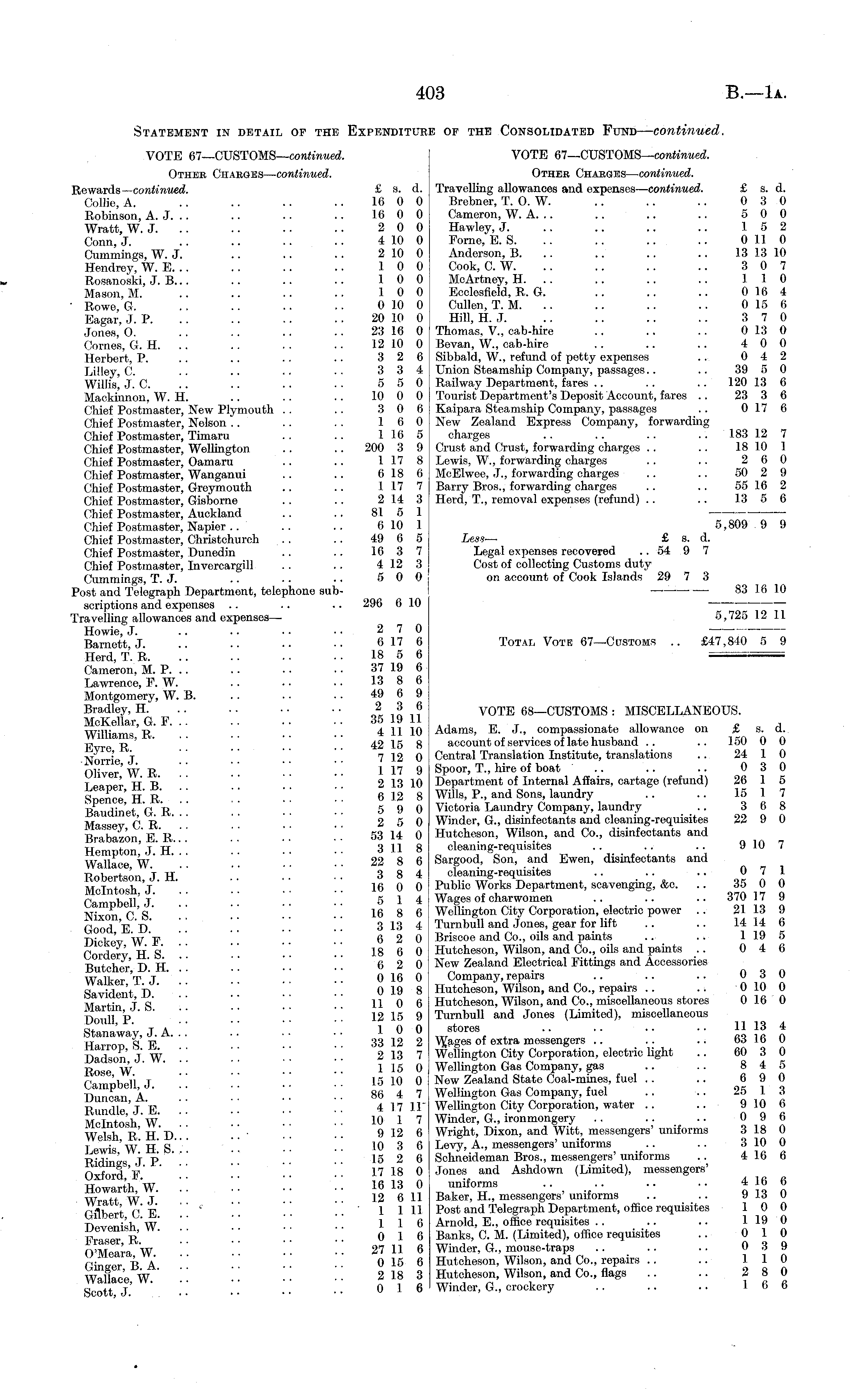 Statement in detail of the Expenditure of the Consolidated Fund— continued. VOTE 67—CUSTOMS— continued. VOTE 67—CUSTOMS— continued. Otheb Chaeqes— continued. Otheb Chaeges— continued. Rewards— continued. £ s. d. Travelling allowances and expenses— continued. £ s. d. Collie, A. .. .. . . .. 16 0 0 Brebner, T. 0. W. .. .. .. 0 3 0 Robinson, A. J. .. .. .. .. 16 0 0 Cameron, W. A. .. .. .. .. 5 0 0 Wratt, W. J. . . .. .. .. 2 0 0 Hawley, J. .. .. .. .. 15 2 Conn, J. .. .. .. .. 410 0 Pome, E. S. .. .. .. .. 011 0 Cummings, W. J. .. .. .. 210 0 Anderson, B. .. .. .. .. 13 13 10 Hendrey, W. E. .. .. .. .. 10 0 Cook, C. W. .. .. .. .. 3 0 7 Rosanoski, J. 8... .. .. .. 10 0 McArtney, H. .. .. .. .. 110 Mason, M. .. .. .. .. 10 0 Eeolesfield, R. G. .. .. .. 016 4 ■ Rowe G .. .. .. .. 010 0 Cullen, T. M. .. .. .. .. 015 6 Eagar, J. P. .. 20 10 0 Hill, H. J 3 7 0 Jones, O. .. .. .. •• 23 16 0 Thomas, V., cab-hire ... .. .. 0 13 0 Comes, G. H. . . . . .. .. 12 10 0 Bevan, W., cab-hire .. .. .. 4 0 0 Herbert, P. . . .. .. .. 3 2 6 Sibbald, W., refund of petty expenses .. 0 4 2 Lilley, C. .. .. .. •• 3 3 4 Union Steamship Company, passages.. .. 39 5 0 Willis, J. C. .. .. .. •• 5 5 0 Railway Department, fares .. .. .. 120 13 6 Mackinnon. W. H. .. .. • • 10 0 0 Tourist Department's Deposit Account, fares .. 23 3 6 Chief Postmaster, New Plymouth .. .. 3 0 6 Kaipara Steamship Company, passages .. 017 6 Chief Postmaster, Nelson .. .. . . 16 0 New Zealand Express Company, forwarding Chief Postmaster, Timaru .. .. 116 5 charges .. .. .. 183 12 7 Chief Postmaster, Wellington .. .. 200 3 9 Crust and Crust, forwarding charges .. .. 18 10 1 Chief Postmaster, Oamaru .. .. 117 8 Lewis, W., forwarding charges .. .. 2 6 0 Chief Postmaster, Wanganui .. .. 6 18 6 McElwee, J., forwarding charges .. .. 50 2 9 Chief Postmaster, Greymouth .. .. 1 17 7 Barry Bros., forwarding charges .. .. 55 16 2 Chief Postmaster, Gisborne .. .. 2 14 3 Herd, T., removal expenses (refund) .. .. 13 5 6 Chief Postmaster, Auckland .. .. 81 5 1 ■ Chief Postmaster, Napier.. .. 6 10 1 5,809 9 9 Chief Postmaster, Christchurch .. .. 49 6 5 Less— £ s. d. Chief Postmaster, Dunedin .. .. 16 3 7 Legal expenses recovered .. 54 9 7 Chief Postmaster, Invercargill .. .. 412 3 I Cost of collecting Customs duty Cummings, T. J. .. .. .. 5 0 0 j on account of Cook Islands 29 7 3 Post and Telegraph Department, telephone sub- 83 16 10 scriptions and expenses .. .. .. 296 610 ■ Travelling allowances and expenses— 5,725 12 11 TT • T 9 7 f> Howie, J. .. .. •• •• a i vj Barnett, J. .. .. .. •• 6176 Total Vote 67—Customs .. £47,840 5 9 Herd, T. R. .. .. .. ■• 18 5 6 - Cameron, M. P. .. .. • ■ • • 37 19 6 Lawrence, P. W. . . .. • • 13 8 6 Montgomery, W. B. . . .. .. 49 6 9 Bradley, H. .. .. .. •• o 2 6 VOTE 68—CUSTOMS : MISCELLANEOUS. McKellar, G. F. . . . . . . .. 35 19 11 . Williams R 411 10 Adams, E. J., compassionate allowance on % s. a. F j^ 1 ' '' 42 15 8 account of services of late husband .. .. 150 0 0 jjji. : r 712 0 Central Translation Institute, translations .. 24 1 0 Oliver' W R '■'■ '■'■ 117 9 Spoor, T., hire of boat .. .. .. 0 3 0 Leaner H B .. 213 10 Department of Internal Affairs, cartage (refund) 26 1 5 Scence'H'R • 612 8 Wills, P., and Sons, laundry .. .. 15 1 7 Baudin'et G R • • • • • ■ 5 9 0 Victoria Laundry Company, laundry .. 3 6 8 Massev C R • • 2 5 0 Winder, G., disinfectants and cleaning-requisites 22 9 0 Brabazon E R .'.' •■ 53 14 ° Hutcheson, Wilson, and Co., disinfectants and Hempton'jH .. .. •■ 311 8 cleaning-requisites .. .. .. 910 7 Wallace W' ■ ■ • • 22 8 6 Sargood, Son, and Ewen, disinfectants and Robertson j H .. • • 3 8 4 cleaning-requisites .. .. .. 0 7 1 Mclntosh J ■ ■ • • 16 0 0 Public Works Department, scavenging, &c. .. 35 0 0 nanrnholl'.t' '■'. 5 14 Wages of charwomen .. .. .. 370 17 9 Nixon cV 16 8 6 Wellington City Corporation, electric power .. 21 13 9 Good Ed' • ■ .. 313 4 Turnbull and Jones, gear for lift .. .. 14 14 6 ■■ ■• 6 2 0 Briscoe and Co., oils and paints .. .. 1 19 5 Corderv H S .. 18 6 0 Hutcheson, Wilson, and Co., oils and paints .. 04 6 b f i, JTi w 620 New Zealand Electrical Fittings and Accessories Walker T J .. •■ •• 016 0 Company, repairs .. .. .. 0 6 0 Savident D 019 8 Hutcheson, Wilson, and Co., repairs .. .. 010 0 Martin fs' " 11 0 6 Hutcheson, Wilson, and Co., miscellaneous stores 016 0 Doull p .. 12 15 9 Turnbull and Jones (Limited), miscellaneous Stnna'wav T A .. 10 0 stores .. •- .. •• 11 13 4 Harris E 33 12 2 Wages of extra messengers 63 16 0 Dadson J W " • • 213 7 Wellington City Corporation, electric light .. 60 3 0 Rose W • • • ■ 115 0 Wellington Gas Company, gas .. .. 8 4 5 p- m y. o ii t 15 10 0 New Zealand State Coal-mines, fuel .. .. 6 9 0 Duncan A •'• 86 4 7 Wellington Gas Company, fuel .. .. 25 1 3 4 17 IF Wellington City Corporation, water .. .. 9 10 6 Mclntosh W " " I! " ».l ? Winder, a, ironmongery 0 9 6 Welshß'H'D ..' •• 9 12 6 Wright, Dixon, and Witt, messengers'uniforms 3 18 0 lewis WHS 10 3 6 Levy, A., messengers'uniforms .. .. 3 10 0 Ridinis j P.. ' ■.. 15 2 6 Schneideman Bros., messengers' uniforms .. 416 6 n ir_s '-r? 17 18 0 Jones and Ashdown (Limited), messengers' Howarth W '■'■ 16 13 0 uniforms 416 6 Wratt Wj' !2 611 Baker, H., messengers' uniforms .. .. 913 0 ftflw C V ' ' ' 1 1 11 Post and Telegraph Department, office requisites 10 0 Devenish W '■'■ '■'■ '1 6 Arnold, E., office requisites 119 0 i? ™r R " 0 16 Banks, C. M. (Limited), office requisites .. 0 10 fVMeari W " •• 27 11 6 Winder, G., mouse-traps 0 3 9 n- ft Ti A " 015 6 Hutcheson, Wilson, and Co., repairs .. .. 1 1 0 S: w '' ;' 218 3 Hutcheson, Wilson, and Co., flags .. .. 28 0 Scott j .. 0 16 Winder, G., crockery 16 6