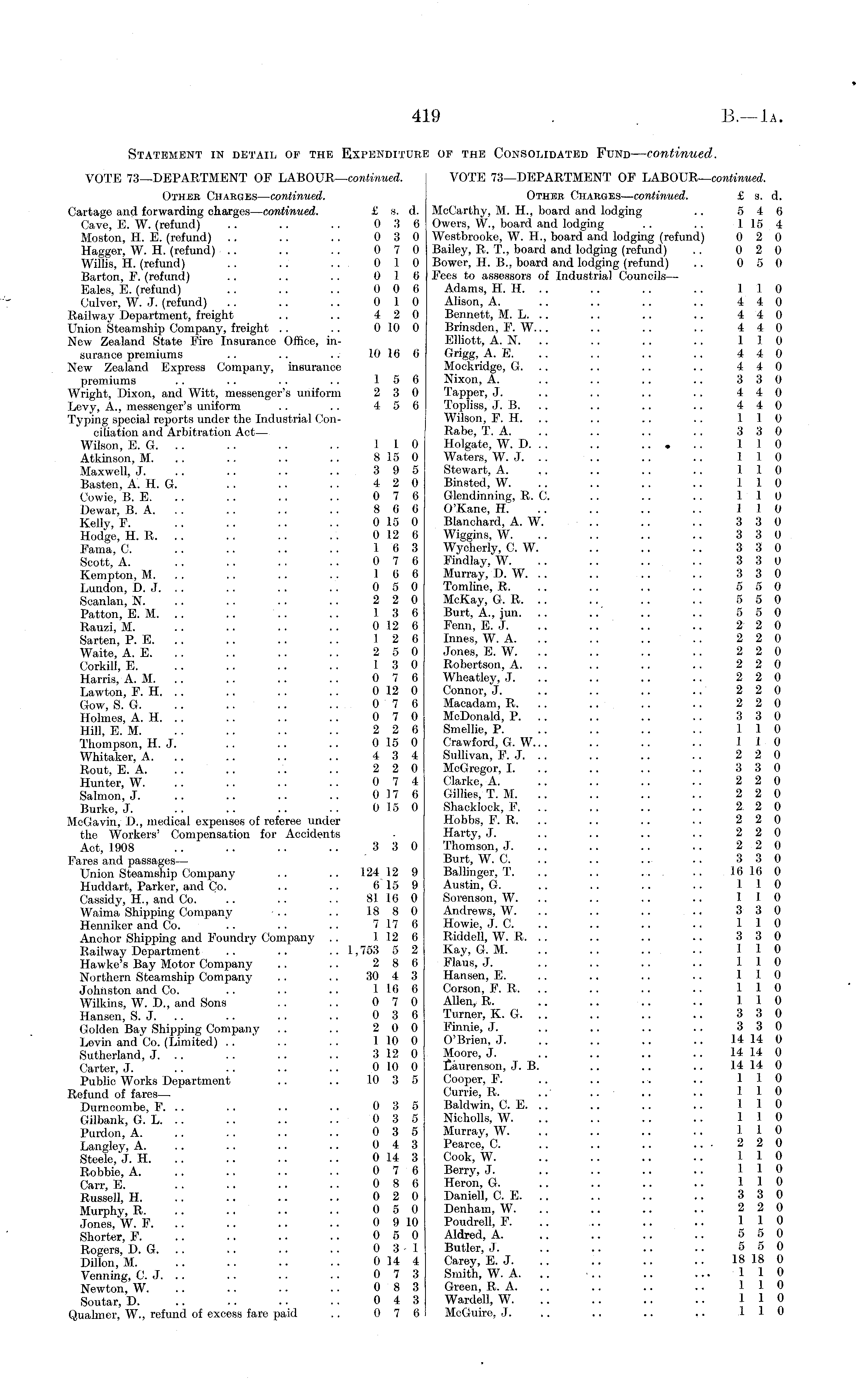 Statement in detail of the Expenditure of the Consolidated Fund — continued. VOTE 73—DEPARTMENT OF LABOUR— continued. VOTE 73—DEPARTMENT OF LABOUR— continued. Other Charges— continued. Other Charges — continued. £ s. d. Cartage and forwarding charges— continued. £ s. d. McCarthy, M. H., board and lodging .. 5 4 6 Cave, E. W. (refund) .. .. . . 0 8 6 Owers, W., board and lodging .. .. 115 4 Moston, H. E. (refund) .. .. . . 0 3 0 Westbrooke, W. H., board and lodging (refund) 0 2 0 Hagger, W. H. (refund) .. .. .. 0 7 0 Bailey, R. T., board and lodging (refund) .. 0 2 0 Willis, H. (refund) .. .. .. 0 1. 0 Bower, H. 8., board and lodging (refund) .. 0 5 0 Barton, F. (refund) .. .. . . 0 16 Fees to assessors of Industrial Councils— Bales, E. (refund) .. .. .. 0 0 6 Adams, H. H. .. .. .. .. 110 Culver, W. J. (refund) .. .. .. 0 10 Alison, A. .. .. .. .. 4 4 0 Railway Department, freight .. .. 4 2 0 Bennett, M. L. .. .. .. .. 4 4 0 Union Steamship Company, freight .. .. 010 0 Brinsden, F. W... .. .. .. 4 4 0 New Zealand State Fire Insurance Office, in- Elliott, A. N. .. .. .. .. 110 suranee premiums .. .. .. 10 10 6 Grigg, A. E. .. .. .. .. 4 4 0 New Zealand Express Company, insurance Mockridge, G. .. .. .. 4 4 0 premiums .. .. .. .. 15 6 Nixon, A. .. .. .. .. 3 3 0 Wright, Dixon, and Witt, messenger's uniform 2 3 0 Tapper, J. .. . . .. .. 4 4 0 Levy, A., messenger's uniform .. .. 4 5 6 Topliss, J. B. .. .. .. .. 4 4 0 Typing special reports under the Industrial Con- Wilson, F. H. .. .. .. .. 110 ciliation and Arbitration Act— Rabe, T. A. .. .. .. .. 3 3 0 Wilson, E. G. .. .. . . .. 110 Holgate, W. D. .. .. ... .. 110 Atkinson, M. .. .. .. .. 815 0 Waters, W. J. .. .. .. .. 110 Maxwell, J. .. .. .. .. 3 9 5 Stewart, A. .. .. .. .. 110 Basten, A. H. G. .. .. .. 4 2 0 Binsted, W. .. .. .. .. 110 Cowie, B. E. .. .. .. 0 7 6 Glendinning, R. C. .. .. .. 110 Dewar, B. A. .. .. .. .. 8 6 6 O'Kane, H. .. .. .. .. 110 Kelly, F. .. .. .. .. 015 0 Blanchard, A. W. .. .. .. 3 3 0 Hodge, H. R. . . .. .. .. 012 6 Wiggins, W. .. .. .. .. 3 3 0 Fama, C. .. .. .. .. 16 3 Wycherly, C. W. 3 3 0 Scott, A. .. .. .. .. 0 7 6 Findlay, W. .. .. .. .. 3 3 0 Kempton, M. .. .. .. .. 16 6 Murray, D. W. .. .. .. .. 3 3 0 Lundon, D.J... .. .. .. 0 5 0 Tomline, R. .. .. .. .. 5 5 0 Scanlan, N. .. .. .. .. 2 2 0 McKay, G. R. .. .. .. .. 5 5 0 Patton, E. M. .. .. .. .. 13 6 Burt, A., jun. .. ..' .. .. 5 5 0 Rauzi M. . . .. .. .. 012 6 Fenn, E. J. .. .. .. .. 2 2 0 Sarten, P. E. . . .. .. .. 12 6 Innes, W. A. .. .. .. .. 2 2 0 Waite, A. E. .. .. .. .. 2 5 0 Jones, E. W. .. .. .. .. 2 2 0 Corkill E. .. .. .. .. 13 0 Robertson, A. .. .. .. .. 2 2 0 Harris, A. M. .. .. .. .. 0 7 6 Wheatley, J. .. .. .. 2 2 0 Lawton, F. H. .. .. . . .. 012 0 Connor, J. .. .. .. .. 2 2 0 Gow, S. G. .. .. .. .. 0 7 6 Macadam, R. .. .. .. 2 2 0 Holmes, A. H. .. .. .. .. 0 7 0 McDonald, P. .. .. .. .. 3 3 0 Hill, E. M. .. .. .. .. 2 2 6 Smellie, P. .. .. .. .. 110 Thompson, H.J. . . .. .. 015 0 Crawford, G. W... .. .. .. 110 Whitaker, A. .. .. .. 4 3 4 Sullivan, F. J. .. .. .. .. 2 2 0 Rout E. A. .. .. .. .. 2 2 0 McGregor, I. .. .. .. .. 3 3 0 Hunter, W. .. .. .. .. 0 7 4 Clarke, A. .. .. .. .. 2 2 0 Salmon, J. .. .. .. .. 017 6 Gillies, T. M. .. .. .. .. 2 2 0 Burke, J. .. .. .. .. 015 0 Shacklock, F. .. .. .. .. 2 2 0 McGavin, D., medical expenses of referee under Hobbs, F. R. .. .. .. .. 2 2 0 the Workers' Compensation for Accidents Harty, J. .. .. .. .. 2 2 0 Act, 1908 .. .. .. .. 3 3 0 Thomson, J. .. .. .. 2 2 0 Fares and passages— Burt, W. C. .. .. .. .. 3 3 0 Union Steamship Company .. .. 124 12 9 Ballinger, T. ~ .. ... .. 16 16 0 Huddart, Parker, and Co. .. .. 6 15 9 Austin, G. .. .. .. .. 110 Cassidy, H., and Co. .. .. .. 8116 0 Sorenson, W. .. .. .. .. 110 Waima Shipping Company • .. .. 18 8 0 Andrews, W. .. .. .. .. 3 3 0 Henniker and Co. .. .. .. 717 6 Howie, J. C. .. .. .. .. 1 1 0 Anchor Shipping and Foundry Company .. 112 6 Riddell, W. R. .. .. .. .. 3 3 0 Railway Department .. '.. .. 1,753 5 2 Kay, G. M. .. .. .. .. 110 Hawke's Bay Motor Company .. .. 2 8 6 Flaus, J. .. .. .. .. 110 Northern Steamship Company .. .. 30 4 3 Hansen, E. .. .. .. .. 110 Johnston and Co. .. . . .. 116 6 Corson, F. R. .. .. .. .. 110 Wilkins, W. D., and Sons .. . . 0 7 0 Allen, R. .. .. .. .. 110 Hansen, S. J. .. .. . . .. 0 3 6 Turner, K. G. .. .. .. .. 3 3 0 Golden Bay Shipping Company .. .. 2 0 0 Finnic, J. .. .. .. .. 3 3 0 Levin and Co. (Limited) .. .. .. 110 0 O'Brien, J. .. .. .. .. 14 14 0 Sutherland, J. .. .. . . .. 312 0 Moore, J. .. .. .. .. 14 14 0 Carter, J. .. .. .. .. 010 0 L"aurenson, J. B. .. .. .. 14 14 0 Public Works Department .. .. 10 3 5 Cooper, F. .. .. .. .. 110 Refund of fares— Currie, R. ..' .. .. .. 110 Durncombe, F. .. .. .. .. 0 3 5 Baldwin, C. E. .. .. .. .. 110 Gilbank, G. L. .. .. .. .. 0 3 5 Nicholls, W. .. .. .. .. 110 Purdon, A. .. .. .. .. 0 3 5 Murray, W. .. .. .. .. 110 Lanaley A .. .. .. .. 043 Pearce, C. .. .. .. .. • 2 2 0 Steele, J. H 014 3 Cook, W 110 Robbie, A. .. .. .. .. 0 7 6 Berry, J. .. .. .. .. 110 Carr E .. .. .. .. 086 Heron, G. .. .. .. .. 110 Russell, H. .. .. .. .. 0 2 0 Daniell, C. E. .. .. .. .. 3 3 0 Murphy R .. .. .. .. 050 Denham, W. .. .. .. 2 2 0 Jones, W. F. .. .. .. • • 0 910 Poudrell, F. .. .. .. .. 110 Shorter, F. .. .. .. • • 05 0 Aldred, A. .. .. .. .. 5 5 0 Rogers, D. G. .. .. .. .. 0 3 1 Butler, J. .. .. .. .. 5 5 0 Dillon M. .. .. .. .. 014 4 Carey, E. J. .. .. .. .. 18 18 0 Yenning, C. J. .. .. .. .. 0 7 3 Smith, W. A. .. •.. .. ... 110 Newton, W. .. .. .. .. 0 8 3 Green, R. A. .. .. .. .. 110 Soutar, D. .. .. .. .. 0 4 3 Wardell, W. .. .. .. .. 110 Qualmer, W., refund of excess fare paid .. 0 7 6 McGuire, J. .. .. .. .. 110