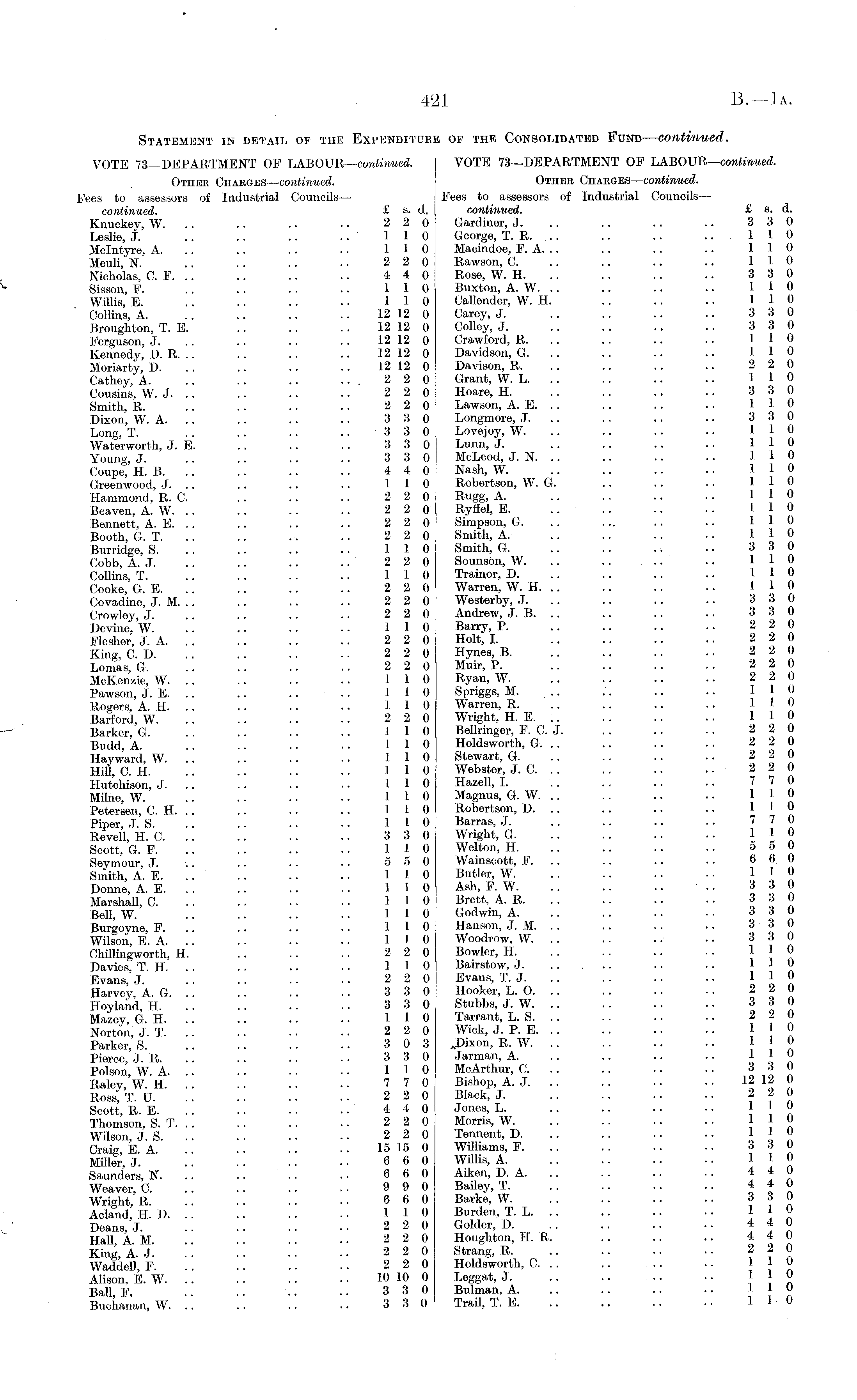 Statement in detail of the Expenditure op the Consolidated Fund — continued. VOTE 73—DEPARTMENT OF LABOUR— continued. VOTE 73—DEPARTMENT OF LABOUR— continued. Other Charges—continued. Other Charges— continued. Fees to assessors of Industrial Councils — Fees to assessors of Industrial Councils — continued. £ s. d. continued. £ s. d. Knuckey, W. .. .. .. . • 2 2 0 Gardiner, J. .. .. .. .. 3 3 0 Leslie, J. .. .. .. .. 110 George, T. R. .. .. .. .. 110 Mclntyre, A. .. . . . . 110 Macindoe, F. A. .. ~ .. .. 110 Meuli, N. .. .. .. .. 2 2 0 Rawson, C. .. .. .. .. 110 Nicholas, C. P. .. .. .. . • 4 4 0 Rose, W. H. .. .. .. .. 3 3 0 Sisson F. .. .. .. 110 Buxton, A. W. .. .. .. .. 110 Willis, E. .. .. .. .. 110 Callender, W. H. .. .. .. 110 Collins, A. .. .. .. .. 12 12 0 Carey, J. .. .. .. .. 3 3 0 Broughton, T. E. .. .. .. 12 12 0 Colley, J. .. .. .. .. 3 3 0 Ferguson, J. .. .. .. .. 12 12 0 Crawford, R. .. .. .. .. 110 Kennedy, I). R. .. .. .. .. 12 12 0 Davidson, G. .. .. .. .. 110 Moriarty, D. .. .. .. .. 12 12 0 Davison, R. .. .. .. .. 22 0 Cathey, A. .. . . .. ... 2 2 0 Grant, W. L. .. .. .. .. 110 Cousins, W. J. .. .. .. .. 2 2 0 Hoare, H. .. .. .. .. 3 3 0 Smith, R. .. . . .. .. 2 2 0 Lawson, A. E. .. .. .. .. 110 Dixon, W. A. .. .. .. .. 3 3 0 Longmore, J. .. .. .. 3 3 0 Long, T. .. .. .. ..330 Lovejoy, W. .. .. .. .. 110 Waterworth, J. E. .. .. .. 3 3 0 Lunn, J. .. .. .. .. 110 Young, J. .. .. .. .. 33 0 McLeod, J. N. .. .. .. • • 110 Coupe, H. B. .. .. .. .. 4 4 0 Nash, W. .. .. .. .. 110 Greenwood, J. .. .. .. .. 110 Robertson, W. G. .. .. .. 0 Hammond, R. C. .. .. .. 2 2 0 Rugg, A. .. .. .. .. 110 Beaven, A. W. .. .. .. ■ • 2 2 0 Ryffel, E. .. .. .. .. 0 Bennett, A. E. .. .. .. .. 2 2 0 Simpson, G. .. .. 0 Booth, G. T. .. .. .. .. 2 2 0 Smith, A. .. .. .. •. 110 Burridge, S. .. .. .. .. 110 Smith, G. .. .. ~ .. 3 3 0 Cobb, A. J. .. .. .. .. 2 2 0 Sounson, W. .. .. .. .. 110 Collins, T. .. .. .. .. 110 Trainor, D. .. .. .. .. 0 Cooke, G. E. .. .. .. .. 2 2 0 Warren, W. H. .. .. .. .. 110 Covadine, J. M. .. .. .. .. 2 2 0 Westerby, J. .. .. .. 3 3 0 Crowley, J. .. .. .. .. 2 2 0 Andrew, J. B. .. .. .. .. 3 3 0 Dcvine, W 110 Barry, P 2 2 0 Flesher, J. A. .. 2 2 0 Holt, I. 2 2 0 King, CD. .. .. .. .. 2 2 0 Hynes, B. .. .. .. .. 2 2 0 Lomas, G 2 2 0 Muir, P 2 2 0 McKenzie, W. .. .. .. .. 110 Ryan, W. .. .. .. .. 2 2 0 Pawson, J. E. .. .. .. . . 110 Spriggs, M. .. .. .. .. 10 Rogers, A. H. .. .. .. .. 110 Warren, R. .. .. .. .. 0 Barf ord W. . .. .. •. 2 2 0 Wright, H. E. .. .. .. .. 110 Barker, G 110 Bellringer, F. C. J 2 2 0 Budd, A. .. .. .. .. 110 Holdsworth, G. .. .. .. .. 2 2 0 Havward, W. .. .. •. 110 Stewart, G. .. .. .. .. 2 2 0 Hill, C. H 110 Webster, J. C 2 2 0 Hutchison, J. .. .. .. .. 110 Hazell, I. .. .. .. .. 7 7 0 Milne, W. .. .. •. ■ • 110 Magnus, G. W. .. .. .. . . 10 Petersen, C. H. .. .. .. .. 110 Robertson, D. .. .. .. .. 110 Piper, J. S 110 Barras, J 7 7 0 Revell, H. C 3 3 0 Wright, G 11° Scott, G. F. .. .. .. •. 110 Welton, H. .. .. .. .. 5 5 0 Seymour, J. .. .. .. .. 5 5 0 Wainscott, F. .. .. .. .. 6 6 0 Smith, A. E 110 Butler, W • J J Donne, A. E 110 Ash, F. W • .. 3 3 0 Marshall, C 110 Brett, A. R 3 3 0 Bell, W. .. .. .. • ■ 110 Godwin, A. .. .. .. . . 3 3 0 Burgoyne F. .. .. .. 110 Hanson, J. M. .. .. .. .. 3 3 0 Wilson, E. A 110 Woodrow, W .. 3 3 0 Chillingworth, H. .. .. .. 2 2 0 Bowler, H. Davies, T. H. .. .. .. .. 110 Bairstow, J Evans J .. .. .. 2 2 0 Evans, T. J. .. .. .. .. 110 Harvey, A. G 3 3 0 Hooker, L. 0 2 2 0 Hoyland, H 3 3 0 Stubbs, J. W 3 3 0 Mazey, G. H 110 Tarrant, L. S 2 2 0 Norton, J. T 2 2 0 Wick, J. P. E 1 1 0 Parker, S 3 0 3 JMxon, R. W 110 Pierce, J. R. .. .. .. .. 3 3 0 Jarman, A. .. .. .. .. Poison, W. A. .. .. .. .. 110 McArthur, C. .. .. .. •• 3 3 0 Raley, W. H 7 7 0 Bishop, A. J 12 12 0 RossfT. U 2 2 0 Black, J 2 2 0 Scott, R. E. .. .. .. .. 4 4 0 Jones, L. Thomson, S. T 2 2 0 Morris, W Wilson, J. S 2 2 0 Tennent, D 1 \ 0 Craig E A .. . . .. 15 15 0 Williams, F. . . .. .. b 3 0 Miller, J 6 6 0 Willis, A 110 Saunders, N 6 6 0 Aiken, D. A 4 4 0 Weaver, C 9 9 0 Bailey, T 4 4 0 Wright, R 6 6 0 Barke, W 3 3 0 Acland, H. D 110 Burden, T. L 110 Deans, J 22 0 Golder, D * » Hall, A. M 2 2 0 Houghton, H. R 4 4 0 King, A. J 2 2 0 Strang, R 2 2 0 Waddell F .. .. ■ ■ 2 2 0 Holdsworth, C. .. .. .. .. 110 Alison, KW. .. 10 10 0 Leggat, J 0 Ball, F. 3 3 0 Bulman, A Buchanan, W 3 3 0 ' Trail, T. E 110