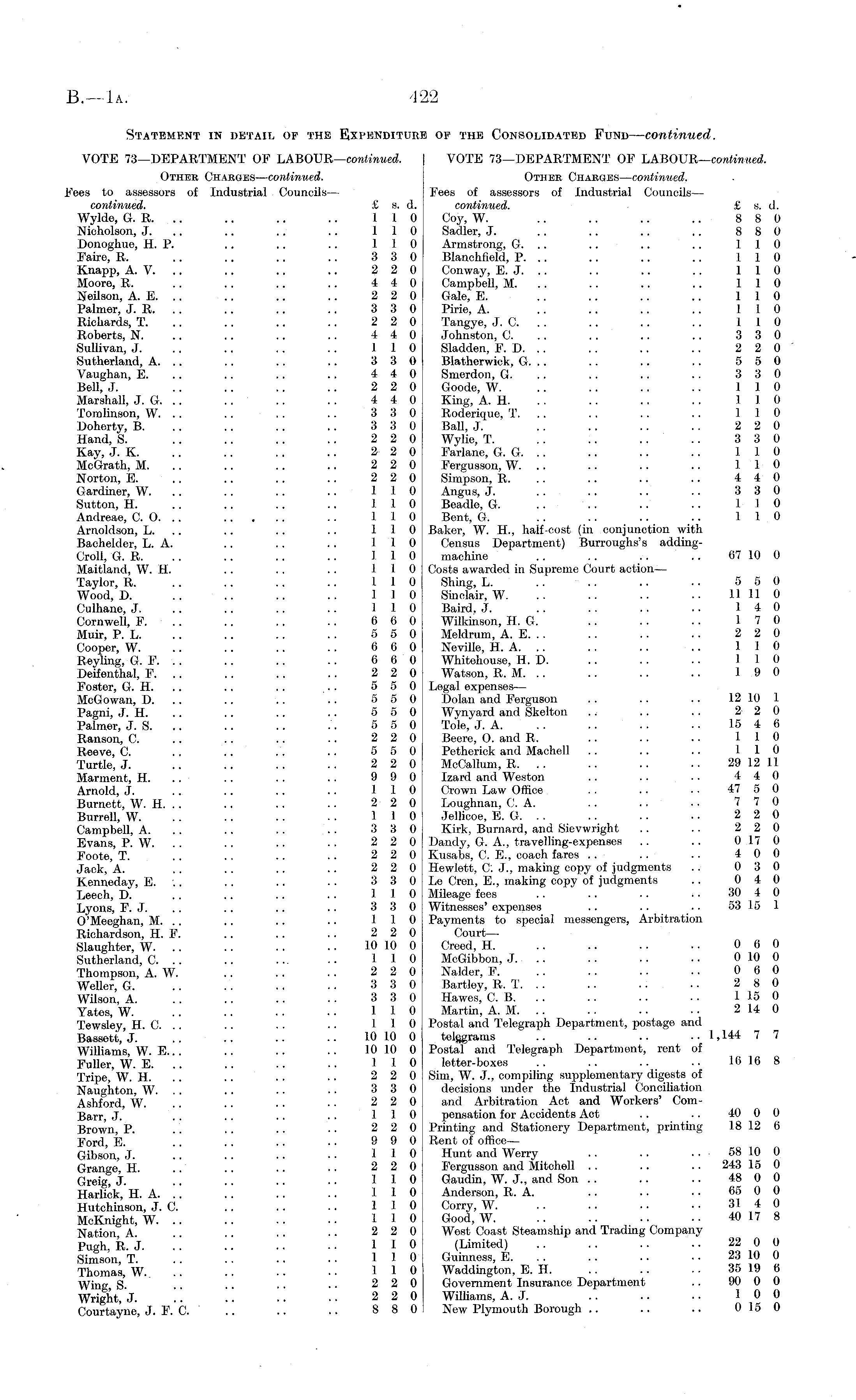 Statement in detail of the Expenditure of the Consolidated Fund — continued. VOTE 73—DEPARTMENT OF LABOUR— continued. | VOTE 73—DEPARTMENT OF LABOUR— continued. Othee Charges— continued. Other Charges— continued. Fees to assessors of Industrial Councils— Fees of assessors of Industrial Councils— continued. £ s. d. continued. £ s. d. Wylde, G. R. .. .. .. .. 110 Coy, W. .. .. .. .. 8 8 0 Nicholson, J. .. .. .. 110 Sadler, J. .. .. .. .. 8 8 0 Donoghue, H. P. .. .. .. 110 Armstrong, G. .. .. .. .. 110 Faire, R. .. .. .. .. 3 3 0 Blanchfield, P. . . .. .. .. 110 Knapp, A. V. .. .. .. .. 2 2 0 Conway, E. J. .. . . .. .. 110 Moore, R. .. .. .. .. 4 4 0 Campbell, M. .. .. .. .. 110 Neilson, A. E. .. .. .. .. 2 2 0 Gale, E. .. .. .. .. 110 Palmer, J. R. .. .. .. .. 3 3 0 Pirie, A. .. .. .. .. 110 Richards, T. .. .. .. .. 2 2 0 Tangye, J. C. .. .. .. .. 110 Roberts, N. .. .. .. .. 4 4 0 Johnston, C. .. .. .. .. 3 3 0 Sullivan, J. .. .. .. .. 110 Sladden, ¥. D. .. .. .. .. 2 2 0 Sutherland, A. .. .. .. .. 3 3 0 Blatherwick, G. .. .. .. .. 5 5 0 Vaughan, E. .. .. .. .. 4 4 0 Smerdon, G. .. .. .. 3 3 0 Bell, J. .. .. .. .. 2 2 0 Goode, W. .. .. .. .. 110 Marshall, J. G. .. .. .. . . 4 4 0 King, A. H. .. .. .. .. 1 1 0 Tomlinson, W. .. .. . . •. 3 3 0 Roderique, T. .. .. . . .. 1. 1 0 Doherty, B. .. .. .. .. 3 3 0 Ball, J. .. . . .. .. 2 2 0 Hand, S. .. .. .. .. 2 2 0 Wylie, T. .. .. .. .. 3 3 0 Kay, J. K. .. .. .. .. 2 2 0 Farlane, G. G. .. .. .. . . 110 McGrath, M. .. .. .. .. 2 2 0 Fergusson, W. . . .. .. .. 110 Norton, E. .. .. .. .. 2 2 0 Simpson, R. .. .. .. .. 4 4 0 Gardiner, W. .. .. .. .. 110 Angus, J. .. .. 3 3 0 Sutton, H. .. .. .. .. 110 Beadle, G. .. .. .. .. 110 Andreae, C 0... .. 110 Bent, G. .. .. .. .. 110 Arnoldson, L. .. .. .. .. 110 Baker, W. H., half-cost (in conjunction with Bachelder, L. A. .. .. .. 110 Census Department) Burroughs's addingCroll, G. R. .. .. .. .. 110 machine .. .. .. .. 67 10 0 Maitland, W. H. .. .. .. 110 Costs awarded in Supreme Court action— Taylor, R. .. .. .. .. 110 Shing, L. .. .. .. .. 5 r> 0 Wood, D. .. .. .. . . 110 Sinclair, W. .. .. . . • • 11110 Culhane, J. .. .. .. .. 110 Baird. J. .. .. .. .. 14 0 Cornwell, F. .. .. .. .. 6 6 0 | Wilkinson, H. G. .. . . .. 17 0 Muir, P. L. .. .. .. . . 5 5 0 Meldrum, A. E. . . .. .. .. 2 2 0 Cooper, W. .. .. .. .. 6 6 0 Neville, H. A. .. .. .. .. 110 Reyling, G. F. .. .. .. .. 6 6 0 Whitehouse, H. D. .. . . .. 110 Deifenthal, F. .. .. . . .. 2 2 0 Watson, R. M. .. .. .. .. 19 0 Foster, Or. H. .. . . . . 5 5 0 Legal expenses— McGowan, I). .. .. .. 5 5 0 Dolan and Ferguson . . .. . . 12 10 1. Pagni, J. H. .. .. .. .. 5 5 0 Wynyard and Skelton .. .. .. 2 2 0 Palmer, J. S. .. .. .. .'. 5 5 0 Tole, J. A. .. .. .. .. 15 4 6 Ranson, C. .. .. .. .. 2 2 0 Beere, O. and R. .. .. .. 110 Reeve, C. .. .. .. .. 5 5 0 Petherick and Machell .. .. .. 110 Turtle, J. .. .. .. .. 2 2 0 McCallum, R. .. .. .. .. 29 12 11 Marment, H. .. .. .. .. 9 9 0 Izard and Weston .. .. . . 4 4 0 Arnold, J. .. .. .. .. 110 Crown Law Office . . .. . . 47 5 0 Burnett, W. H. .. .. .. .. 2 2 0 Loughnan, C. A. .. .. • • 7 7 0 Burrell, W. .. .. .. .. 110 Jellicoe, E. G. .. . . .. • • 2 2 0 Campbell, A. .. .. .. 3 3 0 Kirk, Burnard, and Sievwright .. .. 2 2 0 Evans, P. W. .. .. .. .. 2 2 0 Dandy, G. A., travelling-expenses .. . . 0 17 0 Foote, T. .. .. .. .. 2 2 0 Kusabs, C. E., coach fares .. .. .. 4 0 0 Jack, A. .. .. .. .. 2 2 0 Hewlett, C. J., making copy of judgments .. 0 3 0 Kenneday, E. .. . . .. .. 3 3 0 Le Cren, E., making copy of judgments .. 0 4 0 Leech, D. .. .. .. . . 110 Mileage fees .. . . .. .. 30 4 0 Lyons, F. J. .. . . .. .. 3 3 0 Witnesses' expenses .. . . .. 53 15 1 O'Meeghan, M. .. .. .. .. 110 Payments to special messengers, Arbitration Richardson, H. F. .. .. .. 2 2 0 CourtSlaughter, W. .. .. .. • • 10 10 0 Creed, H. .. .. .. .. 0 6 0 Sutherland, C. .. .. ... .. 110 McGibbon, J. .. .. .. .. 010 0 Thompson, A. W. .. .. . . 2 2 0 Nalder, F. .. .. .. .. 0 6 0 Weller, G. .. .. .. • • 3 3 0 Bartley, R. T. .. .. .. .. 2 8 0 Wilson A .. ..330 Hawes, C. B. .. .. .. . . 115 0 Yates, W 110 Martin, A. M 214 0 Tewsley H C .. .. 110 Postal and Telegraph Department, postage and Bassett,'j. .. .. .. .. 10 10 0 telegrams .. .. .. .. 1,144 7 7 Williams, W. E... .. .. .. 10 10 0 Postal and Telegraph Department, rent of Fuller, W. E. .. .. .. .. 110 letter-boxes .. .. .. .. 16 16 8 Tripe, W. H. .. . . .. .. 2 2 0 Sim, W. J., compiling supplementary digests of Nauo-hton, W. . . . . •. ■ ■ 3 3 0 decisions under the Industrial Conciliation Ashford, W. .. .. • • • • 2 2 0 and Arbitration Act and Workers' ComBarr, J. . . .. •. • • 110 pensation for Accidents Act . . . . 40 0 0 Brown, P. .. . . . . • ■ 2 2 0 Printing and Stationery Department, printing 18 12 6 Ford E . . • ■ • • 9 9 0 Rent of office— Gibson, J. '.'. . . ■■ ■■ 110 Hunt and Werry .. . . ... 58 10 0 Grange H .. ..220 Fergusson and Mitchell . . .. .. 243 15 0 GreigT J. .. .. •. 110 Gaudin, W. J., and Son .. .. .. 48 0 0 Harlick, H. A. .. .. . . .. 110 Anderson, R. A. .. .. .. 65 0 0 Hutchinson, J. C 110 Corry, W 31 4 0 McKnight, W 110 Good, W 40 17 8 Nation A .. ..220 West Coast Steamship and Tradmg Company Pugh, R. J. .. 110 (Limited) 22 0 0 Simson T .. ..110 Guinness, E. .. .. .. .. 23 10 0 Thomas, W 110 Waddington, E. H 35 19 6 Wing s ..220 Government Insurance Department .. 90 0 0 Wright, J. '.'. .. .. .. 2 2 0 Williams, A. J. .. .. .. 10 0 Courtayne, J. F. C. .. .. .. 88 0 New Plymouth Borough .. .. .. 015 0