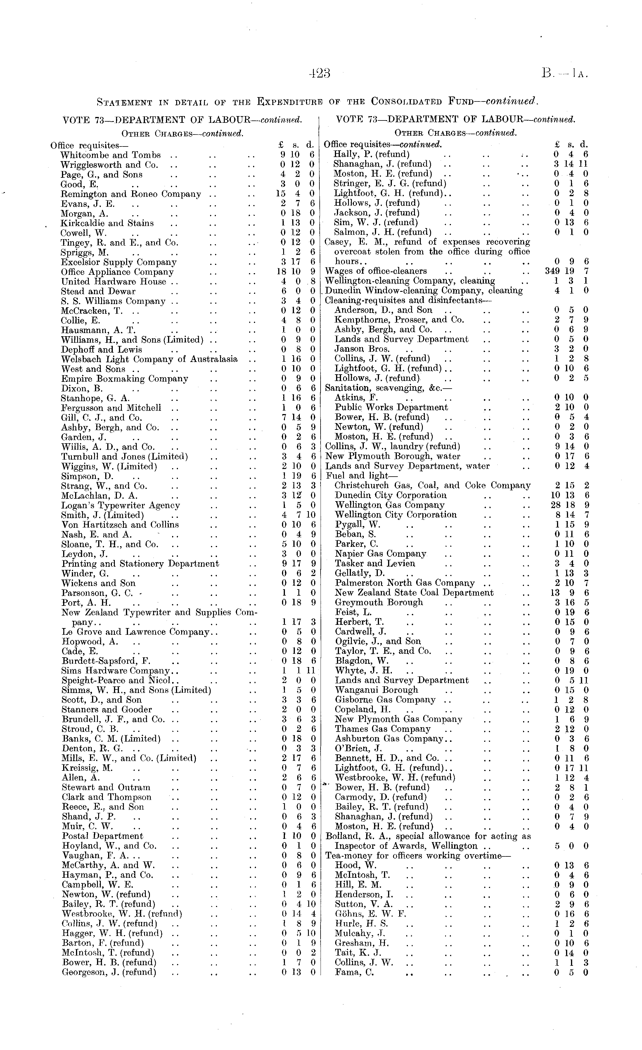 Statement in detail, of the Expenditure of the Consolidated Fund — continued. VOTE 73— DEPARTMENT OF LABOUR— continued. VOTE 7!!— DEPARTMENT OF LABOUR— conMnved. Other Charges— continued. Other Charges— continued. Office requisites— £ s. d. Office requisites— continued. £ s. d. Whitcombe and Tombs . . .. .. 910 6 Hally, P. (refund) .. .. .. 0 4 6 Wrigglesworth and Co. .. .. .. 012 0 Shanaghan, J. (refund) .. .. .. 814 11 Page, G., and Sons .. .. . . 4 2 0 Moston, H. E. (refund) .. .. •.. 0 4 0 Good, E. . . .. .. .. 3 0 0 Stringer, E. J. G. (refund) .. .. 0 16 Remington and Roneo Company .. .. 15 4 0 Lightfoot, G. H. (refund).. .. .. 0 2 8 Evans, J. E. .. .. .. .. 2 7 6 Hollows, J. (refund) .. .. .. 0 10 Morgan, A. .. .. .. .. 0180 Jackson, J. (refund) .. .. .. 0 4 0 Kirkcaldie and Stains .. .. .. I 13 0 Sim, W. ,T. (refund) .. .. .. 013 6 Cowell, W. .. .. . . .. 012 0 Salmon, J. H. (refund) .. .. .. 0 10 Tingey, R. and E., and Co. .. .. 0 12 0 Casey, E. M., refund of expenses recovering Spriggs, M. .. .. .. . . 12 6 overcoat stolen from the office during office Excelsior Supply Company .. .. 317 6 hours.. .. .. .. .. 0 9 6 Office Appliance Company . . .. 18 10 9 Wages of office-cleaners .. . . .. 349 19 7 United Hardware House .. .. .. 4 0 8 Wellington-cleaning Company, cleaning .. 13 1 Stead and Dewar .. .. .. 6 0 0. Dunedin Window-cleaning Company, cleaning 410 S. S. Williams Company .. .. . . 3 4 0 Cleaning-requisites and disinfectants— McCracken, T. .. ' .. .. .. 012 0 Anderson, D., and Son .. .. .. 0 5 0 Collie, l<;. .. .. .. .. 4 8 0 Kempthorne, Prosser, and Co. .. .. 2 7 9 Hausmann, A. T. .. . . .. 10 0 Ashby, Bergh, and Co. .. .. .. 0 6 9 Williams, H., and Sons (Limited) .. .. 0 9 0 Lands and Survey Department .. .. 0 5 0 Dephoff and Lewis .. .. .. 0 8 0 Janson Bros. . . .. .. .. 3 2 0 Welsbach Light Company of Australasia ..1 16 0 Collins, J. W. (refund) .. . . .. 12 8 West and Sons .. .. .. .. 0 10 0 Lightfoot, G. H. (refund) .. .. .. 0 10 6 Empire Boxmaking Company .. .. 0 9 0 Hollows, J. (refund) .. .. .. 0 2 5 Dixon, B. .. .. .. .. 0 6 6 Sanitation, scavenging, &c.— Stanhope, G. A. .. .. .. 116 6 Atkins, F. .. .. .. .. 010 0 Fergusson and Mitchell . . .. .. 10 6 Public Works Department .. .. 210 0 Gill, C. J., and Co. .. .. .. 714 0 Bower, H. B. (refund) . . .. .. 0 5 4 Ashby, Bergh, and Co. . . .. .. 0 5 9 Newton, W. (refund) .. .. .. 0 2 0 Garden, J. .. .. .. .. 0 2 6 Moston, H. E. (refund) .. .. .. 0 3 6 Willis, A. D., and Co. . . . . 0 6 3 Collins, J. W., laundry (refund) .. .. 914 0 Turnbull and Jones (Limited) .. .. 3 4 6 New Plymouth Borough, water .. .. 0 17 6 Wiggins, W. (Limited) .. .. .. 210 0 Lands and Survey Department, water .. 012 4 Simpson, D. .. .. .. .. 119 6 Fuel and light—" Strang, W., and Co. . . .. .. 213 3 Christchurch Gas, Coal, and Coke Company 215 2 McLachlan, D. A. .. .. .. 3 12 0 Dunedin City Corporation .. .. 10 13 6 Logan's Typewriter Agency . . .. 15 0 Wellington Gas Company .. .. 28 18 9 Smith, J. (Limited) . . .. . . 4 710 Wellington City Corporation . . .. 814 7 Yon Hartitzsch and Collins .. .. 0 10 6 Pygall, W. .. .. .. .. 1 15 9 Nash, E. and A. - .. .. . . 0 4 9 Beban, S. .. .. .. .. 0 116 Sloane, T. H., and Co. . . .. .. 510 0 Parker, C. .. .. .. .. 110 0 Leydon, J. .. .. .. .. 3 0 0 Napier Gas Company .. .. .. 0 110 Printing and Stationery Department .. 917 9 Tasker and Levien .. .. .. 3 4 0 Winder, G. .. .. .. .. 0 6 2 Gellatly, D. . . .. .. .. 113 3 Wiekens and Son .. .. .. 012 0 Palmerston North Gas Company .. .. 210 7 Parsonson, G. C. • .. .. .. 110 New Zealand State Coal Department .. 13 9 6 Port, A. H. .. .. .. .. 018 9 Greymouth Borough . . .. .. 316 5 New Zealand Typewriter and Supplies Com- Feist, L. .. .. .. .. 019 6 pany.. .. .. .. .. 1 17 3 Herbert, T. .. .. .. .. 0 15 0 Le Grove and Lawrence Company.. .. 0 5 0 Cardwell, J. .. .. .. .. 0 9 6 Hopwood, A. .. .. .. 0 8 0 Ogilvie, J., and Son .. .. .. 0 7 0 Cade, E. .. .. .. .. 012 0 Taylor, T. E., and Co. .. .. .. 0 9 6 Burdett-Sapsford, F. .. .. . . 018 6 Blagdon, W. .. .. .. .. 0 8 6 Sims Hardware Company.. .. .. 1 111 Whyte, J. H. .. .. .. .. 0190 Speight-Pearco and Nicol.. .. .. 2 0 0 Lands and Survey Department ... .. 0 511 Simms, W. H., and Sons (Limited) . . ISO Wanganui Borough .. .. .. 015 0 Scott, D., and Son . . . . .. 3 3 6 Gisborne Gas Company .. .. .. 12 8 Stanners and Gooder .. .. .. 2 0 0 Copeland, H. .. .. .. .. 012 0 Brundell, J. F., and Co. . . . . .. 3 6 3 New Plymonth Gas Company .. .. 16 9 Stroud, C. B. .. .. .. .. 0 2 6 Thames Gas Company .. .. .. 212 0 Banks, C. M. (Limited) .. .. .. 0 18 0 Ashburton Gas Company.. .. .. 0 3 6 Denton, R. G. .. .. .. -.. 0 3 3 O'Brien, J. .. .. .. .. 18 0 Mills, E. W., and Co. (Limited) .. .. 217 6 Bennett, H. D., and Co. .. .. .. 011 6 Kreissig, M. .. .. .. .. 0 7 6 Lightfoot, G. H. (refund).. .. .. 0 17 11 Allen, A. .. .. . . .. 2 6 6 Westbrooke, W. H. (refund) .. .. 112 4 Stewart and Outram .. .. . . 0 7 o** Bower, H. B. (refund) .. .. .. 2 8 1 Clark and Thompson .. .. .. 012 0 Carmody, D. (refund) .. .. .. 0 2 6 Recce, E., and Son .. . . .. 10 0 Bailey, R. T. (refund) .. .. .. 0 4 0 Shand, J. P. .. .. .. .. 0 6 3 Shanaghan, J. (refund) .. .. .. 0 7 9 Muir, C. W. .. .. .. .. 0 4 6 Moston, H. E. (refund) .. .. .. 0 4 0 Postal Department .. .. .. I 10 0 Bolland, R. A., special allowance for acting as Hoyland, W., and Co. .. .. 0 10 Inspector of Awards, Wellington .. . . 5 0 0 Vaughan, F. A. .. .. . . . . 0 8 0 Tea-money for officers working overtime— McCarthy, A. and W. .. .. .. 0 6 0 Hood, W. .. .. .. .. 013 6 Hayman', P., and Co. .. .. .. 0 9 6 Mclntosh, T. .. .. .. .. 0 4 6 Campbell, W. E. .. .. . . 0 16 Hill, E. M. .. . . .. . . 0 9 0 Newton, W. (refund) .. . . .. 12 0 Henderson, I. .. .. .. .. 0 6 0 Bailey, R. T. (refund) .. . . . . 0 410 Sutton, V. A. .. .. .. .. 2 9 6 Westbrooke, W. H. (refund) .. .. 0 14 4 Oohns, E. W. F. .. .. .. 0 16 6 Collins, J. W. (refund) .. .. .. 18 9 Hurle, H