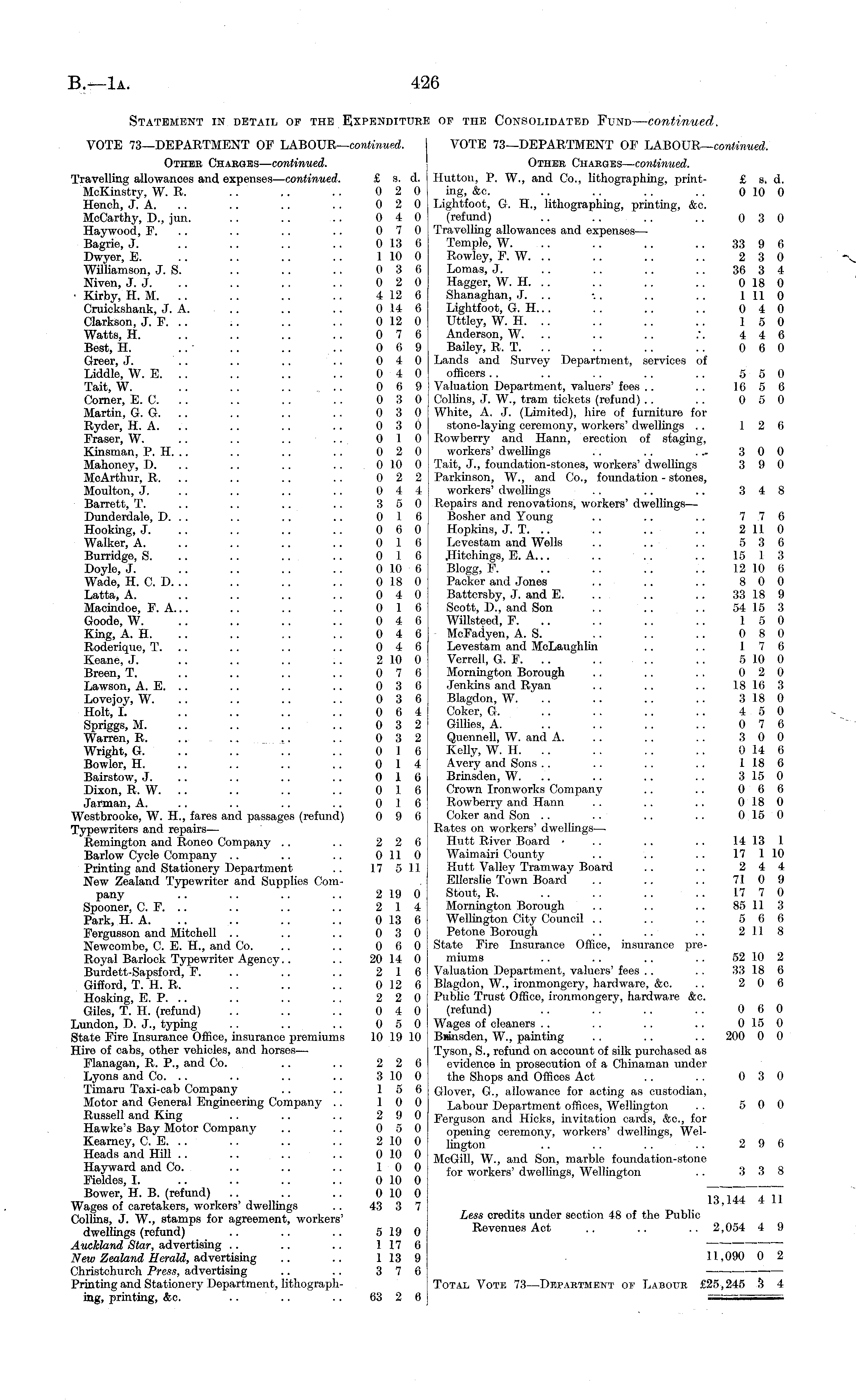 Statement in detail of the Expenditure of the Consolidated Fund— continued. VOTE 73—DEPARTMENT OP LABOUR— continued. VOTE 73—DEPARTMENT OF LABOUR— continued. Other Chabges— continued. Other Charges— continued. Travelling allowances and expenses— continued. £ s. d. Hutton, P. W., and Co., lithographing, print- £ s, d. McKinstry, W. R. .. .. .. 0 2 0 ing, &c. .. .. .. .. 010 0 Hench, J. A. .. .. .. 0 2 0 Lightfoot, G. H., lithographing, printing, &c. McCarthy, D., jun. .. . . .. 0 4 0 (refund) .. .. .. .. 0 3 0 Haywood, F. .. .. .. .. 0 7 0 Travelling allowances and expenses— Bagrie, J. .. .. .. .. 013 6 Temple, W. .. .. .. .. 33 9 6 Dwyer, E. .. .. .. .. 110 0 Rowley, F. W. .. .. .. .. 2 3 0 Williamson, J. S. .. .. .. 0 3 6 Lomas, J. .. .. .. .. 36 3 4 Niven, J. J. .. .. .. .. 0 2 0 Hagger, W. H. .. .. .. .. 018 0 ■ Kirby, H. M. .. .. .. .. 412 6 Shanaghan, J. .. •.. .. .. 111 0 Cruickshank, J. A. .. .. .. 0 14 6 Lightfoot, G. H... .. .. .. 0 4 0 Clarkson, J. F. .. .. .. .. 0 12 0 Uttley, W. H. .. .. .. .. 15 0 Watts, H. .. .. .. . . 0 7 6 Anderson, W. .. .. .. .'. 4 4 6 Best, H. .. - .. .. .. 0 6 9 Bailey, R. T. . . .. .. .. 0 6 0 Greer, J. .. .. .. .. 0 4 0 Lands and Survey Department, services of Liddle, W. E. .. .. .. .. 0 4 0 officers.. .. .. .. .. ,5 5 0 Tait, W. .. .. .. ... 069 Valuation Department, valuers' fees .. .. 16 5 6 Corner, E. C. .. .. .. 0 3 0 Collins, J. W., tram tickets (refund) .. .. 0 5 0 Martin, G. G. .. .. .. .. 0 3 0 White, A. J. (Limited), hire of furniture for Ryder, H. A. .. .. .. .. 0 3 0 stone-laying ceremony, workers' dwellings .. 12 6 Fraser, W. .. . . .. .. 0 10 Rowberry and Harm, erection of staging, Kinsman, P. H. .. .. .. . . 0 2 0 workers' dwellings .. .. . . 3 0 0 Mahoney, D. .. .. .. .. 010 0 Tait, J., foundation-stones, workers' dwellings 3 9 0 McArthur, R. .. .. .. .. 0 2 2 Parkinson, W., and Co., foundation - stones, Moulton, J. .. .. .. .. 0 4 4 workers' dwellings .. .. .. 3 4 8 Barrett, T. .. .. .. .. 3 5 0 Repairs and renovations, workers' dwellings— Dunderdale, D. .. .. .. .. 0 16 Bosher and Young .. .. .. 7 7 6 Hooking, J. .. .. .. .. 0 6 0 Hopkins, J. T. .. .. .. .. 2 11 0 Walker, A. .. .. .. .. 0 16 Levestam and Wells .. .. .. 5 3 6 Burridge, S. .. .. .. .. 0 16 Hitchings, E. A... .. .. .. 15 1 3 Doyle, J. .. .. .. .. 0 10 6 Blogg, F. .. .. .. .. 12 10 6 Wade, H. C. D. .. .. .. .. 018 0 Packer and Jones .. .. .. 8 0 0 Latta, A. .. .. .. .. 0 4 0 Battorsby, J. and E. .. .. .. 33 18 9 Macindoe, F. A... .. .. .. 0 16 Scott, D., and Son .. .. .. 54 15 3 Goode, W. .. .. .. .. 0 4 6 Willsteed, F. .. .. .. 15 0 King, A. H. .. .. .. .. 0 4 6 McFadyen, A. S. .. .. .. 0 8 0 Roderique, T. .. .. .. 0 4 6 Levestam and McLaughlin .. .. 17 6 Keane, J. .. .. .. .. 210 0 Verrell, G. F. .. .. .. .. 510 0 Breen, T. .. .. .. .. 0 7 6 Mornington Borough .. .. . . 0 2 0 Lawson, A. E. .. .. .. .. 0 3 6 Jenkins and Ryan .. .. .. 18 16 3 Lovejoy, W. .. .. .. .. 0 3 6 Blagdon, W. .. .. .. .. 318 0 Holt, I. .. .. .. .. 0 6 4 Coker, G. .. .. .. .. 4 5 0 Spriggs, M. .. .. .. .. 0 3 2 Gillies, A. .. .. .. .. 0 7 6 Warren, R. .. .. .. .. 0 3 2 Quennell, W. and A. .. .. .. 3 0 0 Wright, G. .. .. .. .. 0 16 Kelly, W. H. .. .. .. .. 014 6 Bowler, H. .. .. .. .. 0 14 Avery and Sons .. .. .. .. 118 6 Bairstow, J. .. .. .. .. 0 16 Brinsden, W. .. .. .. .. 315 0 Dixon, R. W. .. .. .. .. 0 16 Crown Ironworks Company .. .. 0 6 6 Jannan, A. .. .. .. .. 0 16 Rowberry and Harm .. .. .. 018 0 Westbrooke, W. H., fares and passages (refund) 0 9 6 Coker and Son .. .. .. .. 015 0 Typewriters and repairs— Rates on workers' dwellings— Remington and Roneo Company .. .. 2 2 6 Hutt River Board ■ .. .. .. 14 13 1 Barlow Cycle Company .. .. .. 0 110 Waimairi County .. . . .. 17 110 Printing and Stationery Department .. 17 511 Hutt Valley Tramway Board .. .. 2 4 4 New Zealand Typewriter and Supplies Com- . Ellerslie Town Board .. .. .. 710 9 pany .. .. .. .. 219 0 Stout, R. .. .. .. .. 17 7 0 Spooner, C. F. .. .. .. .. 2 14 Mornington Borough .. .. .. 85113 Park, H. A. .. .. .. .. 013 6 Wellington City Council .. .. .. 5 6 6 Fergusson and Mitchell .. .. .. 0 3 0 Petone Borough .. .. .. 211 8 Newcombe, C. E. H., and Co. .. .. 0 6 0 State Fire Insurance Office, insurance preRoyal Barlock Typewriter Agency.. .. 20 14 0 miums .. .. .. .. 52 10 2 Burdett-Sapsford, F. .. .. .. 2 16 Valuation Department, valuers' fees .. . . 33 18 6 Giflord, T. H. R. .. .. .. 012 6 Blagdon, W., ironmongery, hardware, &c. .. 2 0 6 Hosking, E. P. .. .. .. .. 2 2 0 Public Trust Office, ironmongery, hardware &c. Giles, T. H. (refund) .. .. .. 0 4 0 (refund) .. .. .. .. 0 6 0 Lundon, D. J., typing .. .. .. 0 5 0 Wages of cleaners . . .. .. .. 015 0 State Fire Insurance Office, insurance premiums 10 19 10 Bmnsden, W., painting .. .. . . 200 0 0 Hire of cabs, other vehicles, and horses— Tyson, S., refund on account of silk purchased as Flanagan, R. P., and Co. .. .. 2 2 6 evidence in prosecution of a Chinaman under Lyons and Co. .. .. .. .. 310 0 the Shops and Offices Act .. .. 0 3 0 Timaru Taxi-cab Company .. .. 15 6 Glover, G., allowance for acting as custodian, Motor and General Engineering Company .. 10 0 Labour Department offices, Wellington .. 50 0 Russell and King .. .. .. 2 9 0 Ferguson and Hicks, invitation cards, &c, for Hawke's Bay Motor Company .. .. 0 5 0 opening ceremony, workers' dwellings, WelKeamey, C. E 210 0 lington c *' .. .... 29 6 Heads and Hill 0 10 0 McGill; W ., and Son, marble foundation-stone Hayward and Co. 10 0 for workers'dwellings, Wellington .. 3 3 8 Bower,'H. B. (refund) .. .. .. 010 0 'vT\la~ 7~n Wages of caretakers, workers' dwellings 43 3 7 , ' Collins, J. W., stamps for agreement, workers' Less credlts under sectlon 48 oi the Publlc dwellings (refund) 5 19 0 Revenues Act 2,054 4 9 Auckland Star, advertising .. .. .. 1 17 6 New Zealand Herald, advertising .. 113 9 11,090 0 2 Christchurch Press, advertising .. .. 3 7 6 Printing and Stationery Department, li