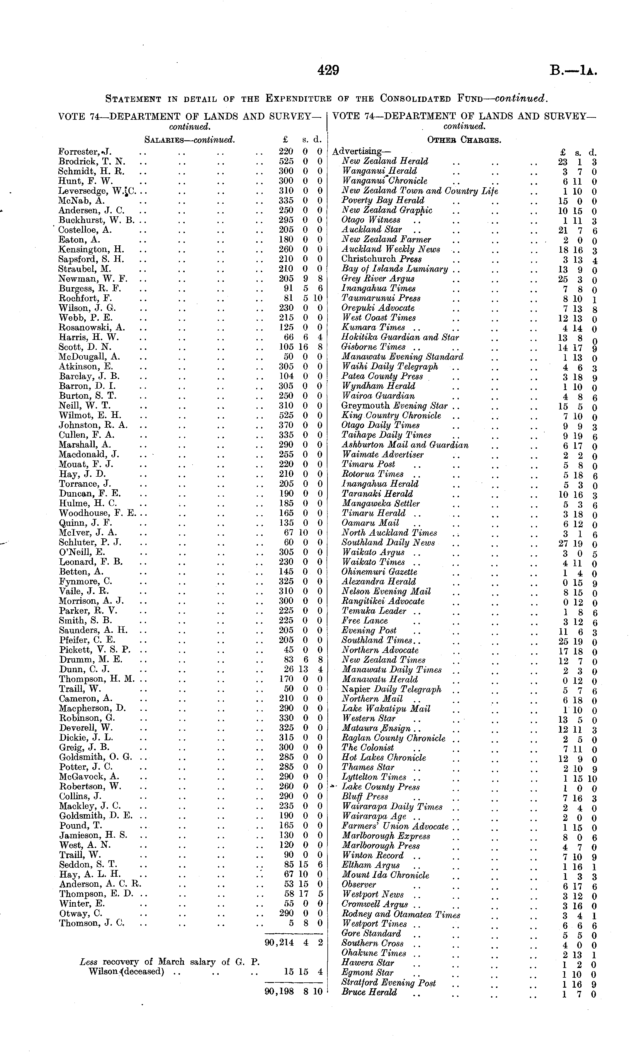 Statement in detail of the Expenditure op the Consolidated Fund— continued. VOTE 74—DEPARTMENT OF LANDS AND SURVEY— VOTE 74—DEPARTMENT OF LANDS AND SURVEY— continued. . continued. Salaries— continued. £ s. d. Othbb Charges. Forrester, .J. .. .. .. 220 0 0 Advertising— £ s. d. Brodrick, T. N. .. .. .. 525 0 0 New Zealand Herald .. .. .. 23 1 3 Schmidt, H. R. .. .. .. 300 0 0 Wanganui Herald .. .. .. 3 7 0 Hunt, F. W. .. .. .. .. 300 0 0 Wanganui" Chronicle .. 611 0 Leversedge, .. .. .. .. 310 0 0 New Zealand Town and Country Life .. 110 0 McNab, A. .. .. .. .. 335 0 0 Poverty Bay Herald .. .. .. 15 0 0 Andersen, J. C. .. .. .. .. 250 0 0 New Zealand Graphic .. .. .. 10 15 0 Buckhurst, W. B. .. .. .. .. 295 0 0 Otago Witness .'. .. ... .. 111 3 Costelloe, A. .. .. .. .. 205 0 0 Auckland Star .. .. .. .. 21 7 6 Eaton, A. .. .. .. .. 180 0 0 New Zealand Farmer .. .. ... 200 Kensington, H. .. .. .. .. 260 0 0 Auckland Weekly News .. .. .. 18 16 3 Sapsford, S. H. .. .. .. .. 210 0 0 Christchurch Press .. .. .. 313 4 Straubel, M. .. .. .. .. 210 0 0 Bay of Islands Luminary .. .. .. 13 9 0 Newman, W. P. .. .. .. .. 205 9 8 Grey River Argus .. .. .. 25 3 0 Burgess, R. F. .. .. .. .. 91 5 6 Inangahua Times .. .. .. 7 8 0 Rochfort, F. .. .. .. .. 81 510 Taumarunui Press .. .. .. 810 1 Wilson, J. G. .. .. .. .. 230 0 0 Orepuki Advocate .. .. .. 713 8 Webb, P. E. .. .. .. 215 0 0 West Coast Times .. .. .. 12 13 0 Rosanowski, A. .. .. .. 125 0 0 Kumara Times .. .. .. .. 414 0 Harris, H. W. .. .. .. .. 66 6 4 Hokitika Guardian and Star .. .. 13 8 0 Scott, D. N. .. .. .. 105 16 8 Gisborne Times .. .. .. .. 14 17 9 MoDougall, A. .. .. .. .. 50 0 0 Manawatu Evening Standard .. .. 113 0 Atkinson, E. .. .. .. .. 305 0 0 Waihi Daily Telegraph .. .. .. 4 6 3 Barclay, J. B. .. .. .. 104 0 0 Patea County Press .. .. .. 318 9 Barron, D. I. .. .. .. .. 305 0 0 Wyndham Herald .. .. .. 110 0 Burton, S. T. .. .. .. 250 0 0 Wairoa Guardian .. .. .. 4 8 6 Neill, W. T. .. .. .. 310 0 0 Greymouth Evening Star .. .. .. 15 5 0 Wilmot, E. H. .. .. .. .. 525 0 0 King Country Chronicle .. .. 710 0 Johnston, R. A. .. .. .. .. 370 0 0 Otago Daily Times .. .. .. 9 9 3 Cullen, F. A. .. .. .. 335 0 0 Taihape Daily Times .. .. .. 919 6 Marshall, A. .. .. .. .. 290 0 0 Ashburton Mail and Guardian .. .. 617 0 Macdonald, J. .. .. .. .. 255 0 0 Waimate Advertiser .. .. .. 2 2 0 Mouat, F. J. .. .. .. 220 0 0 Timaru Post .. .. .. .. 5 8 0 Hay, J. D. .. .. .. .. 210 0 0 Rotorua Times .. .. .. .. 518 6 Torrance, J. .. .. .. .. 205 0 0 Inangahua Herald .. .. .. 5 3 0 Duncan, F. E. .. .. .. 190 0 0 Taranaki Herald .. .. .. 10 16 3 Hulme, H. C. .. .. .. .. 185 0 0 Mangaweka Settler .. .. .. 5 3 6 Woodhouse, F. E. .. .. .. .. 165 0 0 Timaru Herald .. .. 3 18 0 Quinn, J. F. .. .. .. .. 135 0 0 Oamaru Mail .. .. .. .. 612 0 Mclver, J. A. .. .. .. .. 67 10 0 North Auckland Times .. .. 3 16 Schluter, P. J. .. .. .. .. 60 0 0 Southland Daily News .. .. .. 27 19 0 O'Neill, E. .. .. .. .. 305 0 0 Waikato Argus .. .. .. .. 3 0 5 Leonard, F. B. .. .. .. .. 230 0 0 Waikato Times .. .. .. .. 411 0 Betten, A. .. .. .. .. 145 0 0 Ohinemuri Gazette .. .. .. 14 0 Fynmore, C. .. .. .. .. 325 0 0 Alexandra Herald .. .. .. 015 9 Vaile, J. R. .. .. .. .. 310 0 0 Nelson Evening Mail .. .. .. 815 0 Morrison, A. J. .. .. .. 300 0 0 Rangitikei Advocate .. .. .. 012 0 Parker, R. V. .. .. .. .. 225 0 0 Temuka Leader .. .. . 18 6 Smith, S. B. .. .. .. 225 0 0 Free Lance .. .. .. '.'. 312 6 Saunders, A. H. .. .. .. .. 205 0 0 Evening Post .. .. .. .. 11 6 3 Pfeifer, C. E. .. .. .. .. 205 0 0 Southland Times.. .. .. .. 25 19 0 Pickett, V. S. P. .. .. .. .. 45 0 0 Northern Advocate . . .. .. 17 18 0 Drumm, M. E. .. .. .. .. 83 6 8 New Zealand Times .. .. .. 12 7 0 Dunn, C. J. .. .. .. .. 26 13 4 Manawatu Daily Times .. .. .. 2 3 0 Thompson, H. M. .. .. .. .. 170 0 0 Manawatu Herald .. .. .. 012 0 Traill, W. .. .. .. .. 50 0 0 Napier Daily Telegraph .. .. .. 5 7 6 Cameron, A. .. .. .. .. 210 0 0 Northern Mail .. .. .. .. 618 0 Macpherson, D. .. .. .. 290 0 0 Lake Wakatipu Mail .. .. .. 110 0 Robinson, G. .. .. .. .. 330 0 0 Western Star .. .. .. 13 5 0 Deverell, W. .. .. .. .. 325 0 0 Mataura .Ensign.. .. .. .. 12 11 3 Dickie, J. L. .. .. .. .. 315 0 0 Raglan County Chronicle 2 5 0 Greig, J. B. .. .. .. 300 0 0 The Colonist .. .. " 711 0 Goldsmith, O. G. .. .. .. 285 0 0 Hot Lakes Chronicle .. '.! 12 9 0 Potter, J. C. .. .. .. .. 285 0 0 Thames Star .. .. 210 9 McGavock, A. .. .. .. .. 290 0 0 Lyttelton Times .. .. '' 115 10 Robertson, W. .. .. .. .. 260 0 0"- Lake County Press .. .. 10 0 Collins, J. .. .. .. .. 290 0 0 Bluff Press .. .. \[ " 716 3 Mackley, J. C. .. .. .. .. 235 0 0 Wairarapa Daily Times .. .. .. 2 4 0 Goldsmith, D. E. .. .. .. .. 190 0 0 Wairarapa Age .. .. .. .. 2 0 0 Pound, T. .. .. .. .. 165 0 0 Farmers' Union Advocate .. .. 115 0 Jamieson, H. S. .. .. .. .. 130 0 0 Marlborough Express 8 0 6 West, A. N. .. .. .. 120 0 0 Marlborough Press '.'. 4 7 0 Traill, W. .. .. .. .. 90 0 0 Winton Record .. 710 9 Seddon, S. T. .. .. .. .. 85 15 6 Eltham Argus .. " 116 1 Hay, A. L. H. .. .. .. .'. 67 10 0 Mount Ida Chronicle \\ 13 3 Anderson, A. C. R. .. .. .. 53 15 0 Observer .. .. 617 6 Thompson, E. D. .. .. .. .. 58 17 5 Westport News .. .. .. \\ 312 0 Winter, E. .. .. .. .. 55 0 0 Cromwell Argus .. .. .. 316 0 Otway, C. .. .. .. .. 290 0 0 Rodney and Otamatea Times .. .. 3 4 1 Thomson, J. C. .. .. .. .. 5 8 0 Westport Times .. .. 6 6 6 Gore Standard .. 5 5 0 90,214 4 2 Southern Cross .. .. " 4 0 0 Ohakune Times .. .. 213 1 Less recovery of March salary of G. P. Hawera Star .. .. 12 0 Wilson (deceased) .. .. .. 15 15 4 Egmont Star .. .. 110 0 ■ Stratford Evening Post 1 16 9 90,198 810 Bruce Herald .. .. ." 17 0