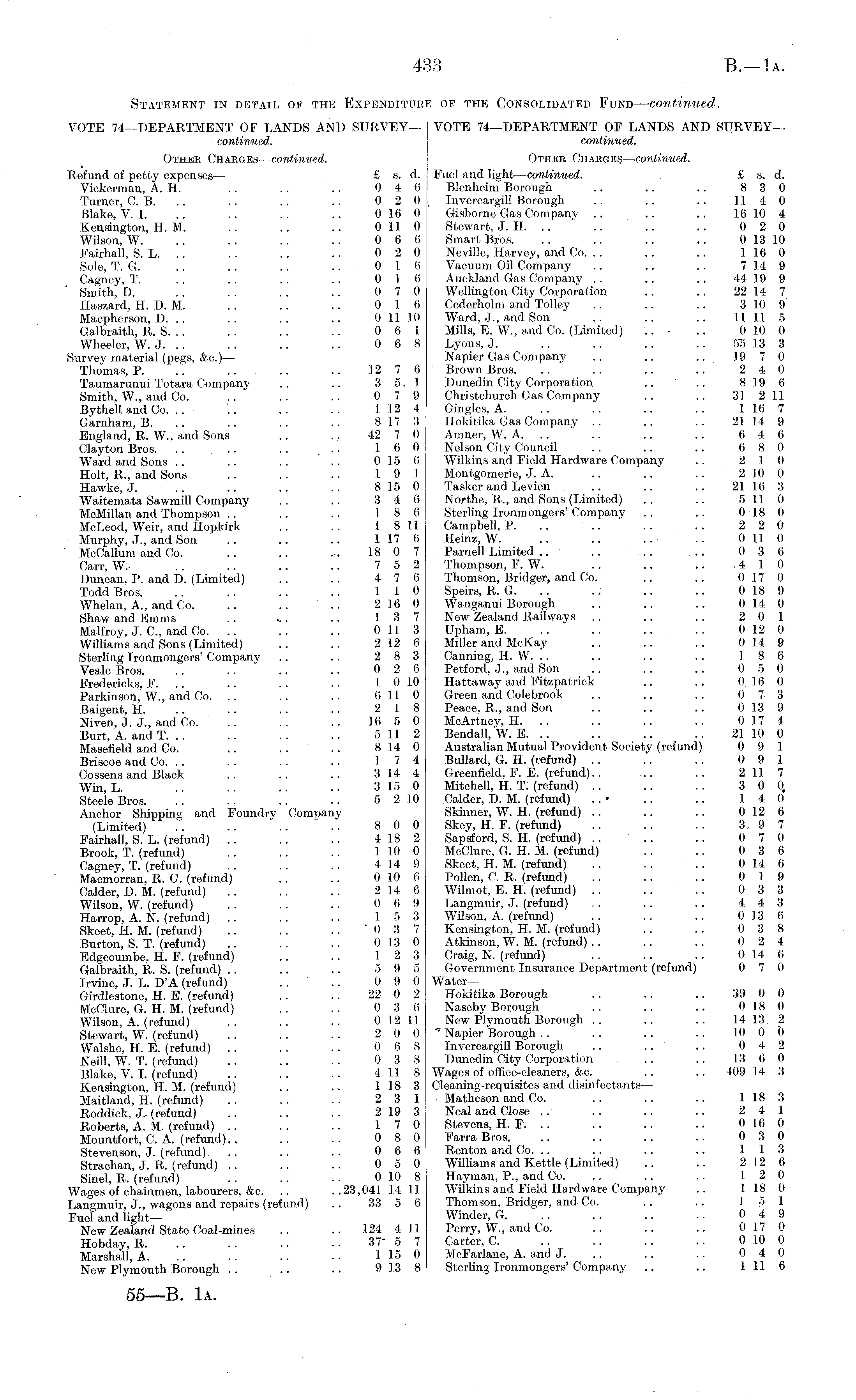 Statement in detail of the Expenditure op the Consolidated Fund — continued. VOTE 74—DEPARTMENT OF LANDS AND SURVEY— j VOTE 74—DEPARTMENT OF LANDS AND SURVEY— continued. continued. Other Charges— continued. Other Charges— continued. Refund of petty expenses — £ s. d. Fuel and light— continued. £ s. d. Vickerman, A. H. .. .. .. 0 4 6 j Blenheim Borough .. .. .. 83 0 Turner, C. B. .. .. . . . . 0 2 0 Invercargill Borough . . .. .. 114 0 Blake, V. I. .. .. .. .. 016 0 ' Gisborne Gas Company .. .. .. 16 10 4 Kensington, H. M. .. .. .. 0 11 0 Stewart, J. H. .. .. .. .. 020 Wilson, W. .. . . .. .. 0 6 6 1 Smart Bros. .. .. .. .. 013 10 Fairhall, S. L. . . .. .. .. 0 2 0 Neville, Harvey, and Co. .. .. .. 1 16 0 Sole, T. G. .. .. .. .. 0 16 Vacuum Oil Company .. .. .. 714 9 Cagney, T. . . .. .. .. 0 16 Auckland Gas Company .. .. .. 44 19 9 Smith, D. . . .. .. 0 7 0 J Wellington City Corporation .. .. 22 14 7 Haszard, H. D. M. .. .. .. 0 1 6 j Cederholm and Tolley .. .. .. 310 9 Macpherson, D. .. .. .. .. 011 10 Ward, J., and Son ' .. .. .. 11 11 5 Galbraith, R. S. .. .. .. .. 0 6 1 Mills, E. W., and Co. (Limited) .. ■ .. 010 0 Wheeler, W. J. . . . . .. .. 0 6 8 Lyons, J. .. .. .. 535 13 3 Survey material (pegs, &c.)— Napier Gas Company .. .. .. 19 7 0 Thomas, P. .. .. 12 7 6 Brown Bros. . . .. .. .. 2 4 0 Taumarunui Totara Company .. .. 3 5. 1 Dunedin City Corporation .. .. 8 19 6 Smith, W., and Co. .. .. .. 0 7 9 Christchurch Gas Company .. .. 31 2 11 Bythell and Co. .. ".. .. .. 112 4 Gingles, A. .. .. .. .. 116 7 Garnham, B. .. .. .. .. 817 3 Hokitika Gas Company .. .. .. 21 14 9 England, R. W., and Sons .. .. 42 70 j Amner, W. A. . . .. .. .. 64 6 Clayton Bros. .. .. .. ... 1 6 0 I Nelson City Council .. .. .. 680 Ward and Sons . . .. .. .. 0 15 6 Wilkins and Field Hardware Company . . 2 10 Holt, R., and Sons .. .. .. 19 1 Montgomerie, J. A. .. .. .. 210 0 Hawke, J. .. .. .. .. 815 0 Tasker and Levien .. .. .. 2] 16 3 Waitemata Sawmill Company .. .. 3 4 6 Northe, R., and Sons (Limited) .. .. 511 0 McMillan and Thompson .. ' .. .. 18 6 Sterling Ironmongers' Company .. .. 018 0 McLeod, Weir, and Hopkirk .. .. 1 811 Campbell, P. .. .. .. .. 2 2 0 Murphy, J., and Soa .. .. .. 1 17 6 Heinz, W. .. .. .. .. 011 0 McCallum and Co. .. .. .. 18 0 7 Parnell Limited .. .. .. .. 0 3 0 Carr, W. .. .. .. .. 7 5 2 Thompson, F. W. .. .. .. .410 Duncan, P. and D. (Limited) .. .. 4 7 6 Thomson, Bridger, and Co. .. .. 017 0 Todd Bros. .. .. .. .. 110 Speirs, R. G. .. .. .. .. 018 9 Whelan, A., and Co. .. .. .. 216 0 Wanganni Borough .. .. .. 014 0 Shaw and Emms .. ... .. 13 7 New Zealand Railways .. .. .. 2 0 1 Malfroy, J. C, and Co. .. .. .. 011 3 Upham, E. .. .. .. .. 012 0 Williams and Sons (Limited) .. .. 212 6 Miller and McKay .. .. .. 014 9 Sterling Ironmongers' Company .. .. 2 8 3 Canning, H. W. .. .. .. .. 18 6 Veale Bros. .. .. .. .. 0 2 6 Petford, J., and Son .. .. .. 0 5 0 Fredericks, F. .. .. . . 1 010 Hattaway and Fitzpatrick .. .. 0. 16 0 Parkinson, W., and Co. .. .. .. 611 0 Green and Colebrook .. .. .. 0 7 3 Baigent, H. .. .. .. .. 2 18 Peace, R., and Son .. .. .. 013 9 Niven, J. J., and Co. .. .. .. 16 5 0 McArtney, H. .. .. .. .. 0174 Burt, A. and T. .. .. .. .. 5 11 2 Bendall, W. E. .. .. .. .. 2110 0 Masefield and Co. .. .. .. 814 0 Australian Mutual Provident Society (refund) 0 9 1 Briscoe and Co. .. .. .. .. 17 4 Bullard, G. H. (refund) .. .. .. 0 9 1 Cossens and Black .. .. .. 3 14 4 Greenfield, F. E. (refund).. ... .. 2 11 7 Win, L. .. .. .. . . 315 0 Mitchell, H. T. (refund) .. .. .. 3 0 0, Steele Bros. . . .. .. . . 5 210 Calder, D. M. (refund) .. • .. .. 14 0 Anchor Shipping and Foundry Company Skinner, W. H. (refund) . . .. .. 0 12 6 (Limited) .. .. .. .. 8 0 0 Skey, H. F. (refund) 3 9 7 Fairhall, S. L. (refund) .. .. .. 418 2 Sapsford, S. H. (refund) .. .. .. 0 7 0 Brook, T. (refund) .. .. .. 110 0 MoClure, G. H. M. (refund) .. .. 0 3 6 Cagney, T. (refund) .. .. .. 414 9 Skeet, H. M. (refund) . . . . . . 014 6 Macmorran, R. G. (refund) . . .. 010 6 Pollen, C. R. (refund) .. .. .. 0 19 Calder, D. M. (refund) .. .. .. 214 6 Wilmot, E. H. (refund) .. .. .. 0 3 3 Wilson, W. (refund) .. .. .. 0 6 9 Langmiiir, J. (refund) .. .. .. 4 4 3 Harrop, A. N. (refund) .. .. .. 15 3 Wilson, A. (refund) . . . . .. 013 6 Skeet, H. M. (refund) .. .. .. '037 Kensington, H. M. (refund) .. .. 038 Burton, S. T. (refund) .. . . .. 013 0 Atkinson, W. M. (refund) .. .. .. 0 2 4 Edgocumbe, H. F. (refund) .. .. 12 3 Craig, N. (refund) .. .. .. 014 6 Galbraith, R. S. (refund) .. .. . . 5 9 5 Government Insurance Department (refund) 0 7 0 Irvine, J. L. DA (refund) .. .. 0 9 0 Water— Girdlestone, H. E. (refund) .. . . 22 0 2 Hokitika Borough .. .. .. 39 0 0 McClure, G. H. M. (refund) .. .. 0 3 6 Naseby Borough .. .. .. 018 0 Wilson, A. (refund) .. .. .. 012 11 New Plymouth Borough .. .. .. 14 13 2 Stewart, W. (refund) .. .. .. 2 0 0 " Napier Borough .. .. .. .. 10 0 0 Walshe, H. E. (refund) .. . . . . 0 6 8 Invercargill Borough .. .. .. 0 4 2 Neill, W. T. (refund) .. .. .. 0 3 8 Dunedin City Corporation .. .. 13 6 0 Blake, V. I. (refund) .. .. 411 8 Wages of office-cleaners, &c. .. .. 409 14 3 Kensington, H. M. (refund) .. .. 1 18 3 Cleaning-requisites and disinfectants— Maitland, H. (refund) . . .. .. 2 3 1 Matheson and Co. .. .. .. 118 3 Roddick, J, (refund) .. .. .. 219 3 Neal and Close .. .. .. .. 2 4 1 Roberts, A. M. (refund) .. .. .. 17 0 Stevens, H. F. .. .. .. .. 016 0 Mountfort, C. A. (refund).. .. .. 0 8 0 Farra Bros. .. .. .. .. 0 3 0 Stevenson, J. (refund) .. . . . . 0 6 6 Renton and Co. .. .. .. .. 113 Strachan, J. R. (refund) .. .. .. 0 5 0 Williams and Kettle (Limited) .. .. 212 6 Sinel, R. (refund) .. .. .. 010 8 Hay man, P., and Co. .. .. .. 12 0 Wages of chainmen, labourers, &c. .. ..23,041 14 11 Wilkins and Field Hardware Company .. 1. J8 0 Langmuir, J., wagons and repairs (refund) .. 33 5 6 Thomson, Bridger, and. Co. .. .. 15 1 Fuel and light— Winder, G. .. .. .