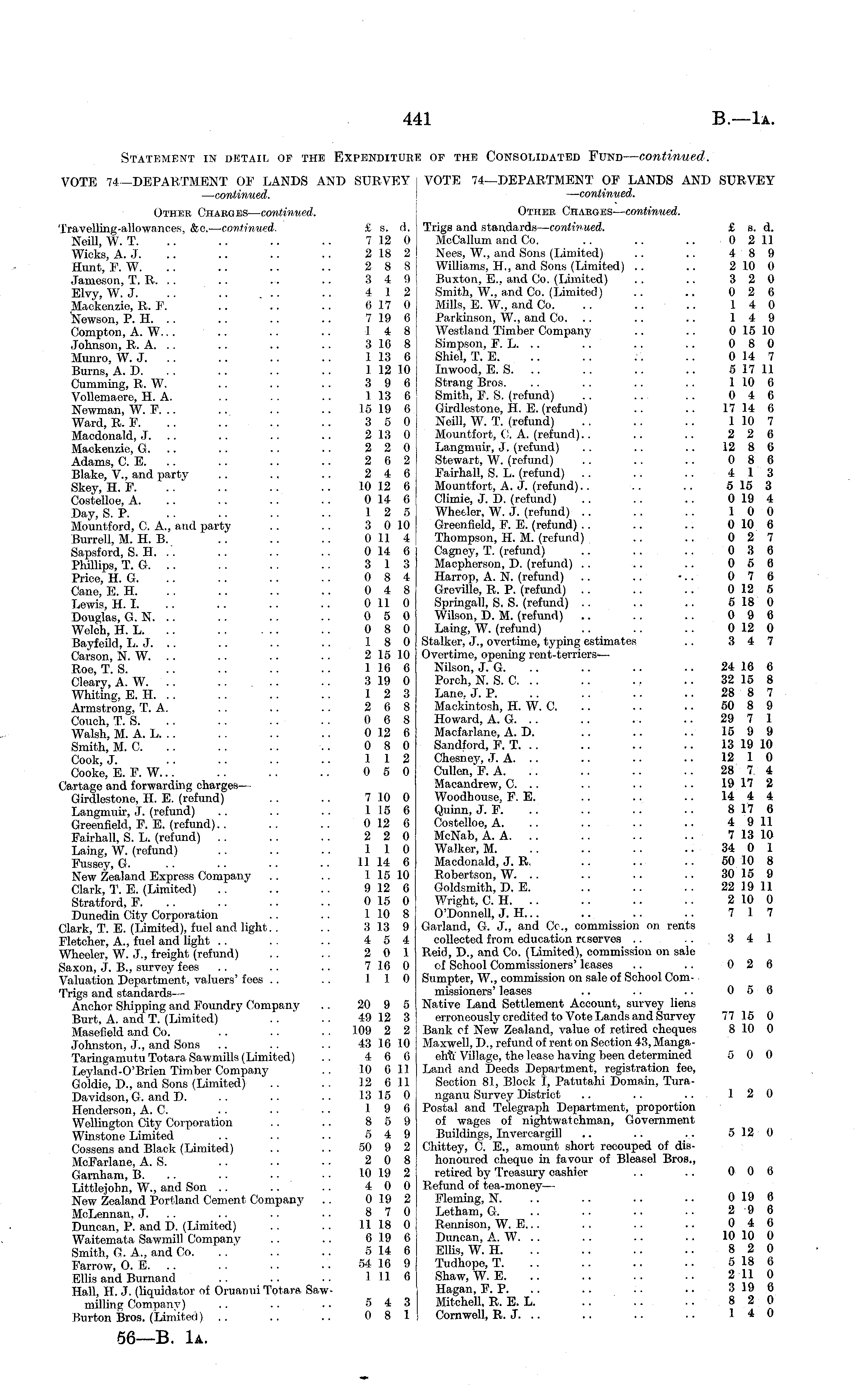 Statement in detail of the Expenditure of the Consolidated Fund— continued. VOTE 74—DEPARTMENT OF LANDS AND SURVEY VOTE 74—DEPARTMENT OF LANDS AND SURVEY — continued. — continued. Other Charges— continued. Othee Charges— continued. Travelling-allowances, &c. — continued. £ s. d. Trigs and standards— continued. £ s. d. Neill, W. T. .. .. .. .. 7 12 0 MoCallum and Co. .. .. .. 0 2 11 Wicks, A. J. .. .. .. .. 218 2 Nees, W., and Sons (Limited) .. .. 4 8 ft Hunt, F. W. .. .. .. .. 2 8 8 Williams, H., and Sons (Limited) .. .. 210 0 Jameson, T. R. .. .. ... .. 3 4 9 Buxton, E., and Co. (Limited) .. .. 3 2 0 Elvy. W. J. .. .. ... .. 412 Smith, W., and Co. (Limited) .. .. 0 2 6 Mackenzie, R. F. .. .. .. 617 0 Mills, E. W., and Co. .. .. .. 14 0 Newson, P. H. .. .. .. .. 719 6 Parkinson, W., and Co. .. .. .. 14 9 Compton, A. W... .. .. .. 14 8 Westland Timber Company .. .. 015 10 Johnson, R. A. .. .. .. .. 316 8 Simpson, E. L. .. .. .. .. 0 8 0 Munro, W. J. .. .. .. .. 113 6 Shiel, T. E. .. .. .. .. 014 7 Burns, A. D. . . .. .. .. 112 10 Inwood, E. S. .. .. .. .. 517 11 Cumming, R. W. .. .. .. 3 9 6 Strang Bros. .. .. .. .. 110 6 Vollemaere, H. A. .. .. .. 1 13 6 Smith, F. S. (refund) .. .. .. 0 4 6 Newman, W. F. .. .. .. .. 15 19 6 Girdlestone, H. E. (refund) .. .. 17 14 6 Ward, R. F. .. ..' .. .. 3 5 0 Noill, W. T. (refund) .. .. .. 110 7 Macdonald, J. .. .. .. .. 213 0 Mountfort, C. A. (refund).. .. .. 2 2 6 Mackenzie, G. .. .. .. .. 2 2 0 Langmuir, J. (refund) .. .. .. 12 8 6 Adams, C. E. .. .. .. .. 2 6 2 Stewart, W. (refund) .. .. .. 0 8 6 Blake, V., and party .. .. .. 2 4 6 Fairhall, S. L. (refund) .. .. .. 4 13 Skey, H. F. .. .. .. .. 10 12 6 Mountfort, A. J. (refund).. .. .. 515 3 Costelloe, A. .. .. .. .. 014 6 Climie, J. D. (refund) .. .. .. 019 4 Day, S. P. .. .. .. .. 12 5 Wheeler, W. J. (refund) .. .. .. 10 0 Mountford, C. A., and party .. .. 3 010 Greenfield, F. E. (refund) .. .. .. 010 6 Burrell, M. H. B. .. .. .. 0 114 Thompson, H. M. (refund) .. .. 0 2 7 Sapsford, S. H. .'. .. .. .. 014 6 Cagney, T. (refund) .. .. .. 0 3 6 Phillips, T. G. .. .. .. .. 3 13 Macpherson, D. (refund) .. .. .. 0 5 6 Price, H. G. .. .. .. .. 0 8 4 Harrop, A. N. (refund) .. .. •.. 0 7 6 Cane, E. H. . . .. .. .. 0 4 8 Greville, R. P. (refund) .. .. .. 012 5 Lewis, H. I. .. .. .. .. 0110 Springall, S. S. (refund) .. .. .. 518 0 Douglas, G. N. .. .. .. .. 0 5 0 Wilson, D. M. (refund) .. .. .. 0 9 6 Welch, H. L. .. .. 0 8 0 Laing, W. (refund) .. .. .. 012 0 Bayfeild, L. J. .. .. .. .. 18 0 Stalker, J., overtime, typing estimates .. 3 4 7 Carson N W. .. .. • ■ • • 2 15 10 Overtime, opening rent-terriers— Roe, T. S. .. .. .. .. 116 6 Nilson, J. G. .. .. .. .. 24 16 6 Cleary AW... .. .. .. 319 0 Porch, N. S. C. .. .. .. .. 32 15 8 Whiting, E. H. . . .. .. .. 12 3 Lane, J. P. .. .. .. .. 28 8 7 Armstrong, T. A. .. .. .. 2 6 8 Mackintosh, H. W. C. .. .. .. 50 8 9 Couch, T. S. .. .. .. .. 0 6 8 Howard, A. G. .. .. .. .. 29 7 1 Walsh, M. A. L. .. . . .. .. 012 6 Macfarlane, A. D. .. .. .. 15 9 9 Smith M. C .. .. .. .. 0 8 0 Sandford, F. T. .. .. .. .. 13 19 10 Cook, J. .. .. .. .. 112 Chesney, J. A. .. .. .. .. 12 1 0 Cooke, E. F. W... .. .. .. 0 5 0 Cullen, F. A. .. .. .. .. 28 7 4 Cartage and forwarding charges— Macandrew, C. .. .. .. .. 19 17 2 Girdlestone, H. E. (refund) . . .. 710 0 Woodhouse, F. E. .. .. .. 14 4 4 Langmuir, J. (refund) .. .. .. 115 6 Quinn, J. F. .. .. .. .. 817 6 Greenfield, F. E. (refund).. .. .. 012 6 Costelloe, A. .. .. .. .. 4 911 Fairhall, S. L. (refund) .. .. .. 2 2 0 McNab, A. A. .. .. .. .. 713 10 Laing, W. (refund) .. .. .. 110 Walker, M. .. .. .. .. 34 0 1 Fussey, G. .. .. .. .. 11 14 6 Macdonald, J. R. .. .. .. 50 10 8 New Zealand Express Company . . .. 115 10 Robertson, W. .. .. .. .. 30 15 9 Clark TE. (Limited) .. .. .. 912 6 Goldsmith, D. E. .. .. .. 22 19 11 Stratford, F 015 0 Wright, C. H 210 0 Dunedin City Corporation .. .. 110 8 O'Donnell, J. H... .. .. .. 7 17 Clark, T. E. (Limited), fuel and light. . .. 313 9 Garland, G. J., and Co., commission on rents Fletcher, A., fuel and light .. .. .. 4 5 4 collected from education reserves .. .. 3 4 1 Wheeler, W. J., freight (refund) .. .. 2 0 1 Reid, D., and Co. (Limited), commission on sale Saxon, J. 8., survey fees .. . . .. 716 0 of School Commissioners' leases .. .. 0 2 6 Valuation Department, valuers'foes .. .. 110 Sumpter, W., commission on sale of School CornTrigs and standards— missioners' leases .. .. .. 0 5 8 Anchor Shipping and Foundry Company .. 20 9 5 Native Land Settlement Account, survey liens Burt, A. and T. (Limited) .. .. 49 12 3 erroneously credited to Vote Lands and Survey 77 15 0 MaseWd and Co. .. .. . . 109 2 2 Bank of New Zealand, value of retired cheques 810 0 Johnston, J., and Sons .. .. .. 43 16 10 Maxwell, D., refund of rent on Section 43, MangaTaringamutu Totara Sawmills (Limited) .. 4 6 6 ehti Village, the lease having been determined 50 0 Leyland-O'Brien Timber Company .. 10 611 Land and Deeds Department, registration fee, Goldie, D., and Sons (Limited) .. . . 12 611 Section 81, Block I, Patutahi Domain, TuraDavidson, G. and D. .. .. .. 13 15 0 nganu Survey District .. .. .. 12 0 Henderson, A. C. .. .. • • 19 6 Postal and Telegraph Department, proportion Wellington City Corporation .. .. 8 5 9 of wages of nightwatchman, Government Winstone Limited .. .. . • 5 4 9 Buildings, Invercargill .. .. .. 512 0 Cossens and Black (Limited) .. . . 50 9 2 Chittey, C. E., amount short recouped of disMcFarlane, A. S. .. .. • ■ 2 0 8 honoured cheque in favour of Bleasel Bros., Garnham, B. .. .. .. ■ • 10 19 2 retired by Treasury cashier .. .. 0 0 6 Littlejohn, W., and Son .. .. .. 4 0 0 Refund of tea-money— New Zealand Portland Cement Company .. 019 2 Fleming, N. .. .. .. .. 019 6 McLennan, J. .. .. .. .. 8 7 0 Letham, G. .. .. .. .. 2 9 6 Duncan, P. and D. (Limited) .. .. 11 18 0 Rennison, W. E... .. .. .. 04 6 Waitemata Sawmill Company .. .. 619 6 Duncan, A. W. .