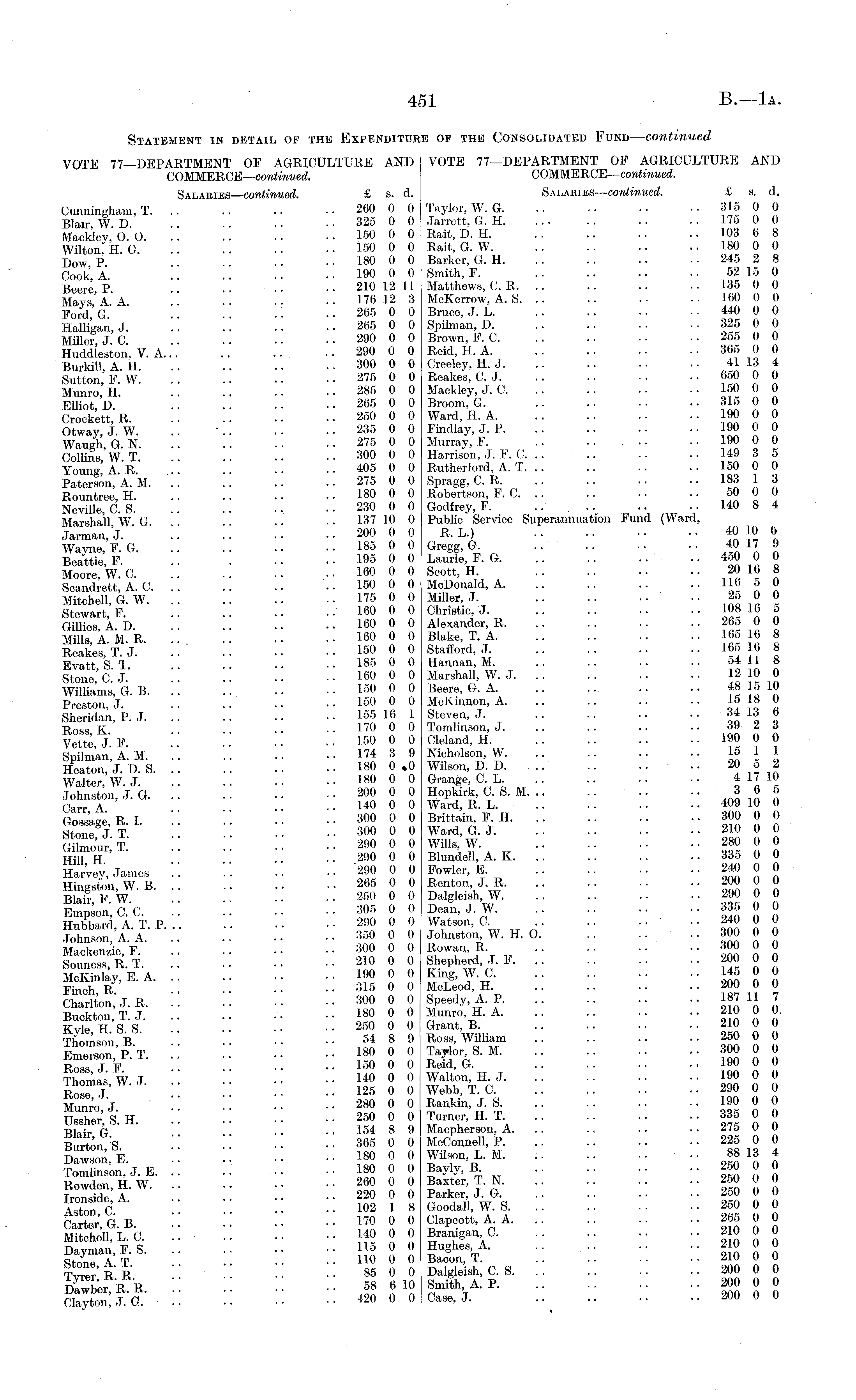 Statement in detail of the Expenditure of the Consolidated Fund — continued VOTE 77—DEPARTMENT OF AGRICULTURE AND VOTE 77—DEPARTMENT OF AGRICULTURE AND COMMERCE— continued. COMMERCE— continued. Salaries— continued. £ s. d. Salabies— continued. £ s. d. Cunningham. T 260 0 0 Taylor, W. G 315 0 0 Blair W D ' .. .. 325 0 0 Jarrett, G. H. ... .. .. .. 175 0 0 Mackley'o.'o. .. .. .. .. 150 0 0 Rail, D. H. .. 103 0 8 Wilton, H. G 150 0 0 Rait, G. W 180 0 0 Dow p.... 180 0 0 Barker, G. H. .. .. .. 245 2 8 Cook A ■• •• 190 0 0 Smith, F. .. .. .. •• 52 15 0 Beeru P • • 210 12 11 Matthews, (J. R. .. .. .. 135 0 0 MavsVA .. •• 176 12 3 MoKerrow, A. S. .. .. •■ . . 160 0 0 FordG." •■ 265 0 0 Bruce, J. L. .. .. .. 440 0 0 Halli'gan, J. '.'. 265 0 0 Spilman, D 325 0 0 Miller, J. C 290 0 0 Brown, F. C 255 0 0 Huddleston, V. A 290 0 0 Reid, H. A 365 0 0 Burkill. A. H 300 0 0 Creeley, H. J .. . • 41 13 4 Button F.W ■■ •• 275 0 0 Reakes, C. J. .. .. • • .. 650 0 0 Munro'H ■• 285 0 0 Macldey, J. C. .. .. .. .. 150 0 0 Elliot 'd.' • • • • 265 0 0 Broom,' G. .. .. ■ • • • 315 0 0 Crockett, R 250 0 0 Ward, H. A 190 0 0 Otwav J W ' • 235 0 0 Findlay, J. P. .. .. • • 190 0 0 Waugh.G. N. '.'. 275 0 0 Murray, F 190 0 0 Collins W T .. 300 0 0 Harrison, J. F. C. .. .. . . .. 149 3 5 Young' A. R. •• 405 0 0 Rutherford, A. T. .. .. .. 150 0 0 Paterson.A.M 275 0 0 Spragg, C. R 183 1 3 Rountree H . .. 180 0 0 Robertson, F. C. .. .. .. • • 50 0 0 Neville, C. S." '.'. 230 0 0 Godfrey, F .. 140 8 4 Marshall W G 137 10 0 Public Service Superannuation Fund (Ward, Jarman,J. ' '.'. '.'. ■■ .. 200 0 0 R. L.) 40 10 0 Wavne F G .. . . 185 0 0 Gregg, G. .. .. .. .. 40 17 9 BeXe,F. V. . .. ■■ 195 0 0 Laufe, F. G 450 0 0 Moore, W. C 160 0 0 Scott, H. 20 16 8 Scandrett A.C 150 0 0 McDonald, A lib 5 0 Mitchell, G.W 175 0 0 Miller, J. 25 0 0 Stewart F .. 160 0 0 Christie, J. .. .. •• .. 108 16 5 Gillies AT> " .. . . 160 0 0 Alexander, R 265 0 0 Mills AM R '' '' • • . . 160 0 0 Blake, T. A 165 16 8 Reaket'TJ W .. .. ■■ 150 0 0 Stafford, J 165 16 8 Evatt SI • • .. 185 0 0 Hannan, M. .. .. .. .. t>4 11 8 Stone CJ ' " .. 160 0 0 Marshall, W. J 12 10 0 Williams', G. B 150 0 0 Beere, G. A 48 15 10 Preston, J .. .. 150 0 0 McKinnon, A 18 0 Sheridan, P. J 155 16 1 Steven, J 34 13 6 R()lls k ... 170 0 0 Tomlinson, J. .. .. .. • • 39 2 3 Vette J F '" " • • 150 0 0 Cleland, H 190 0 0 Spilman, A. M. '.'. 174 3 9 Nicholson, W on r o Heaton, J. D. 8 180 0 0 Wilson, D. D 20 5 2 Walter W J .. 180 0 0 Grange, C. L. .. .. .. .. 417 10 Johnston, J. G. '.'. '.'. ■■ .. 200 0 0 Hopkirk, C. S. M 3 6 5 (<.,„ a 140 0 0 Ward, R. L. .. .. .. .. 409 10 0 Qossaae R 1 '.'. '.'. '■'■ .. 300 0 0 Brittain, F. H .. 300 0 0 StoneJT . .. 300 0 0 Ward, G. J 210 0 0 G XourT .. .. 290 0 0 Wills, W. 280 0 0 Hill H .. 290 0 0 Blundell.A. X 335 0 0 HarVey, James '.'. \\ .. ■■ '290 0 0 Fowler, E. .. .. .. 240 0 0 Eineston W B .. .. 265 0 0 Ronton, J. R 200 0 0 Blair FW . .. 250 0 0 Dalgleish, W 290 0 0 Imrson CC '.'. '.'. .. .. 305 0 0 Dean, J. W 335 0 0 Hubbarf A.T. P..! " •■ .. 290 0 0 Watson,o .. 240 0 0 "ZsonAA :: 350 0 0 Johnston W. H. O. .. .. 300 0 0 Mackenzie F • ■ .. 300 0 0 Rowan, R. . . .. ■ ■ .. 300 0 0 som™.T. :: : ™oo a^, j. f. .. :: 200 00 WoKinlav E A . • .. 190 0 0 King, W. C. .. . . .. 145 0 0 Knch R •• .. 315 0 0 McLeod, H 200 0 0 CtarfhJj.R. :: 300 0 0 Speedy, A. P. .. .. .. 187 11 7 Biickton T T •• .. 180 0 0 Munro, H. A. .. .. .. .. 210 0 0. Kvl' HS S .. .. 250 0 0 Grant, B 210 0 0 Thomson B " 54 8 9 Ross, William 250 0 0 Srt. :: :: .. :: iso o o is.M 300 0 0 Ross j w .... 150 0 0 Reid, G. .. .. • • .. 190 0 0 Thomas W J '" ■ .. 140 0 0 Walton, H. J 190 0 0 Thomas, W.J Q Q Webb T c 290 0 0 MuSo J " ' .. 280 0 0 Rankin, J. S 190 0 0 Usshe"' S H ■ • ■ 250 0 0 Turner, H. T 335 0 0 Ussftei t>. n. i 54 g0 M c A 275 0 0 Burton s " " ■ .. 365 0 0 McConnell, P 225 0 0 Dawson E '.'. ■■ ■ • 180 0 0 Wilson, L. M 88 13 4 tXsoi-j.E. :: :: :: :: .. •■ o o WnwH«n H W 260 0 0 Baxter, T. N. .. .. .. 250 0 0 rolideA .. 220 0 0 Parker, J. G 250 0 0 AstonC. ■• .. 102 1 8 Goodall, W. S 250 0 0 Carter G B '.'. ■ 170 0 0 Clapcott, A. A 265 0 0 Dnvtnan F S •• . . 115 0 0 Hughes, A. .. .. .. 210 0 0 SteClr . .. 110 0 0 Bacon, T 210 0 0 Tvrerßß " " ■• •• 85 0 0 Dalgleish, C. S 200 0 0 nlwbef R R '' ' ' 58 610 Smith, A. P 200 0 0