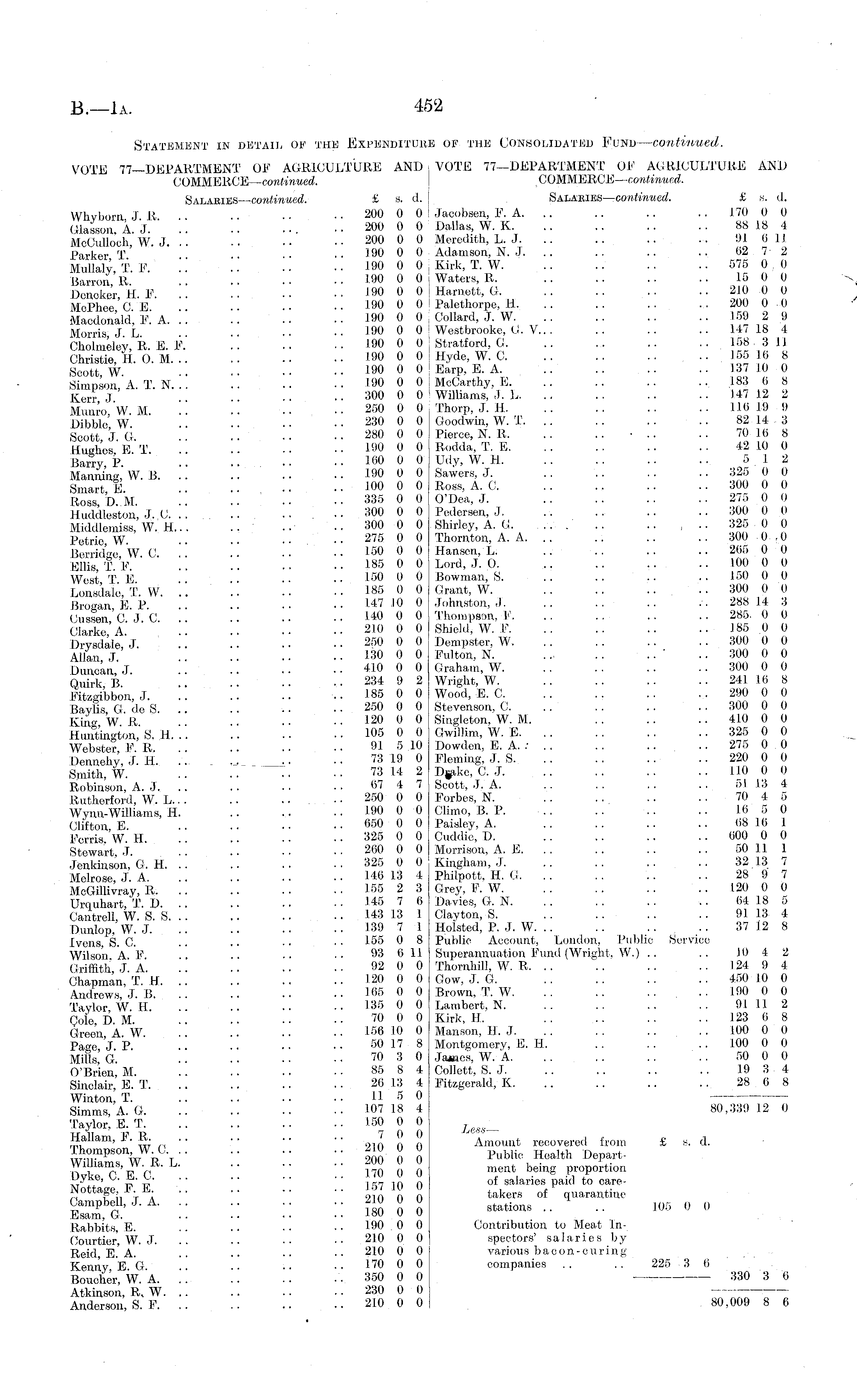 Statement in detail of the Expenditure of the Consolidated Fund — continued. VOTE 77—DEPARTMENT OF AGRICULTURE AND VOTE 77—DEPARTMENT OF AGRICULTURE AND COMMERCE— continued. COMMERCE— continued. Salaries — continued. £ s. d. ' Salaries— continued. £ s. d. VVhybom J R • • .. 200 0 0 Jaoobsen, P. A. .. . . .. .. 170 0 0 Glasson, A. J. " .. 200 0 0 Dallas, W. X 88 18 4 MoCulloch W.J. .. .. •■ 200 0 0 Meredith, L. J. .. .. .. .. 91 611 Parker T. ■• 190 ° ° Adamson, N. J. .. .. .. .. (i 2 7 2 Mullaly T. F. '.'. ■■ ■■ .. 190 00 , Kirk, T. W. .. 575 0 0 Barron R .... 190 00 i Waters, R. .. .. .. .. 15 0 0 Deaoker H. F. '.. . .. •■ 190 0 0 j Harnett, G. .. .. .. .. 210 0 0 MoPhee' C. E. •• ~ 190 0 0 Palethorpe, H. .. .. .. .. 200 0 0 Macdonald', V. A. '. '. 190 0 0 Collard, J. W 159 2 9 Morris J. L .... 100 0 0 Westbrooke, G. V... .. .. .. 147 18 4 Cholmelev RE. F." .. .. •• 190 0 0 Stratford, G. .. .. .. .. 158, 311 Christie, H. 6. M 190 0 0 Hyde, W. C 15510 8 Scott W .. •• .. 190 0 0 ' Earp, E. A. .. .. .. .. 137 10 0 SimnsonA T N •. .. 190 0 0 McCarthy, E. .. .. .. .. 183 (i 8 Kerr J. .. .. 300 0 0 Williams, .I. 1,. .. .. .. .. 147 12 2 Munro W M .. •• .. 250 0 0 Thorp, J. 11. .. .. .. .. Ll6 19 9 Dibble w' " ■ • • • 2;!0 ° ° Goodwin, W. T. .. .. . . .. 82 14 3 Scott J G .. 280 0 0 Pierce, N. R. .. .. • .. .. 70 16 8 Hwiles' k''L' ■• •• 190 0 0 Rodda, T. E. .. .. .. .. 42 10 0 Barry, P ' '.'. .'. ■■ . . 100 0 0 Udy, W. H 5 12 Manning W. 13. .. 190 0 0 Sawers, J. .. .. .. .. 325 0 0 Smart E .... 100 0 0 Ross, A. C. .. .. .. .. 300 0 0 Ross, B. M 335 0 0 ODea, J. 275 0 0 Huddleston J.'.C 300 0 0 Pedersen, J. 300 0 0 Middlemiss, W.'H 300 0 0 Shirley, A. (J .. .. , .. 325 0 0 Petrie W .. • • ■ • 275 ° ° Thornton, A. A. . . . . .. . . 300 0.0 Berridge W. C. '.'. ■ ■ • • 150 0 0 Hansen, 1,. .. .. .. .. 205 0 0 Ellis T.F. •• •• 185 0 0 Lord, J. O. .. .. .. .. 100 0 0 West T E '.'. " ■• 150 0 0 Bowman, S. .. .. .. .. 150 0 0 Lonsdale, T. W. '.'. 185 0 0 (J rant, W. 300 0 0 Brogan E. P •• •• 147 10 0 Johnston,.!. .. .. .. ..288 14 3 CussWc.'j.C 140 0 0 Thompson, X 285. 0 0 Clarke A .. •■ 210 0 0 Shield, W. I' , . .. .. .. .. 185.0 0 Drysdale.'j .. 250 0 0 Dempster, W .. .. 300 0 0 Allan J. .... 130 0 0 Fulton, N. . . . . .. '.. 300 0 0 Duncan J ■• •• 410 Q ° Graham, W. .. .. .. .. 300 0 0 Quirk B. ' .... 234 i) 2 Wright, W. .. .. .. 241 16 8 Bitegi'bbon, J. : .'. 185 0 0 Wood, E. C. .. .. .. .. 290 0 0 Baylis G <le S • • • • 25 ° ° ° Stevenson, C. .. . . .. . . 300 0 0 King W.'r ■• 120 ° ° Singleton, W. M. .. .. .. 410 0 0 liuntington,' S. H. '.'. 105 0 0 Gwillim, W. E 325 0 0 Webster 1 ,1 R .... 91 5 10 Dowden, E. A. : . . . . .. .. 275 0 0 Dennehy, J.-S. '.'. 73 19 0 Fleming, J. S 220 0 0 Smith, W. .. •• ■• ■• 73 14 2 Dgike, C. .1. .. .. .. .. 110 0 0 Robinson, A. J. .. .. .. •• 07 4 7 Scott, J. A. .. .. .. .. 51 13 4 Rutherford, W. L.. . .. .. .. 250 0 0 Forbes, N. . . ... . . . . 70 4 5 Wynn-Williams, H. .. .. .. 190 0 0 Climo, B. P. . . .. . . .. 10 5 0 Clifton E . .. .. 650 0 0 Paisley, A. .. .. .. .. 08 10 I Ferris 'w H .. • ■ .. 325 0 0 Cuddie, D. . . .. . . .. 000 0 0 Stewart, J. ' .. •■ ■■ .. 260 0 0 Morrison, A. E. .. .. .. .. 50 11 1 Jenkinson, G. H. .. .. .. . . 325 0 0 Kingham, .1. .. .. .. .. 32 13 7 Melrose, J. A. .. 146 13 4 Philpott, H. G. .. .. .. .. 28 9 7 MeGillivray, R. .. .. .. •• 155 2 3 Grey, V. W. .. .. .. .. 120 0 0 Urquhart, T. P, .. .. .. .. 145 7 0 Davies, (J. N. .. .. .. .. 64 18 5 Cantrell, W. S. S •• •• 143 13 1 Clayton, S. .. 9113 4 Dunlop, W. J. .. •■ •• 139 7 ! Hoisted, P. J. W. .. .. .. .. 37 12 8 Ivens, 8. C. .. .. •• •• >'>■' " 8 Public Account, London, I'iihlie Service Wilson A F .. 93 0 II Superannuation Fund (Wright, W.) .. .. 10 4 2 Griffith J. A .. •• 92 0 0 Thornhill, W. R, .. .. .. .. 124 9 4 Chapman, T. H 120 0 0 Gow, J. G 450 10 0 Andrews J. B. .. .. .. .. 105 0 0 Brown, T. W. .. .. 190 0 0 Taylor W H .. .. 135 0 0 Lambert, N. .. .. .. .. 91 11 2 Cole DM ■• 70 0 0 Kirk, H. .. .. .. 123 (i 8 Green A W .... 156 10 0 Manson, H. J. .. .. .. .. 100 0 0 Page J P •• ■■ .. 50 17 8 Montgomery, E. H. .. . • 100 0 0 Mills' G .. 70 3 0 Jaees, W. A .. .. 50 0 0 O'Brien, M. .. .. .. 85 8 4 Collett, S. J. .. .. .. .. 10 3 4 Sinclair, E. T. .. .. .. ■• 26 13 4 Fitzgerald, K. .. .. .. .. 28 0 8 Winton, T. .. .. • • • • U r > ° Simms,A-.G 107 18 4 80,339 12 0 Taylor, E. T. .. .. .. .. 150 0 0 j Hallam, F. R. 7 0 0 J Amount recovered from £ b. d. Thompson, WC 210 0 0 Hoal(1| () ST'fc '■ :: :: I™ I! o r * p^,; "•>,' t;' '' i k-7 in not salaries paid to care,,P'. nr " 9in n n takers of quarantine Campbell, J. A. .. .. .. 210 0 0 „(-„«,„,„ Hi-, 0 n ■r-. l ,-, i qa i\ a stations .. .. Wo v v Esam, G. .. . . • • .. 180 0 0 Rabbits E. .. •. • • • • 190 0 0 Contribution to Meat inCourtier W. J. •• •• •■ 210 0 0 spectors , salaries by Reid, E. A. .. .. •• •■ 210 0 0 various bacon-curing Kenny EG .. .. 170 0 0 companies . . . . 225 3 6 Boucher, W. A 350 0 0 330 3 0 Atkinson, R. W. .. .. .. • • 230 0 0 Anderson, S.F 210 0 0 80,009 8 0
