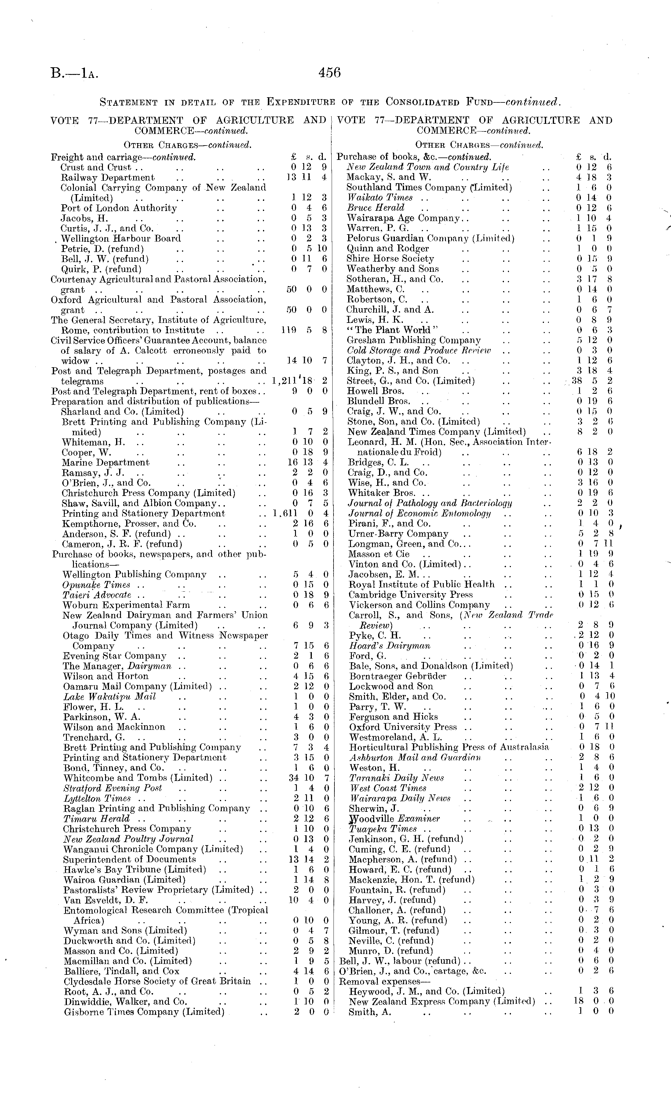Statement in detait, of the Expenditure of the Consolidated Fund — continued. VOTE 77—DEPARTMENT OF AGRICULTURE AND I VOTE 77—DEPARTMENT OF AGRICULTURE ANT) COMMERC E— continued. COMMERCE— continued. Other Charges— continued. Other Charges— continued. Freight and carriage— continued. £ s. d. Purchase of books, &c.— continued. £ s. d. Crust and Crust .. .. .. .. 0 12 9 New Zealand Town and Country Life .. 0 12 6 Railway Department .. 1:S 11 4 Mackay, S. and W. . . .. . . 4 18.'! Colonial Carrying Company of New Zealand Southland Times Company ("Limited) . . 1 (i 0 (Limited) '.. .'. .. .. 1 12 3 Waikato Times . . .. .. .. 014 0 Port of London Authority .. .. 0 4 6 Bruce Herald . . .. . . .. 012 6 Jacobs, H. .. .. .. .. 0 5 3 Wairarapa Age Company.. .. .. 110 4 Curtis, J. J., and Co. .. .. .. 013 3 Warren. P. G. .. .. .. .. 116 0 . Wellington Harbour Board .. .. 0 2 3 Pelorus Guardian Company (Limited) .. 0 19 Petrie, D. (refund) .. .. .. 0 510 Quinn and Rodger .'. .. .. 10 0 Bell, J. W. (refund) .. .. .. 0 116 Shire Horse Society .. . . .. 015 !) Quirk, P. (refund) . . . . " .. 0 7 0 Weatherby and Sons .. . . .. 0 r> 0 Courtenay Agricultural and Pastoral Association, Sotheran, H., and Co. .. .. .. .'! 17 S grant '.. .. .. .. .. 50 0 0 Matthews, 0. .. .. .. .. 014 0 Oxford Agricultural and Pastoral Association. Robertson, C. .. .. .. .. 16 0 grant . . .. .. . . .. 50 0 0 Churchill, J. and A. .. .. . . 0 6 7 The General Secretary, Institute of Agriculture, Lewis, H. K. .. . . .. .. 0 8 9 Rome, contribution to Institute .. .. 119 5 8 " The Plant World" .. .. .. 0 6 3 Civil Service Officers' Guarantee Account, balance Gresham Publishing Company .. .. r> 12 0 of salary of A. Calcott erroneously paid to Cold Storage and Produce Review .. . . 0 3 0 widow.. .. .. .". .. 14 10 7 j Clayton, J. H., and Co. .. .. .. 112 6 Post and Telegraph Department, postages and King, P. S., and Son .. .. .. 3 18 4 telegrams .. .. .. . . 1,21118 2 Street, G., and Co. (Limited) .. .. ,38 r> 2 Post and Telegraph Department, rent of boxes.. 9 0 0 Howell Bros. .. .. .. .. 12 0 Preparation and distribution of publications— Blundell Bros. .. .. .. .. 0 19 6 Sharland and Co. (Limited) .. .. 0 5 9 Craig, J. W., and Co. .. .. .. 0 15 0 Brett Printing and Publishing Company (Li- Stone, Son, and Co. (Limited) .. . . 3 2 0 mited) .. .. .. .. 17 2 New Zealand Times Company (Limited) .. 8 2 0 Whiteman, H. .. .. .. .. 0 10 0 Leonard, H. M. (Hon. Sec, Association InferCooper, W. .. .. .. .. 0 18 9 nationale dv Froid) .. .. .. 6 18 2 Marine Department .. .. .. 16 13 4 Bridges, C. L. .. .. .. .. 013 0 Ramsay, J. J. .. .. .. .. 2 2 0 Craig, D., and Co. .. .. .. 012 0 O'Brien, J., and Co. .. .'. .. 0 4 6 Wise, H., and Co. .. .. .. 3 16 0 Christchurch Press Company (Limited) .. 0 16 3 Whitaker Bros. .. .. .. .. 0 19 6 Shaw, Savill, and Albion Company.. .. 0 7 5 Journal of Pathology and Bacteriology .. 2 2 0 Printing and Stationery Department ..1,611 0 4 Journal of Economic Entomology .. .. 010 3 Kempthorne, Prosser, and Co. .. .. 2 16 6 Pirani, F., and Co. .. .. .. 14 0, Anderson, S. F. (refund) .. .. .. 10 0 Urner-Barry Company .. .. . . 15 2 8 Cameron, J. R. F. (refund) .. .. 0 5 0 Longman, Green, and Co.. . .. .. 0 7 11 Purchase of books, newspapers, and other pub- Masson et Cie .. .. .. .. I 19 9 lications— Vinton and Co. (Limited).. .. .. .046 Wellington Publishing Company .. .. 5 4 0 Jacobsen, E. M. .. . . .. . . 112 4 Opunake Times .. .. .. .. 0 15 0 Royal Institute of Public Health .. .. 110 Taieri Advocate . . .. .. .. 018 9 Cambridge University Press .. .. 015 0 Woburn Experimental Farm .. .. 0 6 6 Vickerson and Collins Company .. .. 0 12 6 New Zealand Dairyman and Farmers' Union Carroll, S., and Sons, {New Zealand Trade Journal Company (Limited) .. .. 6 9 3 Review) .. .. .. .. 289 Otago Daily Times and Witness Newspaper Pyke, C. H. . . .. .. .. ,2120 Company . . .. .. .. 715 6 Hoard's Dairyman .. .. .. 0 16 9 Evening Star Company .. . . . . 2 16 Ford, G. . . .. . . .. 0 2 0 The Manager, Dairyman .. .. .. 0 6 6 Bale, Sons, and Donaldson (Limited) .. 0 14 1 Wilson and Horton .. .. .. 415 6 Borntraeger Gebruder .. .. .. 113 4 Oamaru Mail Company (Limited) .. .. 2 12 0 ! Lockwood and Son .. .. .. 0 7 (i Lake Wakatipu Mail .. .. .. 10 0 Smith, Elder, and Co. .. .. .. 0 4 10 Flower, H. L. . . .. .. .. 10.0 Parry, T. W. .. .. 100 Parkinson, W. A. .. .. .. 4 3 0 Ferguson and Hicks .. . . . . 0 5 0 Wilson and Mackinnon .. . . .. 16 0 Oxford University Press . . . . .. 0 7 11 Trenchard, G. .. . . . . .. 3 0 0 Westmoreland, A. L. . . . . .. 16 0 Brett Printing and Publishing Company .. 7 3 4 Horticultural Publishing Press of Australasia 018 0 Printing and Stationery Departmenl .. 3 15 0 Ashburton Mail and Guardian .. .. 2 8 6 Bond, Tinney, and Co." .. .. .. 16 0 Weston, H. .. .. .. .. 14 0 Whitcombe and Tombs (Limited) .. .. 34 10 7 Taranaki Daily News .. .. . . 16 0 Stratford Evening Post, .. .. .. 14 0 West Coast Times . . .. .. 2 12 0 Lyttelton Times . . .. .. .. 2 110 Wairarapa Daily News .. .. .. 16 0 Raglan Printing and Publishing Company .. 010 6 Sherwin, J. . . .. .. . . 0 6 9 Timaru Herald .. . . .. .. 2 12 6 Woodville Examiner .. 10 0 Christehurch Press Company .. . . 110 0 Tuapeka Times .. . . .. . . 0 13 0 New Zealand Poultry Journal .. .. 013 0 Jenkinson, G. H. (refund) .. .. 0 2 0 Wanganui Chronicle Company (Limited) .. 14 0 Cuming, C. E. (refund) .. .. .. 0 2 9 Superintendent of Documents .. .. 13 14 2 Macpherson, A. (refund) .. .. .. 0 112 Hawke's Bay Tribune (Limited) .. .. 16 0 Howard, E. C. (refund) .. .. .. 0 1 6 Wairoa Guardian (Limited) .. .. 1 14 8 Mackenzie, Hon. T. (refund) .. .. 12 9 Pastoralists'Review Proprietary (Limited) .. 2 0 0 Fountain, R. (refund) .. .. .. 0 3 0 Van Esveldt, D. F. . . . . .. 10 4 0 Harvey, J. (refund) .. . . .. 0 3 9 Entomological Research Committee (Tropical Challoner, A. (refund) .. .. .. 07 6 Africa)' .. .. .. .. 010 0 Young, A. R. (refund) .. .. .. 0 2 0 Wym