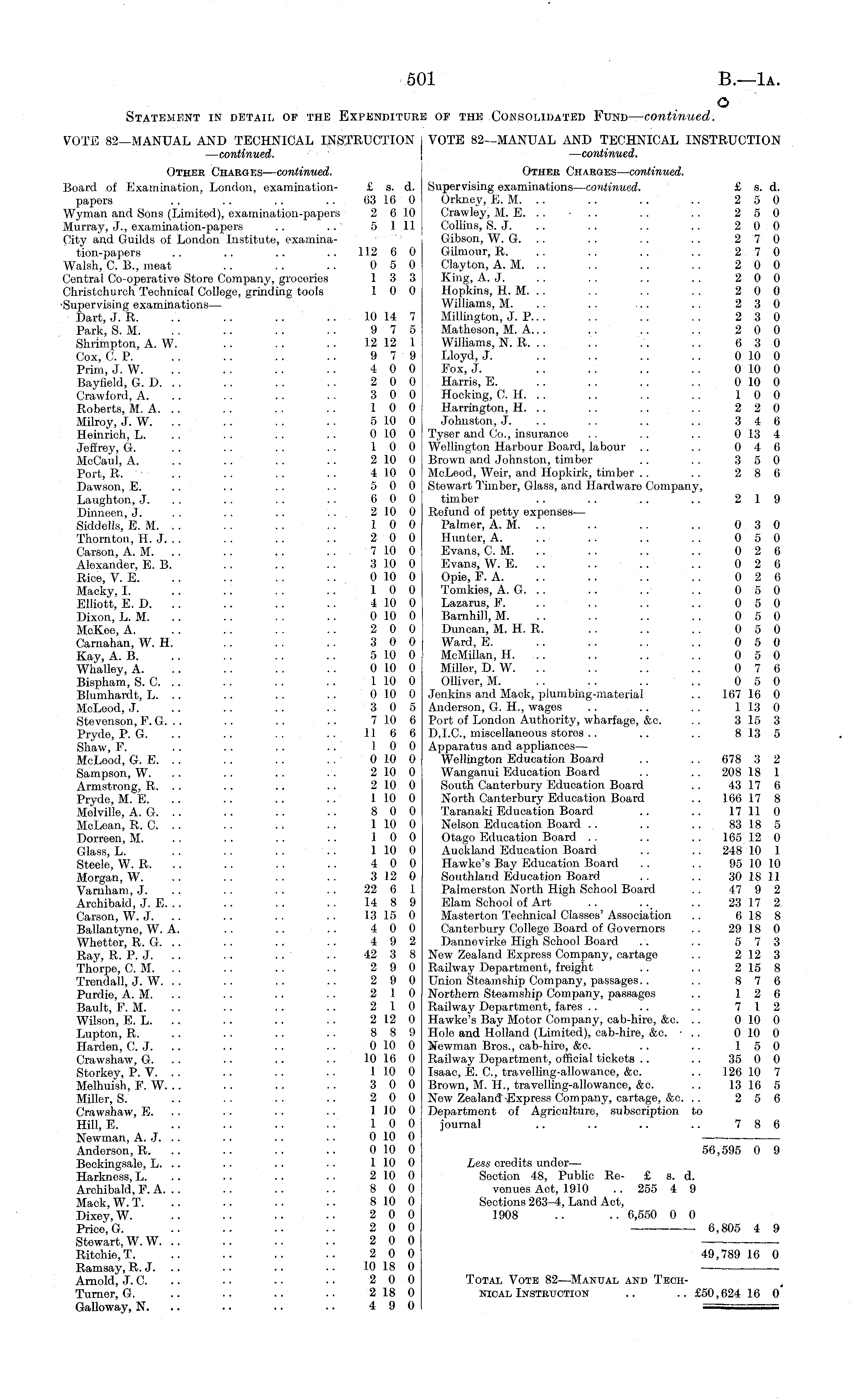 o Statement in detail op the Expenditure of the Consolidated Fund— continued. VOTE 82—MANUAL AND TECHNICAL INSTRUCTION VOTE 82—MANUAL AND TECHNICAL INSTRUCTION — continued. — continued. Other Charges— continued. Other Charges— continued. Board of Examination, London, examination- £ s. d. Supervising examinations— continued. £ s. d. papers .. .. .. .. 63 16 0 Orkney, E. M. .. .. .. .. 2 5 0 Wyman and Sons (Limited), examination-papers 2 610 Crawley, M. E. ..■ .. .. .. 2 5 0 Murray, J., examination-papers .. .. 5 111 Collins, S. J. .. .. . . .. 2 0 0 City and Guilds of London Institute, examina- Gibson, W. G. .. . . . . .. 2 7 0 tion-papers .. .. .. .. 112 6 0 Giimour, R. .. .. .. .. 2 7 0 Walsh, C. 8., meat .. .. . . 0 5 0 Clayton, A. M. . . .. .. .. 2 0 0 Central Co-operativo Store Company, groceries 13 3 King, A. J. . . . . .. .. 2 0 0 Christchurch Tochnical College, grinding tools 10 0 Hopkins, H. M. .. .. .. .. 2 0 0 ■Supervising examinations— Williams, M. .. . . ... .. 230 Dart, J. R. .. .. .. .. 10 14 7 Millington, J. P.. . . . .. .. 2 3 0 Park, S. M. .. .. . . . . 9 7 5 Matheson, M. A... .. .. .. 2 0 0 Shrimpton, A. W. .. .. .. 12 12 1 Williams, N. R. .. . . .. .. 6 3 0 Cox, C. P. .. .. .. .. 9 7 9 Lloyd, J. .. . . . . .. 010 0 Prim, J. W. .. . . .. .. 4 0 0 Fox, J. .. .. .. .. 010 0 Bayfield, G. D. .. .. .. .. 2 0 0 Harris, E. . . . . .. .. 010 0 Crawford, A. . . .. .. 3 0 0 Hocking, C. H. .. . . .. .. 10 0 Roberts, M. A. .. .. . . .. 10 0 Harrington, H. .. . . . . .. 2 2 0 Milroy, J. W. .. .. .. . . 510 0 Johnston, J. . . .. .. 3 4 6 Heinrich, L. . . . . . . .. 0 10 0 Tyser and Co., insurance . . .. .. 0 13 4 Jeffrey, G. .. .. .. .. 10 0 Wellington Harbour Board, labour .. . . 0 4 6 McCaul, A. . . .. . . .. 210 0 Brown and Johnston, timber .. . . 3 5 0 Port, R. .. .. . . .. 410 0 MoLeod, Weir, and Hopkirk, timber .. .. 2 8 6 Dawson, E. .. . . . . ■ . 5 0 0 Stewart Timber, Glass, and Hardware Company, Laughton, J. .. . . .. 6 0 0 timber .. .. .. .. 2 19 Dinneen, J. . . .. .. ... 2 10 0 Refund of petty expenses— Siddells, E. M. .. .. .. .. 10 0 Palmer, A. M. .. .. . . .. 0 3 0 Thornton, H. J. .. .. . . .. 2 0 0 Hunter, A. .. .. .. .. 0 5 0 Carson, A. M. .. .. .. ... 710 0 Evans, CM... .. .. .. 026 Alexander, E. B. . . .. .. 310 0 Evans, W. E. .. .. .. . . 0 2 6 Rice, V. E. .. . . . . .. 010 0 Opie, E. A. .. .. .. .. 0 2 6 Maeky, I. .. .. .. .. 10 0 Tomkies, A. G. .. .. .. .. 0 5 0 Elliott, E. D. .. .. .. . . 410 0 Lazarus, F. . . .. .. .. 0 5 0 Dixon, L. M. .. .. .. 010 0 Barnhill, M. .. .. .. . . 0 5 0 MoKee, A. .. .. .. . . 2 0 0 Duncan, M. H. R. . . .. .. 0 5 0 Carnahan, W. H. .. .. .. 3 0 0 Ward, E. .. .. .. .. 0 5 0 Kay, A. B. .. .. .. .. 510 0 McMillan, H. ... .. .. .. 0 5 0 Whalley, A. .. .. . . .. 010 0 Miller, D. W. .. .. .. .. 0 7 6 Bispham, S. C. .. . . .. . . 110 0 Olliver, M. .. . . . . .. 0 5 0 Blumhardt, L. .. .. . . .. 010 0 Jenkins and Mack, plumbing-material .. 167 16 0 McLeod, J. .. .. . . . . 3 0 5 Anderson, G. H., wages .. .. . . 113 0 Stevenson, F. G. .. .. .. .. 7 10 6 Port of London Authority, wharfage, &c. .. 3 15 3 Pryde, P. G. .. .. .. •• 11 6 6 D,I.C, miscellaneous stores .. .. .. 813 5 Shaw, F. .. .. .. •. 10 0 Apparatus and appliances— McLeod, G. E. .. .. .. .. 010 0 Wellington Education Board .. .. 678 3 2 Sampson, W. .. .. .. 210 0 Wanganui Education Board . . .. 208 18 1 Armstrong, R. .. .. .. .. 210 0 South Canterbury Education Board .. 43 17 6 Pryde, M. E. .. .. .. . . 110 0 North Canterbury Education Board .. 166 17 8 Melville, A. G. .. .. .. .. 8 0 0 Taranaki Education Board .. .. 17 11 0 McLean, R. C. .. . . .. .. 1 10 0 Nelson Education Board . . .. ... 83 18 5 Dorreen, M. .. . . .. .. 10 0 Otago Education Board . . .. .. 165 12 0 Glass, L. .. .. . . .. 1 10 0 Auckland Education Board .. . . 248 10 1 Steele, W. R. .. .. .. .. 4 0 0 Hawke's Bay Education Board .. .. 95 10 10 Morgan, W. .. .. .. .. 312 0 Southland Education Board .. .. 30 18 11 Varnham, J. .. . . .. .. 22 6 1 Palmerston North High School Board .. 47 9 2 Archibald, J. E. .. .. .. .. 14 8 9 Elam School of Art .. .. .. 23 17 2. Carson, W. J. • • • ■ ■ ■ 13 15 0 Masterton Technical Classes' Association . . 618 8 Ballantyno, W. A. .. .. . . 4 0 0 Canterbury College Board of Governors .. 29 18 0 Whettor, R. G. .. .. .. .. 4 9 2 Dannevirke High School Board .. . . 5 7 3 Ray, R. P. J. . . .. .. . . 42 3 8 New Zealand Express Company, cartage .. 212 3 Thorpe, CM... . . .. .. 290 Railway Department, freight .. .. 215 8 Trendall, J. W. .. .. .. .. 2 9 0 Union Steamship Company, passages.. .. 8 7 6 Purdie, A. M. .. .. .. .. 2 10 Northern Steamship Company, passages .. 12 6 Bault, F. M. • • .. ■ ■ • ■ 2 10 Railway Department, fares .. .. .. 7 12 Wilson, E. L. .. .. .. .. 212 0 Hawke's Bay Motor Company, cab-hire, &c. . . 010 0 Lupton, R. .. . . .. .. 8 8 9 Hole and Holland (Limited), cab-hire, &c. ■ . . 010 0 Harden, C. J. .. .. .. .. 010 0 Newman Bros., cab-hire, &c. .. .. 15 0 Crawshaw, G. . . .. .. • • 10 16 0 Railway Department, official tickets .. .. 35 0 0 Storkey, P. V. .. .. . . • • 1 10 0 Isaac, E. C, travelling-allowance, &c. .. 126 10 7 Melhuish, F. W. .. .. .. .. 3 0 0 Brown, M. H., travelling-allowance, &c. .. 13 16 5 Miller, S. .. . • •. • • 2 0 0 New Zealand Express Company, cartage, &c. .. 2 5 6 Crawshaw, E. .. .. .. .. 1 10 0 Department of Agriculture, subscription to Hill, E. .. .. • ■ • • 10 0 journal .. .. .. .. 7 8 6 Newman, A. J. . . .. .. .. 0 10 0 — Anderson, R. .. .. .. .. 010 0 56,595 0 9 Beckingsale, L. .. .. .. .. 1 10 0 Less credits under— Harknoss, L. .. .. .. 210 0 Section 48, Public Re- £ s. d. Archibald, F. A. . . .. .. .. 8 0 0 venues Act, 1910 .. 255 4 9 Mack, W. T. .. .. • • • • 810 0 Sections 263-4, Land Act, Dixey,W. .. .. .. •• 2 0 0 1908 .. .. 6,550 0 0 Price, G. .. -. •• ■■ 2 0 0 — 6,805 4 9 Stewart, W. W. .. .. .. .. 2 0 0 Ritchie, T. .. .