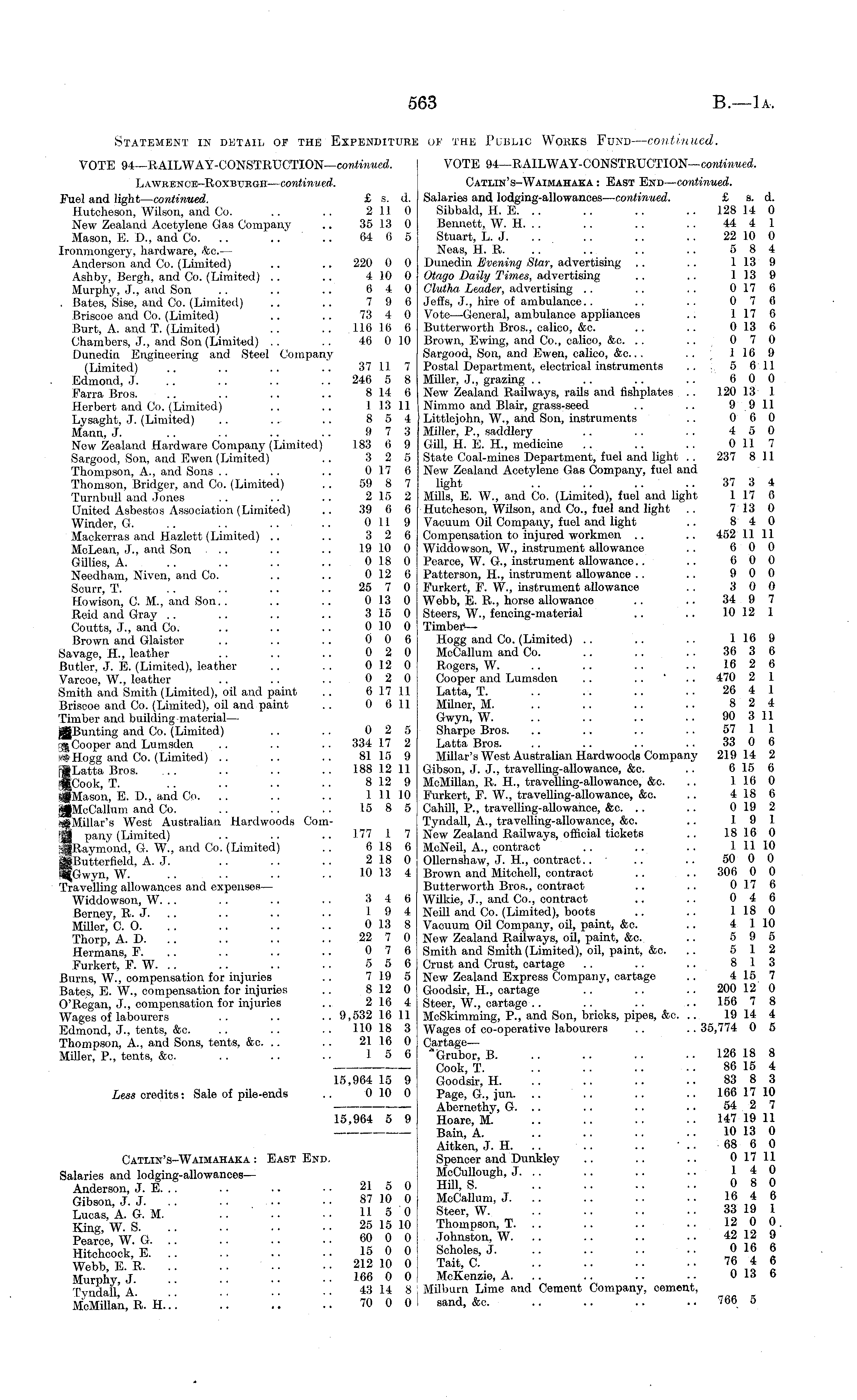 Statement in detail of the Expenditure of the Public Works Fund — continued. VOTE 94—RAILWAY-CONSTRUCTION— continued. VOTE 94—RAILWAY-CONSTRUCTION— continued, Lawrence-Roxbukgh— continued. Catun's-Waimahaka : East End— continued. Fuel and light— continued. £ s. d. Salaries and lodging-allowances— continued. £ s. d. Hutcheson, Wilson, and Co. .. .. 2 11 0 Sibbald, H. E. .. .. .. 128 14 0 New Zealand Acetylene Gas Company .. 35 13 0 Bennett,. W. H. . . .. .. .. 44 4 1 Mason, E. D., and Co. .. .. 64 0 5 Stuart, L. J. .. .. .. .. 22 10 0 Ironmongery, hardware, &c.— Neas, H. R. .. .. .. .. 5 8 4 Anderson and Co. (Limited) .. .. 220 0 0 Dunedin Evening Star, advertising .. .. 113 9 Ashby, Bergh, and Co. (Limited) .. .. 4 10 0 Otago Daily Times, advertising .. .. 1 13 9 Murphy, J., and Son .. .. .. 6 4 0 Cluiha Leader, advertising .. .. .. 0 17 6 . Bates, Sise, and Co. (Limited) .. .. 7 9 6 Jeffs, J., hire of ambulance.. .. .. 0 7 6 Brisooe and Co. (Limited) .. .. 73 4 0 Vote—General, ambulance appliances .. 117 6 Burt, A. and T. (Limited) .. .. 116 16 6 Butterworth Bros., calico, &c. .. .. 013 6 Chambers, J., and Son (Limited) .. .. 46 010 Brown, Ewing, and Co., calico, &c. .. .. 0 7 0 Dunedin Engineering and Steel Company Sargood, Son, and Ewen, calico, &c... .. ; 1 16 9 (Limited) .. .. .. .. 37 11 7 Postal Department, electrical instruments .. : 5 611 Edmond, J. .. .. .. 246 5 8 Miller, J., grazing .. .. .. .. 6 0 0 Farra Bros. .. .. .. .. 814 6 New Zealand Railways, rails and fishplates . . 120 13 1 Herbert and Co. (Limited) .. .. 1 13 11 Nimmo and Blair, grass-seed .. .. 9 9 11 Lysaght, J. (Limited) .. .. .. 8 5 4 Littlejohn, W., and Son, instruments .. 0 6 0 Mann, J. .. .. .. .. 9 7 3 Miller, P., saddlery .. .. .. 4 5 0 New Zealand Hardware Company (Limited) 183 6 9 Gill, H. E. H., medicine .. .. .. 011 7 Sargood, Son, and Ewen (Limited) .. 3 2 5 State Coal-mines Department, fuel and light .. 237 811 Thompson, A., and Sons .. .. .. 0 17 6 New Zealand Acetylene Gas Company, fuel and Thomson, Bridger, and Co. (Limited) .. 59 8 7 light .. .. .. .. 37 3 4 Turnbull and Jones .. .. .. 215 2 Mills, E. W., and Co. (Limited), fuel and light 117 6 United Asbestos Association (Limited) .. 39 6 6 Hutcheson, Wilson, and Co., fuel and light .. 713 0 Winder, G. . . .. .. .. 0 119 Vacuum Oil Company, fuel and light .. 8 4 0 Mackerras and Hazlett (Limited) .. .. 3 2 6 Compensation to injured workmen .. .. 452 11 11 McLean, J., and Son .. .. .. 19 10 0 Widdowson, W., instrument allowance . . 6 0 0 Gillies, A. .. .. .. .. 0180 Pearce, W. G., instrument allowance.. .. 6 0 0 Needham, Niven, and Co. .. .. 012 6 Patterson, H., instrument allowance .. .. 9 0 0 Scurr, T. .. .. .. .. 25 7 0 Furkert, F. W., instrument allowance ~ 3 0 0 Howison, C. M., and Son.. .. .. 0 13 0 Webb, E. R., horse allowance .. .. 34 9 7 Reid and Gray .. .. .. .. 315 0 Steers, W., fencing-material .. .. 10 12 1 Coutts, J., and Co. .. .. .. 010 0 TimbersBrown and Glaister .. .. .. 0 0 6 Hogg and Co. (Limited) .. .. .. 116 9 Savage, H., leather .. .. .. 0 2 0 McCallum and Co. .. .. .. 36 3 6 Butler, J. E. (Limited), leather .. .. 012 0 Rogers, W. .. .. .. .. 16 2 6 Varcoe, W., leather .. .. .. 0 2 0 Cooper and Lumsden .. .. ' .. 470 2 1 Smith and Smith (Limited), oil and paint .. 617 11 Latta, T. .. .. .. .. 26 4 1 Briscoe and Co. (Limited), oil and paint .. 0 611 Milner, M. .. .. .. .. 8 2 4 Timber and building material — Gwyn, W. .. .. .. .. 90 3 11 and Co. (Limited) .. .. 0 2 5 Sharpe Bros. .. .. .. .. 57 1 1 3j Cooper and Lumsden .. .. .. 334 17 2 Latta Bros. .. .. .. .. 33 0 6 ■**Hogg and Co. (Limited) .. .. .. 81 15 9 Millar's West Australian Hardwoods Company 219 14 2 [BLatta Bros. ... .. .. .. 188 12 11 Gibson, J. J., travelling-allowance, &c. .. 615 6 JjCook, T. .. .. .. .. 812 9 McMillan, R. H., travelling-allowance, &c. .. 116 0 (JSMason, E. D., and Co. . . .. .. 111 10 Furkert, F. W., travelling-allowance, &c. .. 418 6 §|McCalliim and Co. . . .. .. 15 8 5 Cahill, P., travelling-allowance, &c. .. .. 019 2 West Australian Hardwoods Com- Tyndall, A., travelling-allowance, &c. .. 19 1 >ij pany (Limited) .. .. .. 177 1 7 New Zealand Railways, official tickets .. 18 16 0 ■Raymond, G. W., and Co. (Limited) .. 6 18 6 McNeil, A., contract .. .. .. 1 11 10 jjffiutterfield, A. J. .. .. .. 218 0 Ollernshaw, J. H., contract.. .. .. 50 0 0 S|Gwyn, W. .. .. • ■ • • 10 13 4 Brown and Mitchell, contract .. .. 306 0 0 Travelling allowances and expenses — Butterworth Bros., contract .. .. 017 6 Widdowson, W. .. .. .. .. 3 4 6 Wilkie, J., and Co., contract .. .. 0 4 6 Berney, R. J. .. .. .. . ■ 19 4 Neill and Co. (Limited), boots .. .. 118 0 Miller, CO. . . .. .. .. 013 8 Vacuum Oil Company, oil, paint, &c. .. 4 110 Thorp, A. D. .. .. .. .. 22 7 0 New Zealand Railways, oil, paint, &c. .. 5 9 5 Hermans, F. .. . . .. .. 0 7 6 Smith and Smith (Limited), oil, paint, &c. .. 5 12 Furkert, F. W. . . .. .. .. 5 5 6 Crust and Crust, cartage .. .. .. 8 13 Burns, W., compensation for injuries .. 7 19 5 New Zealand Express Company, cartage .. 4 15 7 Bates, E. W., compensation for injuries .. 812 0 Goodsir, H., cartage .. .. .. 200 12 0 O'Regan, J., compensation for injuries .. 216 4 Steer, W., cartage .. .. .. .. 156 7 8 Wages of labourers .. .. .. 9,532 16 11 McSkimming, P., and Son, bricks, pipes, &c. .. 19 14 4 Edmond, J., tents, &c. .. .. .. HO 18 3 Wages of co-operative labourers .. .. 35,774 0 5 Thompson, A., and Sons, tents, &c. .. .. 21 16 0 Cartage— Miller, P., tents, &c. .. .. .. 15 6 "Grubor, B. .. .. .. 126 18 8 Cook, T. .. .. ■. •• 86 15 4 15,964 15 9 Goodsir, H. .. .. .. .. 83 8 3 Less credits: Sale of pile-ends .. 010 0 Page, G., jun. .. .. .. .. 1661710 Abernethy, G. .. .. .. .. 54 2 7 15,964 5 9 Hoare, M. .. .. .. ..147 19 11 Bain, A. 10 13 0 Aitken, J. H. .. .. .. .. 68 6 0 Catlin's-Waimahaka : East End. Spencer and Dunkley .. .. .. 017 11 Salaries and lodging-allowances— McCullough, J. ..