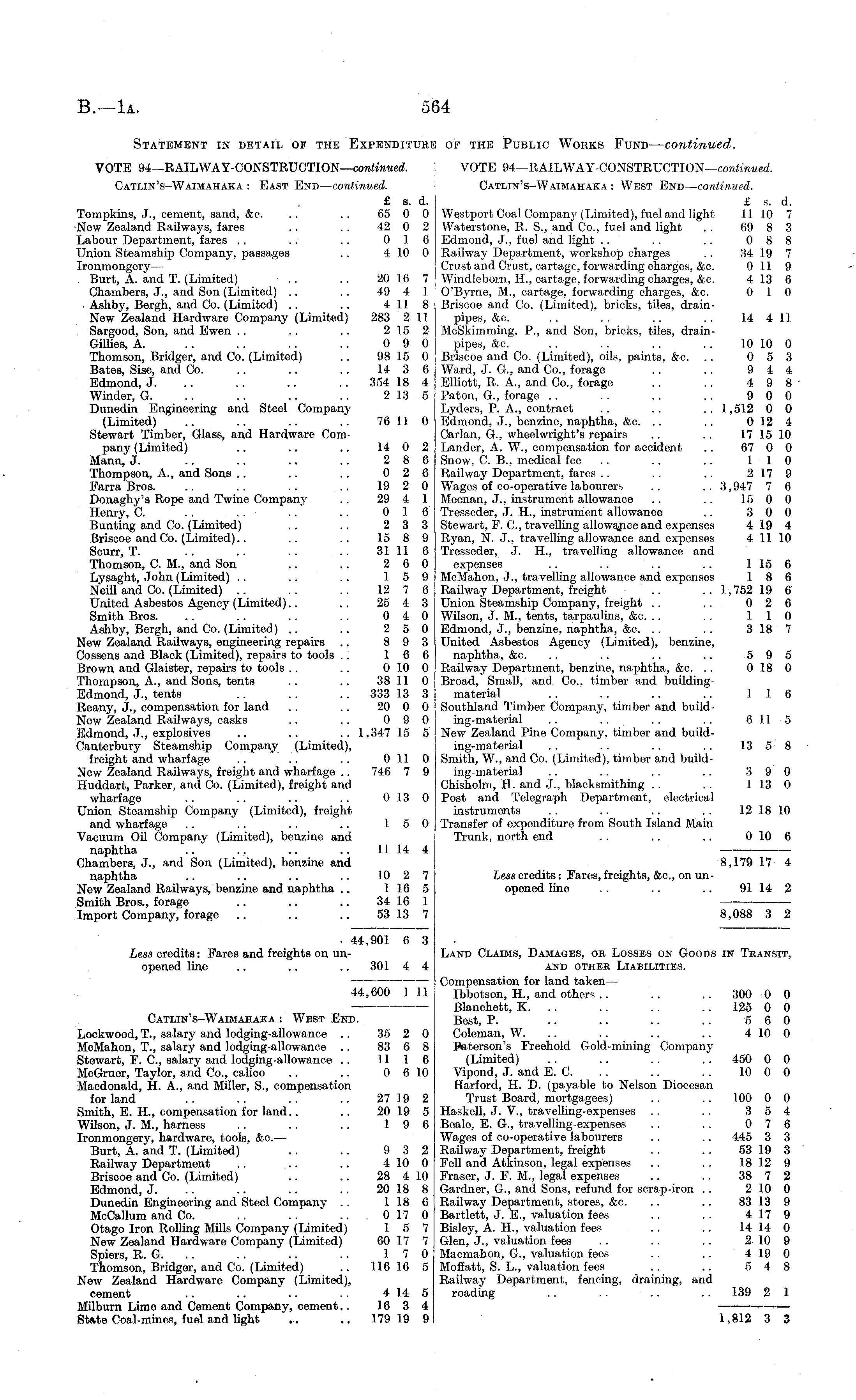 Statement in detail of the Expenditure of the Public Works Fund— continued. VOTE 94—RAILWAY-CONSTRUCTION— continued. j VOTE 94—RAILWAY-CONSTRUCTION— continued. Catlin's-Waimahaka : East End— continued. Catlin's-Waimahaka : West End— continued. £ s. d. £ s. d. Tompkins, J., cement, sand, &c. .. .. 65 0 0 Westport Coal Company (Limited), fuel and light 11 10 7 New Zealand Railways, fares .. .. 42 0 2 Waterstone, R. S., and Co., fuel and light . . 69 8 3 Labour Department, fares .. .. .. 0 16 Edmond, J., fuel and light .. .. . . 0 8 8 Union Steamship Company, passages .. 410 0 Railway Department, workshop charges .. 34 19 7 Ironmongery— Crust and Crust, cartage, forwarding charges, &c. 0 11 9 Burt, A. and T. (Limited) .. .. 20 16 7 Windleborn, H., cartage, forwarding charges, &c. 4 13 6 Chambers, J., and Son (Limited) .. .. 49 4 1 O'Byrne, M., cartage, forwarding charges, &c. 0 10 • Ashby, Bergh, and Co. (Limited) .. .. 4 118 Briscoe and Co. (Limited), bricks, tiles, drainNew Zealand Hardware Company (Limited) 283 211 pipes, &c. .. .. .. .. 14 411 Sargood, Son, and Ewen .. . . .. 2 15 2 McSkimming, P., and Son, bricks, tiles, drainGillies, A. .. .. .. .. 0 9 0 pipes, &c. . . .. .. .. 10 10 0 Thomson, Bridger, and Co. (Limited) .. 98 15 0 Briscoe and Co. (Limited), oils, paints, &c. .. 0 5 3 Bates, Sise, and Co. .. .. .. 14 3 6 Ward, J. G., and Co., forage . . .. 9 4 4 Edmond, J. .. .. .. 354 18 4 Elliott, R. A., and Co., forage .. .. 4 9 8 Winder, G. .. .. .. . . 213 5 Paton, G., forage .. .. .. .. 9 0 0 Dunedin Engineering and Steel Company Lyders, P. A., contract .. .. .. 1,512 0 0 (Limited) .. .. .. .. 76 11 0 Edmond, J., benzine, naphtha, &c. .. .. 0 12 4 Stewart Timber, Glass, and Hardware Com- Carlan, G., wheelwright's repairs .. . . 17 15 10 pany (Limited) .. .. .. 14 0 2 Lander, A. W., compensation for accident .. 67 0 0 Mann, J. .. .. .. .. 2 8 6 Snow, C. 8., medical fee .. .. .. 110 Thompson, A., and Sons .. .. .. 0 2 6 Railway Department, fares .. . . .. 2 17 9 Farra Bros. .. .. .. .. 19 2 0 Wages of co-operative labourers .. .. 3,947 7 6 Donaghy's Rope and Twine Company .. 29 4 1 Meenan, J., instrument allowance .. . . 15 0 0 Henry, C. .. .. .. .. 0 16 Tresseder, J. H., instrument allowance .. 3 0 0 Bunting and Co. (Limited) .. .. 2 3 3 Stewart, F. C, travelling allowance and expenses 419 4 Briscoe and Co. (Limited).. .. .. 15 8 9 Ryan, N. J., travelling allowance and expenses 4 11 10 Scurr, T. .. .. .. .. 31116 Tresseder, J. H., travelling allowance and Thomson, C. M., and Son .. .. 2 6 0 expenses .. .. .. .. 115 6 Lysaght, John (Limited) .. .. .. 15 9 McMahon, J., travelling allowance and expenses 18 6 Neill and Co. (Limited) .. .. .. 12 7 6 Railway Department, freight .. ..1,752 19 6 United Asbestos Agency (Limited).. .. 25 4 3 Union Steamship Company, freight .. .. 0 2 6 Smith Bros. .. .. .. .. 0 4 0 Wilson, J. M., tents, tarpaulins, &o. . . .. 110 Ashby, Bergh, and Co. (Limited) .. .. 2 5 0 Edmond, J., benzine, naphtha, &c. .. .. 3 18 7 New Zealand Railways, engineering repairs .. 8 9 3 United Asbestos Agency (Limited), benzine, Cossens and Black (Limited), repairs to tools .. 16 6 naphtha, &c. .. .. . . .. 5 9 5 Brown and Glaister, repairs to tools . . .. 0 10 0 Railway Department, benzine, naphtha, &c. . . 0 18 0 Thompson, A., and Sons, tents . . .. 38 11 0 Broad, Small, and Co., timber and buildingEdmond, J., tents .. .. .. 333 13 3 material .. .. .. . . 116 Reany, J., compensation for land .. .. 20 0 0 Southland Timber Company, timber and buildNew Zealand Railways, casks .. .. 0 9 0 ing-material .. . . .. .. 6 115 Edmond, J., explosives .. .. .. 1,347 15 5 New Zealand Pine Company, timber and buildCanterbury Steamship Company (Limited), ing-material .. .. .. .. 13 5 8 freight and wharfage .. .. .. 0 11 0 Smith, W., and Co. (Limited), timber and buildNew Zealand Railways, freight and wharfage .. 746 7 9 ing-material .. .. .. .. 3 9 0 Huddart, Parker, and Co. (Limited), freight and Chisholm, H. and J., blacksmithing .. . . 1 13 0 wharfage .. .. .. .. 0130 Post and Telegraph Department, electrical Union Steamship Company (Limited), freight instruments .. .. .. .. 12 18 10 and wharfage .. .. . . .. 15 0 Transfer of expenditure from South Island Main Vacuum Oil Company (Limited), benzine and Trunk, north end .. .. .. 010 6 naphtha .. ~ .. .. 11 14 4 —■ Chambers, J., and Son (Limited), benzine and 8,179 17 4 naphtha .. .. .. .. 10 2 7 Less credits: Fares, freights, &c, on unNew Zealand Railways, benzine and naphtha .. 116 5 opened line . . .. .. 91 14 2 Smith Bros., forage .. .. .. 34 16 1 Import Company, forage .. .. .. 53 13 7 8,088 3 2 44,901 6 3 Less credits: Fares and freights on un- Land Claims, Damages, or Losses on Goods in Transit, opened line .. .. .. 301 4 4 and other Liabilities. Compensation for land taken— 44,600 111 Ibbotson, H., and others .. .. .. 300 0 0 Blanchett, K. .. .. .. 125 0 0 Catlin's-Waimahaka : West End. Best, P. .. .. .. .. 5 6 0 Lockwood, T., salary and lodging-allowance .. 35 2 0 Coleman, W. .. .. .. .. 410 0 McMahon, T., salary and lodging-allowance .. 83 6 8 Baterson's Freehold Gold-mining Company Stewart, F. C, salary and lodging-allowance .. 1116 (Limited) .. .. .. .. 450 0 0 McGruer, Taylor, and Co., calico .. .. 0 610 Vipond, J. and E. C. . . .. .. 10 0 0 Macdonald, H. A., and Miller, S., compensation Harford, H. D. (payable to Nelson Diocesan for land .. .. .. .. 27 19 2 Trust Board, mortgagees) .. .. 100 0 0 Smith, E. H., compensation for land.. .. 20 19 5 Haskell, J. V., travelling-expenses .. .. 3 5 4 Wilson, J. M., harness .. .. .. 19 6 Beale, E. G., travelling-expenses .. .. 0 7 6 Ironmongery, hardware, tools, &c.— Wages of co-operative labourers .. .. 445 3 3 Burt, A. and T. (Limited) .. .. 9 3 2 Railway Department, freight . . .. 53 19 3 Railway Department .. .. .. 410 0 Fell and Atkinson, legal expenses .. .. 18 12 9 Briscoe and Co. (Limited) .. .. 28 410 Fraser, J. F. M., legal expenses .. . . 38 7 2 