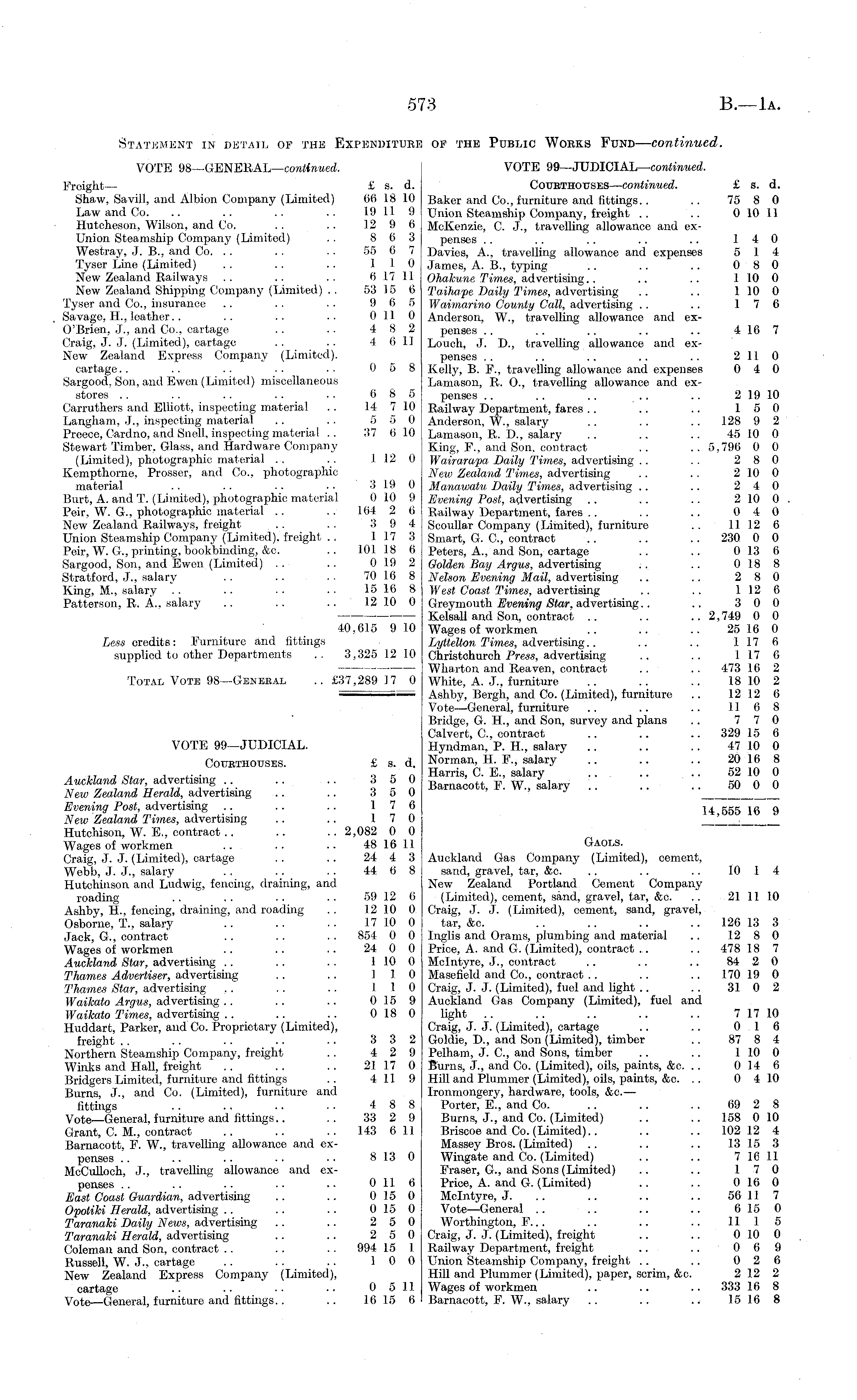 Statement in detail of the Expenditure of the Public Works Fund — continued. VOTE 98—GENERAL— continued,. VOTE 99—JUDICIAL— continued. Freight— £ s. d. Courthouses— continued. £ s. d. Shaw, Savill, and Albion Company (Limited) ()6 18 10 Baker and Co., furniture and fittings.. .. 75 8 0 Law and Co. .. .. .. .. 19 11 9 Union Steamship Company, freight .. .. 010 11 Hutcheson, Wilson, and Co. . . .. 12 9 6 McKenzie, C. J., travelling allowance and exUnion Steamship Company (Limited) . . 8 0 3 penses .. .. .. .. .. 140 Westray, J. J}., and Co. . . .. .. 55 (i 7 Davies, A., travelling allowance and expenses 5 1 4 Tyser Line (Limited) .. .. .. 110 James, A. 8., typing .. .. .. 0 8 0 New Zealand Railways .. . . . . 617 11 Ohakune Times, advertising.. .. .. 110 0 New Zealand Shipping Company (Limited) .. 53 15 6 Taihape Daily Times, advertising .. .. 110 0 Tyser and Co., insurance .. .. . . 9 6 5 Waimarino County Call, advertising . . .. 17 6 Savage, H., leather. . .. .. .. 011 0 Anderson, W., travelling allowance and exO'Brien.. J., and Co., cartage .. . . 4 8 2 penses .. .. .. .. .. 416 7 Craig, J. J. (Limited), cartage .. .. 4 6 1] Louch, J. IX, travelling allowance and exNew Zealand Express Company (Limited), penses .. .. .. .. .. 2110 cartage.. .. .. .. •• 058 Kelly, B. F., travelling allowance and expenses 0 4 0 Sargood, Son, and Ewen (Limited) miscellaneous Lamason, R. 0., travelling allowance and exstores . . . . .. . . .. 6 8 5 penses .. .. .. .. .. 219 10 Carruthers and Elliott, inspecting material .. 14 710 Railway Department, fares .. .. .. 15 0 Langham, J., inspecting material .. . . 5 5 0 Anderson, W., salary .. .. .. 128 9 2 Preece, Cardno, and Snell, inspecting material .. 37 610 Lamason, R. D., salary .. .. .. 45 10 0 Stewart Timber, Glass, and Hardware Company King, F., and Son, contract .. .. 5,796 0 0 (Limited), photographic material .. .. I 12 0 Wairarapa Daily Times, advertising .. .. 2 8 0 Kempthorne, Prosser, and Co., photographic New Zealand Times, advertising .. . . 2 10 0 material . . .. ■ • •. 3 19 0 Manawatu Daily Times, advertising .. .. 2 4 0 Burt, A. and T. (Limited), photographic material 010 9 Evening Post, advertising .. .. .. 2 10 0 Peir, W. G., photographic material .. .. 164 2 6 Railway Department, fares .. .. .. 0 4 0 New Zealand Railways, freight .. .. 3 9 4 Scoullar Company (Limited), furniture .. 11 12 6 Union Steamship Company (Limited), freight .. 117 3 Smart, G. C, contract .. .. .. 230 0 0 Peir, W. G., printing, bookbinding, &c. .. 101 18 6 Peters, A., and Son, cartage .. .. 013 6 Sargood, Son, and Ewen (Limited) . . .. 019 2 Golden Bay Argus, advertising . . .. 0 18 8 Stratford, J., salary .. . ■ ■ ■ 70 16 8 Nelson Evening Mail, advertising .. .. 2 8 0 King, M., salary . . .. .. .. 15 16 8 West Coast Times, advertising .. .. 112 6 Patterson, R. A., salary .. .. .. 12 10 0 Greymouth Evening Star, advertising.. .. 3 0 0 Kelsall and Son, contract .. .. .. 2,749 0 0 40,615 9 10 Wages of workmen .. .. .. 25 16 0 Less credits: Furniture and fittings Lyttelton Times, advertising.. .. .. 1 17 6 supplied to other Departments .. 3,325 12 10 Christchurch Press, advertising .. .. il7 6 Wharton and Reaven, contract .. .. 473 16 2 Total Vote 98—General .. £37,289 17 0 White, A. J., furniture .. .. .. 18 10 2 ~~ Ashby, Bergh, and Co. (Limited), furniture .. 12 12 6 Vote—General, furniture .. .. .. 116 8 Bridge, G. H., and Son, survey and plans .. 7 7 0 Calvert, C, contract .. .. .. 329 15 6 VOTE 99—JUDICIAL. Hyndman, P. H., salary .. .. .. 47 10 0 Courthouses. £ s. d Norman, H. F., salary .. .. .. 20 16 8 . ~,„,,,.. ~ m Harris, C. E., salary .. .. .. 52 10 0 Auckland.Star, advertising . .. .. 35 0 Barna^ott F . w s J alary ; 50 0 0 New Zealand Herald, advertising .. ..350 J Evening Post, advertising ...... 1 7 6 14 gg g jg g New Zealand Times, advertising .. .. 17 0 '_ Hutchison, W. E., contract .. .. .. 2,082 0 0 Wages of workmen .. .. .. 48 16 11 Gaols. Craig, J. J. (Limited), cartage .. .. 24 4 3 Auckland Gas Company (Limited), cement, Webb, J. J., salary .. . . . . 44 6 8 sand, gravel, tar, &c. .. .. .. 10 1 4 Hutchinson and Ludwig, fencing, draining, and New Zealand Portland Cement Company reading .. .. ■• •• 59 12 6 (Limited), cement, sand, gravel, tar, &c. .. 21 11 10 Ashby, H., fencing, draining, and roading .. 12 10 0 Craig, J. J. (Limited), cement, sand, gravel, Osborne, T., salary .. .. .. 17 10 0 tar, &o. .. .. .. 126 13 3 Jack, G., contract .. .. .. 854 0 0 Inglis and Orams, plumbing and material .. 12 8 0 Wages of workmen .. .. .. 24 0 0 Price, A. and G. (Limited), contract .. .. 478 18 7 Auckland Star, advertising .. .. .. 1 10 0 Melntyre, J., contract .. .. .. 84 2 0 Thames Advertiser, advertising .. .. 110 Masefield and Co., contract .. .. .. 170 19 0 Thames Star, advertising . . .. . . 110 Craig, J. J. (Limited), fuel and light .. .. 31 0 2 Waikato Argus, advertising .. .. .. 0 15 9 Auckland Gas Company (Limited), fuel and Waikato Times, advertising .. .. .. 018 0 light .. .. .. .. .. 717 10 Huddart, Parker, and Co. Proprietary (Limited), Craig, J. J. (Limited), cartage .. .. 0 16 freight .. . . . . . . .. 3 3 2 Goldie, D., and Son (Limited), timber .. 87 8 4 Northern Steamship Company, freight .. 4 2 9 Pelham, J. C, and Sons, timber .. .. 110 0 Winks and Hall, freight .. .. .. 21 17 0 Burns, J., and Co. (Limited), oils, paints, &c. .. 014 fi Bridgers Limited, furniture and fittings .. 4 11 9 Hill and Plummer (Limited), oils, paints, &c. .. 0 4 10 Burns, J., and Co. (Limited), furniture and Ironmongery, hardware, tools, &c.— fittings .. .. .. .. 4 8 8 Porter, E., and Co. .. .. .. 69 2 8 Vote—General, furniture and fittings.. .. 33 2 9 Burns, J., and Co. (Limited) .. .. 158 010 Grant, C. M., contract .. .. .. 143 611 Briscoe and Co. (Limited).. .. .. 102 12 4 Barnacott, F. W., travelling allowance and ex- Massey Bros. (Limited) .. .. .. 13 15 3 penses.. .. .. .. .. 813 0 Wingate and Co. (Limited