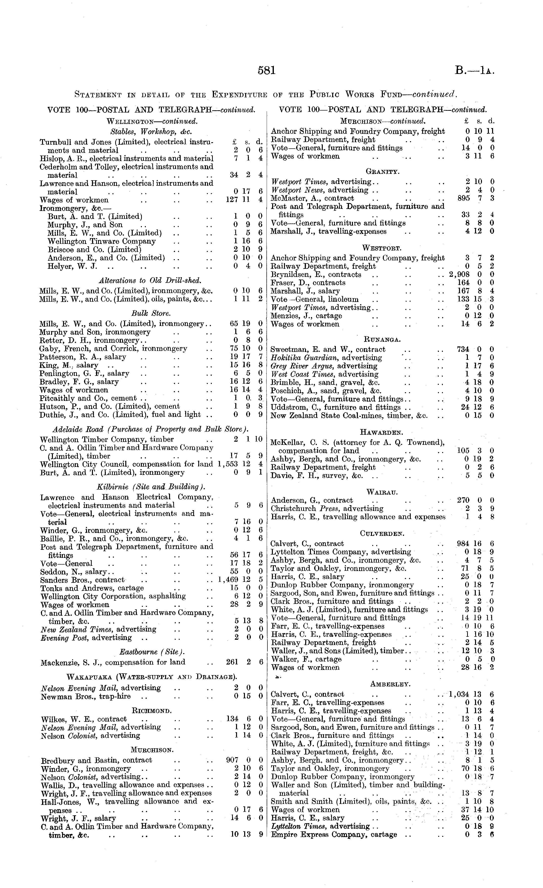 Statement in detail of the Expenditure of the Public Works Fund— continued, VOTE 100—POSTAL AND TELEGRAPH— continued. VOTE 100—POSTAL AND TELEGRAPH— continued. Wellington— continued. Mubohison— continued. £ s. d. Stables, Workshop, &c. Anchor Shipping and Foundry Company, freight 0 10 11 Turnbull and Jones (Limited), electrical instru- ts.d. | Railway Department, freight .. .. 09 4 ments and material .. .. .. 2 0 6 1 Vote—General, furniture and fittings .. 14 0 0 Hislop, A. H., electrical instruments and material 71 4 j Wages of workmen .. .. .. 311 6 Cederholm and Tolley, electrical instruments and „ material . 34 2 4 Granity. Lawrence and Hanson, electrical instruments and Westport Times, advertising.. .. .. 2 10 0 material .. .. .. .. 0176 Westport News, advertising .. .. .. 2 4 0 Wages of workmen .. .. .. 127 11 4 McMaster, A., contract .. .. .. 895 7 3 Ironmongery, &c. ' Post and Telegraph Department, furniture and Burt, A. and T. (Limited) .. .. 10 0 fittings .. .. .. .. 33 2 4 Murphy, J., and Son .. .. .. 0 9 6 Vote—General, furniture and fittings .. 8 8 0 Mills, E. W., and Co. (Limited) .. .. 15 6 Marshall, J., travelling-expenses .. .. 412 0 Wellington Tinware Company .. .. 116 6 Briscoe and Co. (Limited) .. .. 210 9 Westport. Anderson, E., and Co. (Limited) .. .. 0 10 0 Anchor Shipping and Foundry Company, freight 3 7 2 Helyer, W. J. .. .. .. .. 0 4 0 Railway Department, freight . . .. 0 5 2 Brynildsen, E., contracts .. .. .. 2,908 0 0 Alterations to Old Dnll-shed. Fraser, D., contracts .. .. .. 164 0 0 Mills, E. W., and Co. (Limited), ironmongery, &c. 010 6 Marshall, J., salary .. .. .. 167 8 4 Mills, E.W., and Co. (Limited), oils, paints, &0... 11l 2 Vote-General, linoleum .. .. .. 133 15 3 Westport Times, advertising.. .. .. 2 0 0 Bulk Store. Menzies, J., cartage .. .. .. 012 0 Mills, E. W., and Co. (Limited), ironmongery.. 65 19 0 Wages of workmen .. .. .. 14 6 2 Murphy and Son, ironmongery .. .. 16 6 Retter, D. H., ironmongery.. .. .. 0 8 0 Rfnanga. Gaby, French, and Corrick, ironmongery .. 75 10 0 Sweetman, E. and W., contract .. .. 734 0 0 Patterson, R. A., salary .. .. .. 19 17 7 Hokitika Guardian, advertising '.. .. 17 0 King, M.. salary .. .. .. .. 15 16 8 Grey Eiver Argus, advertising .. .. 117 6 Penlington, G. F., salary .. .. .. 6 5 0 West Coast Times, advertising .. .. 14 9 Bradley, F. G., salary .. .. .. 16 12 6 Brimble, H., sand, gravel, &c. .. .. 418 0 Wages of workmen .. .. .. 16 14 4 Poschich, A., sand, gravel, &c. .. . . 410 0 Pitcaithly and Co., cement .. .. .. 10 3 Vote—Genera], furniture and fittings.. .. 9 18 9 Hutson, P., and Co. (Limited), cement .. 19 8 Uddstrom, C, furniture and fittings .. .. 24 12 6 Duthie, J., and Co. (Limited), fuel and light .. 0 0 9 New Zealand State Coal-mines, timber, &c. .. 0 15 0 Adelaide Road (Purcha.se of Property and Bulk Store). Hawarden Wellington Timber Company timber .. 2 1 10 McKellar, C. S. (attorney for A. Q. Townend), C. and A. Odhn Timber and Hardware Company compensation for land .. .. .. 105 3 0 ,Jn™'! 'm n -i " *•'• * i a Ashby, Bergh, and Co., ironmongery, &c. .. 019 2 Wellington City Council compensation for land 1,553 12 4 Department, freight • .. .. 0 2 6 Burt, A. and T. (Limited), ironmongery . . 0 9 1 Daviej Fj£ surveY; &0 . . . .. .. 55 0 Kilbirnie (Site and Building). i tt -i-ii i • i n Waikau. Lawrence and Hanson Electrical Company, Anderson, G., contract 270 0 0 electrical instruments and material .. 59 6 christchurch Press, advertising .. .. 23 9 Vote-General, electrical instruments and ma- Harris. C. E., travelling allowance and expenses 14 8 tenal .. .. .. .. 7 16 0 Winder, G., ironmongery, &c. . .. 0 12 6 Culverden. Bailhe, P. R., and Co., ironmongery, &c. .. 4 1 6 Post and Telegraph Department, furniture and ? al ™S' C ->? ont ™ ot • ■ •"; 98 * £ fittings 56 17 6 Lyttelton Times Company, advertising .. 0 18 9 Vote—General " '.'. " " 17 18 2 Ashby, Bergh, and Co., ironmongery, &o. .. 47 5 Seddon, N., salary.. 55 0 0 Taylor and Oakley, ironmongery, &c. .. 71 8 5 Sanders Bros., contract 1,469 12 5 Hams, C. E salary 25 0 0 Tonks and Andrews, cartage .. .. 15 0 0 Dunlop Rubber Company, ironmongery .. 018 7 Wellington City Corporation, asphalting .. 612 0 Sargood, Son, and Ewen, furniture and fittings .. 011 Wastes of workmen 28 2 9 clark Bros -> furniture and fittings .. .. 2 2 0 C. and A. Odlin Timber and Hardware Company, White, A. J. (Limited), furniture and fittings .. 3 19 0 timber &c 5 13 8 »°* e —General, iurniture and fittings .. 14 19 II New Zealand Times' advertising .".' '.'. 20 0 Farr, EC travelling-expenses .. ~ 010 6 Evening Post, advertising 20 0 Har / IS > 9- &, travelling-expenses . . .. 116 10 • Railway Department, freight .. .. 2 14 5 Eastbourne (Site). Waller, J., and Sons (Limited), timber.. .. 12 10 3 Mackenzie, S. J., compensation for land .. 261 26 i Walker F., cartage J« ° Wages of workmen .. .. .. 28 16 2 Wakapttaka (Watee-supply and Drainage). m Nelson Evening Mail, advertising .. .. 20 0 Ambebmy. Newman Bros., trap-hire .. .. .. 015 0 Calvert, C, contract .. .. ..1,034 13 6 Farr, E. C, travelling-expenses .. .. 0 10 6 Richmond. Harris, C. E., travelling-expenses . . .. 1 13 4 Wilkes, W. E., contract .. .. .. 134 6 0 Vote—General, furniture and fittings .. 13 6 4 Nelson Evening Mail, advertising .. .. 112 0 Sargood, Son, and Ewon, furniture and fittings .. 011 7 Nelson Colonist, advertising .. .. 114 0 Clark Bros., furniture and fittings .. .. 114 0 White, A. J. (Limited), furniture and fittings . . 8 19 0 Murchison. Railway Department, freight, &c. .. ... 1 12 1 Bredbury and Bastin, contract .. .. 907 0 0 Ashby, Bergh, and Co., ironmongery.. .. 8 15 Winder, G., ironmongery .. .. .. 2 10 6 Taylor and Oakley, ironmongery .. .. 70 18 6 Nelson Colonist, advertising.. .. .. 214 0 Dunlop Rubber Company, ironmongery .. 018 7 Wallis, D., travelling allowance and expenses .. 0 12 0 Waller and Son (Limited), timber and buildi