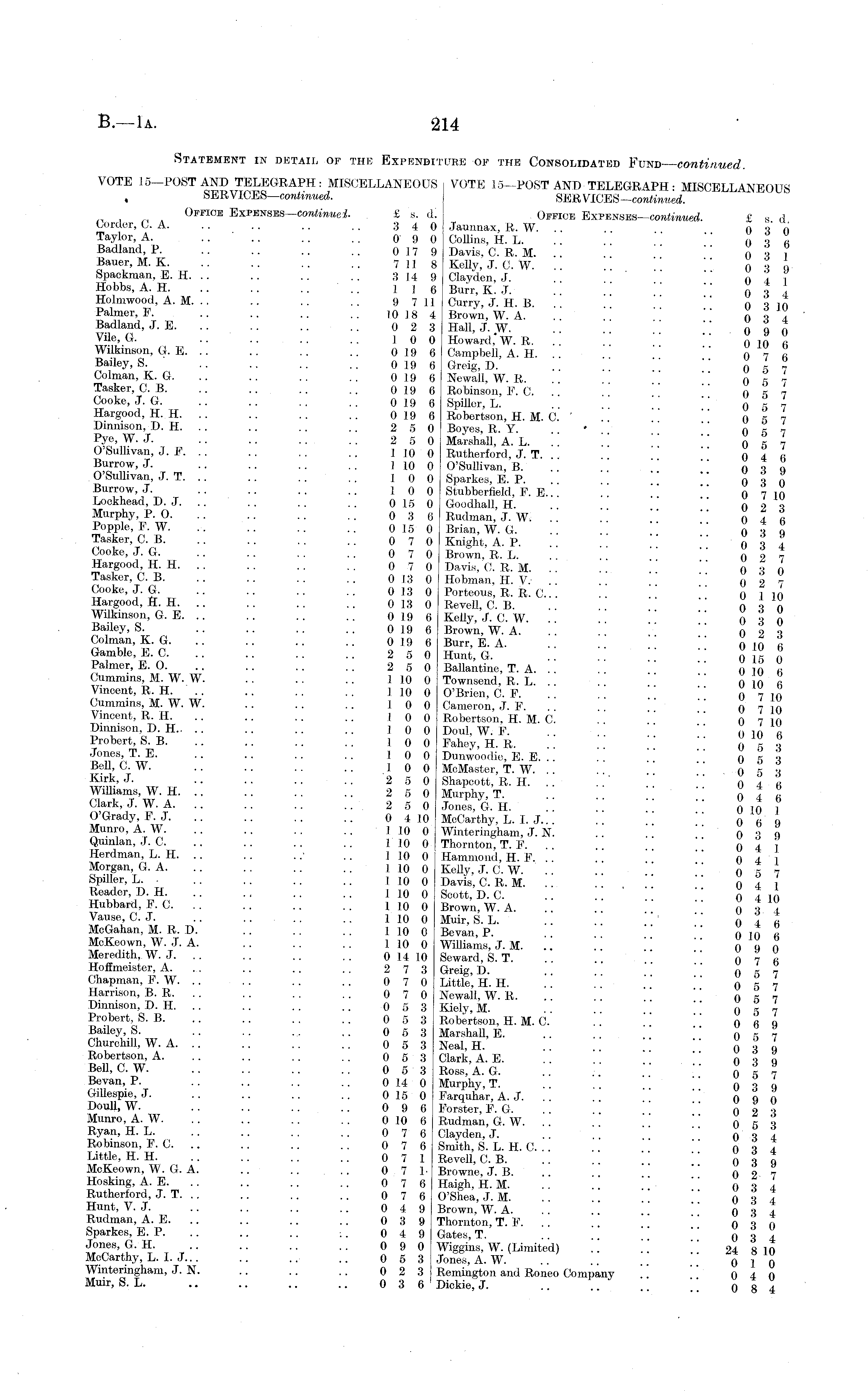 Statement in detail of the Expenditure of the Consolidated Fund— continued. VOTE 16— POST. AND TELEGRAPH: MISCELLANEOUS VOTE 1 5- -POST AND TELEGRAPH : MISCELLANEOUS SERVlCES— ■continued. SERVICES— continued. Office Expenses —conUnuei. £ s. d. Office Expenses— continued. £ a d border, C. A. . . . . .. . . 34 0 Jaunnax, R. W. .. 0 'V 0 Taylor, A. .. .. . . . . 0 9 0 Collins, H. L. 0 3 « Badland, P. .. .. .. .. 017 9 Davis, C. R. M. 0 3 1 Bauer, M. K. .. .. .. .. 7 11 8 Kelly, J. 0. W. 0 3 a Spackman, E. H. .. .. .. .. 3 14 9 Ciayden, J. ft d i Hobbs, A. H .. 116 Burr, K. J. " 0 3 4 Holmwood, A. M. . . .. .. .. 9 7 11 Curry, J. H. B. 0 3 10 Palmer, P. .. .. .. .. 10 18 4 Brown, W. A. . n3 4 Badland, J. E. . . .. .. .. 0 2 3 Hall, J. W. " • 0 » ft Vile > G - ■■ ■■ ■■ .. 10 0 Howard,' W. R. 0 10 f Wilkinson, G. E. .. .. .. .. 0 19 6 Campbell, A. H. 0 7 fi Bailey, S. . . .. .. .. 019 6 Greig, D. . 0 5 7 Colman, K. G. .. .. .... 0 19 6 Newall, W. R. .. " 05 7 Tasker, C. B. .. .. .. .. 0 19 6 Robinson, F. C. 0 5 7 Cooke, J. G. .. .. .. .. 0 19 6 Spillor, L. 0 g L Hargood, H. H. .. .. .. .. 0196 Robertson, H. M. C. 0 5 7 Dmmson, D. H. . . .. .. .. 25 0 Boyes, R. Y. •. ; 05 7 Pye, W. J. .. .. . . .. 2 5 0 Marshall, A. L. 0 5 7 O'Sulhvan, J. F. . . .. . . . . ] JO 0 Rutherford, J. T. ' 0 4 6 Burrow, J. .. .. .. .. 1 10 0 O'Sullivan, B. 0 3 9 O'Sullivan, J. T. .. .. . . . . 10 0 Sparkea, E. P. 03 0 Burrow, J. .. .. .. .. 10 0 Stubberfield, F. E. 0 7 10 Lockhead, D. J. .. .. .. .. 015 0 Goodhall, H. 0 2 3 Murphy, P. O. .. .. . . .. 0 3 6 Rudman, J. W, ' 0 4 fi Popple, F. W. .. .. .. .. 015 0 Brian, W. G. 0 M 9 Tasker, C. B. .. . . . . .. 07 0 Knight, A. P. ' 03 4 Cooke, J. G. .. .. . . .. 0 7 0 Brown, R. L. . " 0 2 7 Hargood, H. H. .. . . . . .. 0 7 0 Davis, C. R. M. 03 0 Tasker, C. B. .. .. .. .. 0 13 0 Hobman, H. V. 0 2 7 Cooke, J. G. .. .. .. .. 0 13 0 Porteous, R. R. C. 0 1 10 Hargood, H. H. .. . . .. .. 013 0 Revell, C. B. 03 0 Wilkinson, G. E. .. .. . . .. 019 6 Kelly, J. C. W. 0 3 0 Bailey, S. .. .. .. .. 0 19 6 Brown, W. A. 0 2 3 Colman, K. G. .. .. .. .. 0196 Burr, E. A. n m r Gamble, E. C 2 5 0 Hunt, G. '.'. 0 15 0 Palmer, E. O. .. .. .. . . 2 5 0 Ballantine, T. A. 0 10 fi Cummins, M. W. W. . . . . .. ] 10 0 Townsend, R. L. 0 10 fi Vincent, R. H. . . .. .. . . l in 0 O'Brien, C. F. a 7,n Cummins, M. W. W. .. . . .. 10 0 Cameron, J. F. 0 710 Vincent, R. H. .. .. .. .. 10 0 Robertson, H. M. C. 0 710 Dinmson, D. H.. .. .. .. .. 10 0 Doul, W. F. . 0 10 fi Probert, S. B 10 0 Fahey, H. R. . n 5 3 Jones, T. E. .. .. .. .. 10 0 Dunwoodie, E. E. 0 5 3 Bell, C. W. . . .. . . .. 10 0 McMaster, T. W. ' " 05 3 Klrk > J - ■ • 2 5 0 Shapeott, R. H. .. .." 0 4 6 Williams, W. H 2 5 0 Murphy, T. n 4 fi Clark, J. W. A 2 5 0 Jones, G. H. n 10 1 O'Grady, F. J. .. .. .. .. 0 410 McCarthy, L. I. J. 0 fi 9 Munro, A. W .. 1 10 0 Winteringham, J. N. r> o 1 Qmnlan, J. C. .. .. .. .. 110 0 Thornton, T. F. 0 4 1 Herdman, L. H. .. . . . .■ .. 110 0 Hammond, H. F. 0 4 1 Morgan, G. A. . . . . .. .. 110 0 Kelly, J. C. W. .. 05 7 Spiller, L. .. .. . . .. 1 10 0 Davis, C. R. M. 0 4 1 Reader, D. H. .. .. .. .. 110 0 Scott, D. C. 0 410 Hubbard, F. C 110 0 Brown, W. A. .. ' ' ' 0 3 4 Vause, C. J. .. ...... .. 110 0 Muir, S. L. " 0 4 fi McGahan, M. R. D. .. . . .. 1 10 0 Bevan, P. 0 10 fi McKeown, W. J. A. .. .. .. 1 10 0 Williams, J. M. .'. '.. 0 9 0 Meredith, W. J. .. .. .. .. 014 10 Seward, S. T. 0 7 fi Hoifmeister, A. .. .. .. .. 2 7 3 Greig, D. 0 5 7 Chapman, F. W. .. . . . . . . 0 7 0 Little, H. H. . 0 5 7 Harrison, B. R. .. .. . . .. 07 0 Newall, W. R. 05 7 Dinmson, D. H. .. .. . . .. 05 3 Kiely, M. 05 7 Probert, S. B .. 0 5 3 Robertson, H. M. C. . . " 0 6 9 Bailey, S. .. .. ... .. 0 5 3 Marshall, E. .. 0 5 7 Churchill, W. A 0 5 3 Neal, H. .. " " q 3 9 Robertson, A. .. .. .. .. 0 5 3 Clark, A. E. n \ a Bell, C. W 0 5 .3 Ross, A. G. , ' 0 5 7 Bevan, P. . . .. .. .. 014 0 Murphy, T. .. 0 3 9 Gillespie, J. .. .. .. .. 0150 Farquhar, A. J. .. 0 9 0 DaulUW. 09 6 Forster,F. G. .. " 02 3 Munro, A. W. . . .. .. . . 010 6 Rudman, G. W. . . 0 5 3 Ryan, H. L. .. .. . . .. 0 7 6 Ciayden, J. 0 3 4 Robinson, F. C .. .. 07 6 Smith, S. L. H. C .' 03 4 Little, H. H 0 7 1 Revell, C. B. . " 0 3 9 McKeown, W. G. A. .. 07 !■ Browne, J. B. .. 02 7 Hosking, A. E. . . .. .. .. 0 7 6 Haigh, H. M. 0 3 4 Rutherford, J. T. .. .. .. .. 0 7 6 O'Shea, J. M. . 0 3 4 Hunt, V. J. .. .. .. .. 0 4 9 Brown, W. A. . . 0 3 4 Rudman, A. E. .. .. .. .. 0 3 9 Thornton, T. F. . . . 03 0 Sparkes, E. P ; . 0 4 9 Gates, T. .. " 0 3 4 Jones, G. H. .. .. .. .. 0 9 0 Wiggins, W. (Limited) .. 24 8 10 McCarthy, L. I. J .. 0 5 3 Jones, A. W. '' 0 1 0 Winteringham, J. N. .. .. .. 0 2 3 Remington and Roneo Company 0 4 0 Muir,S.L. 0 3 6 Dickie, J. .. ... .. [\ 0 8 4