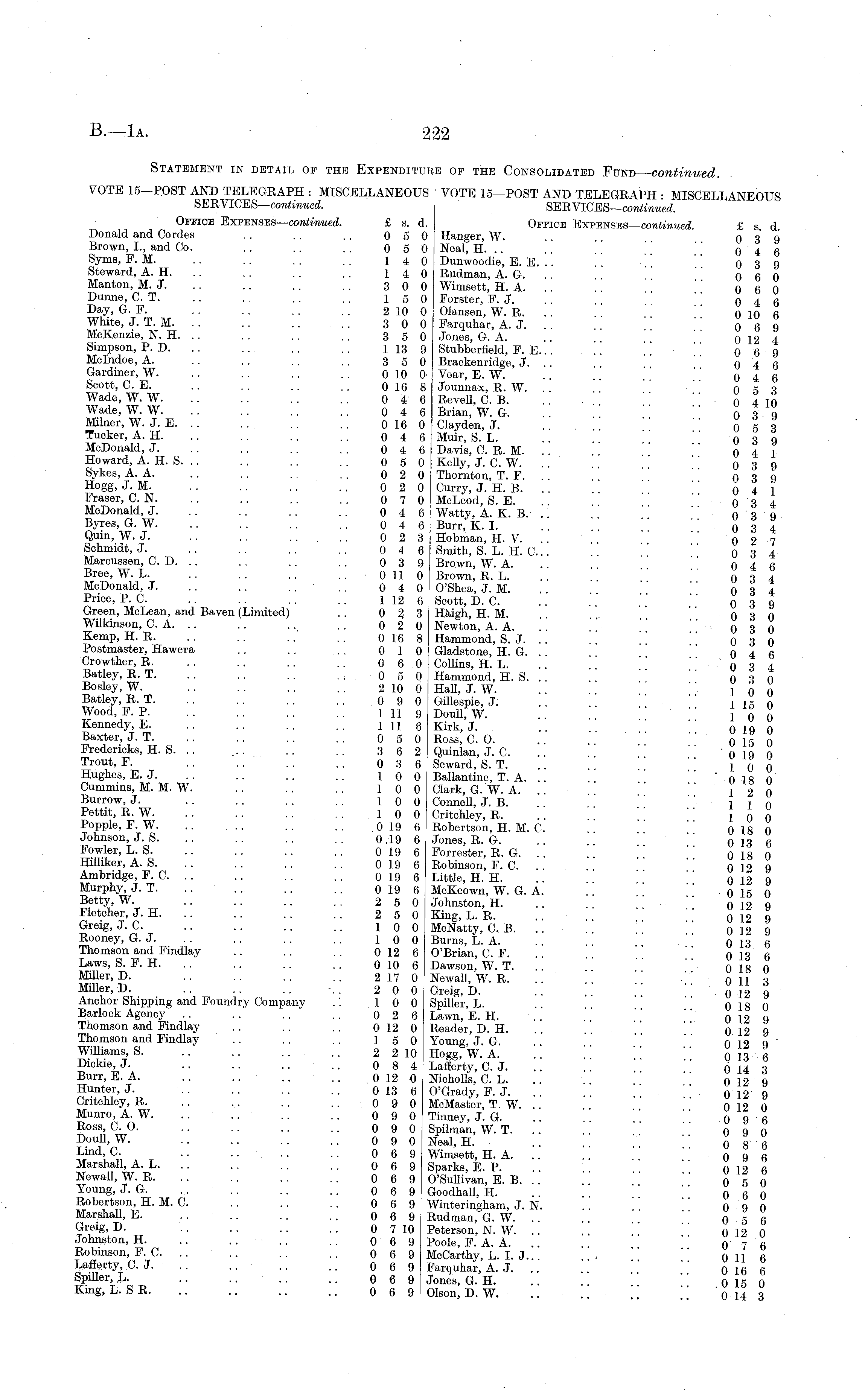 Statement in detail of the Expenditure of the Consolidated Fund— continued. VOTE 15—POST AND TELEGRAPH : MISCELLANEOUS | VOTE 15-POST AND TELEGRAPH • MISCELLANEOUS SERVlCES— continued. SERVlCES— continued. Office Expenses— continued. £ s. d. Office Expenses— continued. £ s d Donald and Cordes .. .. . . 0 5 0 Hanger, W. .. 0 3 9 Brown, 1., and Co. . . .. . . 0 5 0 Neal, H. .. .. " 0 4 6 Syms, F. M. .. . . .. . . 14 0 Dunwoodie, E. E. ... . " 03 9 Steward, A. H. .. .. . . .. 14 0 Rudman, A. G. . . ' 06 0 Manton, M. J. . . .. . . .. 30 0 Wimsett, H. A. . . 06 0 Dunne, C. T. .. . . .. . . 15 0 Forster, F. J. 04 6 Day, G. F. . . . . .. . . 210 0 Olansen, W. R. .. 010 6 White, J. T. M 3 0 0 Farquhar, A. J. . . 0 6 9 McKenzie, N. H. . . . . , . .. 3 5 0 Jones, G. A. . . 012 4 Simpson, P. D. . . .. . . .. 113 9 Stubberfield, F. E... . . 06 9 Mclndoe, A. .. . . . . . . 35 0 Braokenridge, J. . . 04 6 Gardiner, W. . . . . . . .. 010 0 Year, E. W. . . ' 04 6 Scott, C. E. .. . . .. . . 016 8 Jounnax, R. W. n <? s Wade, W. W 0 4 6 Revell, C. B. . . " " 0 410 Wade, W. W 0 4 6 Brian, W. G. . . " " 0 3 9 Milner, W. J. E. . . .. . . .. 016 0 Clayden, J. 05 3 Tucker, A. H. .. . . . . .. 04 6 Muir, S. L. .. " 03 9 McDonald, J. . . . . . . . . 0 4 6 Davis, C. R. M. . . " 0 4 1 Howard, A. H. S. . . . . . . . . 0 5 0 ! Kelly, J. C. W. . . 0 3 9 Sykes, A. A. .. . . .. .. 02 0 Thornton, T. F. ' 03 9 Hogg, J. M. .. . . . . .. 02 0 Curry, J. H. B. . . ' ' 04 1 Fraser, C. N. . . . . . . . . 0 7 0 McLeod, S. E. .. 0 3 4 McDonald, J. . . . . . . ~ 0 4 6 Watty, A. K. B. . 0 3 9 Byres, G. W. . . . . .. . . 0 4 6 Burr, K. I. . . 03 4 Quin, W. J. .. . . ..... 023 Hobman, H. V. . . 027 Schmidt, J. .. .. .. .. 0 4 6 Smith, S. L. H. C. . 0 3 4 Marcussen, CD... . . .. . . 039 Brown, W. A. . 046 Bree, W. L. .. .. .. .. 011 0 Brown, R. L. .. " 03 4 McDonald, J. .. .. . . . . 04 0 O'Shea, J. M. 03 4 Price, P. C. .. . . . . .. 112 6 Scott, D. C. . . .. ." 03 9 Green, McLean, and Baven (Limited) . . 0 2. 3 Haigh, H. M. 0 3 0 Wilkinson, C. A. .. . . . . . . 0 2 0 Newton, A. A. '"• ' ' 0 3 0 Kemp, H. R. .. .. .. .. 0 16 8 Hammond, S. J. .. 0 3 0 Postmaster, Hawera .. . . . . 010 Gladstone, H. G. . 04 6 Crowther, R. . . .. . . .. 06 0 Collins, H. L. .. 03 4 Batley, R. T. . . . . .. ..050 Hammond, H. S. . . 0 3 0 Bosley, W. .. . . . . .. 210 0 Hall, J. W. 10 0 Batley, R. T. .. .. . . . . 0 9 0 Gillespie, J. . 115 0 Wood, F. P 1 11 9 Doullfw. 10 0 Kennedy, E. .. .. .. .. 1 11 6 Kirk, J. 0 1Q O Baxter, J. T. .. .. . . . . 05 0 Ross, CO. . '' 015 0 Fredericks, H. S. .. .. .. .. 362 Quinlan, J. C .. ' 019 0 Trout, F. .. .. . . .. 0 3 6 Seward, S. T. " 10 0 Hughes, E. J. .. .. .. ~ 10 0 Ballantine, T. A. . ' 018 0 Cummins, M. M. W. . . . . .. 10 0 Clark, G. W. A. .. " 12 0 Burrow, J. . . .. . . . . 10 0 Connell, J. B. .. 110 Pettit, R. W. . . .. . . . . 10 0 Critchley, R. 0 0 Popple, F. W. .. ... .. .. 019 6 Robertson, H. M. C 018 0 Johnson, J. S. .. .. .. .. 0,19 6 Jones, R. G. .. 013 6 Fowler, L. S. .. .. .. .. 019 6 Forrester, R. G. .. 018 0 Hilhker, A. S. . . .. . . . . 019 6 Robinson, F. C. 012 9 Ambridge, F. C. .. .. . . .. 019 6 Little, H. H. . . 012 9 Murphy, J. T. .. . ... . . 019 6 McKeown, W. G. A. 015 0 Betty, W. . . . . .. . . 2 5 0 Johnston, H. 019 Q Fletcher, J, H. .: 2 5 0 King, L. R. . . ' ' ' ' 012 9 Greig, J. C. .. .. .. .. 10 0 McNatty, CB. .. 012 9 Rooney, G. J. . . .. . . . . 10 0 Burns, L. A. .. . " 013 6 Thomson and Findlay .. . . . . 012 6 O'Brian, C. F. . 013 6 Laws, S. F. H. . . .. .. .. 010 6 Dawson, W. T. . . ' ' 018 0 Miller, D. .. .. .. .. 2 17 0 Newall, W, R. 0 11 3 Miller, D. .. .. .. -.. 2 0 0 Greig, D. .. .. " " 0 12 9 Anchor Shipping and Foundry Company .". 10 0 Spiller, L. 018 0 Barlock Agency .. .. .. .. 02 6 Lawn, E. H. .. " " ','. 012 9 Thomson and Findlay . . . . . . 0 12 0 Reader, D. H. . . 0 12 9 Thomson and Findlay .. . . . . 15 0 Young, J. G. . . 012 9 ' Williams, S. .. .. . . .. 2 210 Hogg, W. A. .. " 013 6 Dickie, J. . . .. .. .. 0 8 4 Laflerty, C. J. .. 614 3 Burr, E. A. .. .. .. .. 0 12 0 Nicholls, C. L. . 0 12 9 Hunter, J. .. .. .. ~ 013 6 O'Grady, F. J. 012 9 Critchley, R. .. .. . . ..090 McMaster, T. W. .. 0120 Munro, A. W. . . .. . . . . 0 9 0 Tinney, J. G. .. 0 9 6 Ross, CO. .. . . . . .. 0 9 0 Spilman, W. T. . O Q n Doull.W 0 9 0 Neal, H. .. " - 0 8 6 Llnd . c - ■ ■ ■ • ■ • • ■ 0 6 9 Wimsett, H. A. .. 09 6 Marshall, A. L. .. .. . . . . 06 9 Sparks, E. P. 012 6 Newall, W. R. .. . . . . . . 0 6 9 O'Sullivan, E. B. . . 0 5 0 Young, J. G. ... .. .. . . 06 9 Goodhall, H. 06 0 Robertson, H. M. C. .. . . . . 06 9 Winteringham, J. N. .. 09 0 Marshall, E. . . .. . . . . 06 9 Rudman, G. W. . . .. 05 6 Greig, D. .. .. . . .. 0 710 Peterson, N. W. .. 012 0 Johnston, H. .. . . .. .. 0 6 9 Poole, F. A. A. 0 7 6 Robinson, F. C. .. .. .. .. 0 6 9 McCarthy, L. I. J ... ... 011 6 Lafferty, C. J. . . .. .. .. 0 6 9 Farquhar, A. J. .. 0 16 6 s P aler . L- 0 6 9 Jones, G. H '' 0 15 0 King, L. S R 0 6 9 Olson, D. W \\ ' 0 14 3