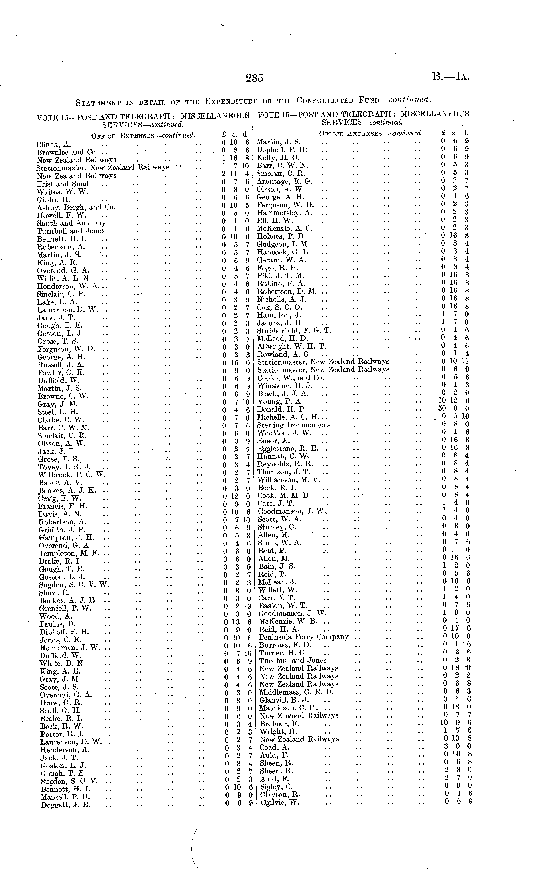 Statement in detail of the Expenditure of the Consolidated Fund — continued. VOTE 15-POBT AND TELEGRAPH : MISCELLANEOUS i VOTE 15-POST AND TELEGRAPH : MISCELLANEOUS SERVlCES— continued. ! SERVlCES—continued. Omtce Expenses— continued. £ s. d. Office Expenses— continued. £ s. d. Cli no h A • • • • 010 6 Martin, J. S 0 6 9 Brown Wand Co. .. 0 8 6 Dephoff,.F. H: 0 6 9 New Zealand Railways 1 16 8 Kelly HO. 0 6 9 Stationmaster, New Zealand Railways • • .. 1 710 Barr, C. W. N • ■ • 0 5 3 New Zealand Railways 2 114 Sinclair, C. R „ !j 2 Trist and Small 0 7 6 Armitage, R G 0 I 7 Waites,W. W 0 8 0 Oleeon.A. W. .. ■ 02 7 Gibbs H .. ■■••■ • 0 6 6 George, A. H. .. .. .. • • 016 Ashby, Bergh, and'Co 0 10 5 Ferguson W. D \\\ Howel F. W 0 5 0 Hammersley, A 0 2 3 Sand Anthony 0 10 MH.W .. 0 2 3 Turnbull and Jones 0 16 MoKenzie, A. C 0 2 3 Bennett, H. 1 0 10 6 Holmes, P D 0 Iβ 8 Robertson, A 0 5 7 Gudgeon, T- M \\\ Martin, J. S 0 5 7 Hancock CL 0 8 4 Kins A E •. • • • ■ 0 6 9 Gerard, W. A. .. .. .. • • 0 8 4 OveLd,G.A •• 04 6 Fogo, R. H. .. .. .. 084 Willis, A. L.N 0 5 7 Piki,J.T.M 0 6 8 Henderson, W. A 0 4 6 Rubino, F. A. 0 16 8 Sinclair, C. R • • • • • 0 4 6 Robertson DM olβ 8 Take L A •• •• 0 3 9 Nicholls, A. J. .. .. ■• •• 016 8 Laurenson, D. W. \\ 0 2 7 Cox, S. C. 0 0 16 8 j kJ T .. .. .. 0 2 7 Hamilton, J. .. .. .. • • 17 0 Gough TE .... .. 0 2 3 Jacobs, J. H 17 0 Goston L..X 0 2 3 Stubberfield, F. G. T 0 4 6 Grose TS '.. ... 0 2 7 McLeod, H. D •■• 0 4 6 Ferguson, W. D. '.'. .. .. ■■ 03 0 AUwright, W. H. T. .. 04 6 George AH .. • • • • 02 3 Rowland, A. G. .. .. . • • • 014 Russell' j' A' .. •■ •• 0 15 0 Stationmastor, New Zealand Railways .. 0 10 11 Fowler' GE~ '.'. 0 9 0 Stationmaster, Now Zealand Railways .. 0 6 9 DuffieW, W. ' " !! ■• •• 06 9 Cooke, W., and Co 05 6 Martin, J. S •• 0 6 9 Winstone H J 0 13 Browne,C. W 0 6 9 Black, JJ A 0 2 o Gray j M 0 7 10 Young, P. A 10 12 6 Steel' L H •• •• 0 4 6 Donald, H. P 50 0 0 Clarke C W '.'. ■■ ■■ 0 7 10 Michelle, A. C. H 0 5 10 Bnrr CWM •• •• •• 076 Sterling Ironmongers .. .. . - 0 8 0 Knd£aß7 : 0 6 0 Wootton,J.W 016 Olsson AW .. • • • • 0 3 9 Ensor, E. .. • ■ • • • • 016 8 Jack J T " •• •■ 0 2 7 Egglestone/R. E 0 16 8 Grose TS " ■ •• 0 2 7 Hannah, C. W 0 8 4 Tovey UJ. _! ', ■ ■ 0 3 4 Reynolds, R. R 0 8 4 wXockFC.W 0 2 7 Thomson, J. J .. 0 8 4 Baker a V .. ..027 Williamson, M. V. .. .. .. 084 Boakes A j X " .. ..030 Beck, R. 1 084 Craig FW '.'. 0 12 0 Cook, M. M. B .. .. 0 8 4 Francis FH " 09 0 Carr, J. T 14 0 T)aviq AN •• 0 10 6 Goodmanson, J. W. .. .. •• 1 4 U Robertson A. V. 1 07 10 Scott, WA. .. .. 040 Griffith, J.P 0 6 9 Stubley C 0 8 0 Hampton, J. H 0 5 3 Allen, M. 0 4 0 Overend.G.A 0 4 6 Scott, W. A 0 7 6 Templeton, M. E 0 6 0 Beld, P. OHO Brake, R. 1 0 6 0 Allen, M. 0 16 6 Gough,T. E 0 3 0 Bam,J. S 12 0 Goston, L.J 0 2 7 Reid, P. 0 5 6 SriD-dpri S C V W .... 0 2 3 McLean, J. .. .. .. .. 0 lb fa Shaw C •■ -.030 Willett,W 120 loakes, A. J. R. " 0 3 0 Carr, J. T 140 Grenfell, P.W 0 2 3 Eastern, W. T 0 7 6 w nnf ] A 0 3 0 Goodmanson, J. W. .. .. .. 10 0 Waulhs D '.'. '■■ 0 13 6 McKenzie, W. B 0 4 0 Diphofi F H ". 09 0 Reid, H. A 017 6 Jones C E 0 10 6 Peninsula Ferry Company .. .. .. 0 10 0 Horneman,J. W. ■.'. '.'. ■■ ■■ 010 6 Burrows, F. D 01 6 Duffield W 0 7 10 Turner, H. G 0 2 6 White DN .. .. •• •■ 069 Turnbull and Jones .. .. .. 0 2 3 Kinc Ais ' •• •• 04 6 New Zealand Railways .. .. .. 018 0 fray t'm' ■■ 046 New Zealand Railways .. .. .. 022 Sontt TS' " • ■ 0 4 6 New Zealand Railways 0 6 8 Overend.G.A. V. '.'. .. ■■ 03 0 Middlemass, G. E. D 06 3 Drew G R ■ .. ■ • 0 3 0 Glanvill, R. J. .. .. .. .. 0 16 ScuiT'gH " 0 9 0 Mathieson, C. H 0 13 0 Brake R I • • • • • • 0 6 0 New Zealand Railways .. .. .. 0 7 7 "Reok 'r W .. ..034 Brebner, F. .. .. .. .. 10 9 6 Porter R I •• ..023 Wright, H 176 Laurenson, i>. W 0 2 7 New Zealand Railways 0 13 8 Henderson,A 0 3 4 Coad, A. 3 0 0 Tack J T .. ..027 Auld, F. .. .. .. .. 0 16 8 '.: 0 3 4 Sheen, R 0 16 8 Goudi T E .. .. •• 0 2 7 Sheen, R. .. .. .. .. 2 8 0 Surfen SCV • • • • 0 2 3 Auld, F. 2 7 9 Sett, HI : 0 10 6Si g ley,C 0 90 Mansell, P. D , 0 9 0 Clayton R 0 4 6 Doggett, J. E 0 6 9 Ogilvie, W 0 6 9