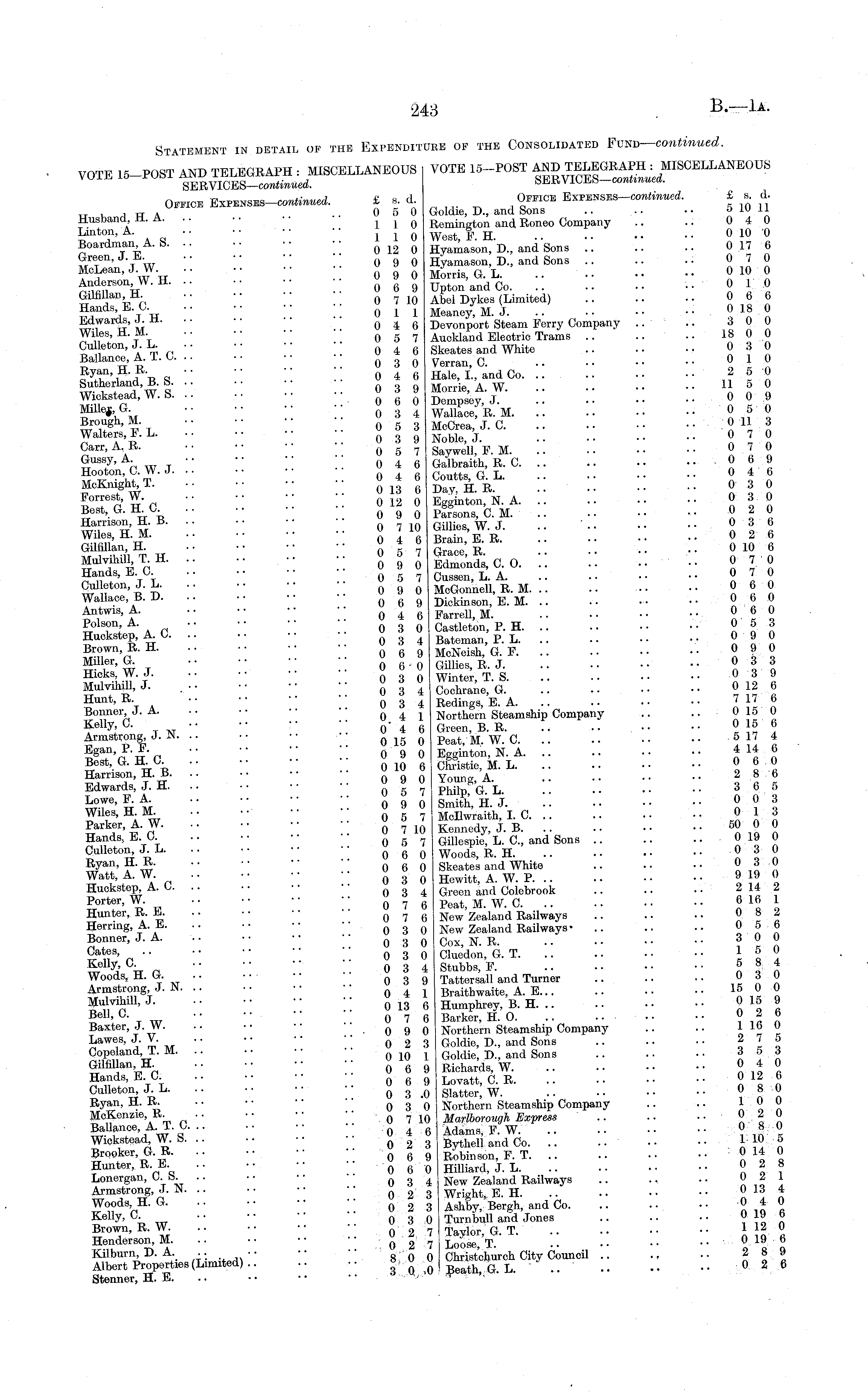 Statement in detail of the Expenditure of the Consolidated Fund— continued. VOTE 15-POST AND TELEGRAPH : MISCELLANEOUS VOTE 15-POST AN£ TELEGBAPH : MISCELLANEOUS SERVlCES— continued. SBR VIC Kb ~ continued. OBTOn. EOTNSES-Hsontfwued. £ b. d. O™ O E £ * d. TT . j XT a .050 Goldie, D., and Sons .. .. • • o1"1 JHusband H. A 110 Remington and. Roneo Company .. .. 0 4 0 Linton, A. • • • • • • [ Q West J, H .. 010 0 Boardman A. S •• Q Q Hyamas ' on ;D. ; and Sons 017 6 ?/f n t w " '" 09 0 Hyamason, D., and Sons • 0 7 0 McLean, J. W. Morris, G. L. .. 010 0 n^T°\' " " " •• 06 9 Upton'andCo •• 01 0 Gilfillan U. •• . . 0 7 10 Abel Dykes (Limited) 0 b 6 Sf*!s T W ■' " 011 Meaney, M. J . 018 0 Edwards, J . a. 0 4 6 Devonport Steam Ferry Company .. .. 3 0 0 Wiles, HM •• •• ■• 037 Auckland Electric Trams 18 0 0 Cueton, J. L. .. • • • • skeateg and white 0 3 0 Ballance, A. T. C. .. .. •• 0 3.0 Verran, C 010 %f, tt ,\ q •• .046 Hale, 1., and Co 250 Sutherland, B. S. .. •• •• Morrie, A. W X i £ 2 Wickstead,W.S. . •• Dempsey, J 0 0 9 lle *', G M •• " ..034 Wallace! R. M , Brough,M •■ •• ..053 McCrea, J. C Oil 3 Walters, F. L ■ Q 3 Q j 0 7 0 Carr, A R. 0 5 7 SayweU P . M 0 7 0 S US 7'- r W T ..046 Galbraith, R. C 069 =™ ta uT ..046 Coutts, G. L 046 f° + g w " 013 6 Day, H. R 0 3 0 Forrest, W •• •• „ 2 Q E ginton> N . A 0 3 0 Best.G. HC 9Q p» c . M . 02 0 °w M • • 07 10 Gillies ' W - J - • • ' 29 « Wiles, H. M. • ■ ■ • • ■ 0 . „ B • E t. .. .. 0 2 6 GilfiUan, H ° t ° g^ , r^ , 0 10 6 MulvihilLT H. .- •• ..090 Edmonds, C. 0 0 ' 0 Hands, EC .. ■• 0 5 7 Cussell; L . A 0 7 0 w? 'i'ri " .090 McGonnell, R. M 0 6 0 Wallace B. D 0 6 9 Dickinson, E. M ■ •• 0 6 0 £ n . twls I; 04 6 Farrell,M • 06 0 Poison A. Q 3 0 Caatleton p. h nan 3 4 Bateman>P . L 0 9 0 S r n Wn, P • 0 6 9 McNeish, G. F a ! or r " " .. 0 6 0 Gillies, R. J 0 3 3 ..030 Winter, T. S 03 9 MulYihill, J. ..034 Cochrane, G ■• •• 026 Hunt, R. • ■ ..034 Redings, E. A 11l a Bonner, d. a. ■• 0 4 1 Northern Steamship Company .. .. v 10 v Kelly C. .. •• ■• •• • 4 6 Gleen b. R ■■ 0 15 6 Armstrong, J. N 0 15 Q Peat> M . W . C 5 17 4 Egan P. F •• •• " 09 0 Bgg ptp"n, N. A ' Best,G. H.C 10 6 Ohristie; M . L 0 6.0 Harrison, H.B. .. •• Young, A 2 8b Edwards, J. H. •• • Q 5 , Phil - G . L 3 6 5 %ST' wm •• 09 0 Smith, H. J 00 3 Wiles, H.M. •• •■ 0 6 , Mcl i wra i t h, I. C 0 1 3 Parker, A. W 0 110 Kennedy, J. B fi o 0 0 Hands, EC. 0 5 7 GiUespie / L . C ., and Sons 019 0 Culleton, J.L •• 06 0 Woods, R. H. .. • Son Sr aw " '■'■ 06 0 Skeates and White 03 0 Watt, A. W 0 3 0 Howitt; A . W . p 9 19 0 Huckstep, A. 0 0 3 4 Green and Colebrook 2 14 2 xr° rt I: 07 6 Peat.M.W.C 616 1 Hunter, R. • • 0 7 6 New Zealand Railways .. .. • • 0 8 I Herring, A. E 0 3 0 New Zealand Railways- 0 5.6 Bonner, J. A 0 3 0 Cox, N. R ? ? n a *f' „ ■ ■ ; :'. 03 0 Cluedon, G. T 15 0 Woods, H. Gr. 0 3 9 Tattersall and Turner 0 3 0 «T S Sf S V " " '•'• 04 1 Braithwaite, A. E 15 0 0 M^ 111 " 1 .. 013 6 Humphrey, B.H 015 9 BeU '°- TW 0 7 6 Barker, H. O ° \ f Baxter, J.w. .. •• -090 Northern Steamship Company .. •• 1 lo « Lawes, J. V. .. ■ • • • 0 2 3 Goldie, D., and Sons Copeland, 1. M. .. • • ■ • 010 1 Goldie, D., and Sons .. .. ■ • 3 5 3 Gilfillan H .. •• •■ ;; o6 9 Richards, W 04 0 Hands, EC .. ■• .069 Lovatt, C. R 0 12 6 J.L. .. ■• 0 3.0 Slatter, W ? n n Ryan, U. ±4. • • • • 0 3 0 Northern Steamship Company .. • • 1 « « McKenzie, R. • • ■• ■• 0 710 Marlborough Express 0 2 0 Ballance, A. T. 0. .. •• 0 4 6 Adams, F. W °,n ? Wickstead,W. S. .. •• ■• 0 2 3 BythelJ and Co » Brooker G. R • 0 6 9 Robmson, F. T no 8 Hunter, R. E. .. • • 0 6 0 Hilliard, J. L no? Lonergan, 0. b. 0 3 4 New Zealand Railways J. Armstrong, J. N ■• 02 3 Wright, E. H n5 n Woods H. G. .. •• • 02 3 Ashby, Bergh, and Co •• 04 0 Kelly, C. 0 3 0 Turnbull and Jones 0 19 6 Brown, R. W. .. ■ • • • ;; Q%7Tj ■ G . T 112 0 Henderson, M. .. • • • ■ 0 2 7 Loose, T. .. • • • • ..019b Kilburn, D. A. •: . ■~ " 8 0 0 Christohurch City Council .. .. •• 2 8 9 Albert Properties (Limited).. .. » » Q Beath> G . L . 0 2 6 Stenner, H. B. ..