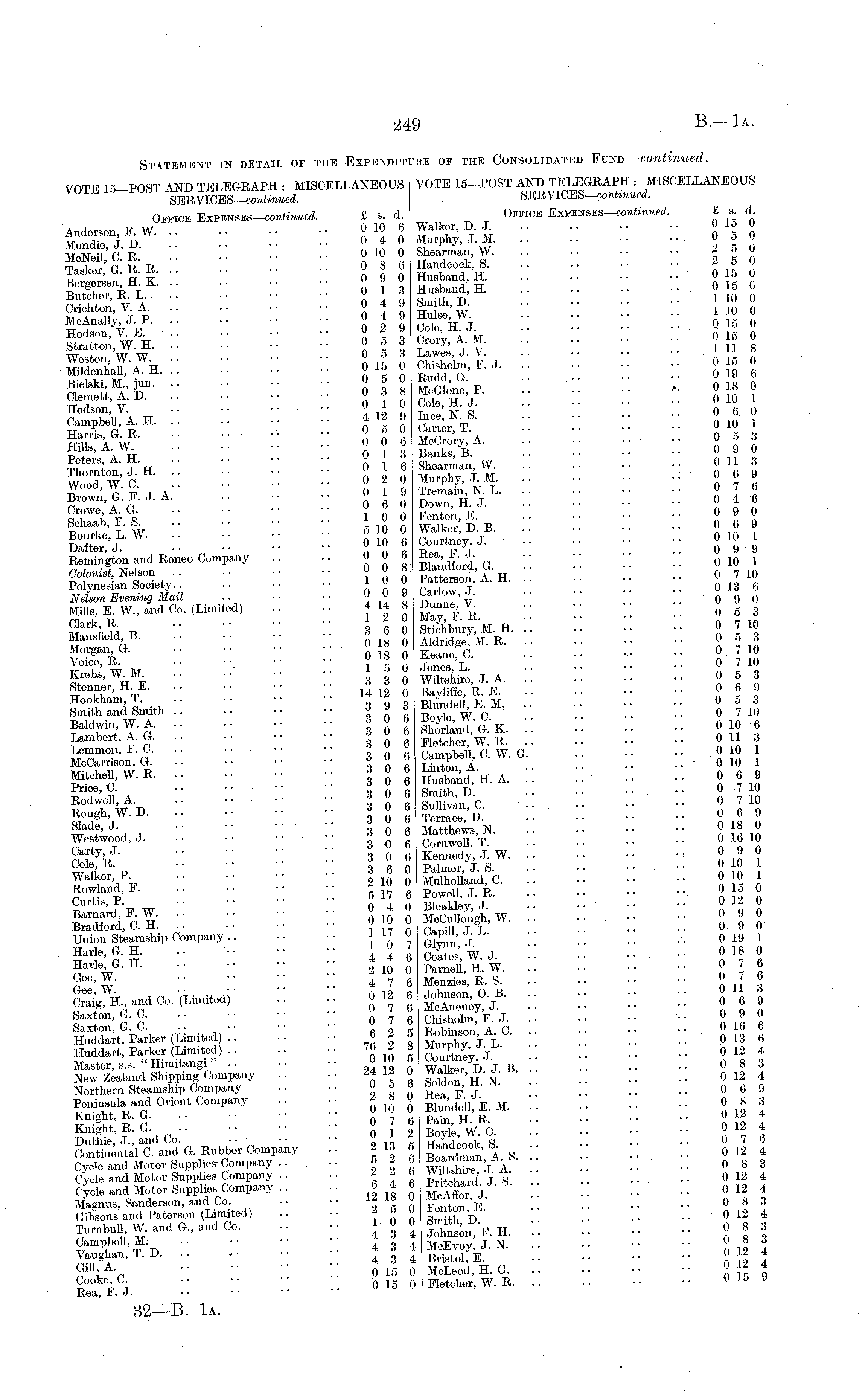 Statement in detail of the Expenditure op the Consolidated Fund — continued. VOTE 15-POST AND TELEGRAPH : MISCELLANEOUS VOTE 15-POST AM) T^LEGRAPH^^MISCELLANEOUS Ootioh Exvvxsvs-continued. £ s. d. Office £ fl. d. Anderson F W 010 6 Walker, D. J 0.15 0 Anderson t <. w. .. 0 4 0 Murphy, J. M •■ 0 5 0 B;ILv. •: ;: 1 |§f :: :: ;: ;; 111 lit-:: ;: ;; I ■ :: :: If Iftr :; .H& j; :: I "SW :: :: So 0 . &££a. :: :: ::. «§ » l«*tl :: J ! ?rsiw. :: :: :: :: S, Thornton, J. H. .. • • ■ • ■ • " * " Murohv f M • • ..069 £*"" :: :: :: £lV L :: ' " : SICrowe, A. G 0 6 0 WJ ..090 Sj l - w - :: :: :: :•: • £% J - .rS-5 Remington and Roneo Company .. • ■ 00b Kea ,,X. J. • • • • • • ■ j Oo« ow « Nelson 0 08 .. ? 1Q Polynesian Society 10 0 ™»«on> A. ±1. .. Nd*m Evening Mail .. ■• •■ 00 9 ,J. Mills X W., and Co. (Limited) .. « ;;; ;; .. .. 053 m fl ß i T! " " " " 36 0 Stichbury, M. II 07 10 Mansfield B. Aldridge, M. R 0 5 3 Morgan G. ■• Keanefc. [ 1 0 ?? W M '' ''■ 15 0 Jones, L. 07 10 Krebs, W. M. • • • • • ■ •; eon WiltsW T A .. ..053 Stenner,H.E. .. .. . 3JO Wdtg». .. Hookham, 1. .. • • • • „ "P M • • ■ • 0 5 3 Smith and Smith .. • • ■ • ■- o X fi TWIa W C • • .. 0 7 10 fSH :: SSJaK. :: 010 c Lambert, A. G Fletcher, W. R 0 113 Lemmon,FC | Campbell, C. W. G 0 10 1 C tT°WR " "306 Linton,A. 010 1 MitcheU,W.R. •• ■• •• 3 0 6 Husband, H. A .. •• 0 6 9 Price, C. • • • • • ■ „ „ „ o™;t), T) . • .. 0 710 RodweiiA. .. .. •; • 83Kl?o. ■:: o "° q Bough, W. T>. . • • • • ■ • £ Tprrapp D - • • • • • 0 6 9 wf' T •• 306 Matthews, N •• 018 0 Westwood.J. .. 30 6 ComweU ; T ■■ 016 10 3 ' •• " " : 3 0 6 Kennedy, J. W 0 9 0 »*?% 3 6 0 Palmer, J. S 0 10-1 Walker, P.. •• ■ Mulholland, C t\*\ Rowland,]?. •• •• Powell, J.R 0 5 « S '/"-R- W " " " 04 0 Bleakley, J •• » » SKI :: :: :: •■ ;;;« «*■ ■• ;: :: :: SS S Union Steamship Company.. ■ • ■ • Capill, J. L. • • ■_• QJg 1 Harle, G. H. .. 10 7 Wynn, .. • Q lg Q Harle G. H. .. • ■ 210 0 Parnell, H. W • • • • 0 7 6 ee 'W- •• •' '• 'I 47 6 Menzies, R. S nll t andCo.- ( Limited,- 0 I*. ggUji ; j » ;; ;; V Huddart, Parker (Limited) .. .. ■• 62 5 «~\ A L °- - 013 6 Huddart, Parker (Limited) 76 2 8 Murphy JL. .. Ql2 4 Master, s.s. " Himitangi" j> ™5 w^ J. B ".". °8 3 New Zealand Shipping Company .. ■■ 24 12 0 Walker,^. £ . 012 4 Northern Steamship Company •• •• 05 6 beUon., M. in. . ■• ..069 Peninsula and Orient Company •• j8 0 k M " .. .. 083 Knight, R. G. .. • • ■ • • • pain H R 012 4 Knight, R. G. . • • ■ • ■ o' 1 2 Boyle, W. C 012 4 Duthie, J., and Co. •• •• ■■ " Handcock S . •■ •• •• 07 6 Continental C. and G. Rubber Company .. 213 5 i, Ql2 4 Cycle and Motor Supplies Company .. .. 52 6 B»A»b AA .. 0g 3 Cycle and Motor Supplies Company .. .. 22 6 WUtetore ja. _ _ Ql2 4 Cycle and Motor Supplies Company .. .. «" * « McAffer J ' •• •• •• °12 4 Magnus, Sanderson, and Co. .. ■• 12 18 0 McAffer, J. .. Qg g Gibsons and Patorson (Limited) .. • ■ 25 0 lenton, Ji. Ql2 4 Turnbull,W.andG.,andCo. ■• 10 0 Smith, fi .. Campbell, M. .. ■• •■ ;; 43 4 McEvoy, J. N 012 I Vaughan, T. D. . . 4 3 4 Bristol) E ■ f, ll \ A - a " " .. 015 0 McLeod,H.G 012 4 Cooke, C 0 15 0 Fletcher, W. R. .. • • • • • • ° lo a Rea, P. J.