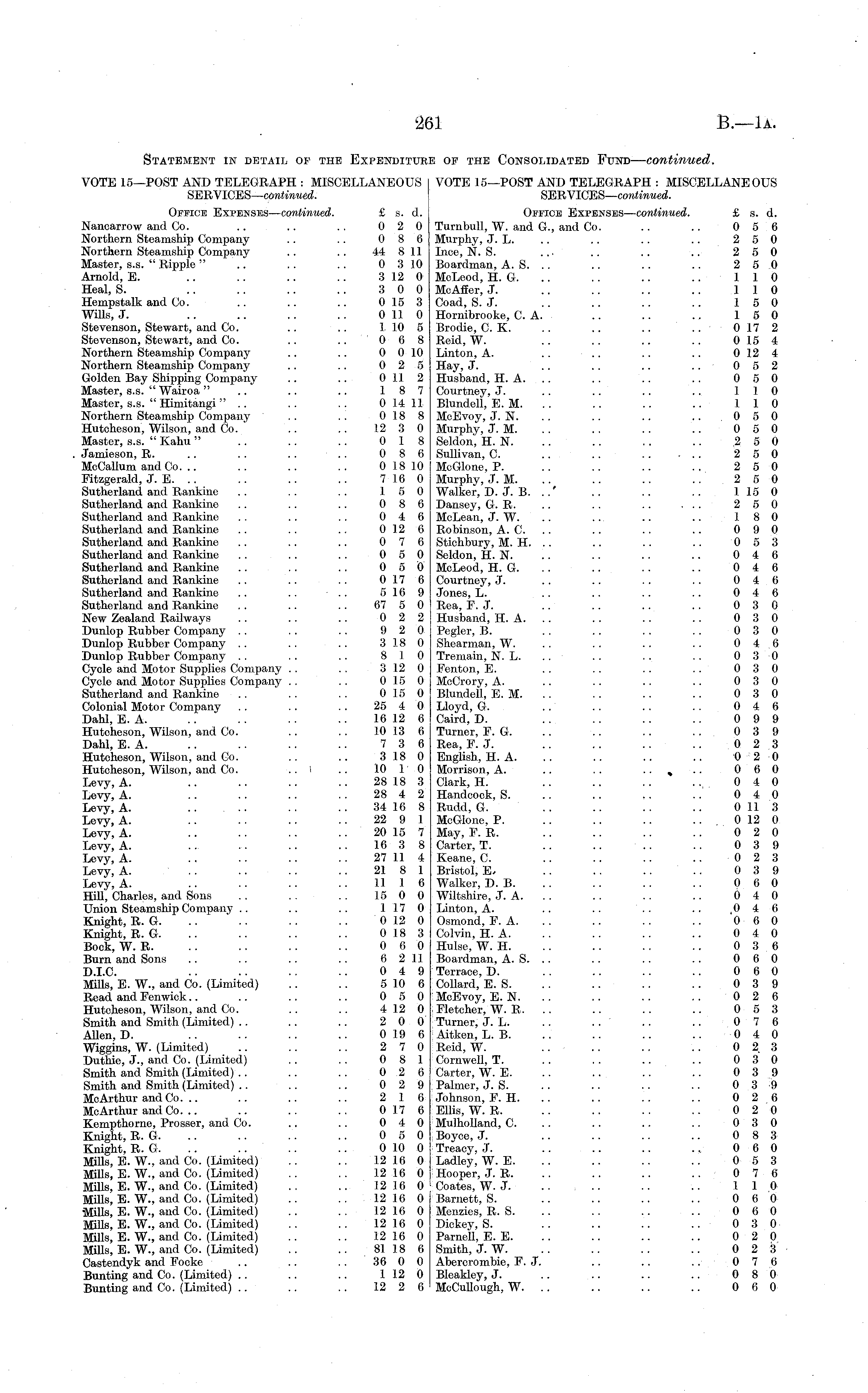 Statement in detail op the Expenditube of the Consolidated Fund — continued. VOTE 15—POST AND TELEGRAPH : MISCELLANEOUS VOTE 15—POST AND TELEGRAPH : MISCELLANEOUS SERVlCES— aontiniled. SERVlCES— continued. Office Expenses— continued. £ s. d. Office Expenses— continued. £ s. d. Nancarrow and Co. .. .. .. 0 2 0 Turnbull, W. and G., and Co. .. .. 0 5 6 Northern Steamship Company .. .. 0 8 6 Murphy, J. L. .. .. . . .. 2 5 0 Northern Steamship Company .. .. 44 811 Ince, N. S. ... .. .. .. 250 Master, s.s. " Ripple" . . . . .. 0 3 10 Boardman, A. S. .. .. . . .. 2 5 0 Arnold, E. .. .. .. .. 312 0 MoLeod, H. G. .. .. .. .. 110 Heal, S. .. .. .. . . 3 0 0 McAfier, J. .. .. .. .. 110 Hempstalk and Co. .. .. .. 0 15 3 Coad, S. J. .. .. .. .. 15 0 Wills, J. .. .. .. .. 0 11 0 Hornibrooke, C. A. .. .. .. 15 0 Stevenson, Stewart, and Co. .. .. 110 5 Brodie, C. K. .. .. .. .. 017 2 Stevenson, Stewart, and Co. .. ..068 Reid, W. . . . . .. .. 0154 Northern Steamship Company .. .. 0 010 Linton, A. .. .. .. .. 012 4 Northern Steamship Company .. .. 0 2 5 Hay, J. .. . . .. .. 0 5 2 Golden Bay Shipping Company .. .. 011 2 Husband, H. A. .. .. .. .. 0 5 0 Master, s.s. " Wairoa" .. .. .. 18 7 Courtney, J. . . .. .. .. 110 Master, s.s. " Himitangi" .. .. .. 014 11 Blundell, E. M. .. .. .. .. 110 Northern Steamship Company .. .. 0 18 8 McEvoy, J. N. .. .. .. .. 0 5 0 Hutcheson, Wilson, and Co. .. .. 12 3 0 Murphy, J. M. . . . . . . .. 0 5 0 Master, s.s. " Kahu" .. .. .. 0 18 Seldon, H. N. .. . . . . .. .2 5 0 Jamieson, R. .. . . .. .. 0 8 6 Sullivan, C. .. .. .. - . . 2 5 0 MoCallum and Co. .. .. .. .. 0 18 10 MoGlone, P. .. .. .. .. 2 5 0 Eitzgerald, J. E. .. .. .. .. 716 0 Murphy, J. M. .. .. .. .. 2 5 0 Sutherland and Rankine .. .. .. 15 0 Walker, D. J. B. ..' .. .. .. 115 0 Sutherland and Rankine .. .. .. 0 8 6 Dansey, G. R. .. . . .. ... 250 Sutherland and Rankine . . . . .. 0 4 6 McLean, J. W. .. .. .. .. 18 0 Sutherland and Rankine .. .. .. 012 6 Robinson, A. C. .. .. .. .. 0 9 0 Sutherland and Rankine .. .. .. 0 7 6 Stiohbury, M. H. .. .. .. .. 0 5 3 Sutherland and Rankine .. . . . . 0 5 0 Seldon, H. N. .. .. . . .. 0 4 6 Sutherland and Rankine .. . . .. 0 5 0 MoLeod, H. G. .. .. .. .. 0 4 6 Sutherland and Rankine .. .. . . 0 17 6 Courtney, J. . . .. . . .. 0 4 6 Sutherland and Rankine .. . . .. 516 9 Jones, L. . . .. .. .. 0 4 6 Sutherland and Rankine .. .. .. 67 5 0 Rea, F. J. .. .. .. . . 0 3 0 New Zealand Railways . . . . .. 0 2 2 Husband, H. A. .. . . . . .. 0 3 0 Dunlop Rubber Company . . .. .. 9 2 0 Pegler, B. . . .. . . . . 0 3 0 Dunlop Rubber Company .. . . . . 3 18 0 Shearman, W. . . . . .. . . 0 4 6 Dunlop Rubber Company . . .. .. 8 10 Tremain, N. L. .. . . . . .. 0 3 0 Cycle and Motor Supplies Company . . . . 312 0 Fenton, E. . . .. .. .. 0 3 0 Cycle and Motor Supplies Company . . .. 015 0 McCrory, A. .. .. .. .. 0 3 0 Sutherland and Rankine .. .. . . 0 15 0 Blundell, E. M. .. . . .. .. 0 3 0 Colonial Motor Company . . .. . . 25 4 0 Lloyd, G. .. . . . . . . 0 4 6 Dahl, E. A. .. . . . . .. 16 12 6 Caird, D. . . . . .. .. 0 9 9 Hutcheson, Wilson, and Co. .. .. 10 13 6 Turner, F. G. .. .. .. ..039 Dahl, E. A. .. .. . . .. 7 3 6 Rea, E. J. .. .. . . .. 0 2 3 Hutcheson, Wilson, and Go. .. .. 318 0 English, H. A. . . .. .. .. 0 2 0 Hutcheson, Wilson, and Co. ..I .. 10 1 0 Morrison, A. .. .. ..,.. 060 Levy, A. .. .. .. .. 28 18 3 Clark, H. .. .. .. .. 0 4 0 Levy, A. .. . . .. 28 4 2 Handcock, S. .. .. .. .. 0 4 0 Levy, A. . . .. 34 16 8 Rudd, G. . . . . . . .. 0 113 Levy, A. .. .. .. 22 9 1 McGlone, P. .. .. .. .. 012 0 Levy, A. .. .. .. .. 20 15 7 May, P. R. .. .. .. . . 0 2 0 Levy, A. .. .. .. .. 16 3 8 Carter, T. .. .. .. . . 0 3 9 Levy, A. . . .. .. .. 27 11 4 Keane, C. .. .. .. .. 0 2 3 Levy, A. . . .. .. .. 21 8 1 Bristol, E- .. . . .. .. 0 3 9 Levy, A. .. .. .. .. 1116 Walker, D. B. .. .. . . . . 0 6 0 Hill, Charles, and Sons . . . . . . 15 0 0 Wiltshire, o'. A. . . .. .. .. 0 4 0 Union Steamship Company .. .. . . 117 0 Linton, A. .. .. .. .. 0 4 6 Knight, R. G. .. . . .. .. 012 0 Osmond, F. A. . . .. .. .. 0 6 0 Knight, R. G. .. .. .. .. 0 18 3 Colvin, H. A. .. .. .. .. 0 4 0 Bock, W. R. . . . . . . .. 0 6 0 Hulse, W. H. .. .. . . .. 0 3 6 Burn and Sons .. .. .. .. 6 211 Boardman, A. S. .. . . .. . . 0 6 0 D.I.C. .. . . ■ ■ ■. 0 4 9 Terrace, D. . . .. .. .. 0 6 0 Mills, E. W., and Co. (Limited) .. .. 510 6 Collard, E. S. . . .. .. .. 0 3 9 Read and Fenwick.. .. .. .. 0 5 0 McEvoy, E.N... .. . . . . 0 2 6 Hutcheson, Wilson, and Co. .. . . 412 0 Fletcher, W. R. .. .. . . . . 0 5 3 Smith and Smith (Limited) . . . . .. 2 0 0 Turner, J. L. .. . . ' .. .. 0 7 6 Allen, D. .. .. .. .. 0 19 6 Aitken, L. B. .. .. .. .. 0 4 0 Wiggins, W. (Limited) .. . . .. 2 7 0 Reid, W. .. .. . . .. 0 2 3 Duthie, J., and Co. (Limited) .. .. 0 8 1 Cornwell, T. .. .. .. .. 0 3 0 Smith and Smith (Limited) . . .. . . 0 2 6 Carter, W. E. .. .. .. .. 0 3 9 Smith and Smith (Limited) .. .. .. 0 2 9 Palmer, J. S. . . .. .. .. 0 3 9 Mc Arthur and Co. .. .. .. .. 2 16 Johnson, F. H. .. .. .. .. 0 2 6 Mc Arthur and Co. .. .. .. .. 0 17 6 Ellis, W. R. .. .. .. .. 0 2 0 Kempthorne, Prosser, and Co. .. .. 0 4 0 Mulholland, C. . . . . .. .. 0 3 0 Knight, R. G. .. .. .. .. 0 5 0 Boyce, J. .. . . .. .. 0 8 3 Knight, R. G. .. .. .. .. 010 0 Treacy, J. .. .. .. ... 0 6 0 Mills, E. W., and Co. (Limited) .. .. 12 16 0 Ladley, W. E. .. .. .. .. 0 5 3 Mills, E. W., and Co. (Limited) .. .. 12 16 0 Hooper, J. R. .. .. .. .. 0 7 6 Mills, E. W., and Co. (Limited) .. .. 12 16 0 Coates, W. J. .. .. .. .. 110 Mills, E. W., and Co. (Limited) .. .. 12 16 0 Barnett, S. .. .. .. .. 0 6 0 Mills, E. W., and Co. (Limited) .. .. 12 16 0 Menzies, R. S. .. .. .. .. 0 6 0 Mills, E. W., and Co. (Limited) .. .. 12 16 0 Dickey, S. .. .. .. ..030 Mills, E. W., and Co. (Limited) .. .. 12 16 0 Parnell, E. E. .. .. .. .. 0 2 0 Mills, E. W., and Co. (Limited) .. .. 81 18 6 Smith, J. W. .. .. .. .. 0 2 3 Castendyk and Focke .. .. .. 36 0 0 Aber