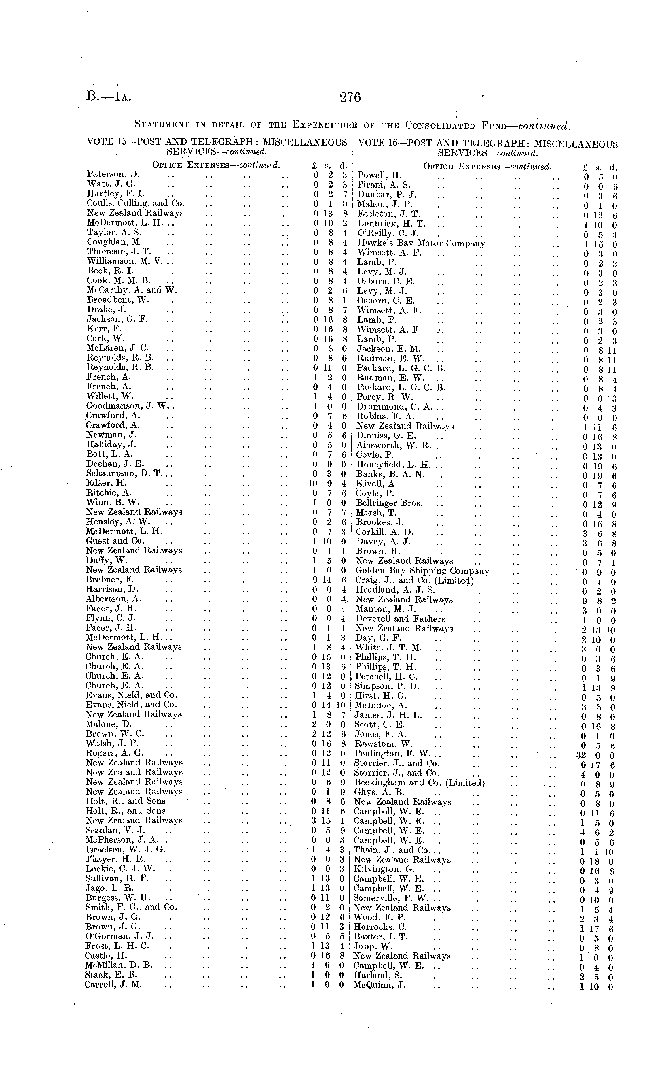 Statement in detail of the Expenditure of the Consolidated Fund— continued. VOTE 15-POST AND TELEGRAPH: MISCELLANEOUS VOTE 15-POST AND TELEGRAPH: MISCELLANEOUS SERVlCES— continued. SERVlCES— continued. Office Expenses— continued. £ s. d. ! Office Expenses— continued. £ s d Paterson, D. .. .. .. .. 0 2 3: Powell, H. . . .. .. 050 Watt, J. G. .. .. .. .. 0 2 3 J Pirani, A. S. .. .. .. .. 0 0 6 Hartley, F. I. .. .. 0 2 7 i Dunbar, P. J. .. .. .. . . 0 3 6 Coulls, Culling, and Co. .. .. .. 0 10 1 Mahon, J. P. .. .. .. " 0 10 New Zealand Railways .. .. .. 013 8 Eccleton, J. T. . . . . .. ' 012 6 McDermott, L. H. .. .. .. .. 019 2 Limbrick, H. T. .. . 1 10 0 Taylor, A. S. . . . . .. .. 0 8 4 O'Reilly, C. J. . . . . 0 5 3 Coughlan, M. . . .. .. .. 0 8 4 Hawke's Bay Motor Company .. I 15 0 Thomson, J. T. .. .. .. .. 0 8 4 Wimsett, A. F. . . .. .. 0 3 0 Williamson, M. V. .. .. . . .. 0 8 4 Lamb, P. .. . . .. .. 0 2 3 Beck, R. I. . . .. .. .. 0 8 4 Levy, M. J. . . .. .. 0 3 0 Cook, M. M. B. .. .. .. .. 0 8 4' Osborn, C. E. . . .. .. " 023 McCarthy, A. and W. .. .. .. 0 2 6, Levy, M. J. .. .. .. 030 Broadbent, W. .. .. . . .. 0 8 1 Osborn, C. E. . . . . .. .. 0 2 3 Drake, J. .. .. .. .. 0 8 7 Wimsett, A. F. .. ..030 Jackson, G. F. .. .. .. .. 016 8 Lamb, P. .. .. .. 0 2 3 Kerr, F. .. .. . . .. 016 8, Wimsett, A. F. .. " 030 Cork, W. .. .. .. .. 0 16 8 : Lamb, P. .. .. .. 0 2 3 McLaren, J. C. .. .. .. .. 0 8 0 Jackson, E. M. .. . . .. 0 811 Reynolds, R. B. .. .. .. .. 0 8 0 Rudman, E. W. .. .. ' 0 811 Reynolds, R. B. .. .. .. .. 011 0 j Packard, L. G. C. B. .. .. 0 811 French, A. .. .. .. .. 12 0; Rudman, E. W. . . . . .. 084 French, A. .. . . .. .. 0 4 0 Packard, L. G. C. B. " 084 Willett, W. .. .. .. .. 14 0 Percy, R. W. .. .. .. .. 0 0 3 Goodmanson, J. W. . .. .. .. 10 0 Drummond, C. A. .. .. .. .. 0 4 3 Crawford, A. .. . . . . .. 0 7 6 Robins, F. A. .. .. ~ 0 0 9 Crawford, A. .. . . .. .. 0 4 0 New Zealand Railways .. 1116 Newman, J. .. .. .. .. 0 5 6 Dinniss, G. E. .. .. .. .. 016 8 Halliday, J. .. .. . . .. 0 5 0 Ainsworth, W. R. .. .. . . 013 0 Bott, L. A. .. .. . . .. 0 7 6 Coyle, P. .. . . .. 013 0 Deehan, J. E. . . .. .. .. 0 9 0; Honeyfield, L. H. .. .. .. " 019 6 Sohaumann, D. T. .. .. .. .. 0 3 0 Banks, B. A. N. .. .. ' 0 19 6 Edser, H. .. . . .. .. 10 9 4 Kivell, A. .. .. .. 0 7 6 Ritchie, A. .. .. . . . . 0 7 6 Coyle, P. .. .. .. . ' 0 7 6 Winn, B. W. .. .. . . .. 10 0 Bellringer Bros. .. .. .. .. 012 9 New Zealand Railways . . .. . . 0 7 7 Marsh, T. . . .. .. ~ 0 4 0 Hensley, A. W. .. .. .. .. 0 2 6 Brookes, J. . . .. .'. " 016 8 McDermott, L. H. . . . . . . 0 7 3 Corkill, A. D. .. .. .. .'. 3 6 8 Guest and Co. .. . . .. . . 1 10 0 Davey, A. J. .. .. .. . . 3 6 8 New Zealand Railways .. .'. .. 0 11 Brown, H. 0 5 0 Duffy, W. .. .. .. .. 15 0 New Zealand Railways . . .. .. 0 7] New Zealand Railways .. .. .. 10 0 Golden Bay Shipping Company . . 0 9 0 Brebner, F. . . . . .. .. 914 6 Craig, J., and Co. (Limited) .. .. 0 4 0 Harrison, D. . . .. .. .. 0 0 4 Headland, A. J. S. .. . . 0 2 0 Albertson, A. .. .. .. .. 0 0 4! New Zealand Railways . . . . 082 Facer, J. H. .. .. .. .. 0 0 4 Manton, M. J. . . .. .. 3 0 0 Flynn, C. J. .. .. . . .. 0 0 4 Deverell and Fathers .. . . .. 10 0 Facer, J. H. .. . . .. .. 0 11 New Zealand Railways .. .. 213 10 McDermott, L. H. .. .. .. .. 0 13 Day, G. F. .. .. 2 10 0 New Zealand Railways .. .. .. 18 4; White, J. T. M. .. .. 300 Church, E. A. .. .. .. .. 015 0 ■ Phillips, T. H. .. .. " 03 6 Church, E. A. .. .. . . .. 013 6 i Phillips, T. H. .. .. 0 3 6 Church, E. A. .. .. .. .. 012 0 LPetcheil, H. C. .. .. .. 0 19 Church, E. A. . . . . .. .. 012 0 Simpson, P. D. .. .. .. .. 113 9 Evans, Nield, and Co. .. .. .. 14 0 Hirst, H. G. .. .. . . .. 0 5 0 Evans, Nield, and Co. .. .. .. 0 14 10 Mclndoe, A. .. .. .. !. 3 5 0 New Zealand Railways .. .. .. 18 7 James, J. H. L. .. .. .. .. 0 8 0 Malone, D. .. .. .. .. 2 0 0 Scott, C. E. .. .. .. ~ 0 16 8 Brown, W. C. .. . . .. .. 212 6 Jones, F. A. .. .. " 010 Walsh, J. P. .. .. .. .. 0 16 8 Rawstom, W. .. 0 5 6 Rogers, A. G. .. .. .. .. 012 0 Penlington, F. W. .. .. .. .. 32 0 0 New Zealand Railways .. .. .. 0 11 0 Storrier, J., and Co. .. .. 0 17 6 New Zealand Railways .. .. ... 0 12 0 Storrier, J., and Co. .. .. .. 4 0 0 New Zealand Railways .. .. .. 0 6 9 Beckingham and Co. (Limited) .. .. 0 8 9 New Zealand Railways .. . . .. 0 19 Ghys, A. B. .. .. .. 0 5 0 Holt, R., and Sons • .. .. 0 8 6 New Zealand Railways .. .. 0 8 0 Holt, R., and Sons .. .. .. 0 11 6 Campbell, W. E. .. 0 11 6 New Zealand Railways .. .. .. 315 1 Campbell, W. E- .. .. 15 0 Scanlan, V. J. .. . . .. .. 0 5 9 Campbell, W. E. . . .. .. 4 6 2 McPherson, J. A. .. . . .. .. 0 0 3 Campbell, W. E. . . .. 0 5 6 Israelsen, W. J. G. . . . . .. 14 3 Thain, J., and C 0... .. . . 1 110 Thayer, H. R. .. .. .. .. 0 0 3 New Zealand Railways .. .. 0 18 0 Lookie, C. J. W. .. .. .. .. 0 0 3 Kilvington, G. .. .. 016 8 Sullivan, H. F. .. . . .. . . 113 0 Campbell, W. E. . . .. " 03 0 Jago, L. R. .. . . .. .. 1 13 0 Campbell, W. E. .. .. .. 0 4 9 Burgess, W. H. .. .. .. .. 011 0 Somerville, F. W. .. .. .. .. 010 0 Smith, F. G., and Co. .. .. .. 0 2 0 New Zealand Railways .. .. .. 15 4 Brown, J. G. .. .. .. .. 0 12 6 Wood, F. P. .. .. .. "' 2 3 4 Brown, J. G. .. .. .. .. 0 113 Horrocks, C. .. .. ~ .. 117 6 O'Gorman, J. J. .. .. .. .. 0 5 5 Baxter, I. T. .. .. .. 0 5 0 Frost, L. H. C. .. . . .. .. 113 4 Jopp, W. .. .. .. " 0 8 0 Castle, H. .. . . .. .. 016 8 New Zealand Railways .. . . 10 0 McMillan, D. B. .. .. ' .. .. 10 0 Campbell, W. E. .. .. .. 0 4 0 Stack, E. B. .. .. .. .. 10 0 Harland, S. .. .. .. " 2 5 0 Carroll, J. M. .. .. .. .. 10 0 McQuinn, J. .. .. .. " 110 0