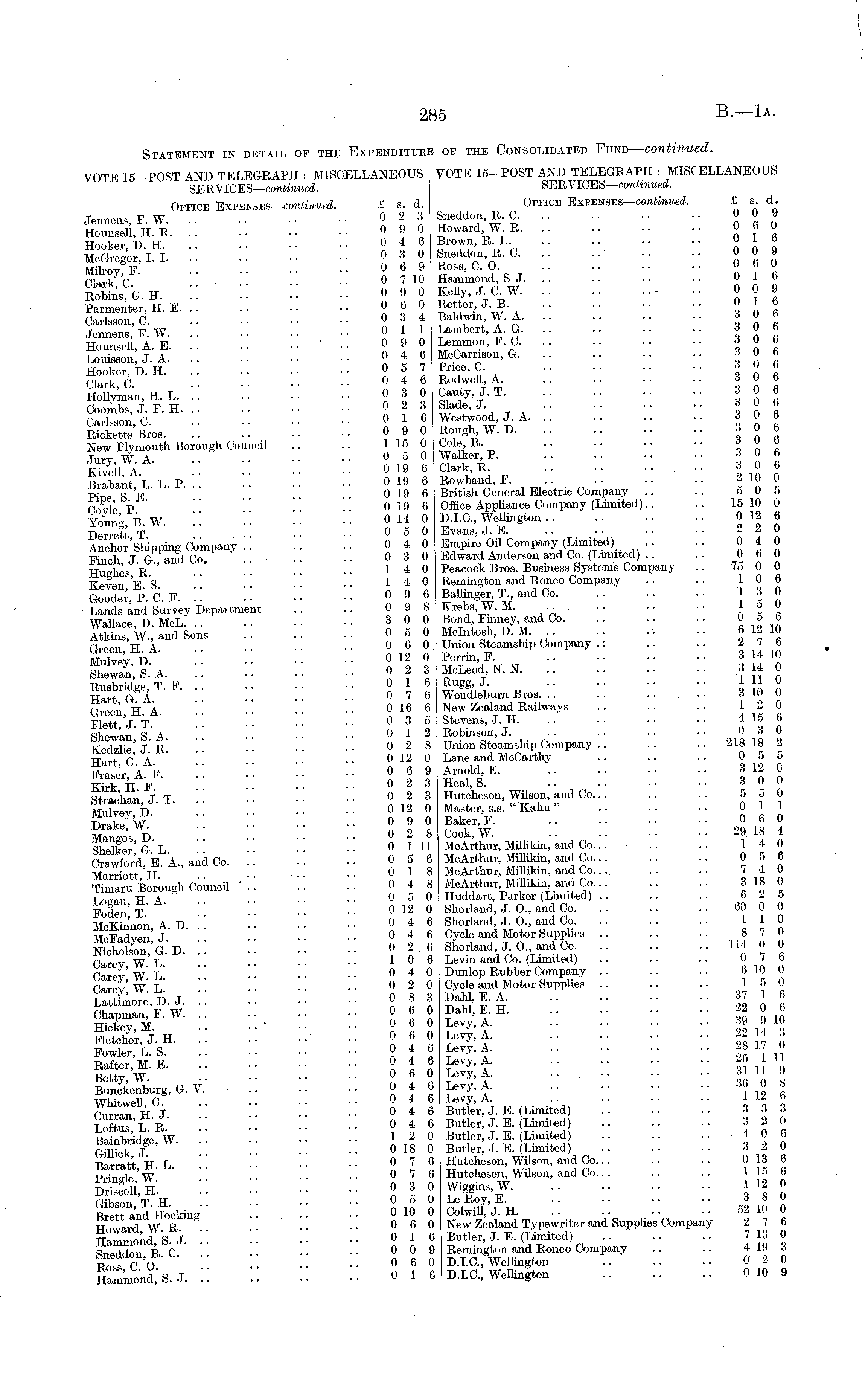 Statement in detail of the Expenditure of the Consolidated Fund — continued. VOTE 15-POST AND TELEGRAPH : MISCELLANEOUS I VOTE 15-POST AND TELEGRAPH : MISCELLANEOUS SERVICES—«mtt»t«k SERVlCES—conrtwwd. Office Expenses— continued. £ s. d. Office Expenses— continued. £ s. d. Tennens F W ■ ..023 Sneddon, R. C. .. .. • • ■ ■ 009 houS,h.r. :: :: .. :: o9 o w R oe o Hooker, D.H 0 4 6 Brown, RL 0 16 MpPrpcmr T T ..030 Sneddon, R. C. . . .. • . • ■ 009 Milrov F ■ •• 0 6 9 Ross, C. 0 0 6 0 Hark C ■• ° 7 10 Hammond, S J 0 16 Ee.E. :: :: :: .. o9 o Keny.j.dw. :: ::. oo » Parmenter, H. E 0 6 0 Better, J. B. 0 16 Carlsson.C 0 3 4 Baldwin W. A 3 0 6 Jennens.F.W Oil Lambert, A. G 306 Hounsell, A. E ' •• 09 0 Lemmon, F. C 30 6 Louisson J. A 0 4 6 McCarrison, G. .. 3 0 6 Hooker,i).H 0 5 7 Price, C 3 0 6 Plark A ..046 Rodwell, A. . . • • • ■ • ■ 306 Hol y man,H.L. V V V ■■ 03 0 Cauty J. T 30 6 Coombs, J. F. H 0 2 3 Slade, J. 3 0 6 Cartaon.C 0 16 Westwood X A 3 0 6 Rickettsßros 0 9 0 W. D 3 0 6 New Plymouth Borough Council .. . . 1 1 Cole, R. S0 6 Tnr-ir W A .050 Walker, P. .. • • • ■ • ■ cS U b Khreil A ■■ 0 19 6 Clark, R 3 0 6 Brabant LL P '' " ■■ ■ • 019 6 Rowband, F 210 0 Pinp H V ' 019 6 British General Electric Company .. .. 5 0 5 rwie P 019 6 Office Appliance Company (Limited).. .. 15 10 0 Sβ W " • 014 0 D.I.C, Wellington 012 6 Derrett T ■■ •• 0 5 0 Evans, J. E 2 2 0 Anchor'shipping Company 04 0 Empire Oil Company (Limited) .. .. 04 0 Finch J G and Co ■ ■ • 0 3 0 Edward Anderson and Co. (Limited) .. .. 0 6 0 Hughes R ' ..' • • • • ■ • 14 0 Peacock Bros. Business Systems Company .. 75 0 0 tt ™r> 'tt <3 [40 Remington and Roneo Company .. .. 106 Gooder PC F '' '.'. '■'■ '■'■ 09 6 Ballinger, T., and Co 13 0 • Lands and Survey Department . . .. 09 8 grebe, W. M. 15 0 Wallace, D. McL. .. 3 0 0 Bond, Finney and Co 0 5 6 Atkins, W., and Sons 05 0 Mclntosh, D. M .. .. .-. .. 612 10 P,. pn tt A ..060 Union Steamship Company .: . . . • I 1 <o MuTve'v D • ■ 0 12 0 Perrin, F 3 14 10 s' A • • 0 2 3 McLeod, N. N 3 14 0 Rusbridge, T. F 0 16 Rugg J J Hart G A ■• •■ •• 0 7 6 Wendleburn Bros. .. .. .. •• 310 0 n ' rV a 016 6 New Zealand Railways .. .. . . 12 0 ww T T 0 3 5 Stevens, J. H 4 15 6 SWanSA ■■ 0 12 Robinson, J 0 3 0 T t> 0 2 8 Union Steamship Company . . . . . • 18 I HartC A 0 12 0 Lane and McCarthy 0 5 5 Fraser A F '.'. " '■'■ • • 0 6 9 Arnold, E 312 0 SrkH F " •■ ..023 Heal, S. 300 ST-alVr' t T 02 3 Hutcheson, Wilson, and C 0... . . .. 55 0 MuW D '■'■ ■■ 012 0 Master, s.s. "Kahu" 011 Sy w ■• •• 09 0 Baker, V 06 0 Maneo's D '.'. ■■ • ■ 0 2 8 Cook, W. 29 18 4 S r S 'p T ■' 0 1 11 McArthur, Millikin, and Co 14 0 fi V k and Co " 05 6 McArthur, Millikin, and C 0... .. .. 05 6 MarTiott'H " ■'■'■ •■ 018 McArthur! Millikin, and C 0.... .. .. 74 0 Timaru Borough Council • 0 4 8 McArthur Millikin and Co 3 18 0 TT A 0 5 0 Huddart, Parker (Limited) .. .. .. 6 2 5 Folen' T • 0 12 0 Shorland, J. 0., and Co 60 0 0 Si'nn AD" ' • • 046 Shorland, J. 0., and Co. . . .. .. 110 MoFadven J •• 0 4 6 Cycle and Motor Supplies 8 7 0 XtaTnGD " " ■• 0 2.6 Shorland, J. 0., and Co 114 0 0 ?™7l .. 10 6 Levin and Co. (Limited) 07 6 rWv WT' 04 0 Dunlop Rubber Company .. . . .. 610 0 fWv WT' " • • 0 2 0 Cycle and Motor Supplies 15 0 T attLore D J " " ■■ •• 08 3 Dahl, E. A. .. 37 1 6 ChaZan F W •■ •• 06 0 Dahl, E. H 22 0 6 HioWM ■ •■ 0 6 0 Levy, A. 39 9 10 SS h. :: :: :: :: oe o w,a. 2214 3 Fowler,L.S 0 4 6 Levy, A. 28 17 0 Rafter.M.E o*6 Levy, A. ' T, o+tTr tit ..060 Levy, A. .. • • • • • • -> l U 9 S y ,' -H nv ' '' 0 4 6 Levy A 36 0 8 Bunckenburg, G. V. .. •• •• « * « a.. ... ~ ~ ww+wpU r ■ ..046 Levy, A. • • • • • • ■ ■ 1 1J b ETh J " •■ •■ °4 6 Butler, J. E. (Limited) 33 3 Slß.' " ..046 Butler, J. E. (Limited) 320 Ttainbridee W " " • •• } 2 ° Butler, J. E. (Limited) 40 6 S7 ,W .. 018 0 Butler, J. E. (Limited) 32 0 ™": J i, , ■' 07 6 Hutcheson, Wilson, and C 0... .. .. 013 6 TWfci'W " •• 07 6 Hutcheson, Wilson, and Co 115 6 Sh. :: :: ■• •• « \\* *»&>»•*■ ■■ l l tl p;t, ann t H ■ • ■ ■ 0 5 0 Le Roy, E. ... .. ■■ • • .5 8 0 ' .. 0 10 0 Colwill, J. H 52 10 0 w W -R 0 6 0 New Zealand Typewriter and Supplies Company 2 7 6 HammondlS J '.'. " '■'■ •• 016 Butler, J. E. (Limited) 713 0 rT r ,P C ' ..009 Remington and Roneo Company .. .. 419 3 ln,f C O •• 06 0 D.1.C., Wellington 02 0 Hammond,'S.J. Y. Y. V ■■ 01 6 D.1.0., Wellington 010 9