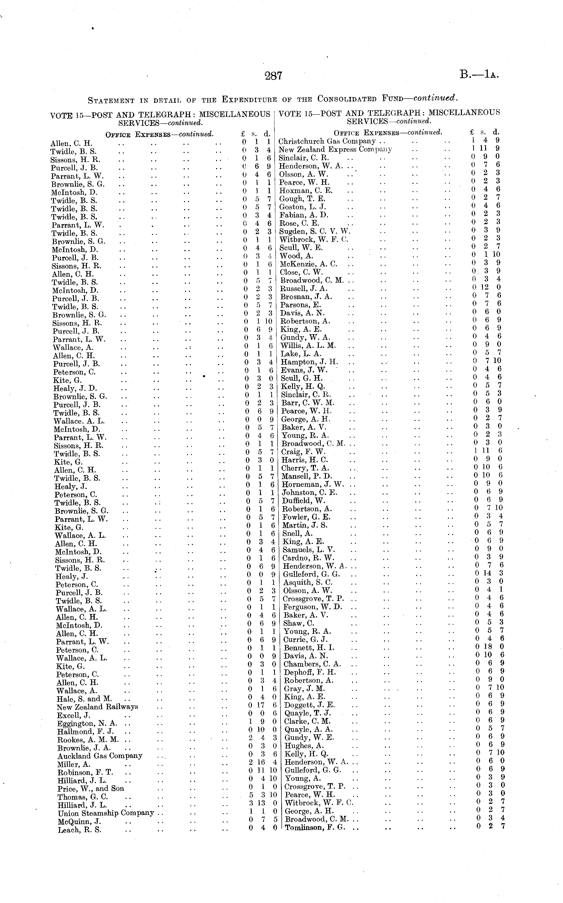 Statement in detail op the Expenditure of the Consolidated Fund — continued. VOTE 15—POST AND TELEGRAPH: MISCELLANEOUS VOTE 15—POST AND TELEGRAPH: MISCELLANEOUS SERVlCES— continued. SERVlCES— continued. Office Expenses— continued. £ a. d. Office Expenses— continued. £ s. d. Allen C. H. . . . . • • ■ • Oil Christchurch Gas Company .. . . . . 149 Twidle B S ..034 New Zealand Express Company . . .. I 11 9 Sissons', H. R. .. 0 16 Sinclair, C. R 09 0 Puroell J B . ■ ..069 Henderson, W. A. . . • • ■ ■ • ■ 07b Parrant, L.W 04 6 Olsson, A. W. ..' .. .. •■ 02 3 Brownlie, S. G 0 11 Pearee, W. H 0 2 3 Mclntosh, D. . . .. .. .. 0 11 Hoxman, C. E. . . .. .. ■ ■ 04 6 Twidle, B. S 0 5 7 Gough, T. E .. ■ ■ 0I 7 Twidle, B. S 0 5 7 Goston, L. J .. • • 04 6 Twidle, B. S 0 3 4 Fabian, A. D 0 2 3 Parrant, L. W. . . .. •• 0 4 6 Rose, C. E 0 2 3 Twidle B S . • ..023 Sugden, S. C. V. W. . . .. .. 039 Brownlie, S. G 0 11 Witbrook, W. F. C. 0 2 3 Mclntosh, D 0 4 6 Scull, W. E .. 0 2 7 Purcell, J. B 0 3 4 Wood, A. 0 1 10 Sissons, H. R 0 16 McKenzie, A. C o^ Allen, G. H 0 11 Close, C. W 0, 3 9 Twidle, B. S. .. .. ■• •■ 0 5 7 Broadwood, C. M. . . .. .. •■ 0 & 4 Mclntosh, D 0 2 3 Russell, J. A 0 12 0 Purcell J B .. .. .. • • 0 2 3 Brosnan, J. A. . . .. .. • • 0 7b Twidle,' B. S. 0 ■> "' Parsons, E. • ■ 0 7 6 Brownlie, S.G 0 2 3 Davis, A. N 0 6 0 Sissons, H. R 0 L 10 Robertson, A -.. .. 0 6 9 Purcell, J. B. 0 6 9 King, A. E 0 6 9 Parrant, L. W 0 3 4 Gundy, W. A 4 Wallace, A ■ •• 0 16 Willis, A. L. M 0 9 0 Allen C H .. • • • ■ 0 11 Lake, L. A. .. . . .. • • 0 5/ Purcell, J. B 0 3 4 Hampton, J. H .. •• 0 7 10 Peterson, C .. ■■ 0 16 Evans, J. W. ' Q. 4 6 Kite G • ..'..030 Scull, G. H. .. .. .. ■ ■ 046 Healy.Jr.D 0 2 3 Kelly, H. Q 0 5 7 Brownlie, S.G 0 11 Sinclair, C. R .. 0 5 3 Purcell, J. B. .. 0 2 3 Barr, C. W. M 0 6 0 Twidle, B. S. .. . . • • ■ • 0 6 9 Pearee, W. H. . . .. ■ ■ • • 0 3 9 Wallace. A. L. .. .. ■ ■ • • 0 0 9 George, A. H. .. .. .. .. 0 2 7 Mclntosh, D. .. 0 5 7 Baker, A. V. .. 0 3 0 Parrant, L. W 0 4 6 Young, R. A 0 2 3 Sissons, H. R 0 11 Broadwood, C. M 0 3 0 Twidle, B. S 0 5 7 Craig, F. W .. .. 11 6 Kite G ... 0 3 0 Harris, H. C. .. .. .. .. 090 Allen, C.H 0 11 Cherry, T. A. ... 0 10 6 Twidle BS. .. .. ■• •■ 0 5 7 Mansell, P. D. .. .. .. .. 010 6 Healy 'j ... 0 1 6 Horneman, J. W. . . .. .. .. 090 Peterson, C. '. 0 11 Johnston, C. E 0 6 9 Twidle B S ' • • •• 0 5 7 Duffield, W. .. .. • • • • 0 6 9 Brownlie, S.G 0 16 Robertson, A 0 7 10 Parrant, L. W 05 7 Fowler, G. E ~ %I i Kite G .... 0 1 6 Martin, J. S. .. .. . . ■ • 057 Wallace, A. L 0 16 Snell, A. 0 6 9 Allen, C.H 0 3 4 King, A. E 0 6 9 Mclntosh, D 0 4 6 Samuels, L. V 0 9 0 Sissons, H. R 0 16 Cardno, R. W 0 9 9 Twidle B S • • ..069 Henderson, W. A. . . . . .. .. 076 Hea l v j ' ' '' ' 0 0 9 Gulleford, G. G 014 3 Peterson, C. 0 11 Asquith, S. C 0 3 0 Purcell, J. B 0 2 3 Olsson, A. W 0 4 1 Twidle, B. S 0 5 7 Crossgrove, T. P.. .. 04^ Wallace, A. L 0 11 Ferguson, W. D 0 4 9 Allen C H • ■ ..046 Baker, A. V. .. .... . . 046 Mclntos'h, D 0 6 9 Shaw, C. 0 5 3 Allen C H ..011 Young, R. A. .. . . .. . . 057 Parra'nt,' L."W. '.'. 0 6 9 Currie, G. J 0 4 6 Peterson, C .. • • 0 11 Bennett, H. 1 018 0 Wallace, A. L 0 0 9 Davis, A. N 0 10 6 Kite G ..030 Chambers, C. A. . . .. .. . . 069 Peterson, C. '.'. 0 11 Dephofi, F. H 0 6 9 Allen C H ■ ■ ..034 Robertson, A. .. .. .. ... 0 9 0 Wallace! A.' 0 16 Gray, J. M .. 0 7 10 Hale, S. and M • • 0 4 0 King, A. E 0 6 9 New Zealand Railways .. .. .. 017 6 Doggett, J. E. .. .. .. .. 06 9 Excell J • • ..006 Quayle, T. J. . . . . .. . . 069 Eggington, N. A 19 0 Clarke, C. M 0 6 9 Hallmond, P. J 0 10 0 Quayle, A. A 0 5 7 Rookes,A.M.M ■ .. 2 4 3 Gundy, W. E 0 6 9 Brownlie, J. A. .. .. •■ •• 0 3 0 Hughes, A. .. 0 b 9 Auckland Gas Company ... .. . . 036 Kelly, H. Q. . . .. . . ■ • U7 10 MilW A ... 2 16 4 Henderson, W. A. . . .. .. .. 060 Robinson, F. T. \\ '.. .. ■■ 011 10 Gulleford, G. G 069 Hilliard, J. L 0 4 10 Young, A 0 3 9 Price, W., and Son 0 10 Crossgrove, T. P 0 3 0 Thomas G C ■ ■ . . 5 310 Pearee, W. H. .. . . .. .. 0 3 0 Sjl. , :: ;: :: :: 027 Union Steamship Company . . .. .. 110 George, A. H. . . .. . . « McQuinn, J. 0 7 5 Broadwood, CM 0 3 4 Leach R S 0 4 0 Tomlinson, F. G 0 2 7