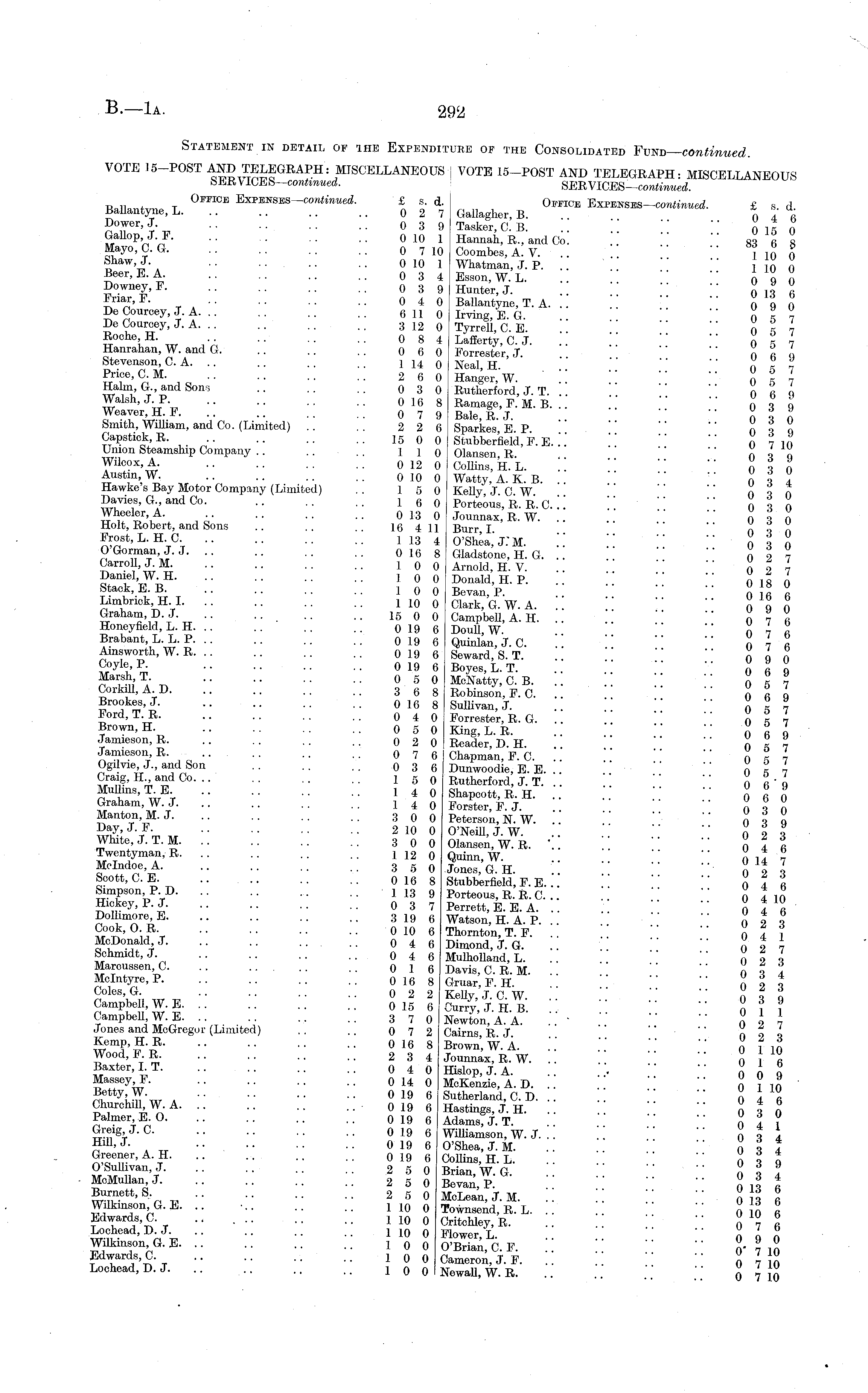 Statement in detail of ihe Expenditure of the Consolidated Fund— continued. VOTE 15-POST AND TELEGRAPH: MISCELLANEOUS | VOTE 15-POST AND TELEGRAPH: MISCELLANEOUS SERVlCES— continued. SERVICES—conned. Office J&rwsm-conUnued. £ s. d. Office W. £ s d Ballantyne, L. .. .. .. .. 0 2 7 Gallagher, B. r, 4. k *«.J' 03 9 Taskor.C. B. " ['. " " 015 0 Gallop J * 010 1 Hannah, R., and Co. .. ].' " 83 6 8 M a yo, 0. G 0 710 Coombes, A. V. .. '' 110 0 Shaw, J. . . 0 10 1 Whatman, J. P. 1 10 0 ccr ' E - A. 03 4 Esson, W. L. .. . " " 09 0 Downey, F 0 3 9 Hunter, J. 0 13 6 * rlar > E - , A 04 0 Ballantyne, T. A. .. '.. " " 09 0 De Courcey, J. A 6 11 0 Irving, E. G. .. ' 0 5 7 De Courcey, J. A. . . .. .. .. 3 12 0 Tyrrell, C. E. " n^7 5° \ H - w ° 8 4 LafEerty, C. J. .'.' 0 5 7 Hanrahan, W. and G 0 6 0 Forrester, J. "" n 6 < Stevenson, C. A. .. .. .. .. 1 14 0 Neal, H. " n « 7 *??>• G-M 2 6 0 Hanger, W. '.'. " " 0 5 7 Halm, G., and Sons .. .. .. 0 3 0 Rutherford, J. T. " 0 c q Weaver, H. F 07 9 Bale, R. J. " nq n Smith, William, and Co. (Limited) .. . . 2 2 6 Sparkes E. P n 3 q Capstiok R 15 0 0 Stubberfield, F. E. ..' " 0 7 10 Union Steamship Company .. . . . . 110 Olansen, R. OSO Wilcox A 012 0 Collins, H. L. .'. " 0 3 0 4 ust ; n ' , W - „ 010 0 Watty, A. K. B. .. 0 3 4 Hawke s Bay Motor Company (Limited) .. 15 0 Kelly JC Wo 3 n Davies, G., and Co. 16 0 Porteous, R. r'. C. '.'. n % 0 ,i °13 0 Jounnax.R.W. .. .'.' " 0 3 0 Holt, Robert, and Sons .. .. .. 16 411 Burr I " nt n Frost,L.HC 113 4 O'Shea, j: M. ."! [[ " "030 O Gorman, J. J 0 16 8 Gladstone, H. G. .. 0 2 7 Carroll, J M 10 0 Arnold, H. V. .. 02 7 Darnel, W. H 10 0 Donald, H. P. . ' ' " 018 0 Stack,E.B. 10 0 Bevan.P. .. " ][ " o^6 Limbrick, H. 1 1 10 0 Clark, G. W. A. .. 0 9 0 Graham DJ. .. .. .. .. 15 0 0 Campbell, A. H. .. " " 07 6 Honeyfield, L. H 0 19 6 Doull, W. .. 0 7 6 Brabant, L. L. P 0 19 6 Quinlan, J. C. .. 0 7 6 Amsworth, W. R 0 19 6 Seward, S. T. n q n £>y le 'P; 019 6 Boyes.L.T. .. [[ " " q6 9 Ma f^' T A - 05 0 McNatty.C.B " 05 7 Corkill,A.D 3 6 8 Robinson, F. C. .. 0 6 9 Brookes, J. .. 0 16 8 Sullivan, J. " o^7 P° rd ' T - E 0 4 0 Forrester, R. G. .. " " 0 5 7 ? rown ' H w 05 0 King,L.R ][ '.[ 06 9 Jamieson, R 0 2 0 Reader, D. H. " n^7 Jamieson R 0 7 6 | Chapman, F. C. .. \' 0 5 7 Ogilvie, J., and Son 03 6 Dunwoodie, E. E. . " " o^7 Craig, and Co 15 0 Rutherford, J. T. .. " 0 6 - q Mnlhns,T E !4 0 Shapcott, R. H. .. " '' " 06 0 Graham, W.J 1 4 0 Forster, F. J. 0 3 0 MantonM.J 30 0 Peterson, N. W. .. '.' " 03 9 SJK' J - T F 210 0 O'Neill, J. W. .. " '■ 02 3 White.J.T.M 3 0 0 Olansen, W. R. ' Twentyman,R 112 0 Quinn, W. .. 0 14 7 Melndoe, A 3 5 0 Jones, G. H. .. 0 2 3 Scott, C.E .. 0 16 8 Stubberfield, F. E. .. '.'. " 0 4 6 Simpson PD 113 9 Porteous, R. R. C " " 04 10 0 3 7 Perrett, E. E. A. .. .. \\ 0 Iq Dolimore E 319 6 Watson, H. A. P " 02 3 S>°k. O. B. 010 6 Thornton, T. F. . . '" 0 4 1 McDonald J 046 Dimond, J. G. . "097 Schmidt, J 046 Mulholland, L. .. " " nil Marcussen C 0 16 Davis, C. R. M. .. '.. 0 3 4 Mclntyre, P 0 16 8 Gruar, F. H. nit Coles > G - ■ • • • ■ • • • 0 2 2 Kelly JC W " "' n Z o 015 6 Sj.h.r :; :; ■•• ■• ° 0 I j Campbell W.IE, ..... ~ .. 37 0 Newton, A. A. . • '' ." n2 7 Jones and McGregor (Limited) . . .. 07 2 Cairns R J '' • a 9 I K e mp,H.R 016 8 Brown, W. A. ."." .'.' " " 01 10 Wood - P - R- 23 4 Jounnax, R. W. .. " 016 Baxter, LT 04 0 Hislop, J. A. .. . " " n0 q Masse y>J 014 0 McKenzie, A. D. .. . 01 10 Betty, W. 0 19 6 Sutherland, CD " 0 4 6 Churchill W.A 0 19 6 Hastings, J. H " "030 Palmer E.O 019 6 Adams? J. T. .. " X 4 ? gwfg. J- C 019 6 Williamson, W. J '' " 03 4 •P. J. . _ 019 6 O'Shea, J. M " ;[ q3 4 Greener, A. H 019 6 Collins, H. L. .. 03 q ?T^Jr an, T 2 5 ° Brian, W.G " 0 3 4 McMullan,J 25 0 Bevan, P. "" " !, 25 0 McLean,J.M. V. .[ " " q3 6 Wilkinson G. E. .. ■ 1 10 0 Townsend, R. L " 0 10 6 Edwards, C. .. 110 0 Critchley, R \\ 2fi Lochead, D J 110 0 Flower, L [ | [ 09 0 Wilkinson G. E 10 0 O'Brian, C. F. . . '' '' X- 2 * Edwards, C .. 10 0 Cameron, J. F \\ \\ 07 0 Lochead, D. J. .. 10 0 Newall, W. R. .. " 07 10