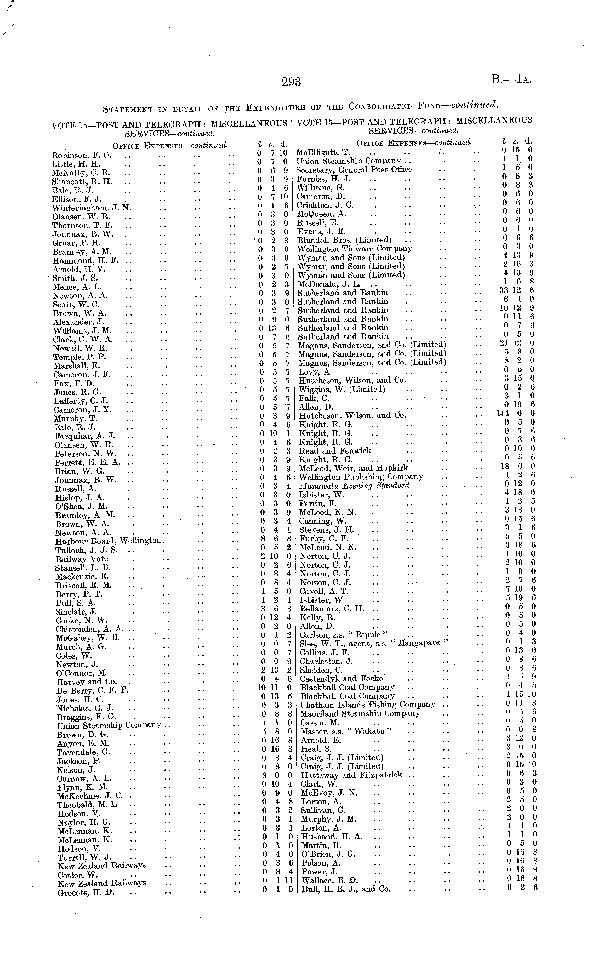 Statement in detail of the Expenditure of the Consolidated Fund — continued. VOTE 15-POST AND TELEGRAPH : MISCELLANEOUS VOTE 15-POST AND TELEGRAPH : MISCELLANEOUS SERVlCES— continued. SERVlCES— continued. Office Expenses— continued. £ s. d. Office Expenses— continued. £ s. d. Robinson, F. C. .. 0 710 McElligott, T .. •• ■■ 1 Little H H ..0710 Union Steamship Company .. .. ■ ■ In McNattyC-B. '.'. '.'. '.'. ■■ 06 9 Secretary, General Post Office .. ■• 1& 0 Shapcott,R.H 0 3 9 Fumiss, H J 0 8 3 Bale, R.J 0 4 6 Williams, G 0 8 3 Ellison.F.J 0 7 10 Cameron, D 0 6 0 Winteringham, J. N 0 16 Crichton, J. C ••• « ° » Olansen,W.R 0 3 0 McQueen, A 0 6 0 Thornton, T. F 0 3 0 Russell E 0 6 0 Jounnax R W • • ..030 Evans, J. E. .. .. ■ • • • „i « Gruar,F.H. V. .. .. ■■ '0 2 3 Blundell Bros. (Limited) .. 06 6 Bramley,A.M 03 0 Wellington Tinware Company .. .. 03 0 Hammond, H. F 03 0 Wyman and Sons Limited .. • • * » Arnold H V . .. •• ■■ 0 2 7 Wyman and Sons (Limited) .. ■■ j±° 6 Smith J. S • • ■ ..030 Wyman and Sons (Limited) .. • • too Mence.A.L- •'• °2 3 McDonald J. L. .. . 16 8 Newton, A. A 0 3 9 Sutherland and Rankyn a 7 0 Scott, W.C 0 3 0 Sutherland and Rankin Brown WA. . 0 2 7 Sutherland and Rankrn .. .. • •■lO li 9 Alexander, J 0 9 0 Sutherland and Rankin 0 11 b Williams J. M. .. .. • • • • 013 6 Sutherland and Rankm .. .. •• « ' « Clark g'w A •• •• 0 7 6 Sutherland and Rankin .. ■■ •• 0 5 0 Newall W R '■'■ ■■ ■■ 0 5 7 Magnus, Sanderson, and Co. (Limited) .. 21 12 0 Temple P P •• •• •• 057 Magnus, Sanderson, and Co. (Limited) .. o8 0 Marshall E " '.'. ■ ■ 0 5 7 Magnus, Sanderson, and Co. (Limited) .. 82 0 Cameron, J.F . '.'. '.'■ ■■ •• 05 7 Levy, A. .. 0& 0 m, x vj) . ..057 Hutcheson, Wilson, and Co. .. • • dio v Jones, R.G. '.'. '.'. ■■ ..057 Wiggins, W. (Limited) 026 :: °o H ? IK. :: :: :: :: 3U S Murahv T •■ 0 3 9 Hutcheson, Wilson, and Co 144 0 0 Raloß J ■• 0 4 6 Knight, R. G 0 5 0 01ansen,W.R « Knight, R.G. 0 3 6 Peterson NW .. •• ■■ 023 Read and Fenwick .. • • ■ • » i" v PerrettE E A '.'. 0 3 9 Knight, R. G 0 5 6 Brial W G " •• •■ 03 9 McLeod, Weir, and Hopkirk .. .. 18 6 0 Jounnax,'R.'w 04 6 Wellington Publishing Company .. .. 12 6 ■Russell a ... 0 3 4 Manawatu Evening Standard ■ ■ ■ ■ v v hXTjA " " •• •• 03 0 Isbister,W. *18 0 Sj m '• " .. ..030 Perrin,F 425 Br S amTe'yfA M M. " '. 03 9 McLeod, N. N 318 0 Brown, W. A ' ■• ■■ 03 4 Canning, W 015 6 Newton A A • • ..041 Stevens, J. H. .. .. ■ • • • d. l b ?utfj B T d s Weilington -- :: o5 2 S?A. :: :: :: :: l^l R U aSwa h yVot S ' " V. ■■ ■■ »» 0 Norton,'C. J 110 0 Stan S ell,L.B 0 2 6 Norton, C. J 2 10 0 Mackenzie, E ' 0 8 4 Norton, C. J 10 0 Driscoll, E. M. ... 0 8 4 Norton, CJ 2 7 6 a,,,,, pnp ..150 Cavell, A. T. .. .. • • • • / iv v !uli y S A " " ..121 Isbister,W 519 6 SXj ■' 36 8 Bellamore, C. H .. .. 05 0 So. :: 012 4 Kelly, R. .. 06 0 pw+tonrler. A A ..020 Allen, D. .. .. • • ■ • « ° v bmttenaen, ±\.. &.. . ■ ■ ■ ■ » , ~ n J. n MpPnlipv WB '.. •• •• 012 Carlson, s.s. 'Ripple .. •■ •• v i v ffifta I! 00 7 Slee,WT agent, ~" Mangapapa" 0 3 OnUs, W • ■ ..007 Collins, J. F. .. .. • • • ■ oid 0 Newton J " •• ..009 Charleston, j 086 O'Connor M .. 2 13 2 Shelden, C 0 8 6 '.'. " •• •■ 0 4 6 Castendyk and Focke 15 9 T \ IZ-v CF F '' " • • 10 11 0 Blackball Coal Company 0 4 5 TvlfTwr"' ' 0 13 5 Blackball Coal Company 115 10 Nicholas GJ '■'■ '■'■ ■■ ■■ 03 3 Chatham Islands Fishing Company .. .. 011 3 Braggins' EG '■'■ ■ ■ ■ ■ ■■ 08 8 Maoriland Steamship Company .. ••0 5 6 Union Steamship Company .. .. 110 Cassin, M. _ •• n n a Dfi • • • • 5 8 0 Master, s.s. " Wakatu .. .. • • 0 0 8 An 3' V M 0 16 8 Arnold, E 3 12 0 Ttvpnda?; G' '' ■ • 016 8 Heal, S. 30 0 T fl Xon P • •• 08 4 Craii, J. J. (Limited) .. .. .. 2 .15 0 NetT'j :: :: •■ •• o8 o c«4: j. j. (LMted) o.w-.-o Cumow,A.L 8 0 0 Hattaway and Fitepatrick 063 ■pl,rr,T. "X" M . 0 10 4 Clark, W. .. .. • • • ■ 0 d v M&L M j.c.:: :: :: :: 090 j.n. :; ; y 0 Naylor.H. G 0 3 1 Murphy J. M 2 0 0 McLennan, X 0 3 1 Lorton A 10 McLennan, X • 0 10 Husband H. A 110 Hodson V •■ •• •• ■• 010 Martin, R. .. .. •• •• 0 5 0 S'WJ 04 0 O'Brien J.G. .. 0 68 New Zealand Railways 0 3 6 Poison, A • • 0 16 8 rv ttpr W • • ..084 Power, J. .. . • • • • • U lb S New Zealand Railways 0 1 11 Wallace, B. D. .. 0 16 8 Grocott, H. D 0 10 Bull, H. B. J., and Co 0 2 6
