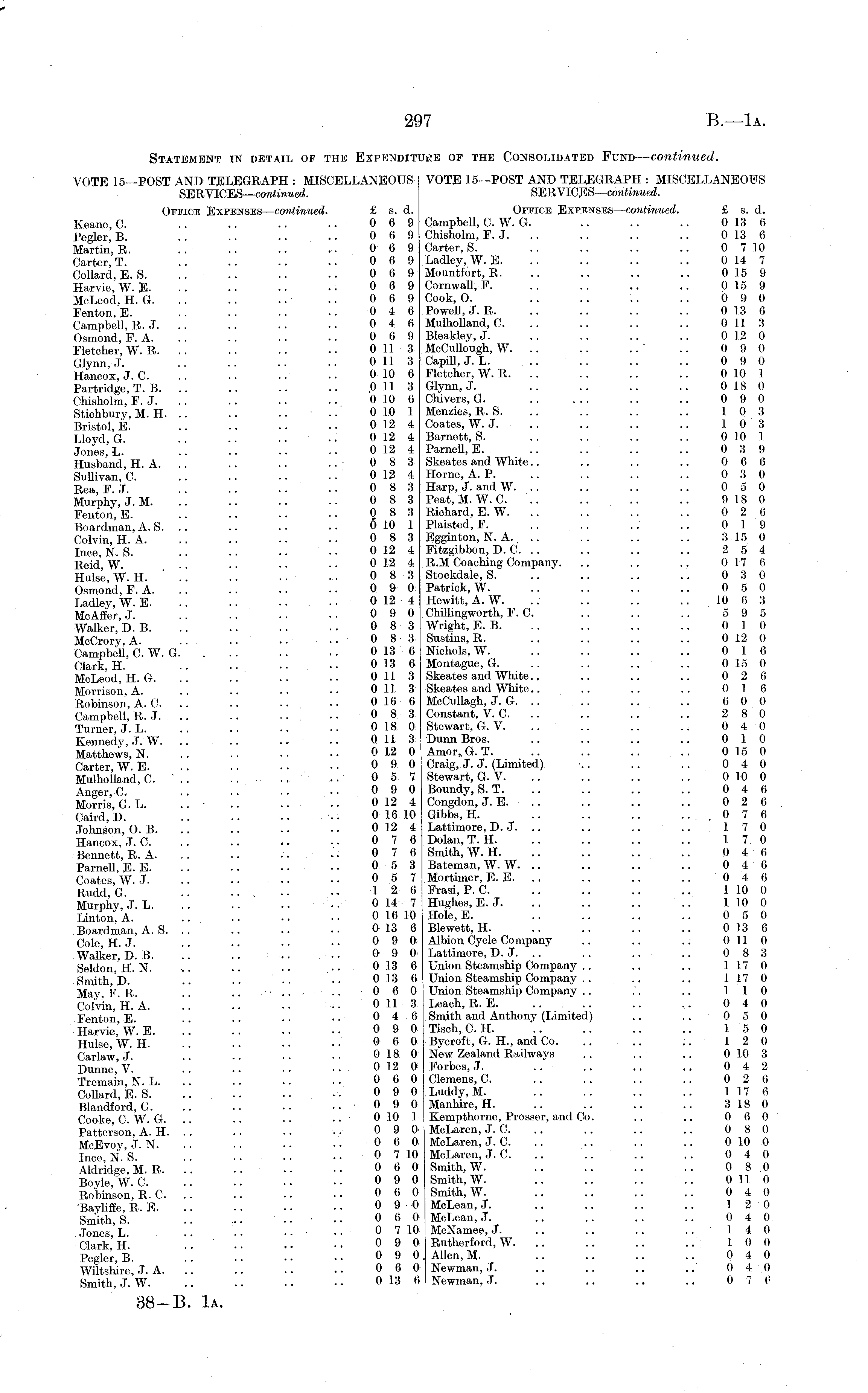 Statement in detail of the Expenditure of the Consolidated Fund — continued. VOTE 15—POST AND TELEGRAPH : MISCELLANEOUS VOTE 15—POST AND TELEGRAPH : MISCELLANEOUS SERVICES— -cmtWAMi. SERVlCES— continued. Office Expenses— continued. £ s. d. Office Expenses— continued. £ s. d. Keane C. .. .. .. • • 0 6 9 Campbell, C. W. G. .. .. .. 013 6 Pegler B. .. .. .. .. 0 6 9 Chisholm, F. J. .. .. .. .. 013 6 Martin, R. .. .. .. .. 0 6 9 Carter, S. .. .. .. .. 0 710 Carter, T. .. .. .. .. 0 6 9 Ladley, W. E. .. .. .. .. 014 7 Collard, E. S. .. .. .. .. 0 6 9 Mountfort, R. .. .. .. .. 015 9 Harvie, W. E- ■ • • ■ • • • ■ 0 6 9 Cornwall, F. .. .. .. .. 0 15 9 McLeoA, H. G. .. .. .. .-. 0 6 9 Cook, O. .. .. ;. .. 0 9 0 Fenton E. .. .. •. • • 0 4 6 Powell, J. R. .. .. . . . . 0 13 6 Campbell, R. J. .. .. .. .. 0 4 6 Mulholland, C. .. .. .. .. 011 3 Osmond, F. A .. .. 0 6 9 Bleakley, J 0 12 0 Fletcher, W. R. .. .. .. . ■ 011 3 MoCullough, W. .. .. .." .. 090 Glynn J .. .. .. 011 3 Capill, J. L. .. .. .. .. 0 9 0 Hanoox, J. C. .. .. .. • • 010 6 Fletcher, W. R. .. .. .. .. 010 1 Partridge, T. B. .. .. .. .. 011 3 Glynn, J. .. .. .. .. 018 0 Chisholm, F. J. .. .. .. 010 6 Olivers, G. .. .. 0 9 0 Stiohbury MH. .. .. ...' 010 1 Menzies, R. S. .. .. .. .. 10 3 Bristol, E. 0 12 4 Coates, W. J. .. 10 3 Lloyd G . • • 0 12 4 Barnett, S. .. .. .. .. 0 10 1 Jones,' L... 0 12 4 Parnell, E. 0 3 9 Husband HA .. .. .. 083 Skeates and White.. .. .. .. 0 6 6 Sullivan, C. .. .. .. ■• 012 4 Home, A. P. .. .. .. .. 0 3 0 R ea F J .... 083 Harp, J. and W. .. .. .. .. 050 Murphy ,T M " .. • • ••0 8 3 Peat, M. W. C. .. .. .. .. 918 0 Fenton, E. .. .. ■ • • ■ 0 8 3 Richard, E. W. .. .. .. .. 0 2 6 Boardman, A. S. .. .. .. •• 610 1 Plaisted, F. .. .. .. .. 0 19 Colvin, H. A. .. .. .. •• 0 8 3 Egginton, N. A.. .. .. .. .. 315 0 Ince, N. S. .. .. • • • • 012 4 Fitzgibbon, D. C. .. .. .. .. 2 5 4 Reid' W. . •• ■• •• 012 4 R.M Coaching Company. .. .. .. 017 6 Hulse WH. ■ • 0 8 3 Stockdale, S. .. .. .. .. 0 3 0 Osmond, F. A. . . .. .. • • 0 9 0 Patrick, W. .. .. .. .. 0 5 0 Ladley WE. .. .. . . 012 4 Hewitt, A. W. .. .. .. .. 10 6 3 McAffer J .. ■ • • • 0 9 0 Chillingworth, F. C. .. .. .. 5 9 5 Walker,'D. B. .. .. . . .. 08 3 Wright, E. B. .. .. .. .. 010 McCrory A .. -. ..083 Sustins, R. .. .. .. .. 0 12 0 Campbell, C. W. G." 0 13 6 Nichols, W 0 16 Clark H. .. .. •• •• 0 13 6 Montague, G. .. .. .. .. 0 15 0 McLeod, H. G. .. .. .. •• 011 3 Skeates and White.. .. .. .. 0 2 6 Morrison A ... 0 11 3 Skeates and White.. .. .. .. 0 16 Robinson, A. C. .. .. •. • • 016 6 McCullagh, J. G. .. 6 0 0 Campbell, R. J .. ~ 0 8 3 Constant, V. C 2 8 0 Turner, J. L. .. .. •• •■ 018 0 Stewart, G. V. .. .. .. .. 0 4 0 Kennedy, J. W. .. .. •• .. 011 3 Dunn Bros. .. .. .. .. 0 10 Matthews, N 0 12 0 Amor,.G. T .. 0 15 0 Carter, W. E. .. . • • • • ■ 0 9 0 Craig, J. J. (Limited) ■.. .. .. 0 4 0 Mulholland, C. ".. •. • • • • 0 5 7 Stewart, G. V. .. .. .. .. 010 0 Anger C •. ..090 Boundy, S. T. .. .. .. .. 046 Morris', G. L. .. ■ 012 4 Congdon, J. E 0 2 6 Caird, D. .. .. •• •■ 0 16 10 Gibbs, H. .. .. .. ... 0 7 6 Johnson 08. .. .. • ■ 012 4 Lattimore, D. J. .. .. .. .. 17 0 Hanoox, J. C 0 7 6 Dolan, T. H 17 0 Bennett, R. A .. •■ 0 7 6 Smith, W. H 0 4 6 Parnell, E. E- • • •• ■ • • ■ 0 5 3 Bateman, W. W. .. .. .. .. 0 4 6 Coates W J ■ • 0 5 7 Mortimer, E. E. .. .. .. .. 0 4 6 Rudd, G. 12 6 Frasi, P. C. 1 10 0 Murphy, J. L •. 0 14 7 Hughes, E. J .. 1 10 0 Linton A .. •• •• 0 16 10 Hole, E. .. .. .. .. 0 5 0 Boardman, A. S. .. 0 13 6 Blewett, H 0 13 6 Cole H.J. .. ■• •• •• 0 9 0 Albion Cycle Company .. .. .. 0 11 0 Walker D. B. .. .. • • • • 0 9 0 Lattimore, D. J. .. .. .. .. 0 8 3 Seldon.'H. N. ■.. .. .. •• 013 6 Union Steamship Company .. .. .. 1 1.7 0 Smith,'d. ■• •■ •• 0 13 6 Union Steamship Company .. .. .. 1 17 0 May FR .. •• ■■ 060 Union Steamship Company .. .". .. 110 Colvin, H. A. '.'. .. •■ •■ 011 3 Leach, R. E. .... .. ... 04 0 Fenton E ■ ■ • • ..046 Smith and Anthony (Limited) .. .. 050 Harvie'W. E. '.'. .. ■■ • • 09 0 Tisch, C. H. .. .. .. .. 15 0 Hulse, W. H. .. .. .. ■ • 0 6 0 Bycroft, G. H., and Co. .. .. .. 12 0 Carlaw J •. • • • • 018 0 New Zealand Railways .. .. .. 010 3 Dunne,' V. '.'. ■■ ■■ •• 012 0 Forbes, J. .. .. .. .. 04 2 Tremain, N. L. .. •■ • • 0 6 0 Clemens, C. .. .. .. .. 0 2 6 Collard, E. S 0 9 0 Luddy, M. 117 0 Blandford, G. .. .. • ■ ..090 Manhire, H. .. .. .. .. 3180 Cooke, C. W. G. .. .. •• •• 010 1 Kempthorne, Prosser, and Co. .. .. 0 6 0 Patterson, A. H. .. .. .. ■ • 0 9 0 McLaren, J. C. .. .. .. .. 0 8 0 McEvoy J N .. •• •• 0 6 0 McLaren, J. C. .. .. .. .. 010 0 Ince N's • ■ .. 0 710 McLaren, J. C. .. .. .. .. 0 4 0 Aldridge, M. R 0 6 0 Smith, W. 0 8 .0 Boyle W C .. .. •• 0 9 0 Smith, W. .. .. .. .. Oil. 0 Robinson, R.C 0 6 0 Smith, W. 0 4 0 •Bayliffe, R. E 0 9 0 McLean, J. 12 0 Smith S .. .... 0 6 0 McLean, J. .. .. .. .. 0 4 0 Jones' L .. • • • • • 0 710 McNamee, J. .. .. .. .. 14 0 Clark'H " .. •• 0 9 0 Rutherford, W. .. .. .. .. 10 0 Pegler, B. .. .. • • • • 0 9 0. Allen, M. .. .. .. .. 040 Wiltshire, J. A. .. .. . • 0 6 0 Newman, J. .. .. .. ..' ' 0 4 0 Smith, J.W. .. .. ■. • • 013 6 Newman, J. ~ .. .. .. 0 7 0 88-B. lα.