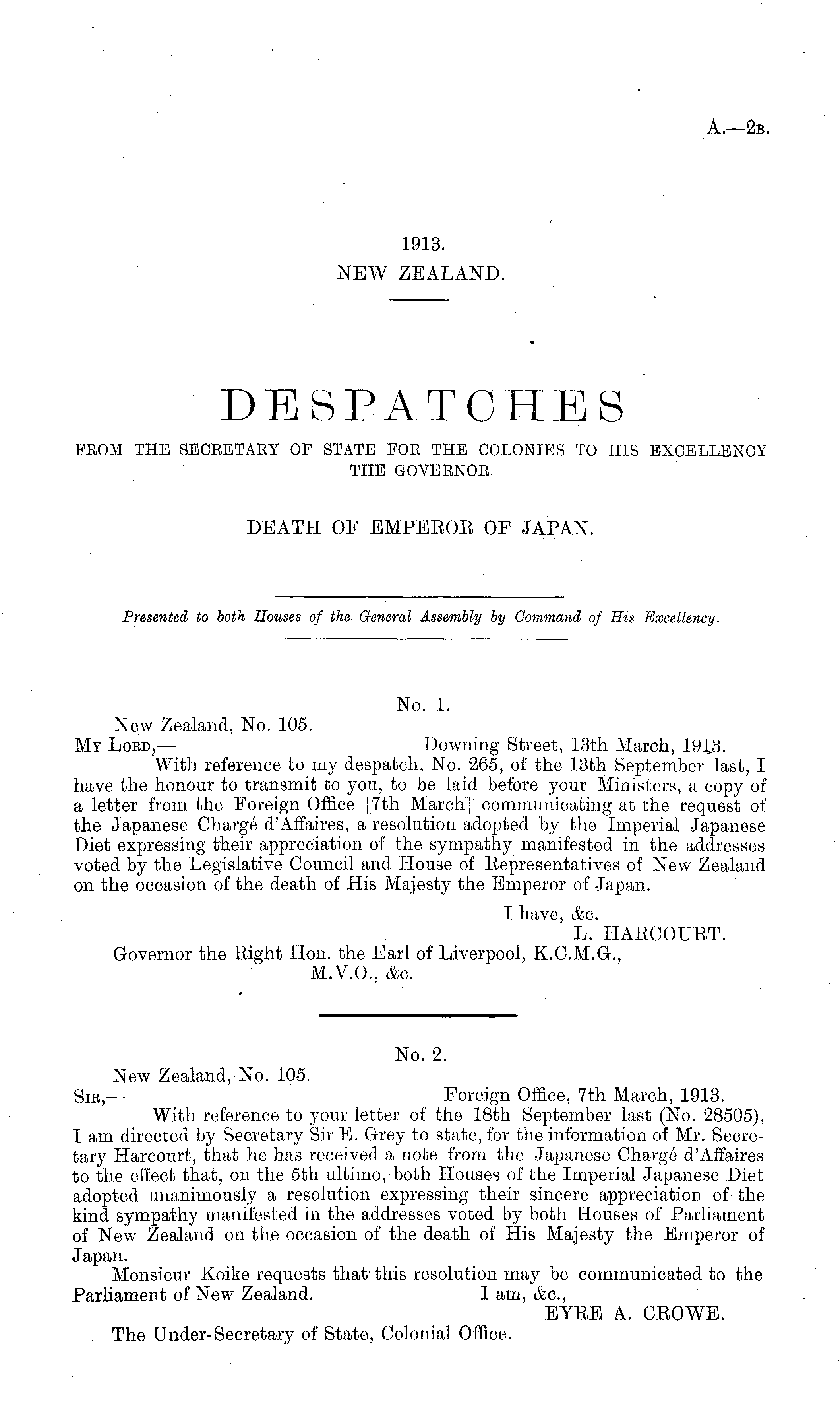 No. 2. New Zealand, No. 105. Sir,— Foreign Office, 7th March, 1913. With reference to your letter of the 18th September last (No. 28505), I am directed by Secretary Sir E. Grey to state, for the information of Mr. Secretary Harcourt, that he has received a note from the Japanese Charge d'Affaires to the effect that, on the sth ultimo, both Houses of the Imperial Japanese Diet adopted unanimously a resolution expressing their sincere appreciation of the kind sympathy manifested in the addresses voted by both Houses of Parliament of New Zealand on the occasion of the death of His Majesty the Emperor of Japan. Monsieur Koike requests that this resolution may be communicated to the Parliament of New Zealand. I am, &c, EYRE A. CROWE. The Under-Secretary of State, Colonial Office.