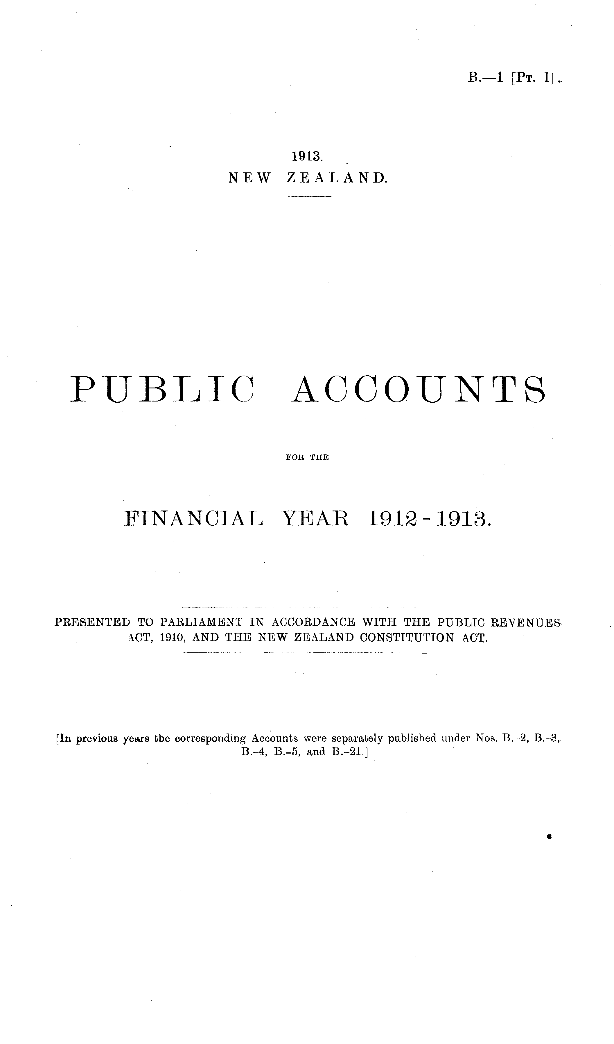 PUBLIC ACCOUNTS FOR THE FINANCIAL YEAR 1912-1913. PRESENTED TO PARLIAMENT IN ACCORDANCE WITH THE PUBLIC REVENUES ACT, 1910, AND THE NEW ZEALAND CONSTITUTION ACT.