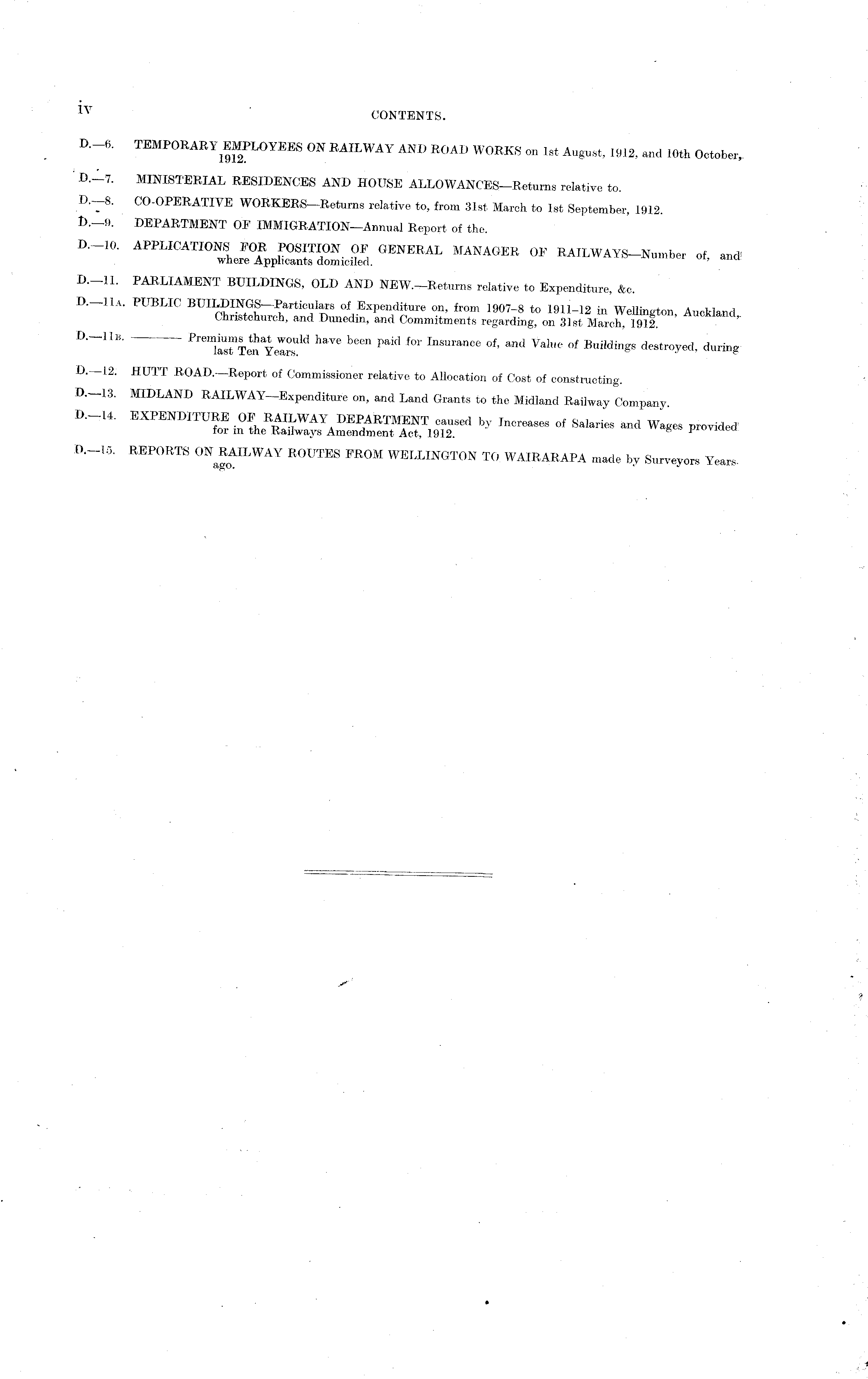 D.-6. TEMPORARY EMPLOYEES ON RAILWAY AND ROAD WORKS on it August, 1912, and 10* October, ' 0.-7. MINISTERIAL RESIDENCES AND HOUSE ALLOWANCES-Returns relative to. D.-8. CO-OPERATIVE WORKERS-Returns relative to, from 31st March to Ist September, 1912. D.-9. DEPARTMENT OV IMMIGRATION—AnnuaI Report of the. D.-10. GENEKAL MANAGEE °* *AILWAYS-Number of, and D.-11. PARLIAMENT BUILDINGS, OLD AND NEW.-Ueturns relative to Expenditure, &c. D.-IU. PUBLIC! BUILDINGS-Particnlars of Expenditure on, from 1907-8 to 1911-12 in Wellington, Auckland Chnstchureh, and Dunedin, and Commitments regarding, on 31st March, 1912. ' D.-118. - - would have been paid for Insurance of, and Value of Buildings destroyed, during U—l2. HUTT ROAD.—Report of Commissioner relative to Allocation of Cost of constructing. D.-13. MIDLAND RAILWAY-Expenditure on, and Land Grants to the Midland Railway Company D.-H. EXPENDITURE OF RAILWAY DEPARTMENT caused by Increases of Salaries and Wages provided for in the Railways Amendment Act, 1912. "»«cb piovraea D.-15. REPORTS ROUTES EROM WELLINGTON TO WAIRARAPA made by Surveyors Years.