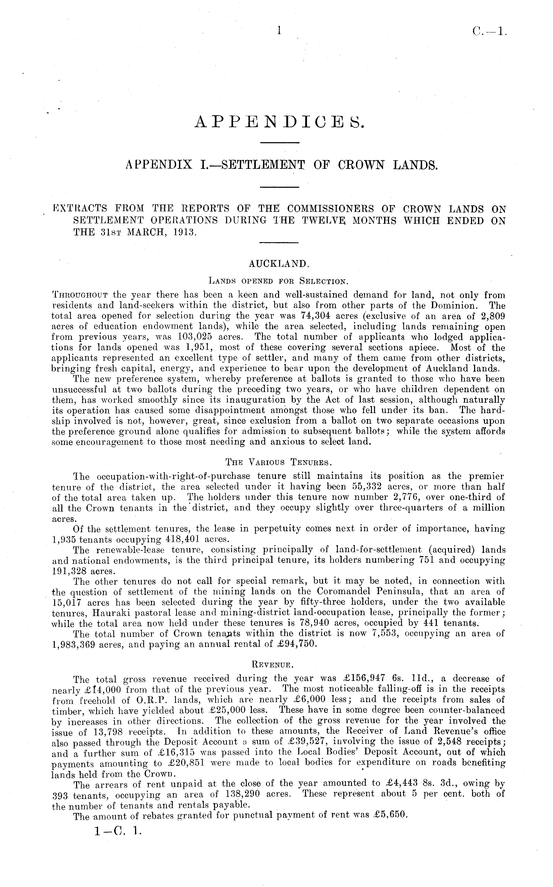 APPENDIX I.—SETTLEMENT OF CROWN LANDS.